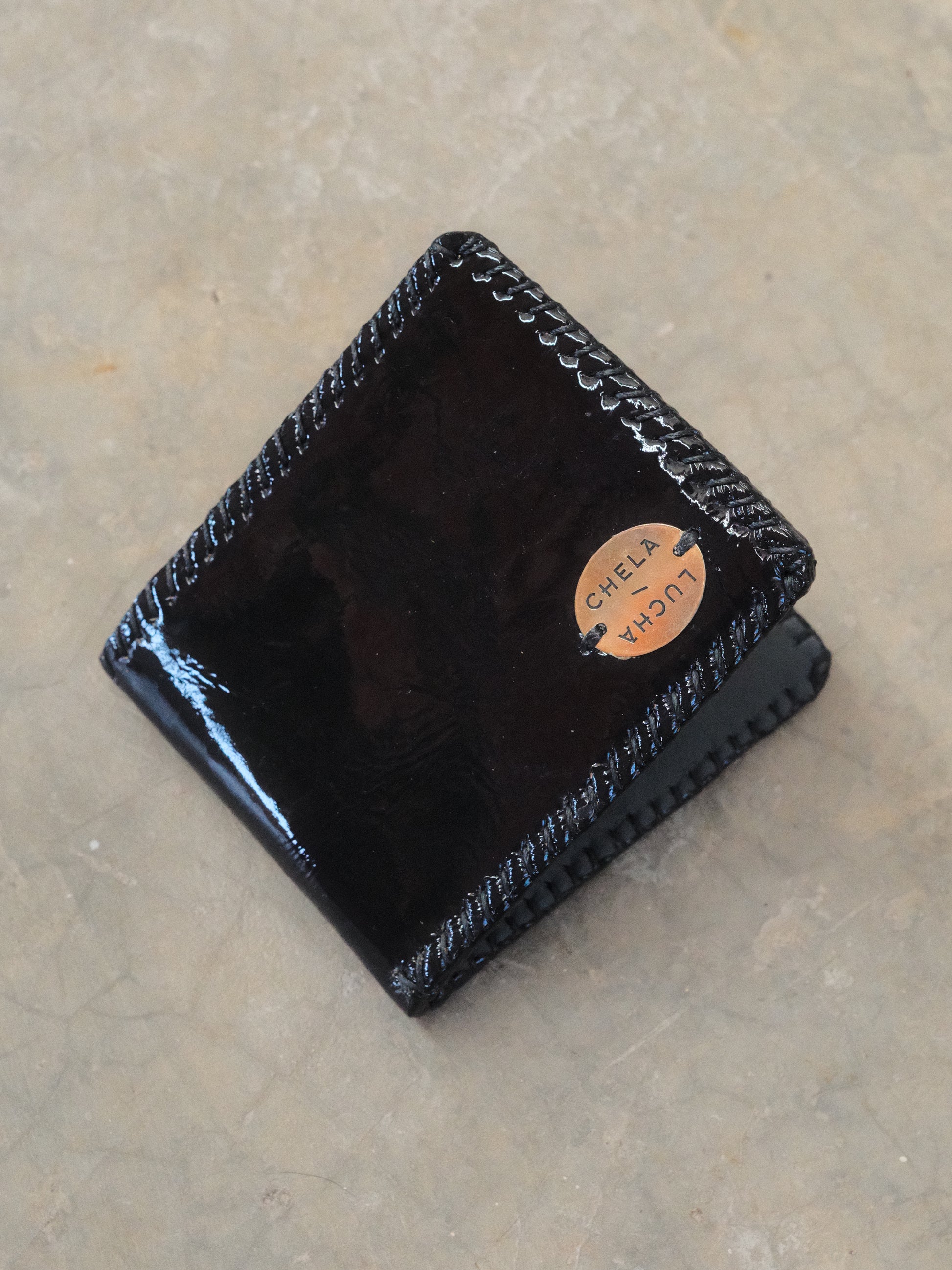 Cartera hecha con pedacera de piel en tonos oscuros.
