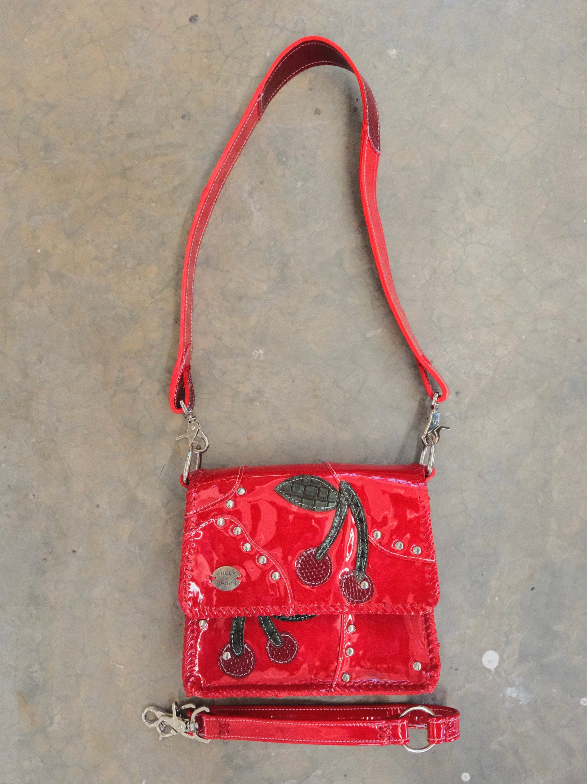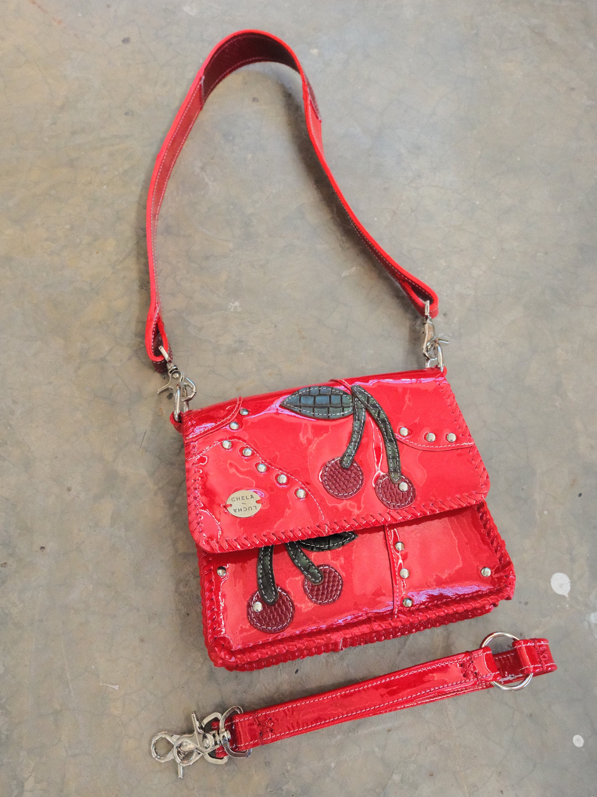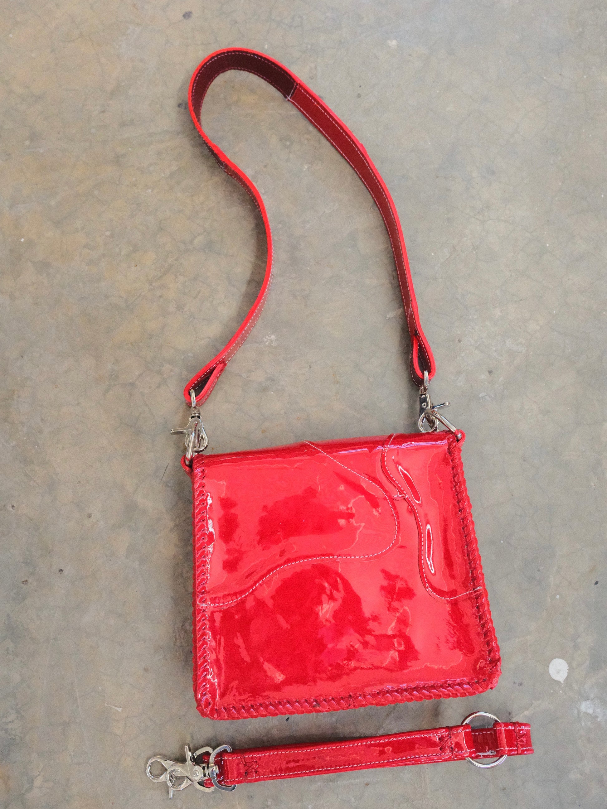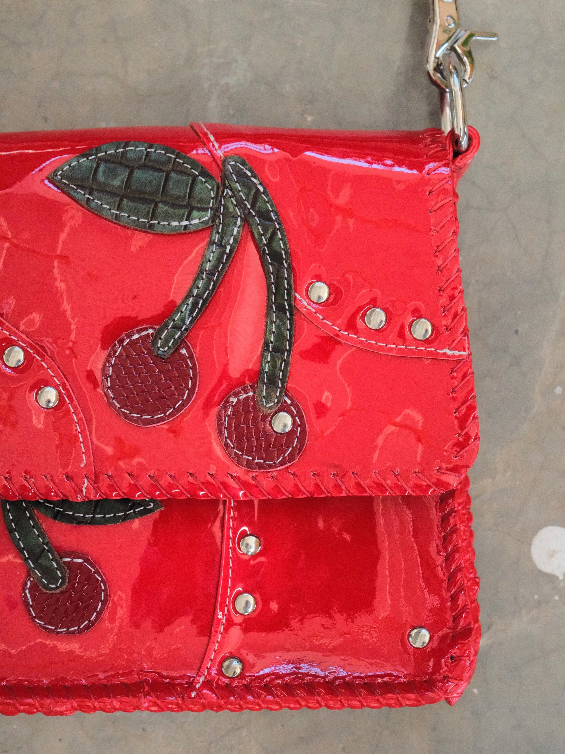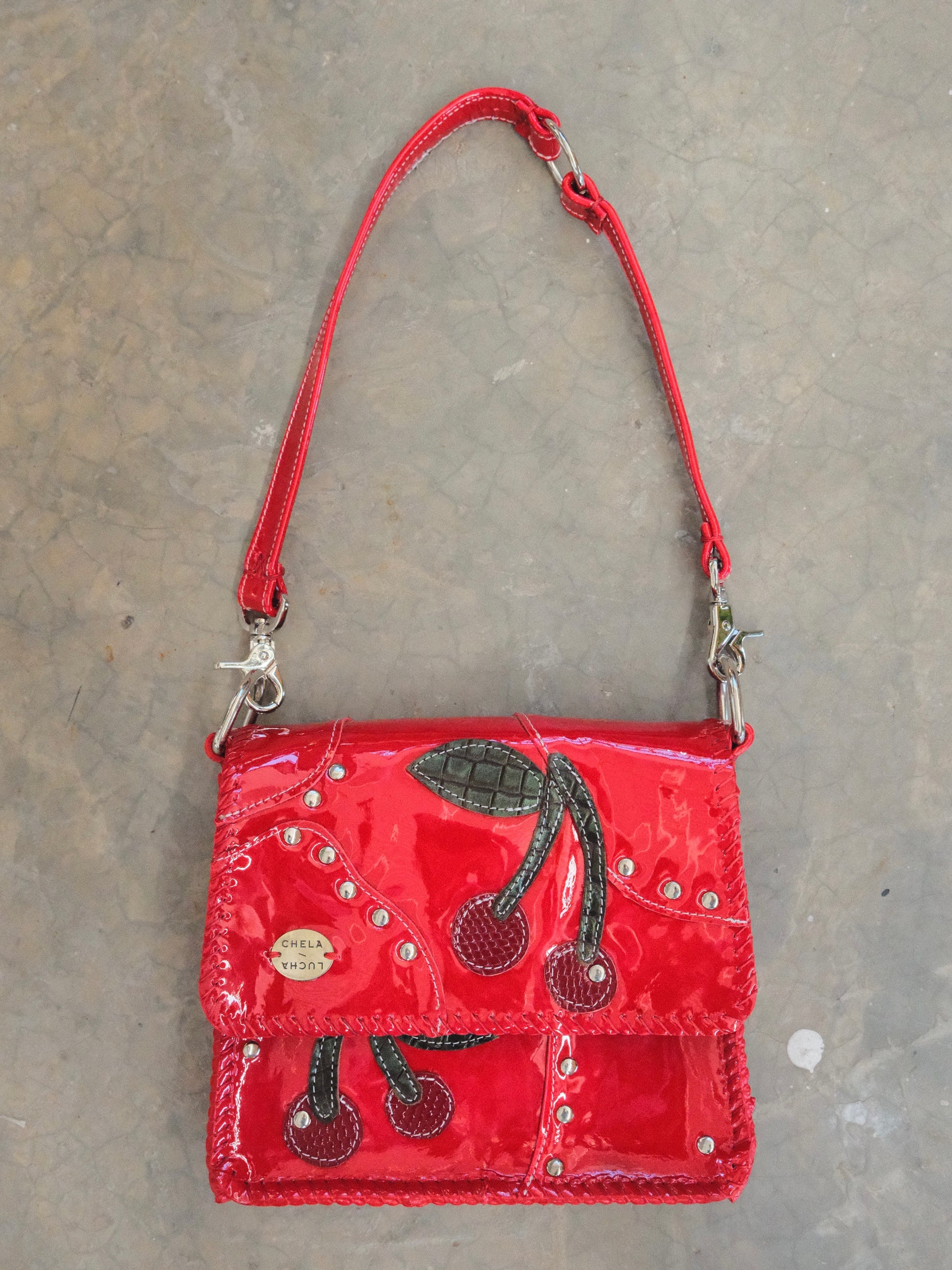 Bolsa CHAYO hecha con pedacera de piel en tono rojo charol, tinto y verde. Detalles de remaches en tono plateado.