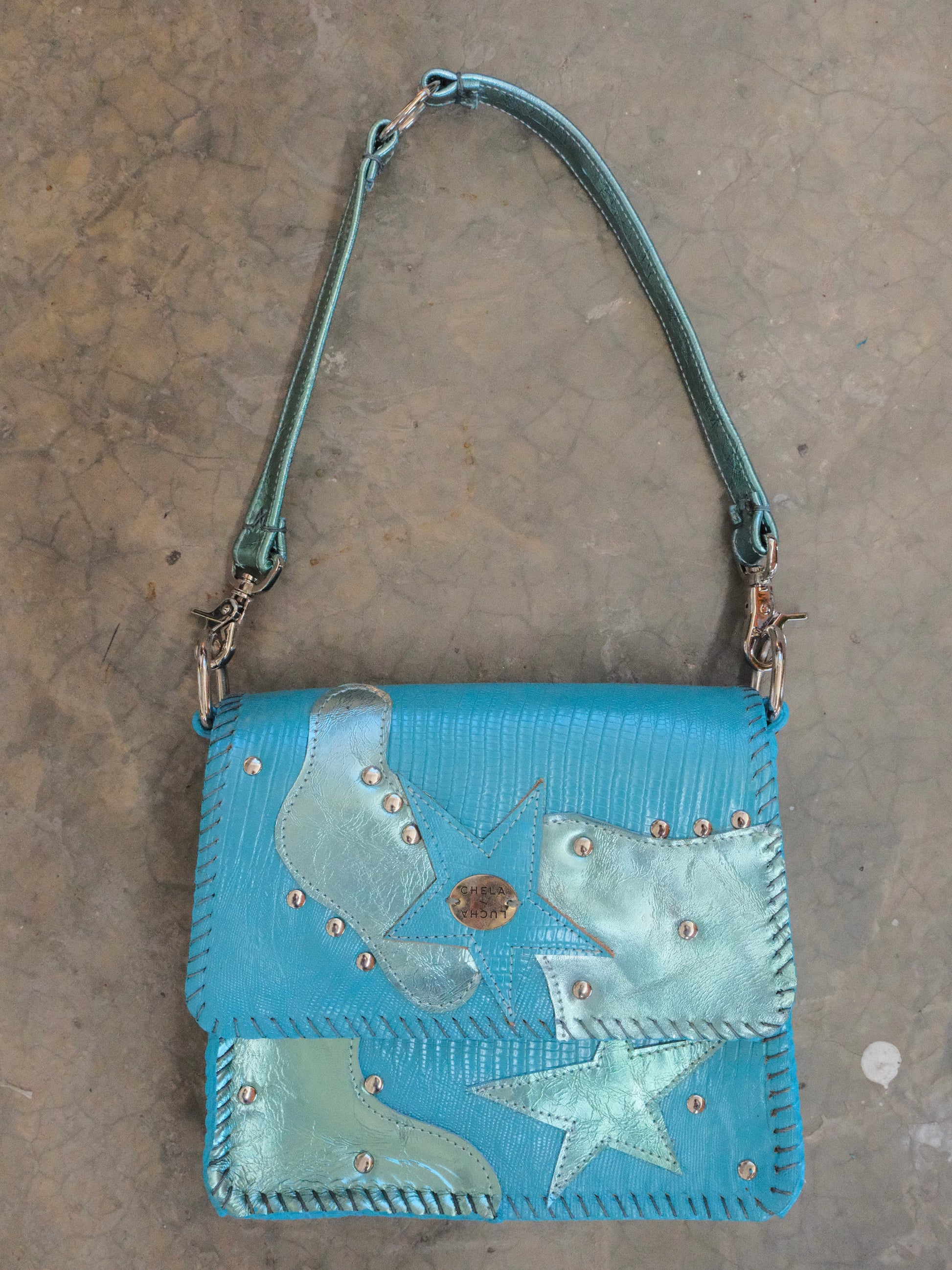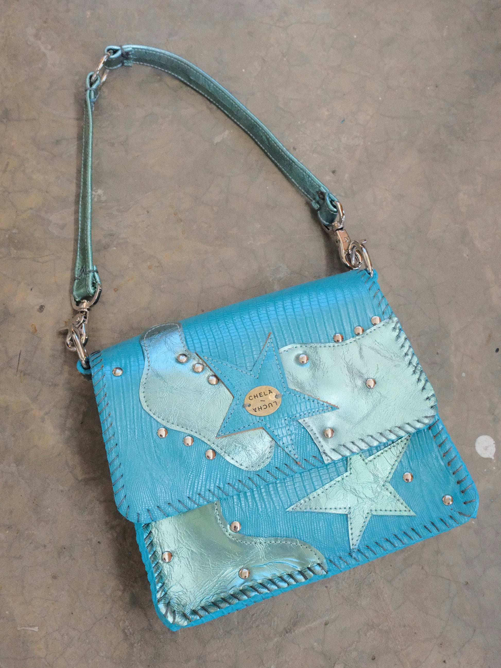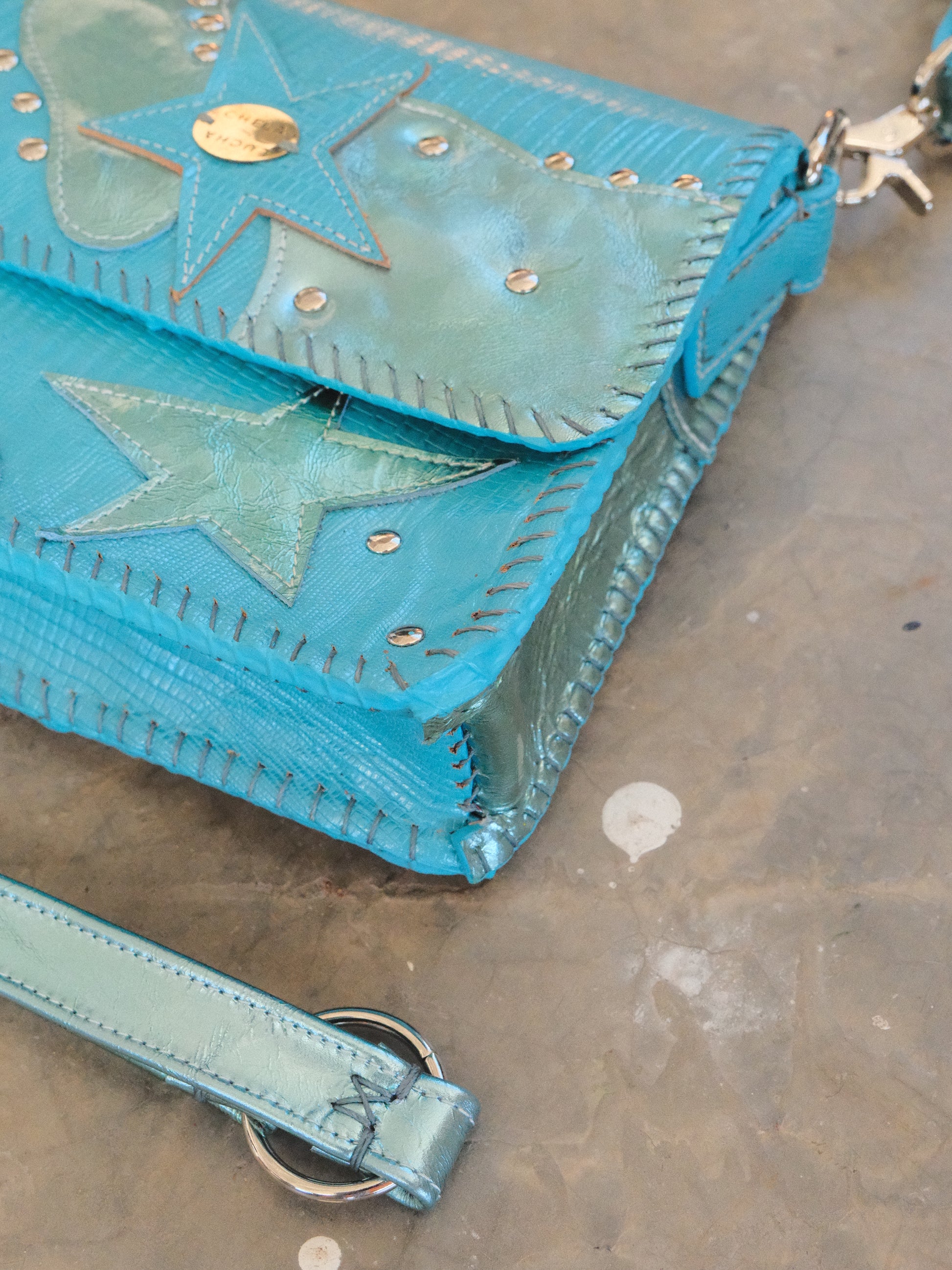 Bolsa CHAYO hecha con pedacera de piel en tonos azules. Detalles de remaches en tono plateado.