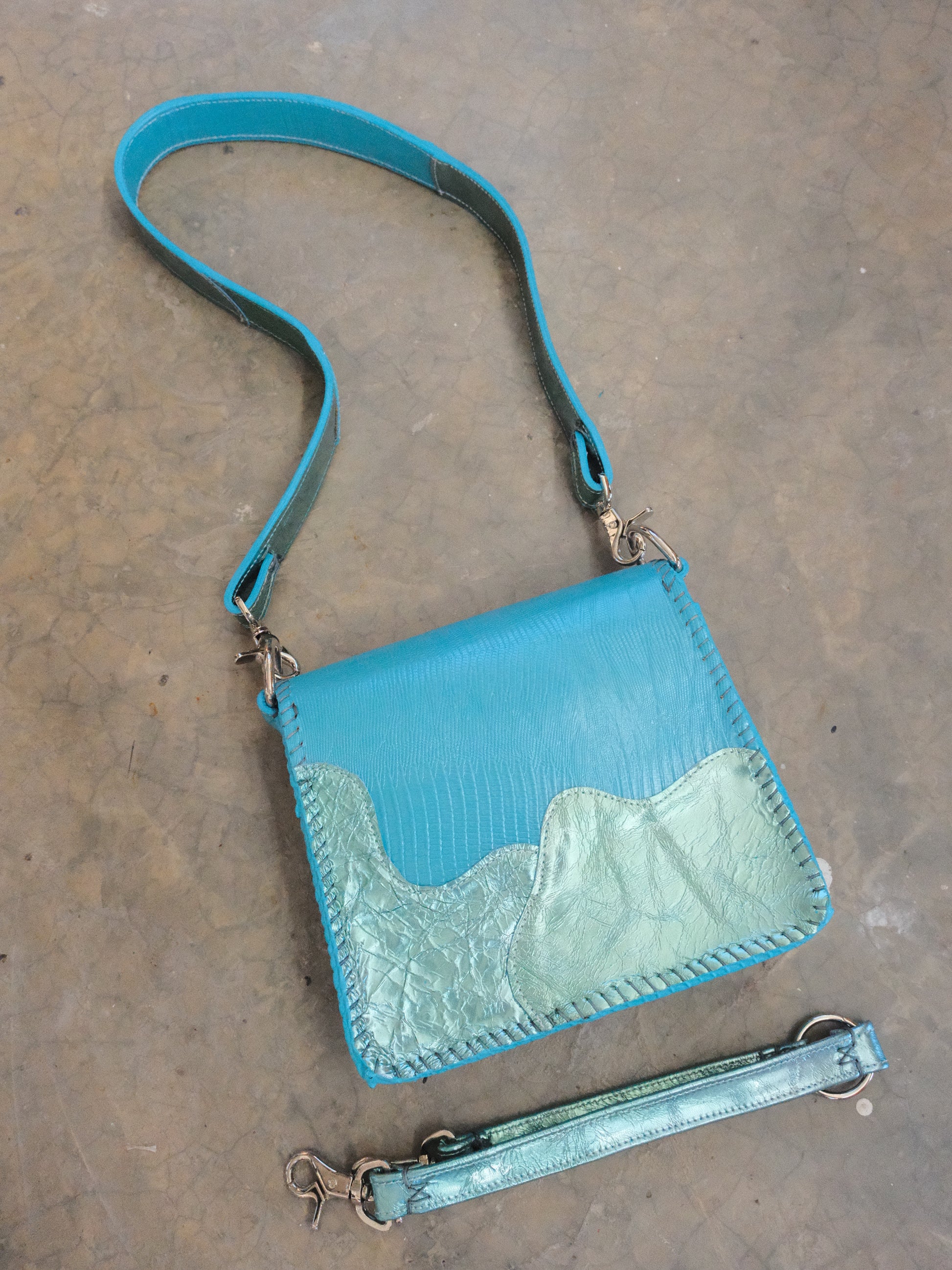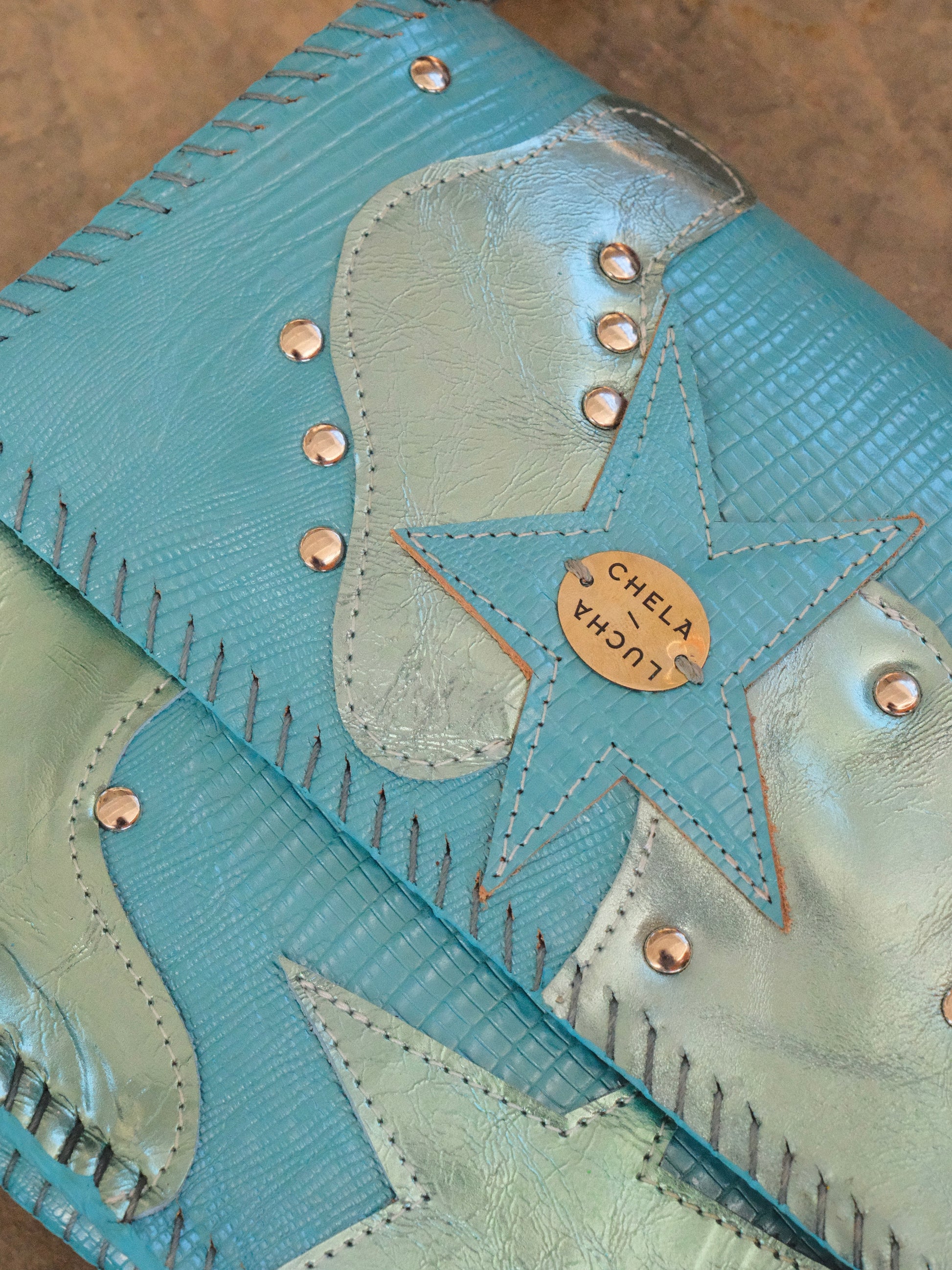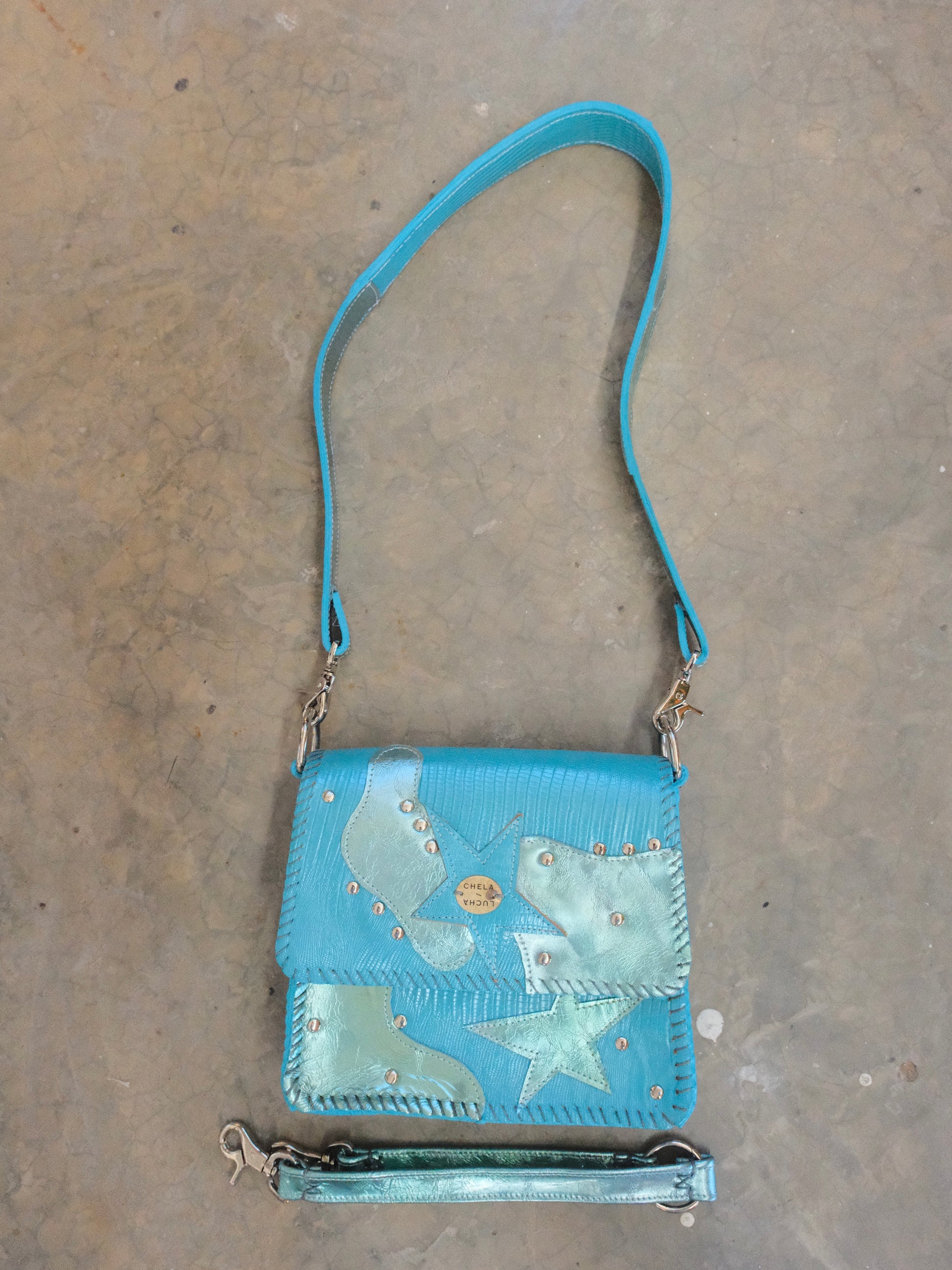 Bolsa CHAYO hecha con pedacera de piel en tonos azules. Detalles de remaches en tono plateado.