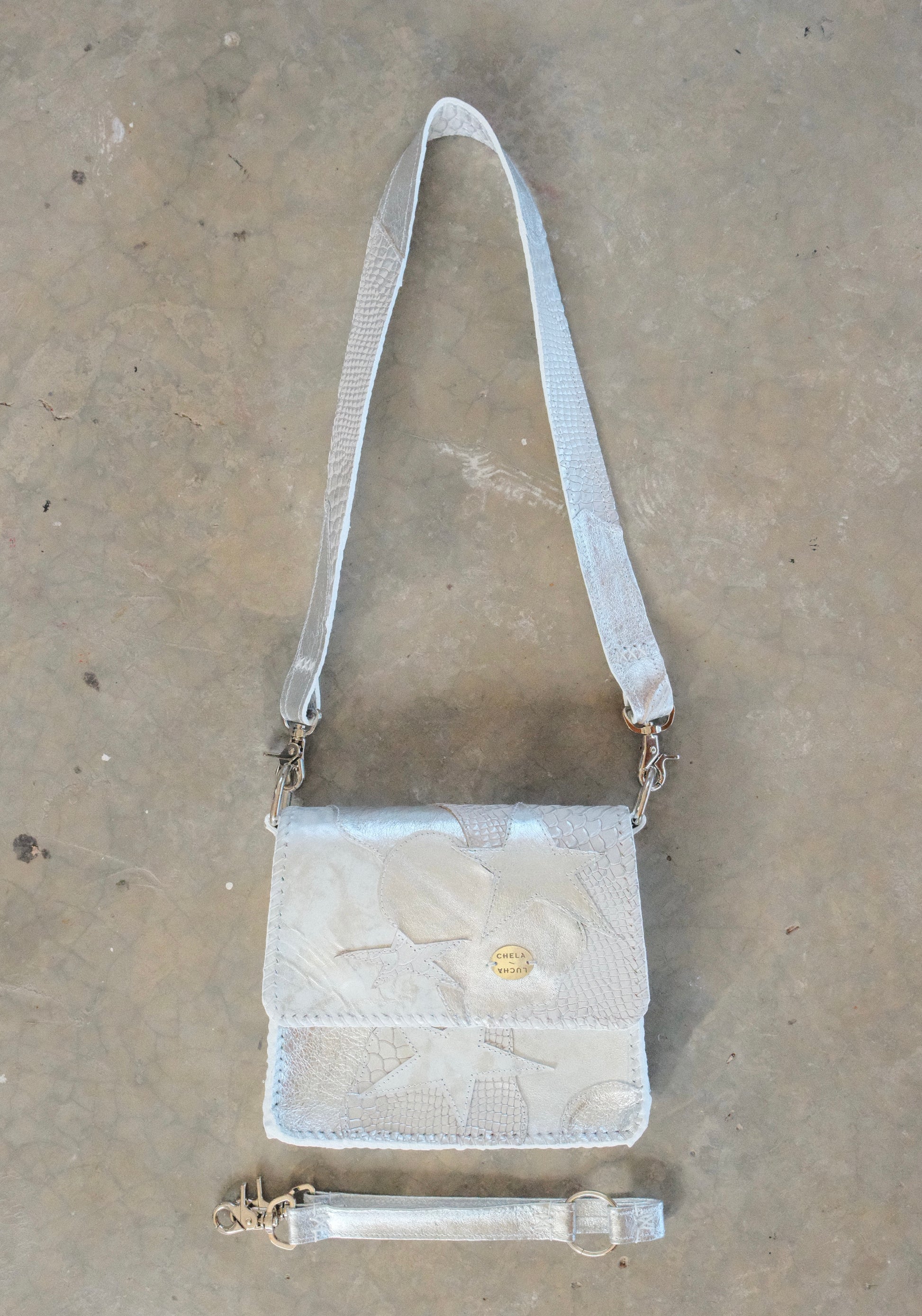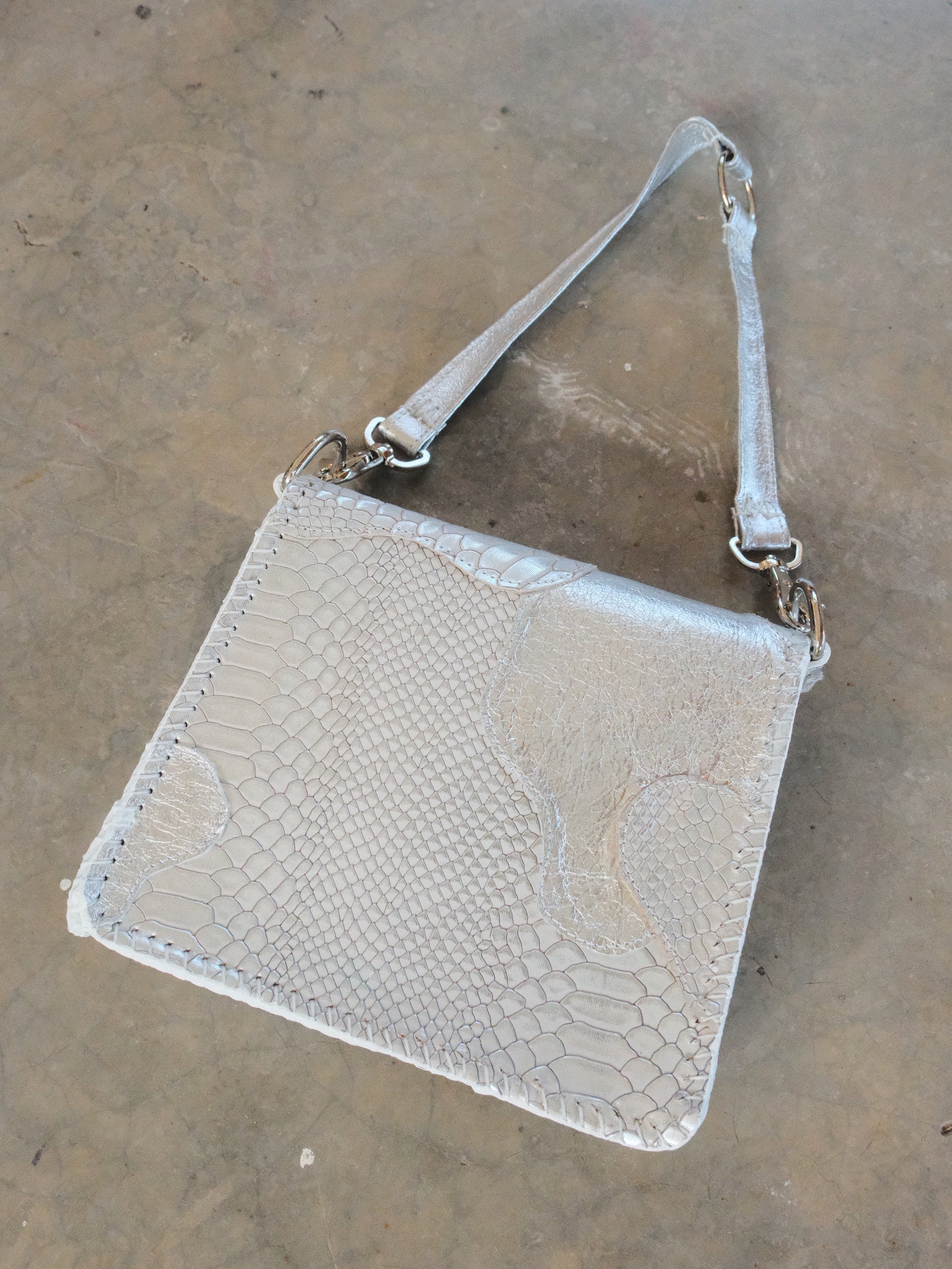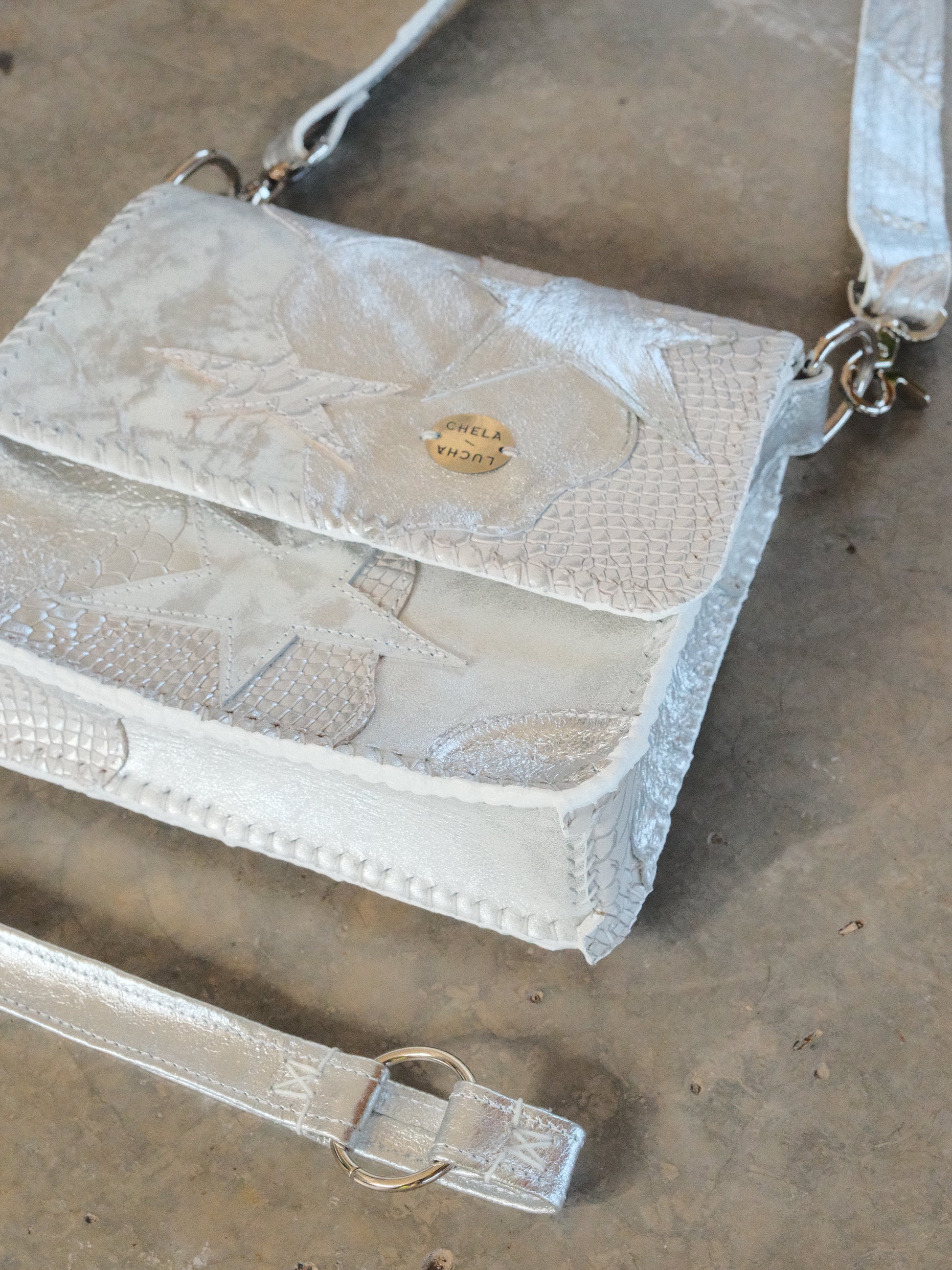 Bolsa CHAYO hecha con pedacera de piel en tono plateado.