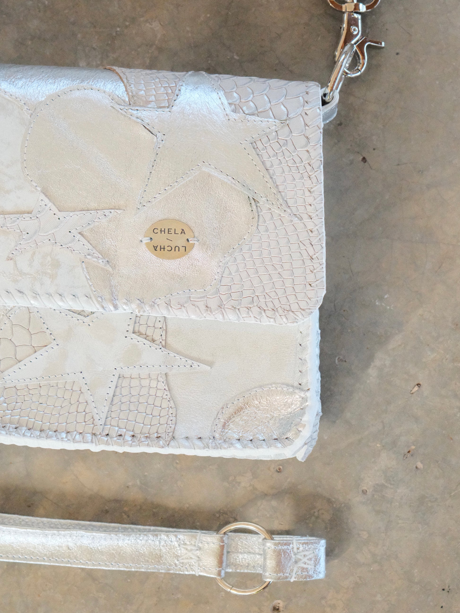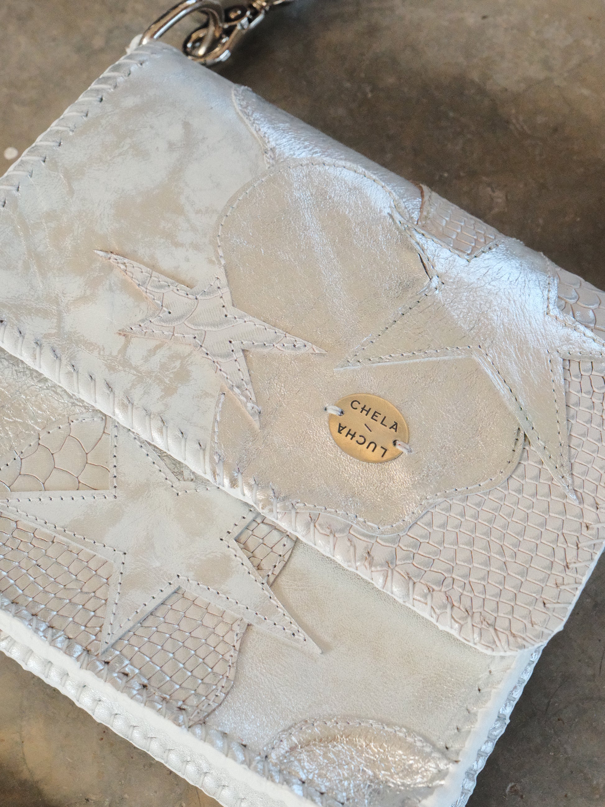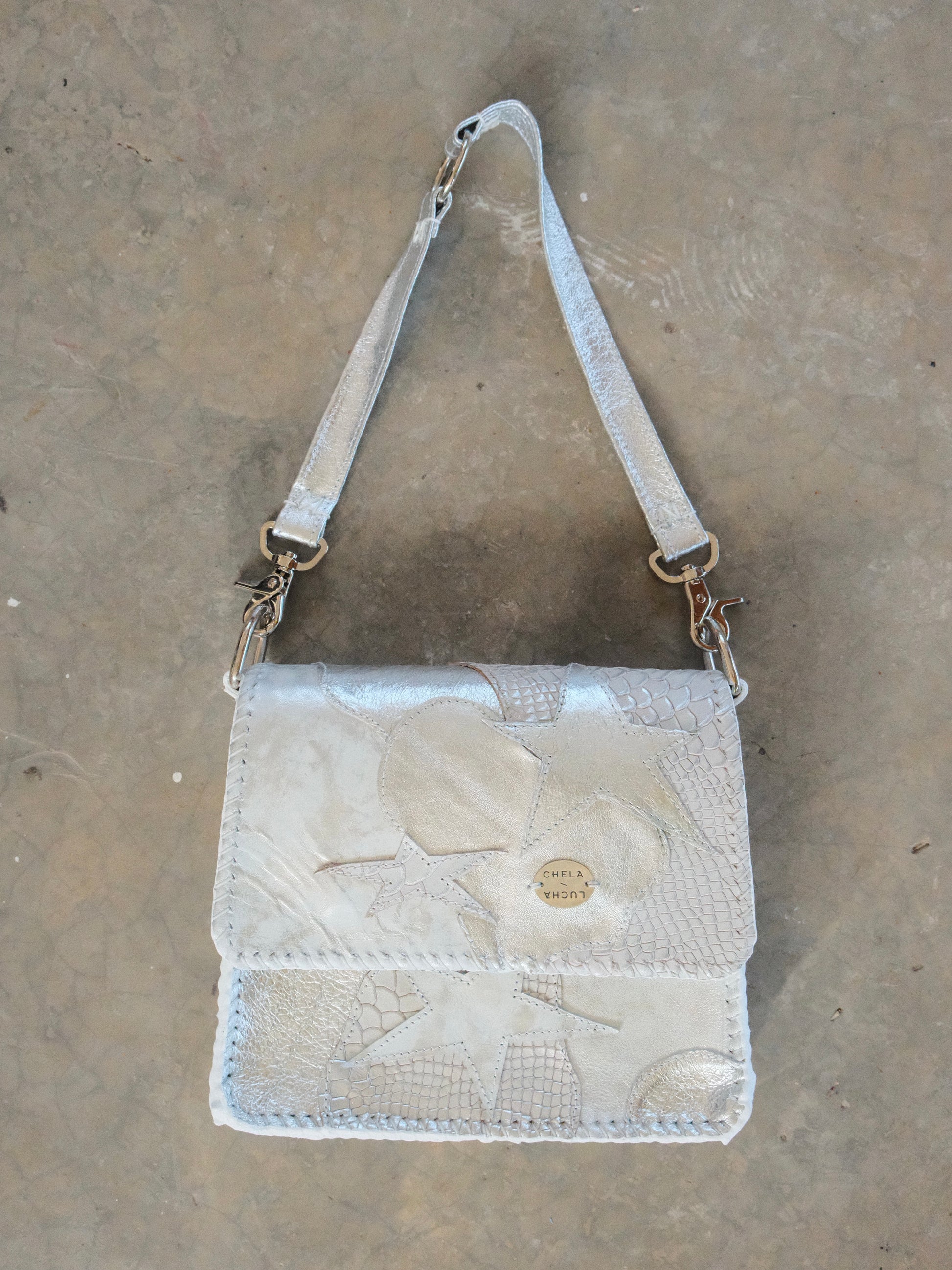 Bolsa CHAYO hecha con pedacera de piel en tono plateado.