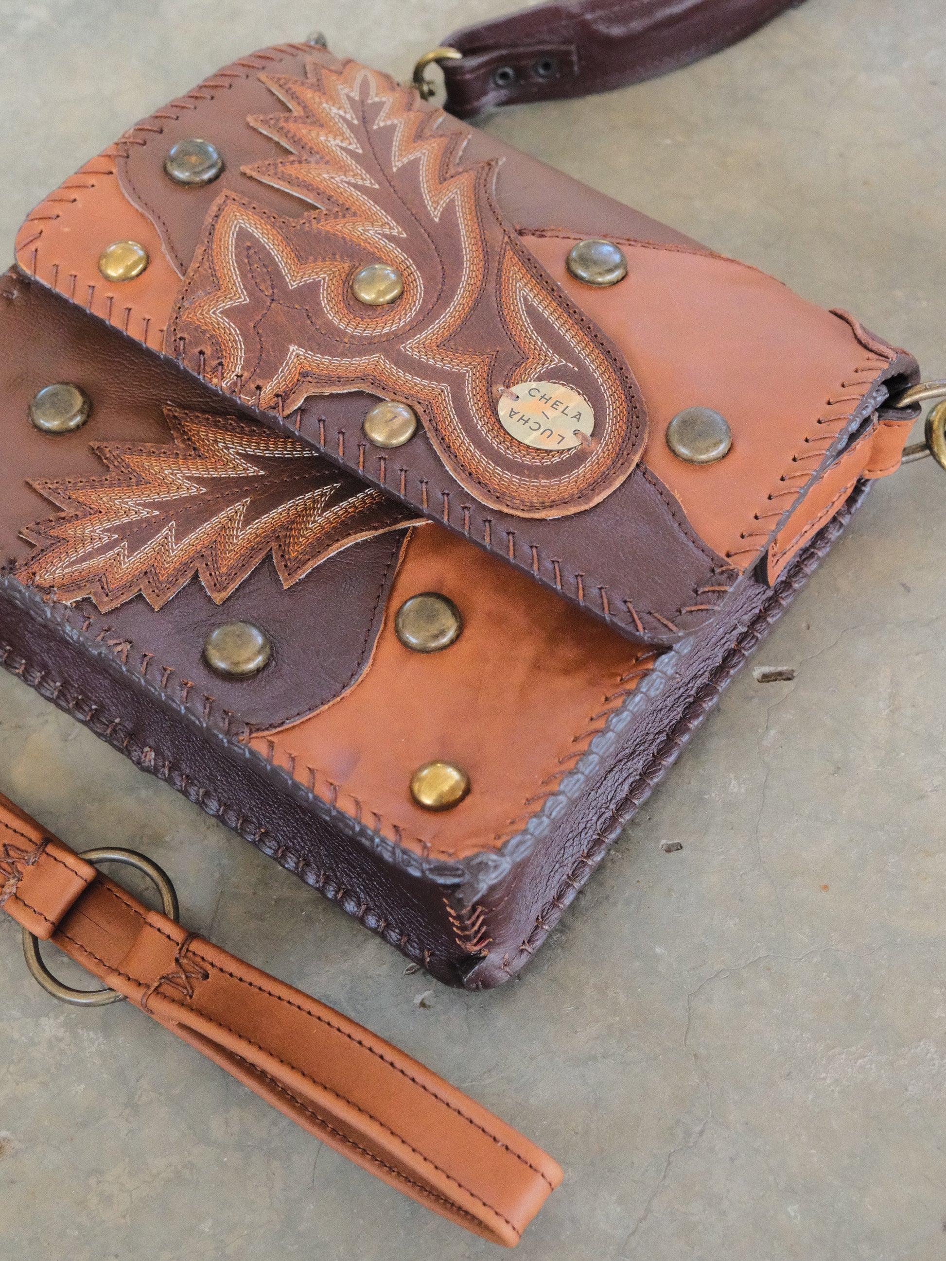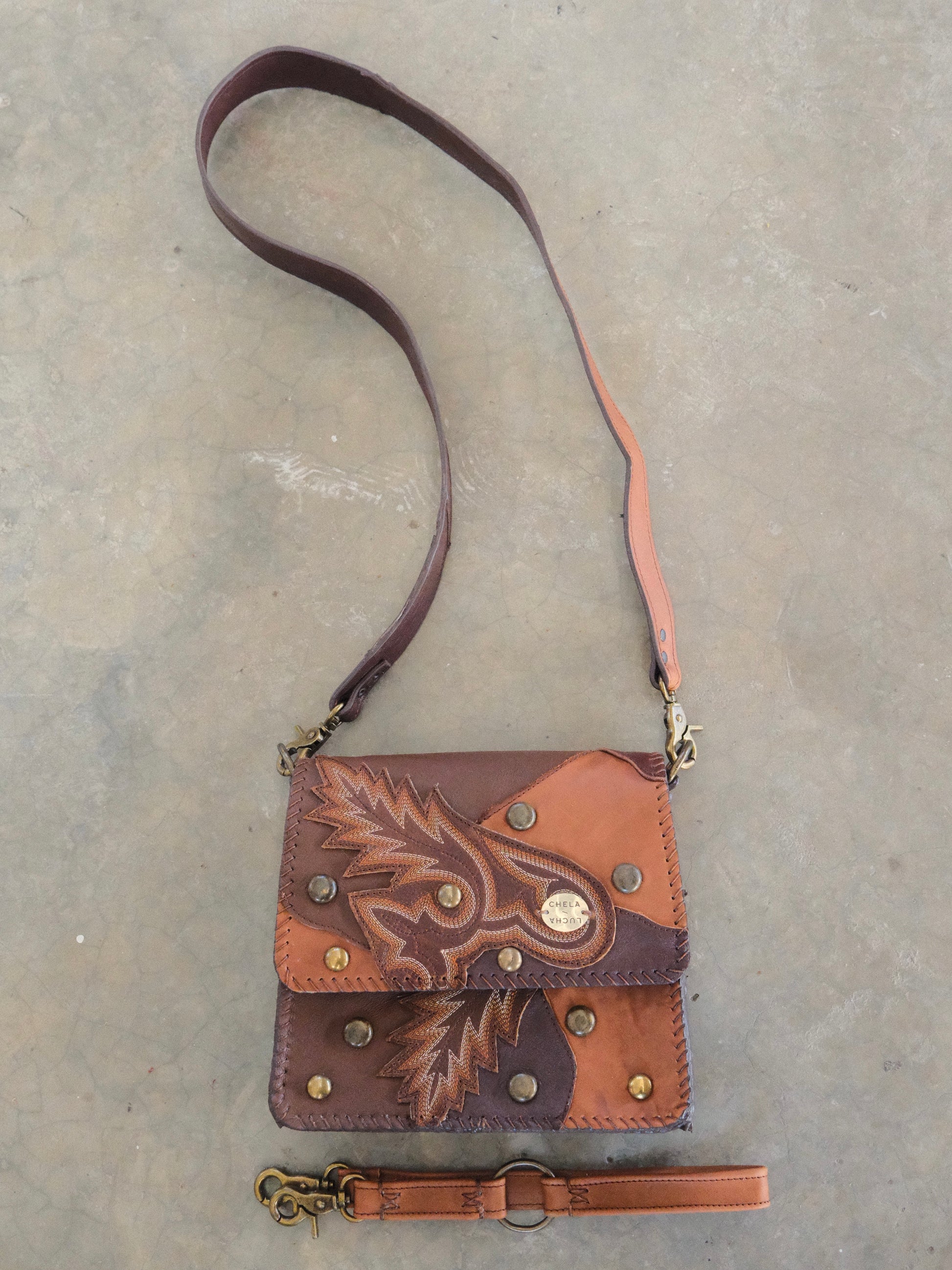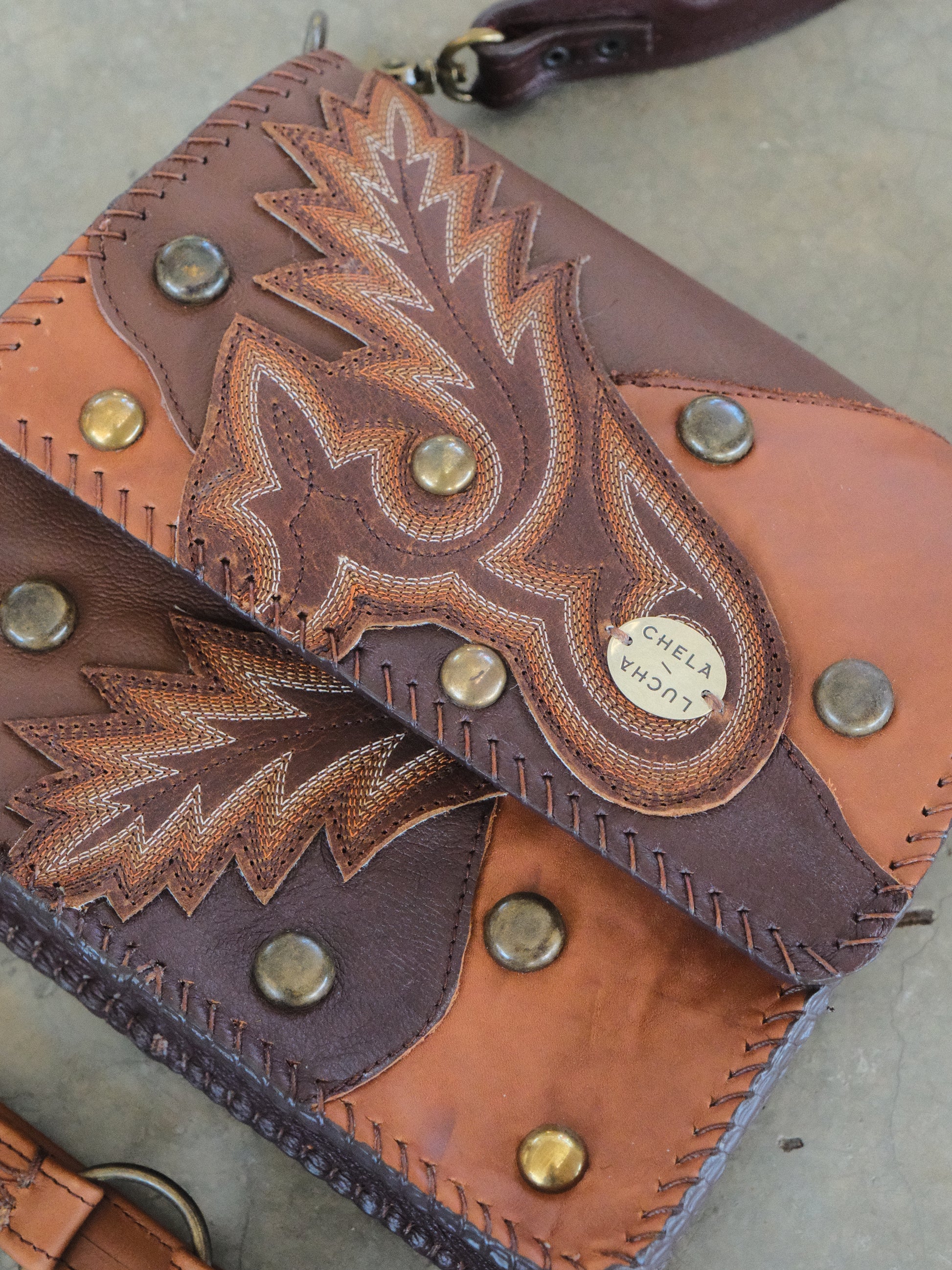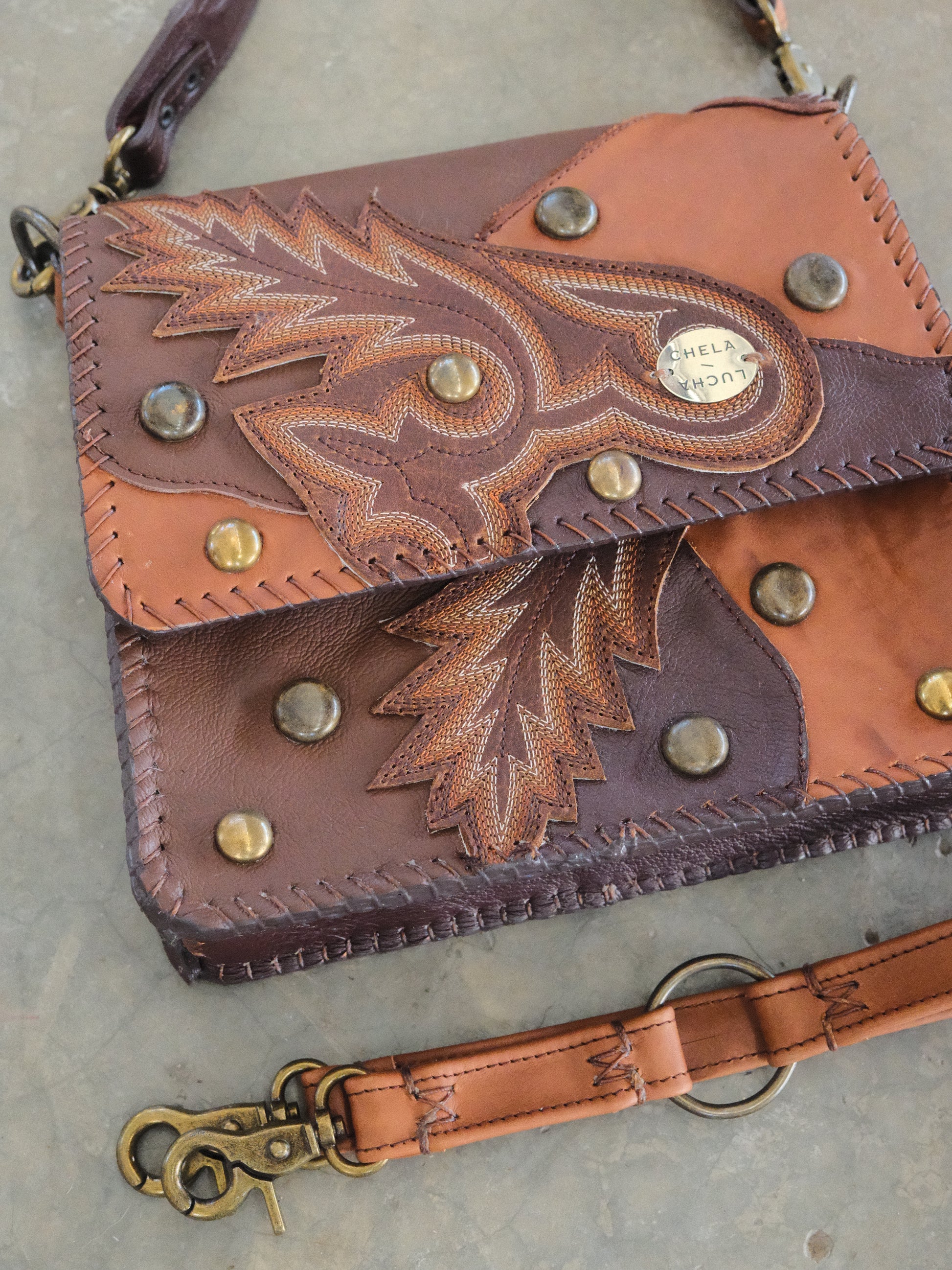 Bolsa CHAYO hecha con pedacera de piel en tonos cafés. Detalles de estoperoles en tono cromado.