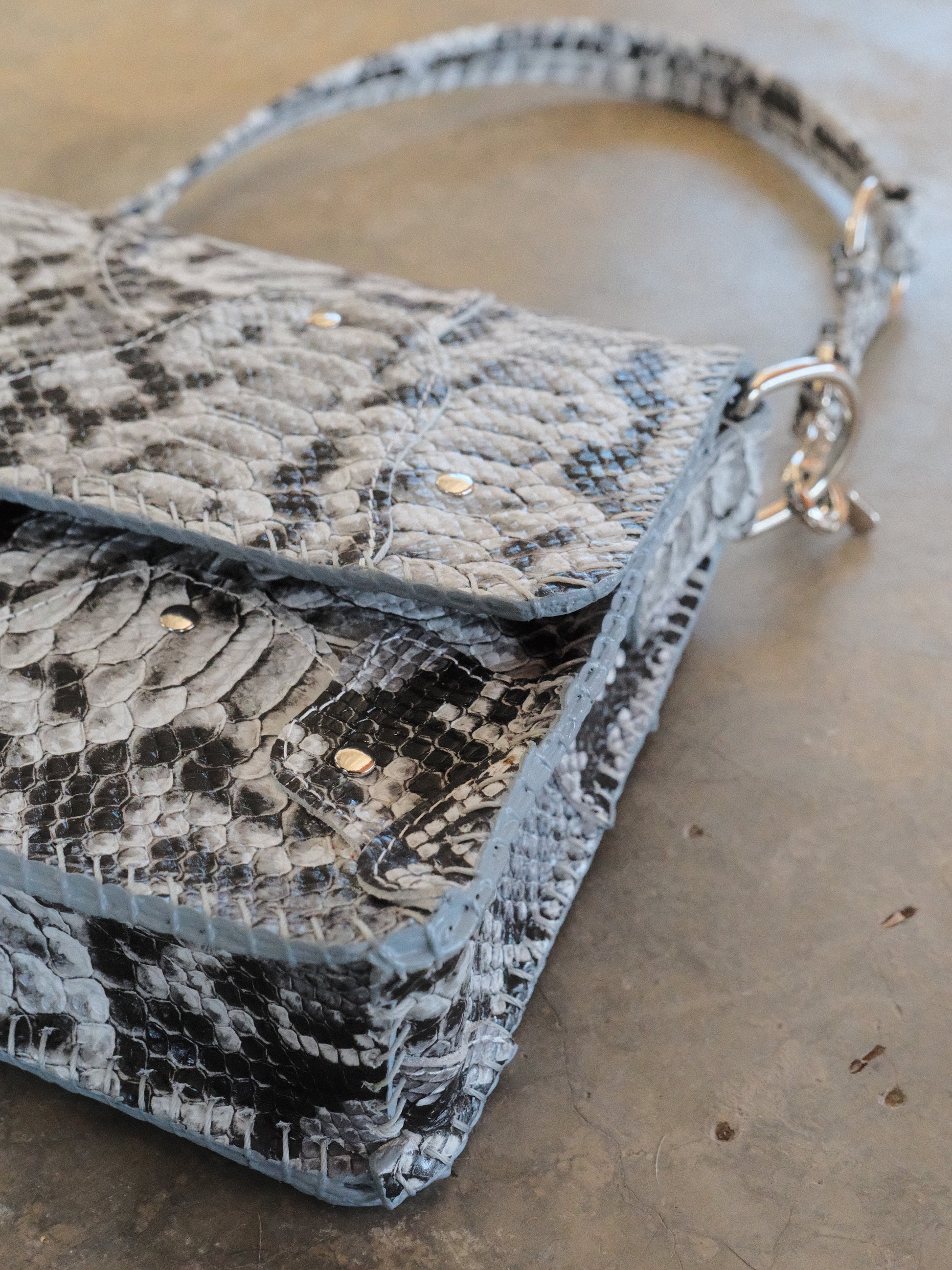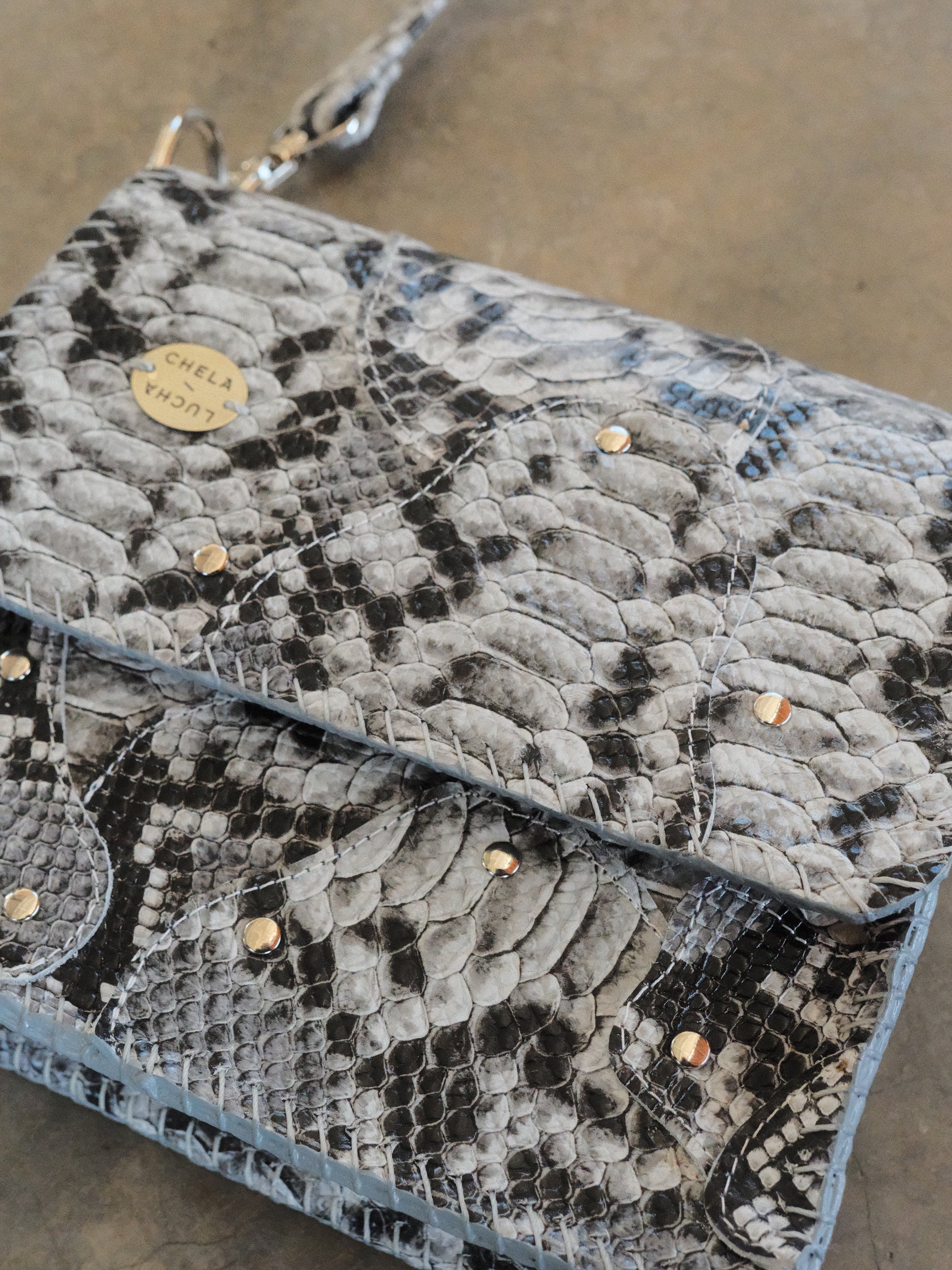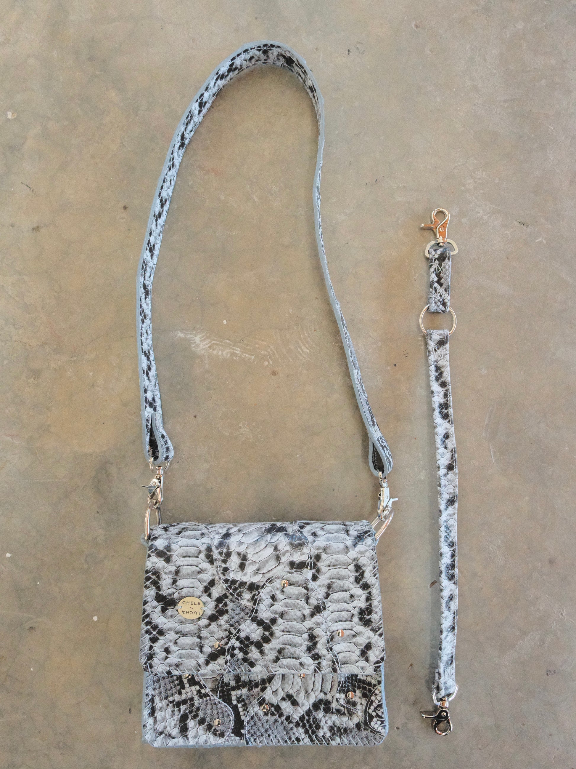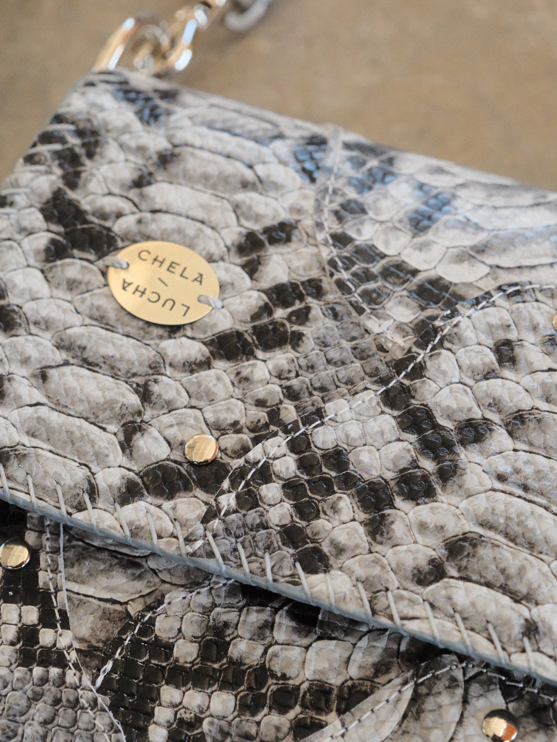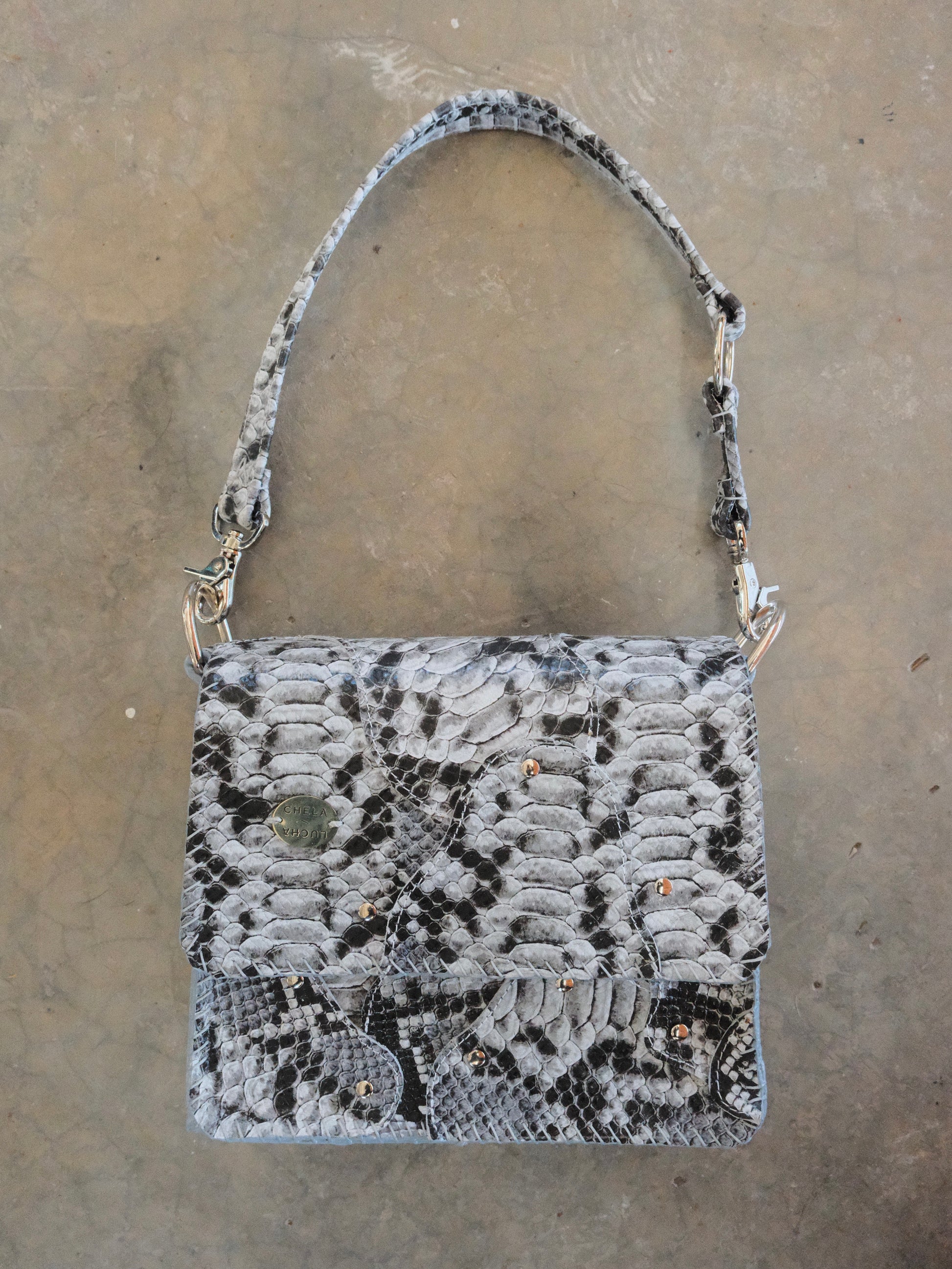 Bolsa CHAYO hecha con pedacera de piel imitación serpiente.