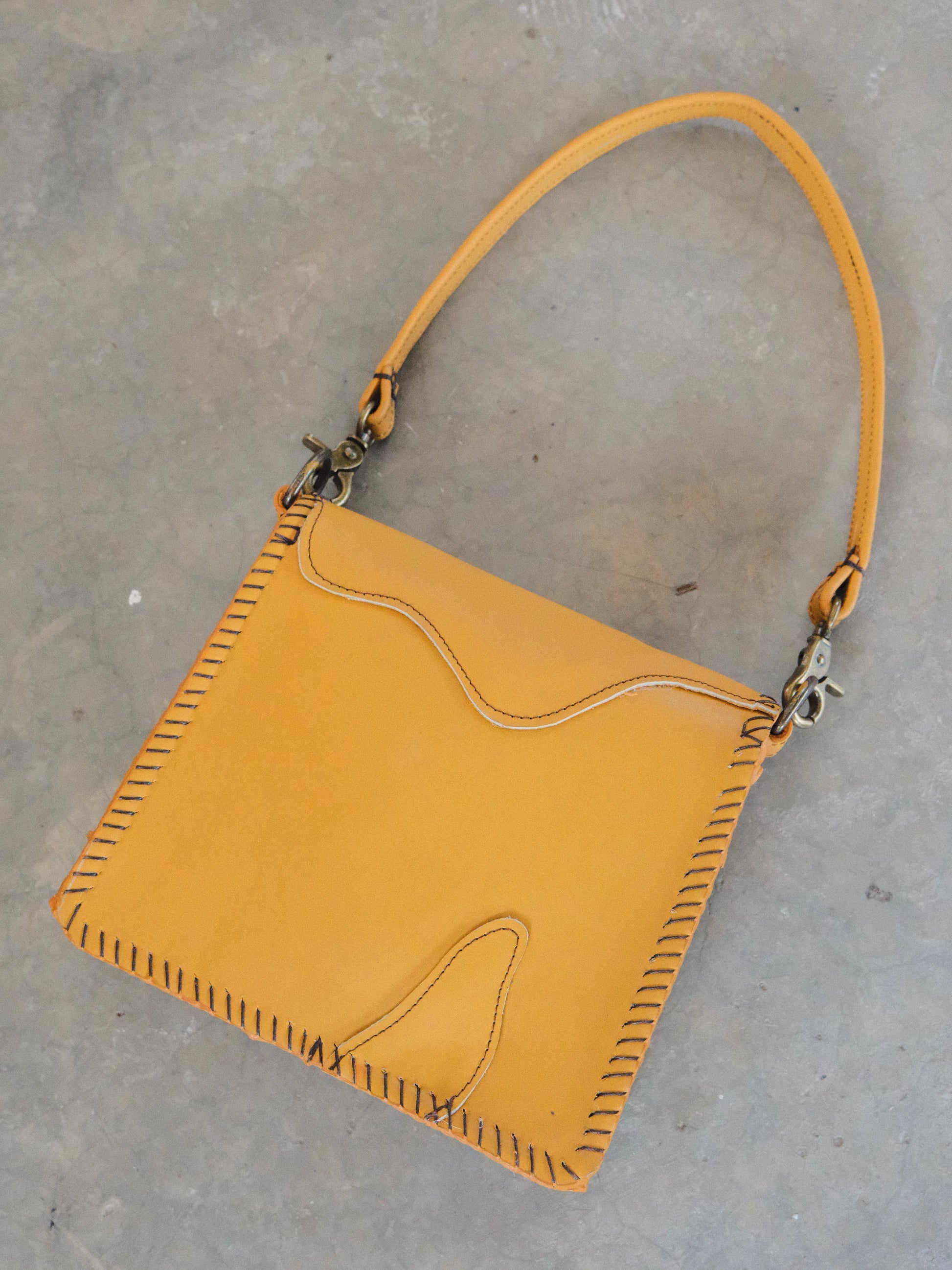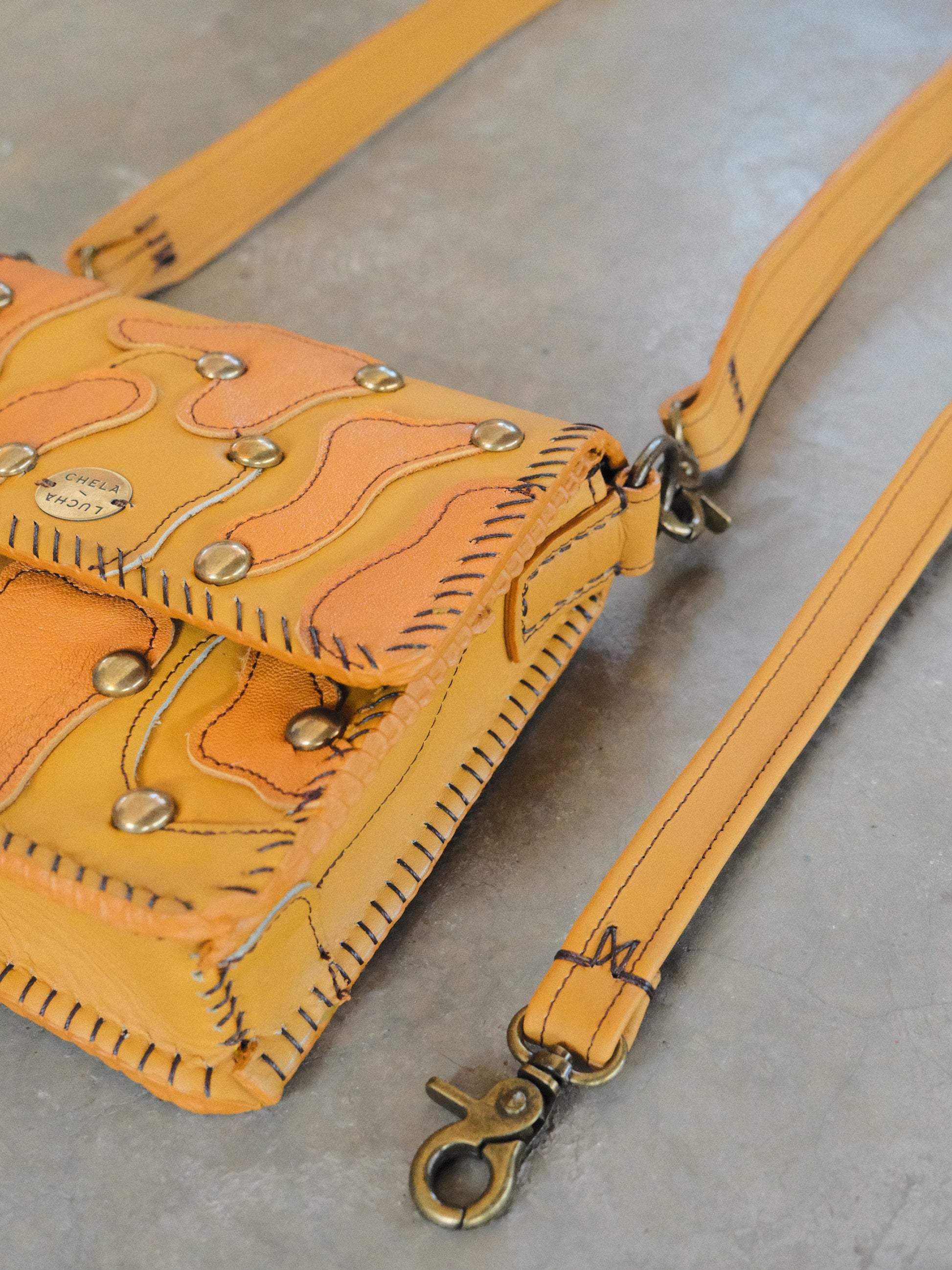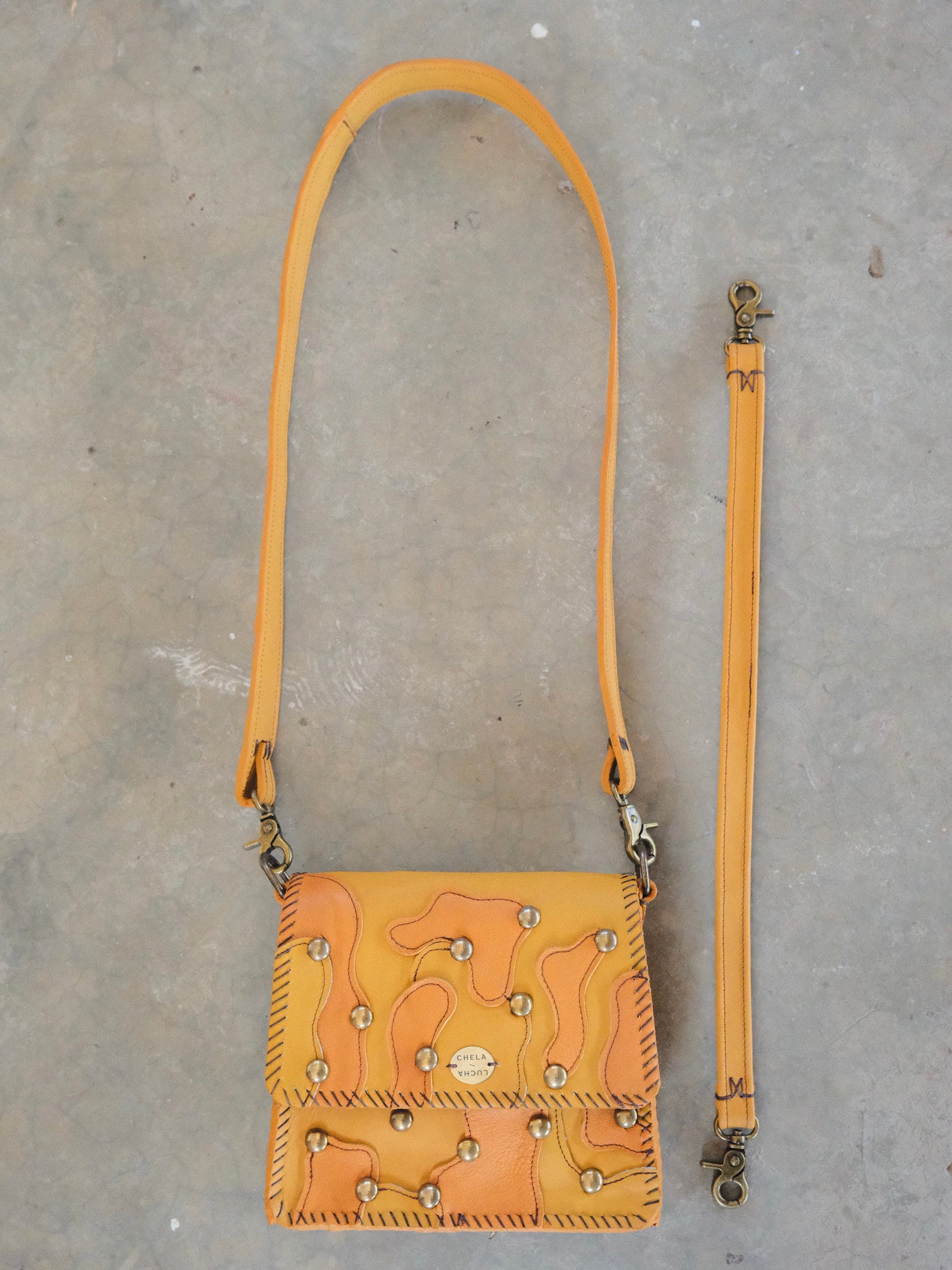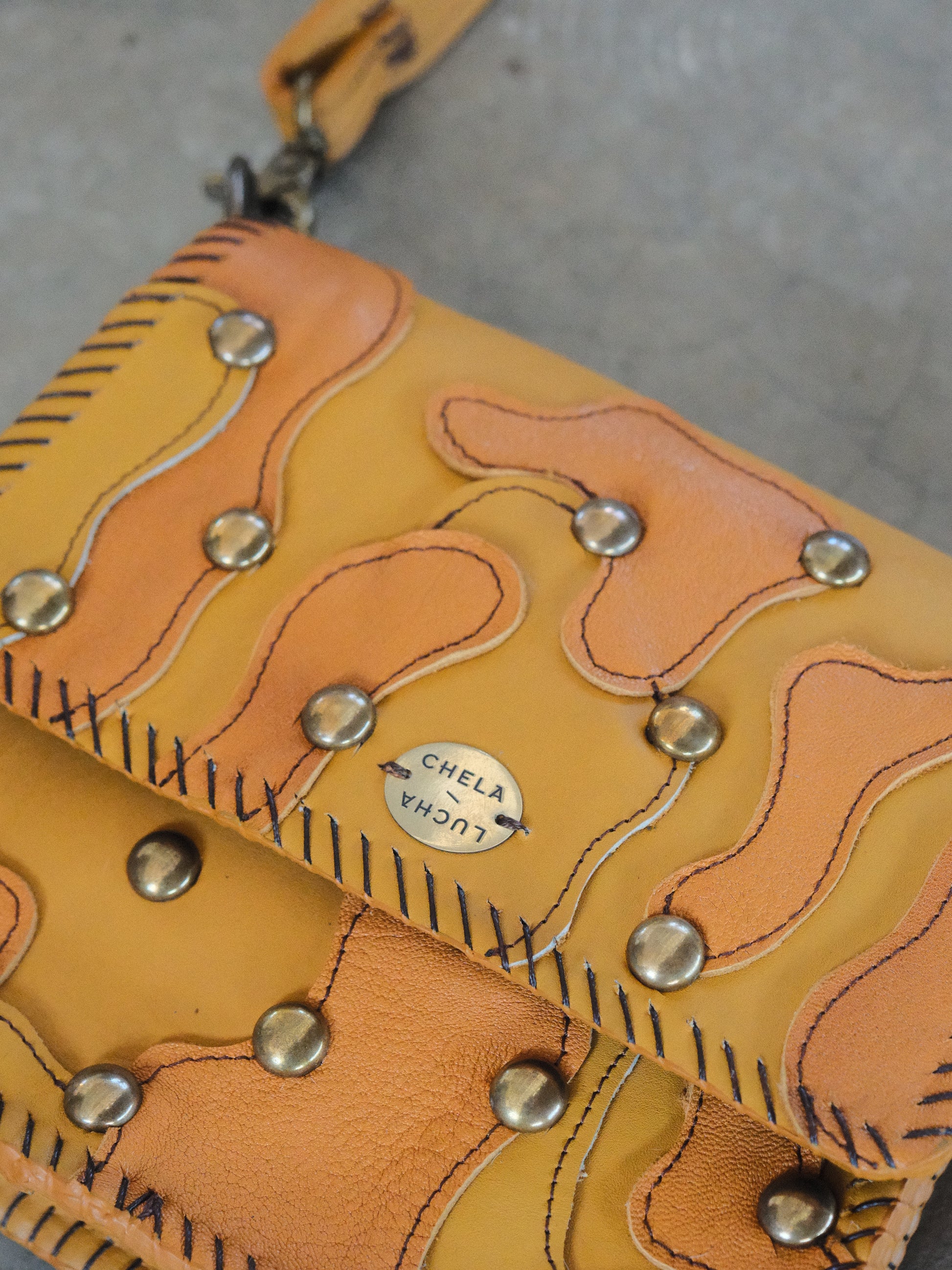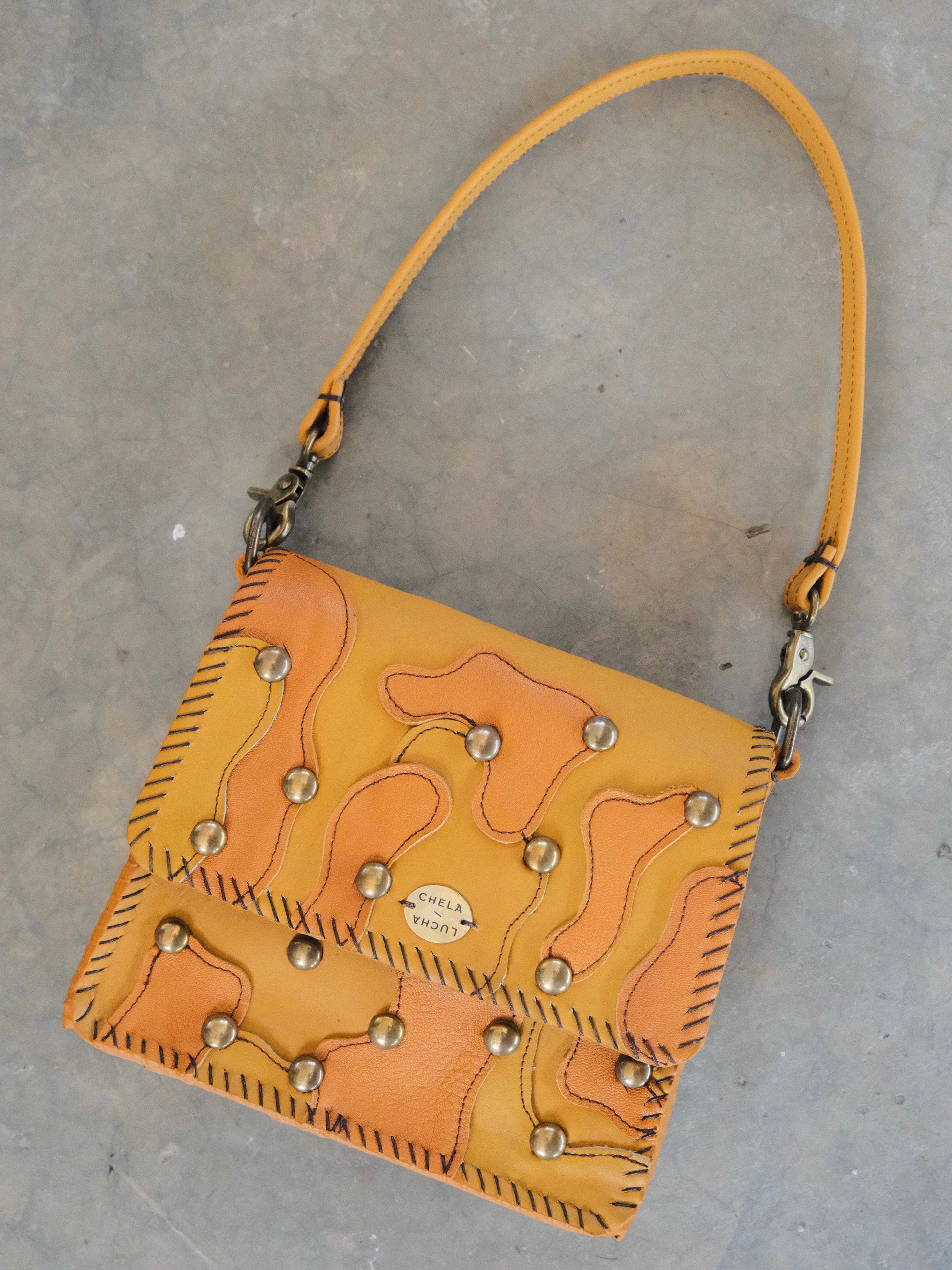 Bolsa CHAYO hecha con pedacera de piel en tonos mostaza. Detalles de estoperoles en tono cromado.
