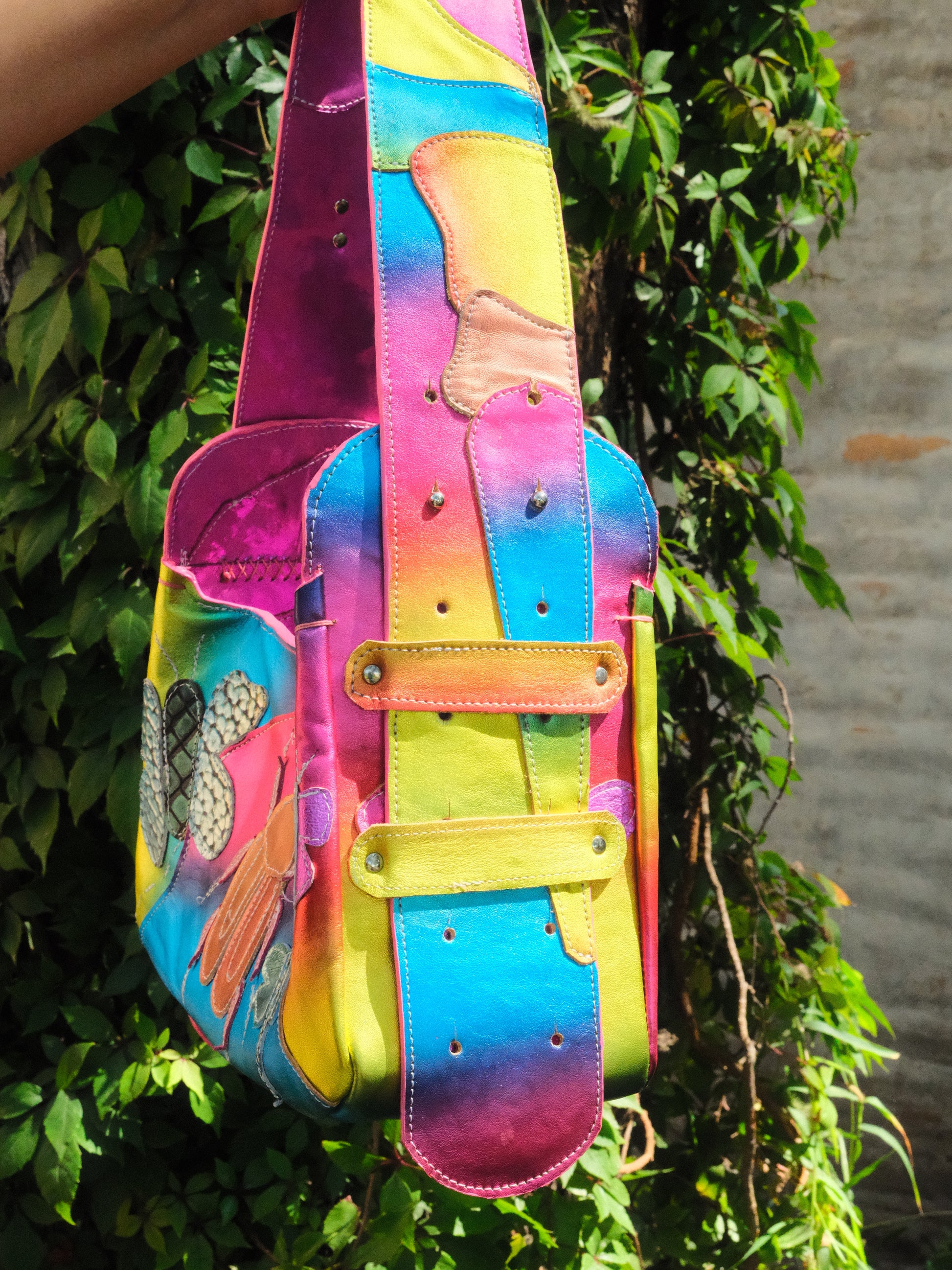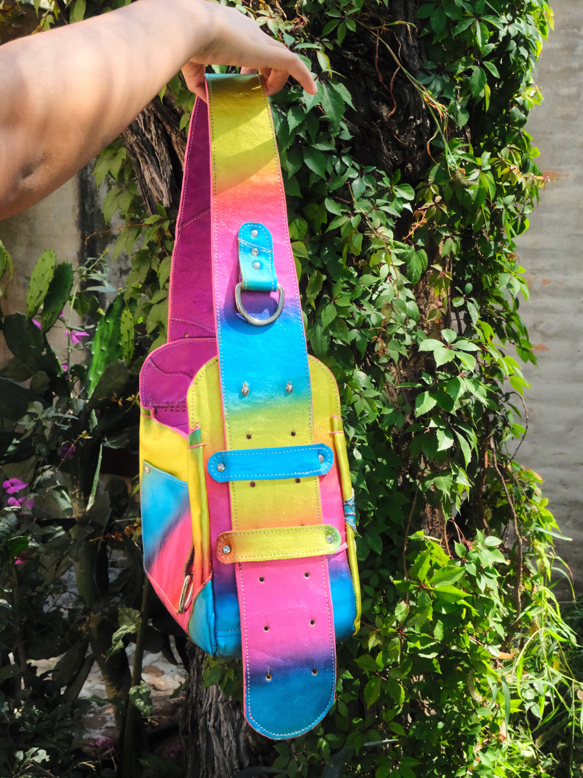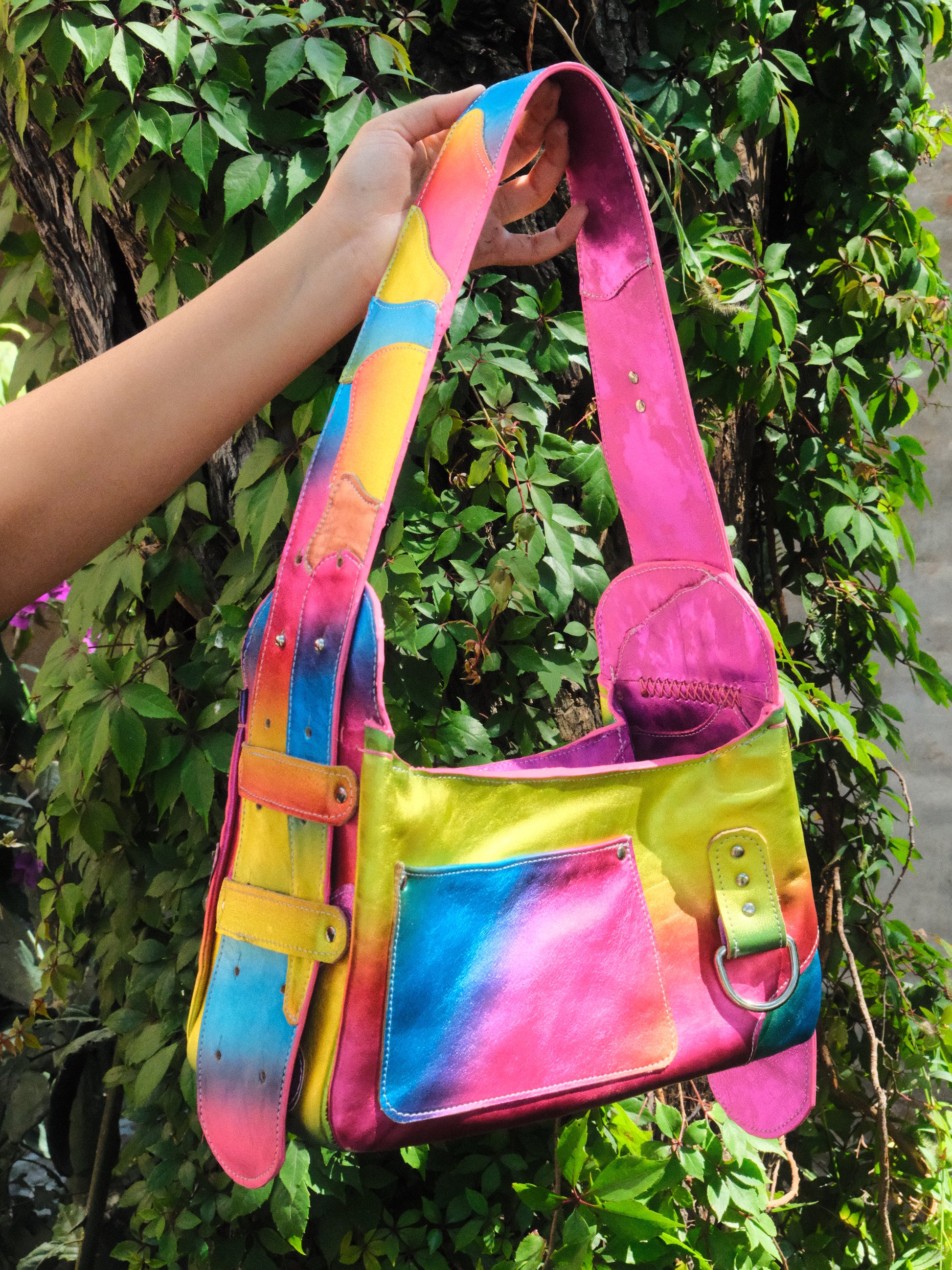 Bolsa CHILO hecha con pedacera de piel en tonos variados. Detalles de remaches en tono plateado.