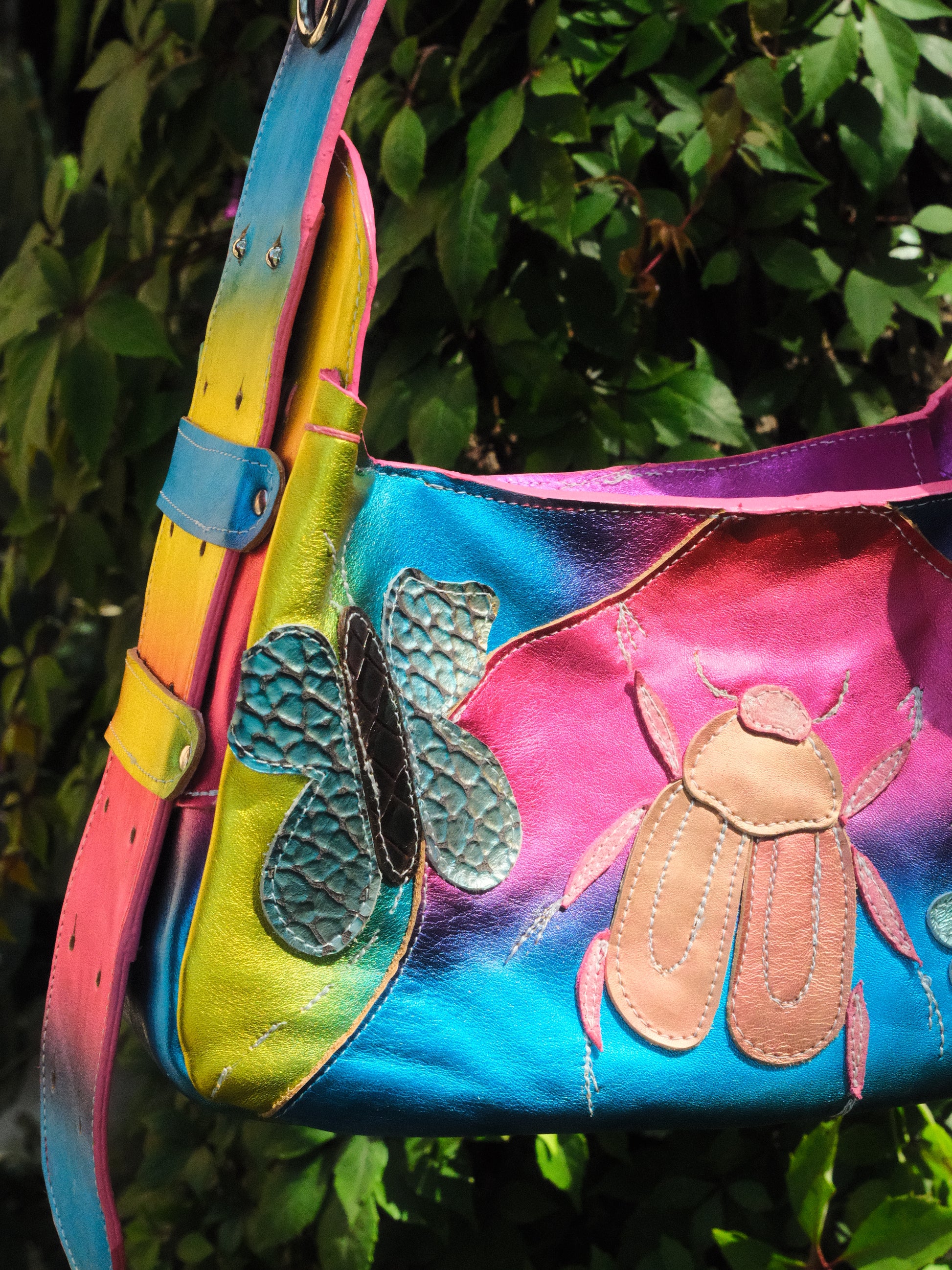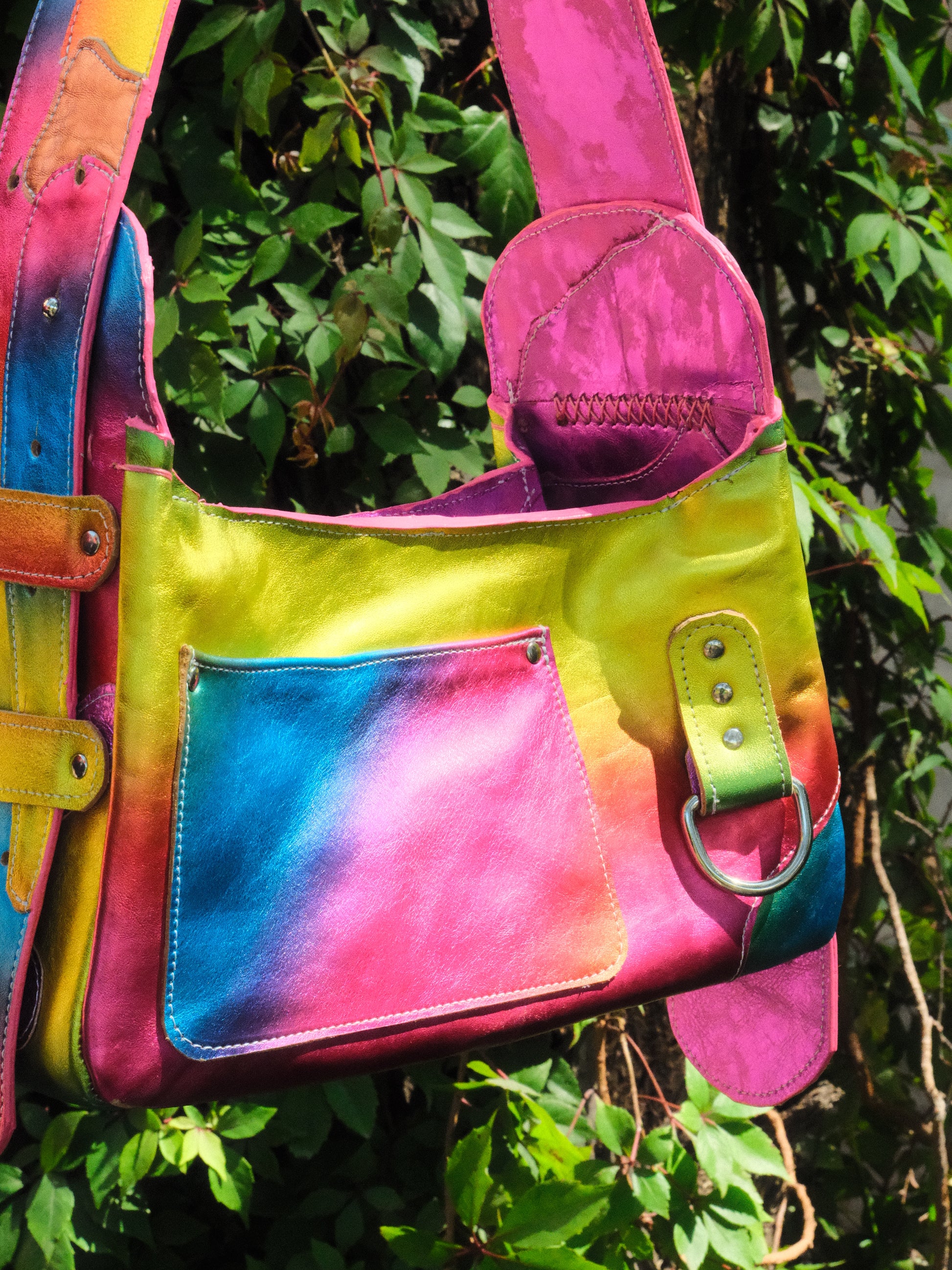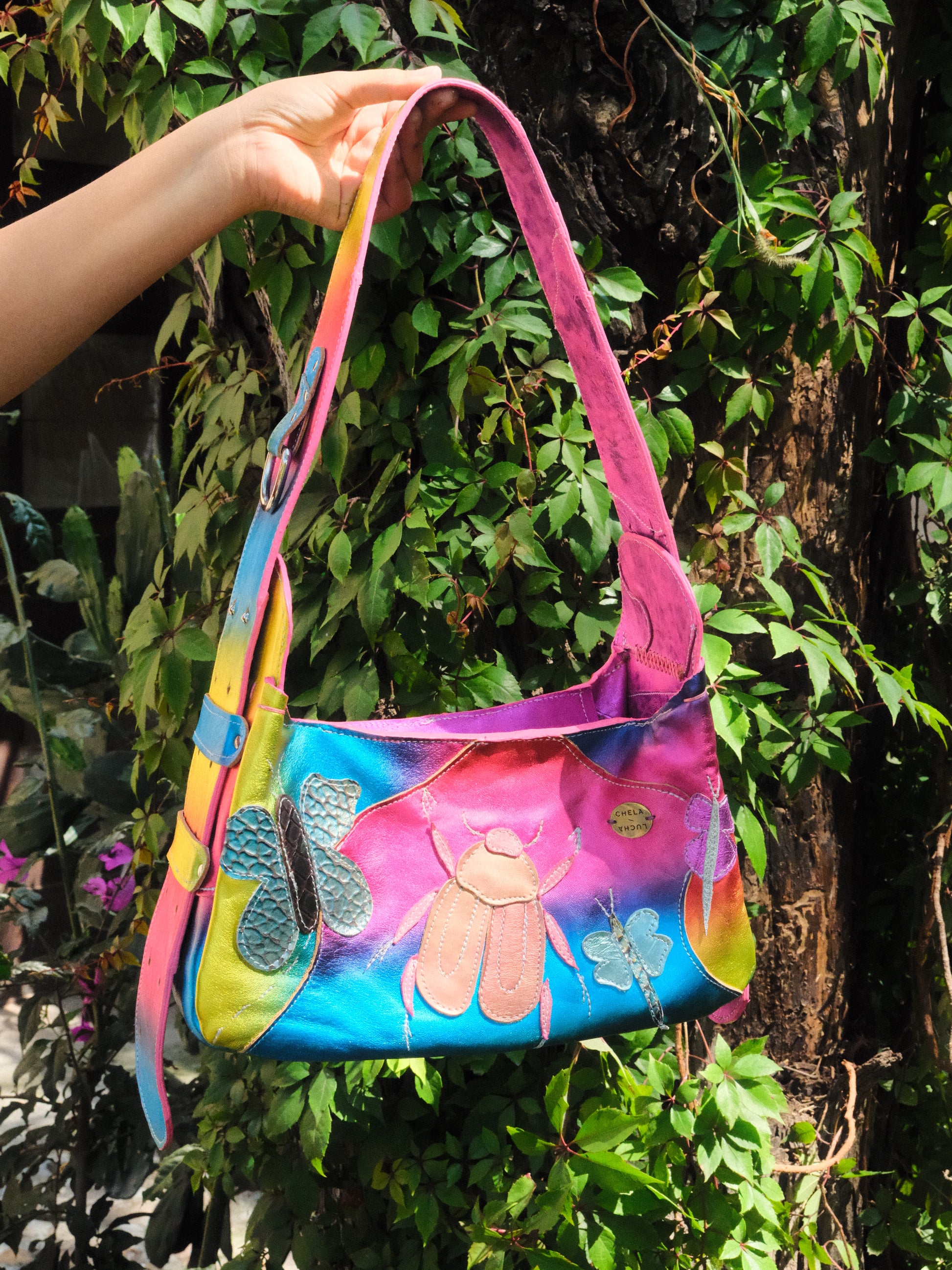 Bolsa CHILO hecha con pedacera de piel en tonos variados. Detalles de remaches en tono plateado.