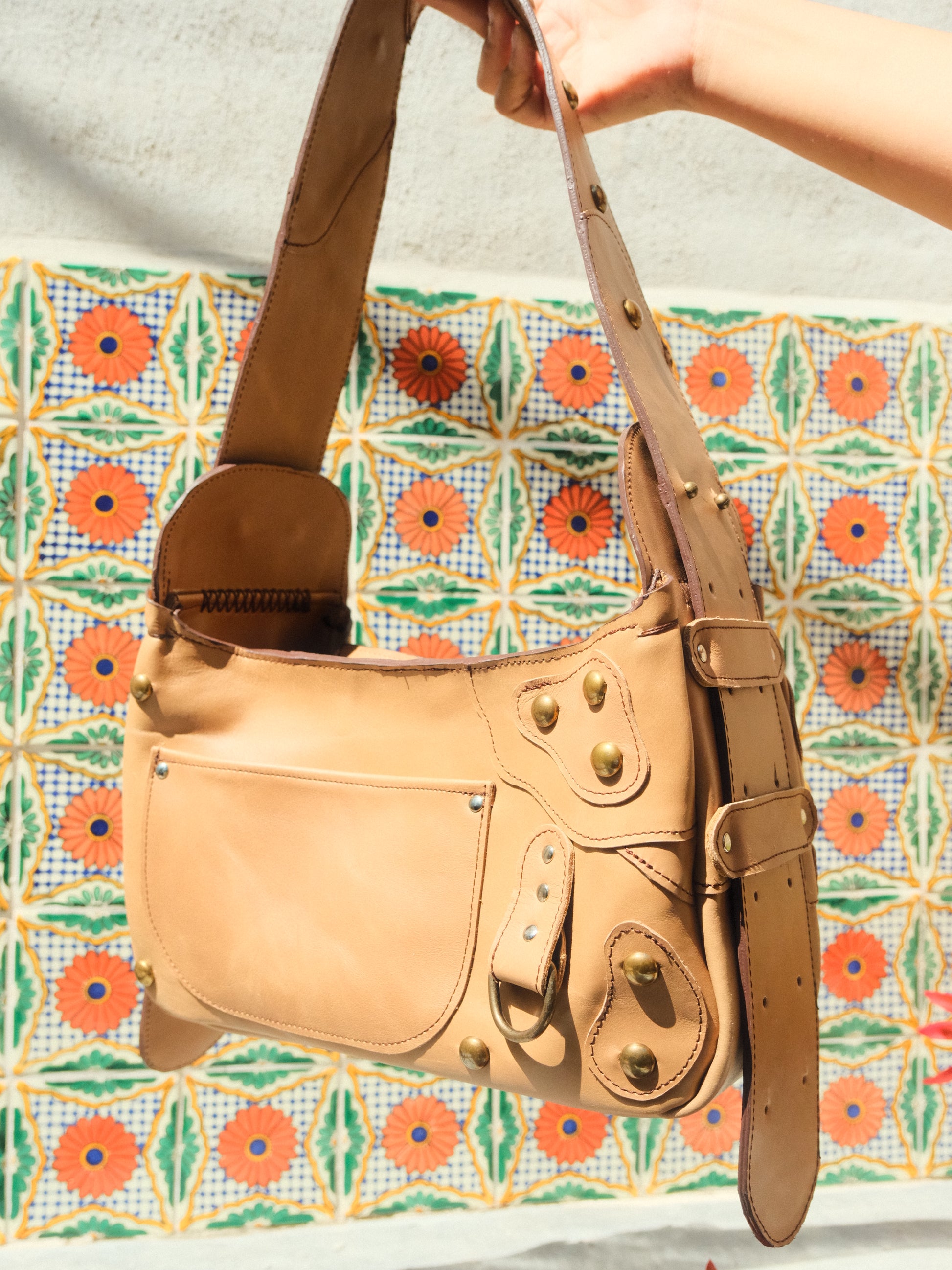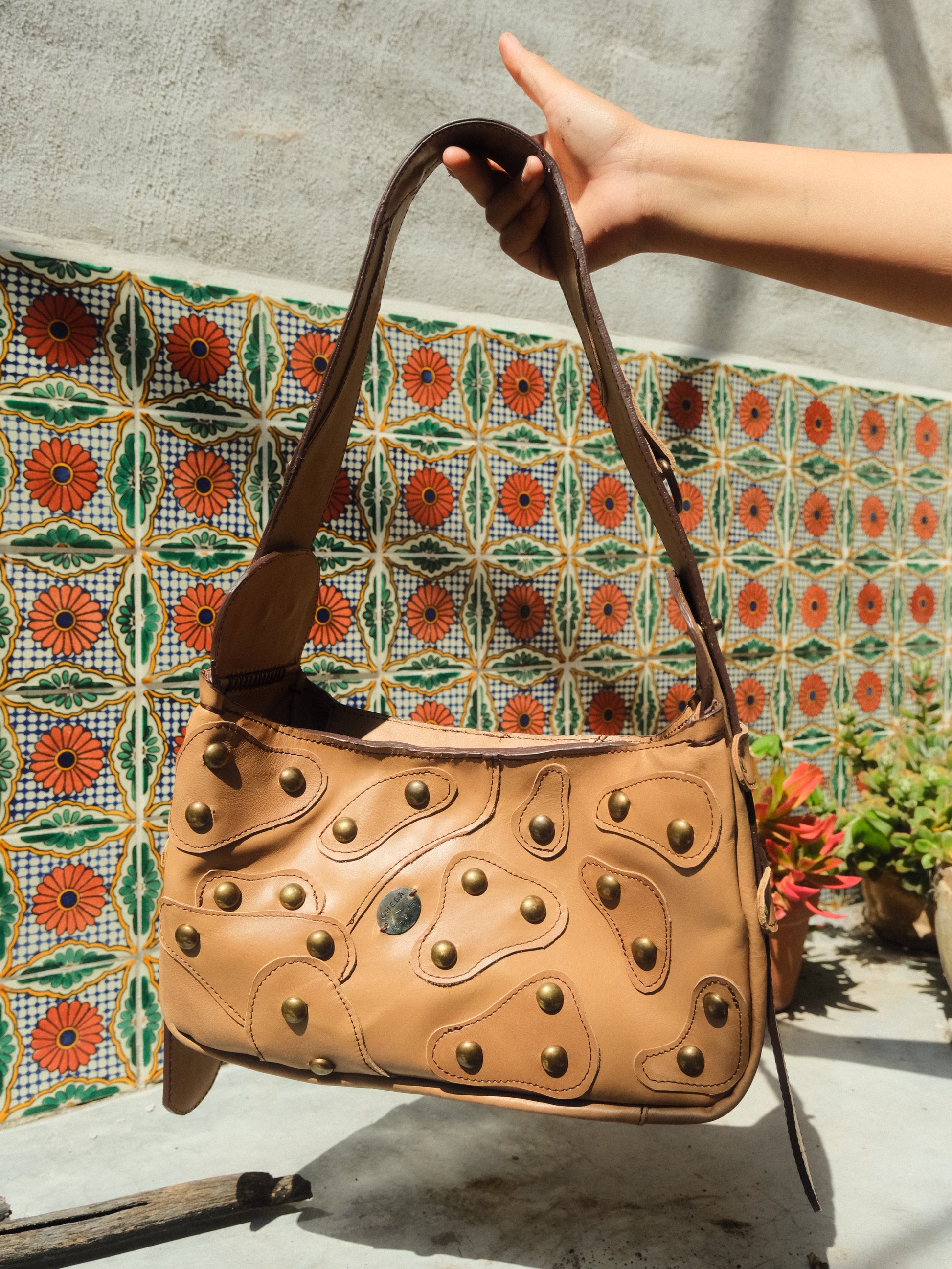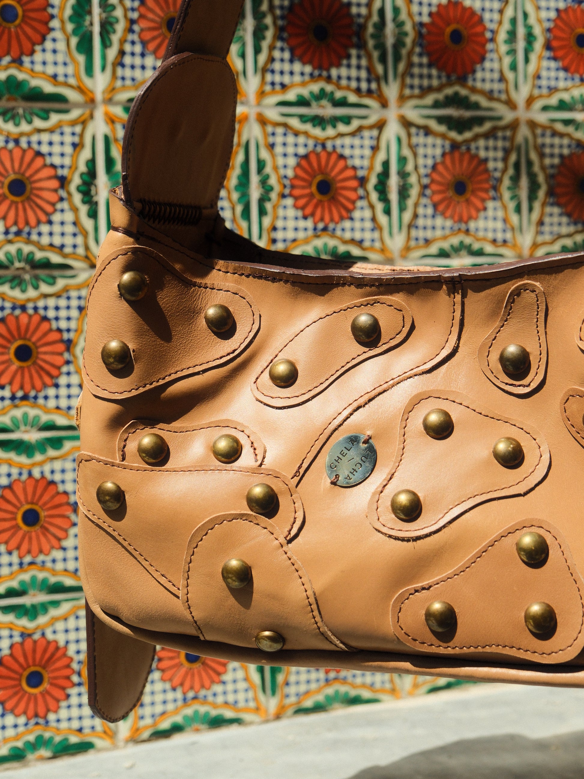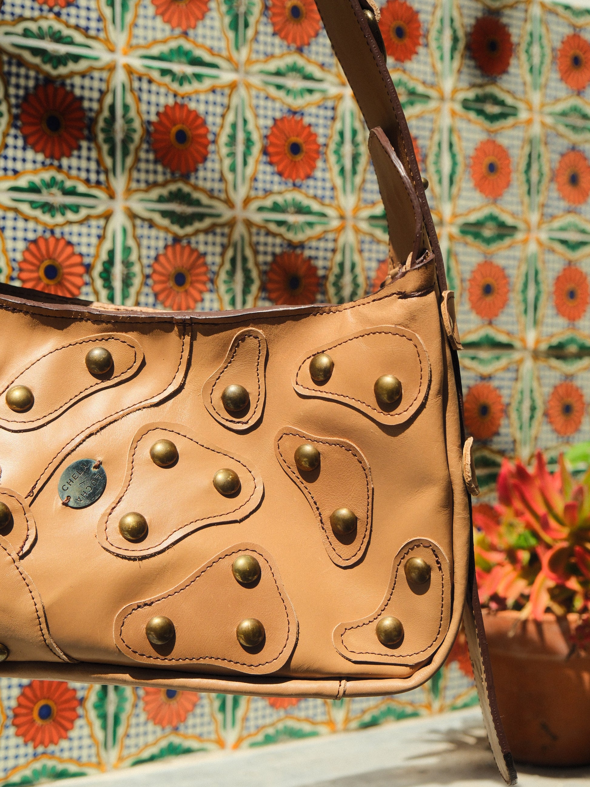 Bolsa CHILO hecha con pedacera de piel en tono café. Detalles de estoperoles en tono café cromado.