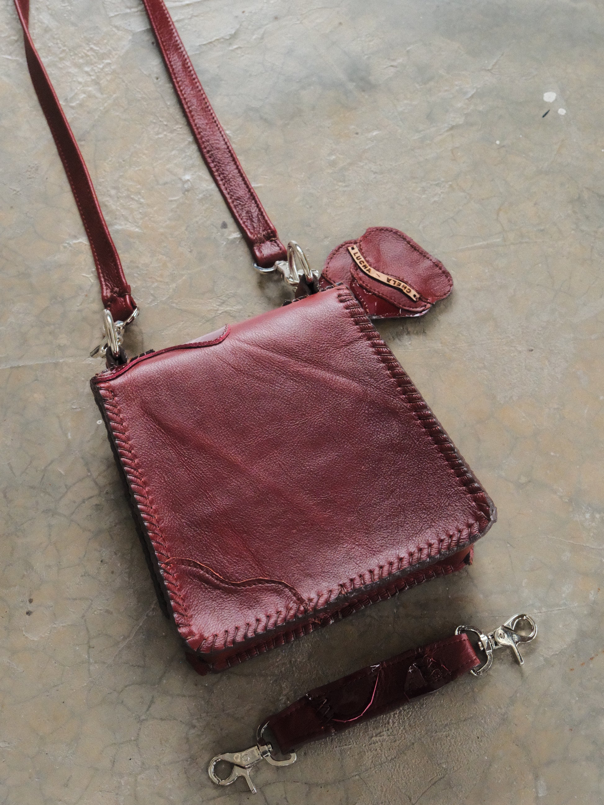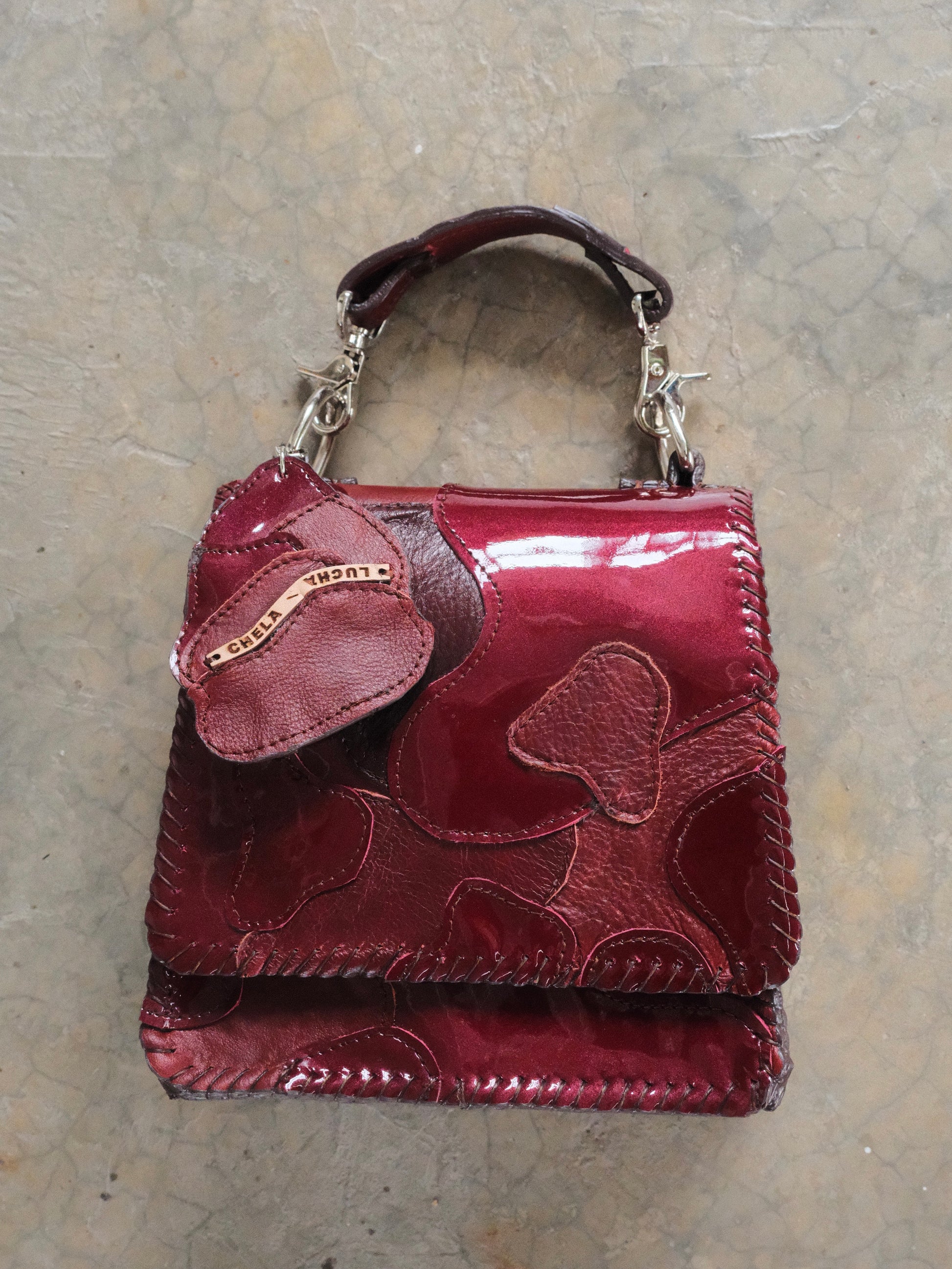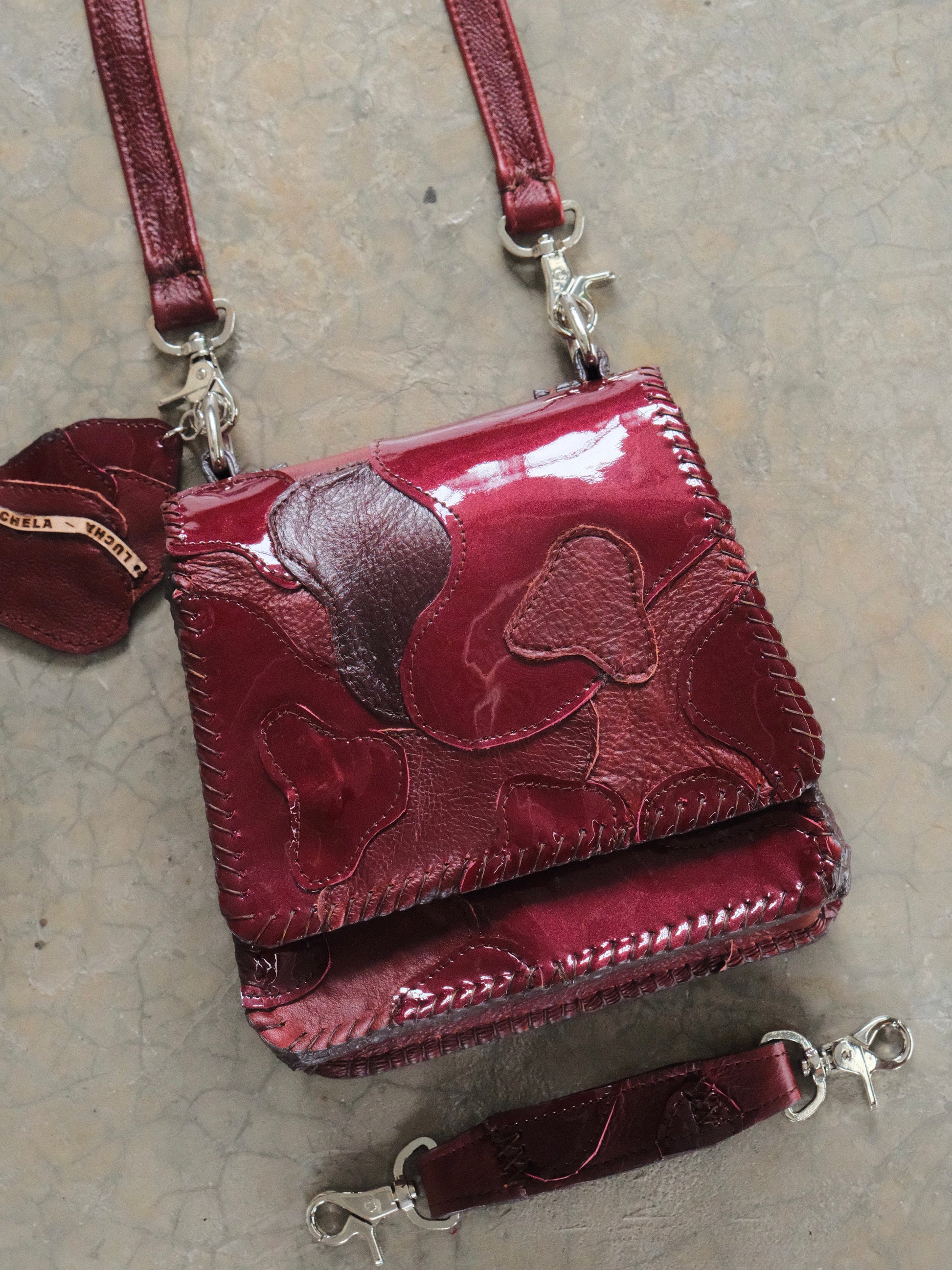 Bolsa CUCA hecha con pedacera de piel en tonos tinto.