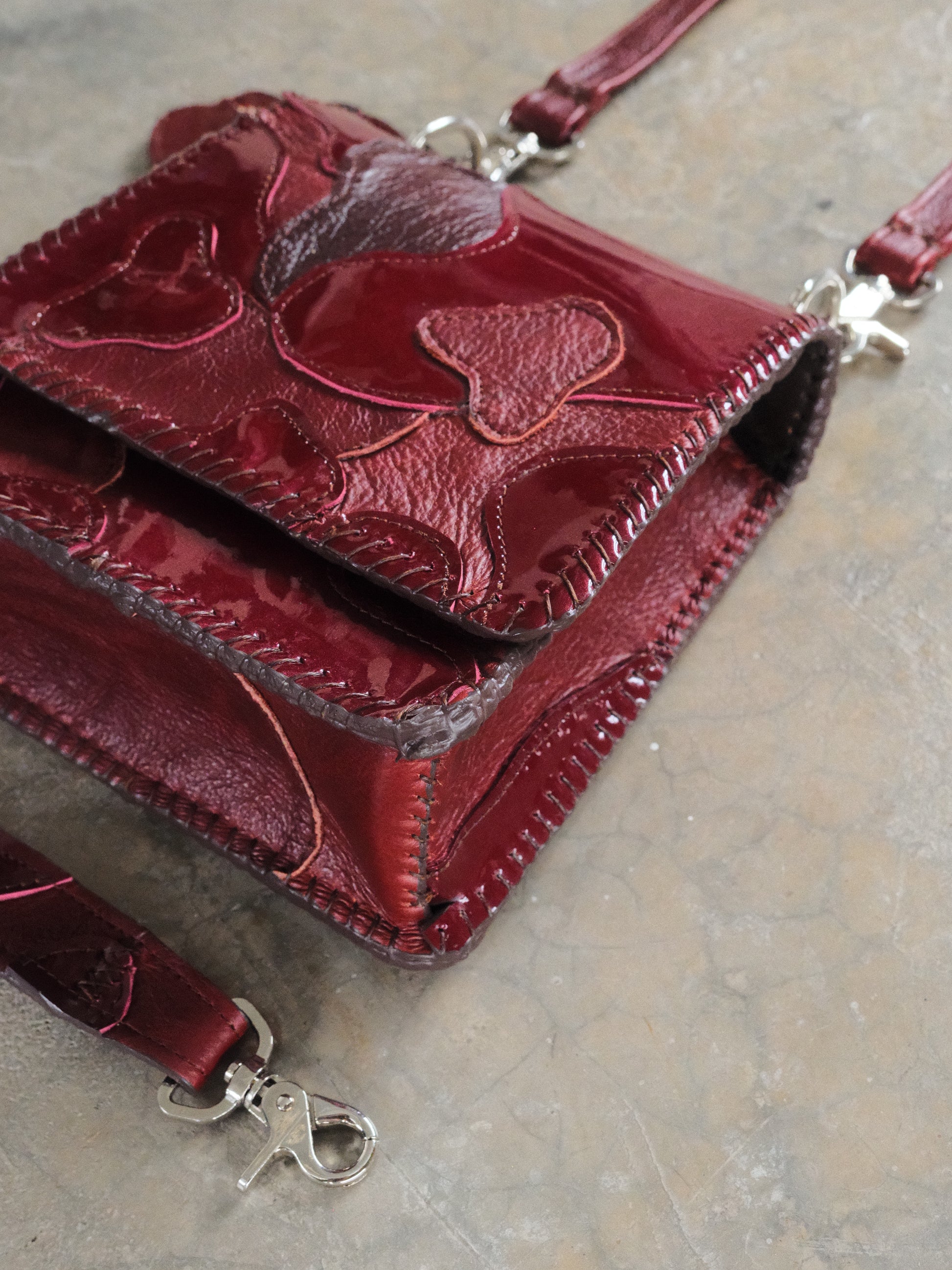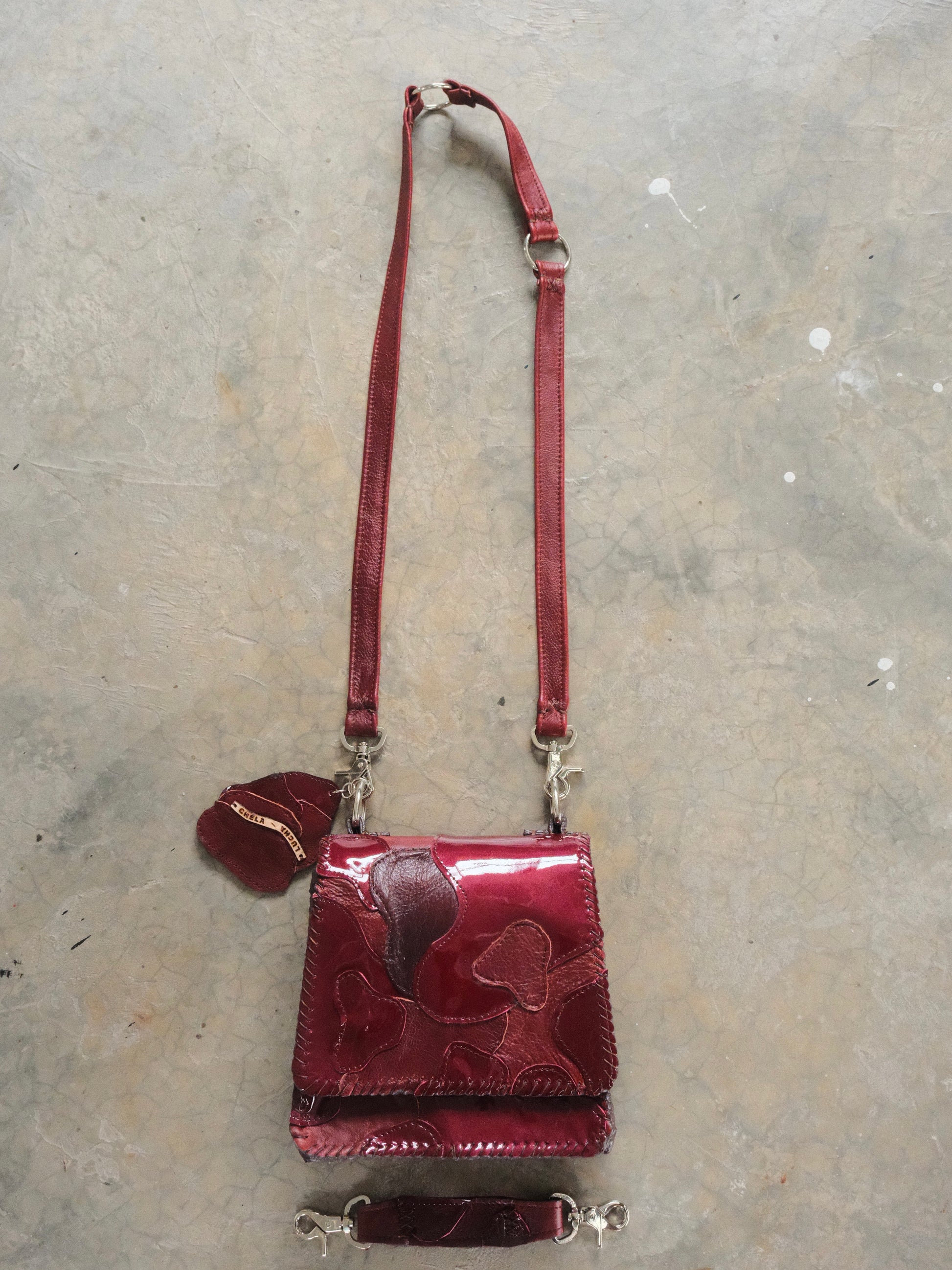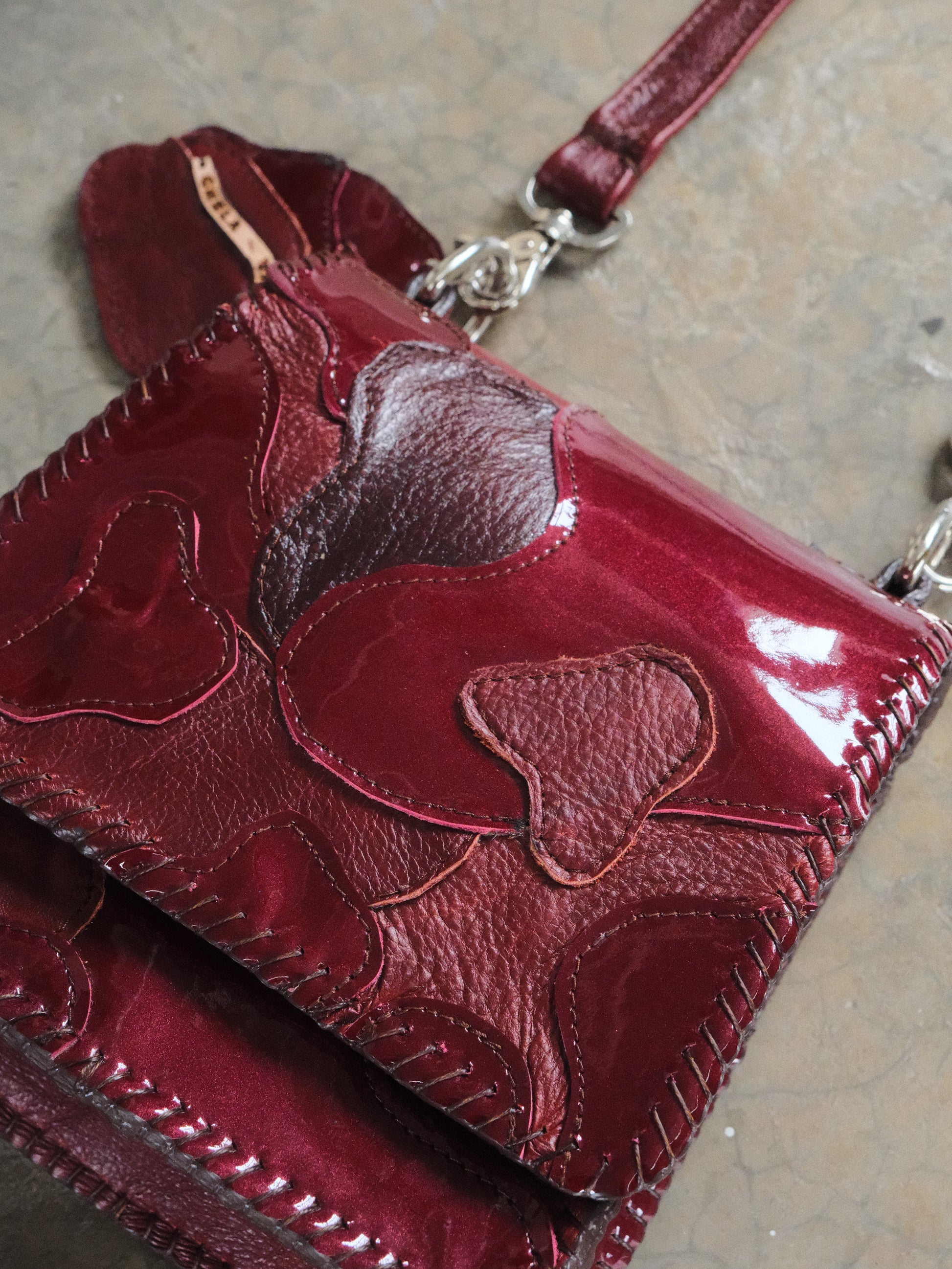 Bolsa CUCA hecha con pedacera de piel en tonos tinto.