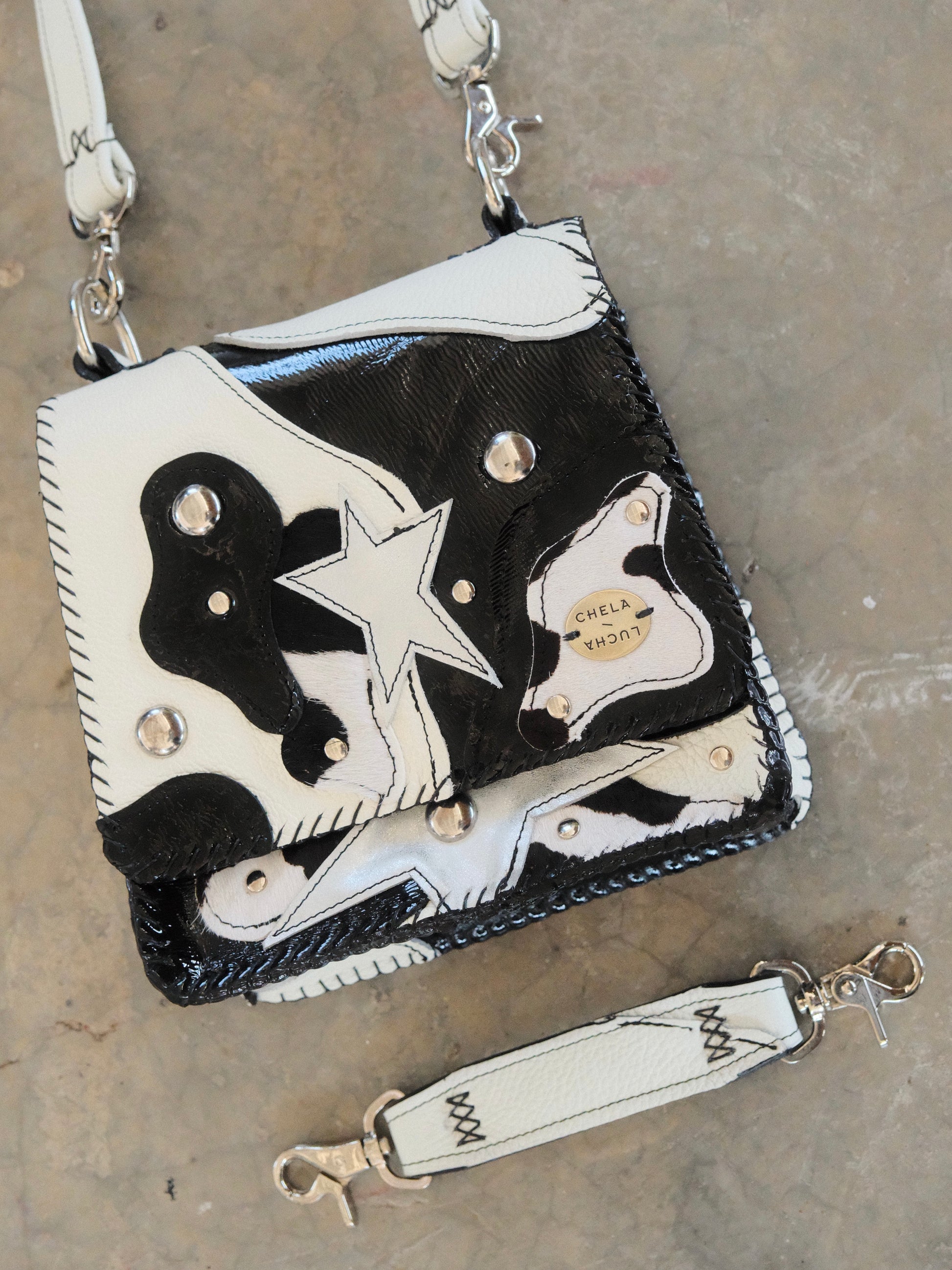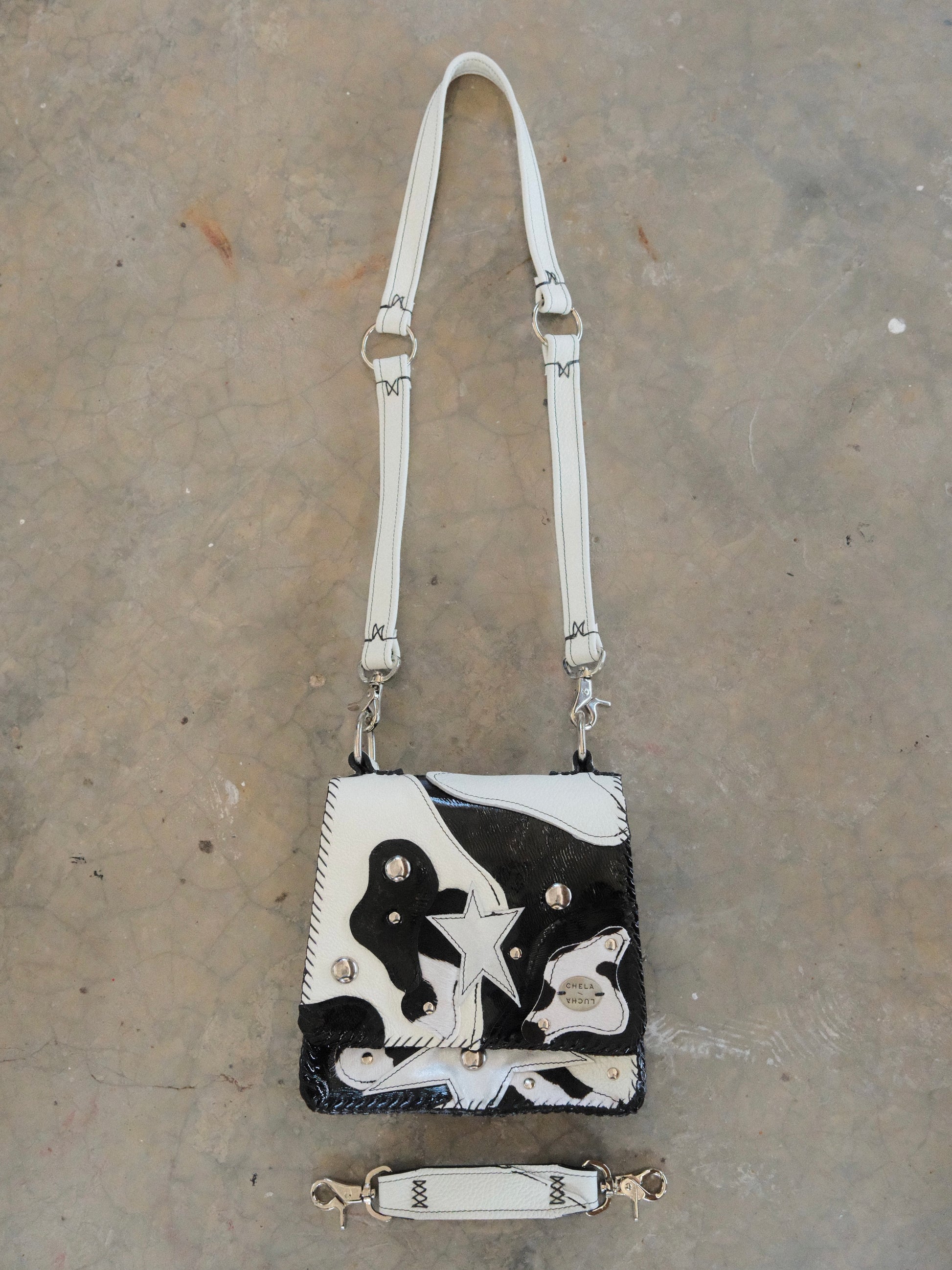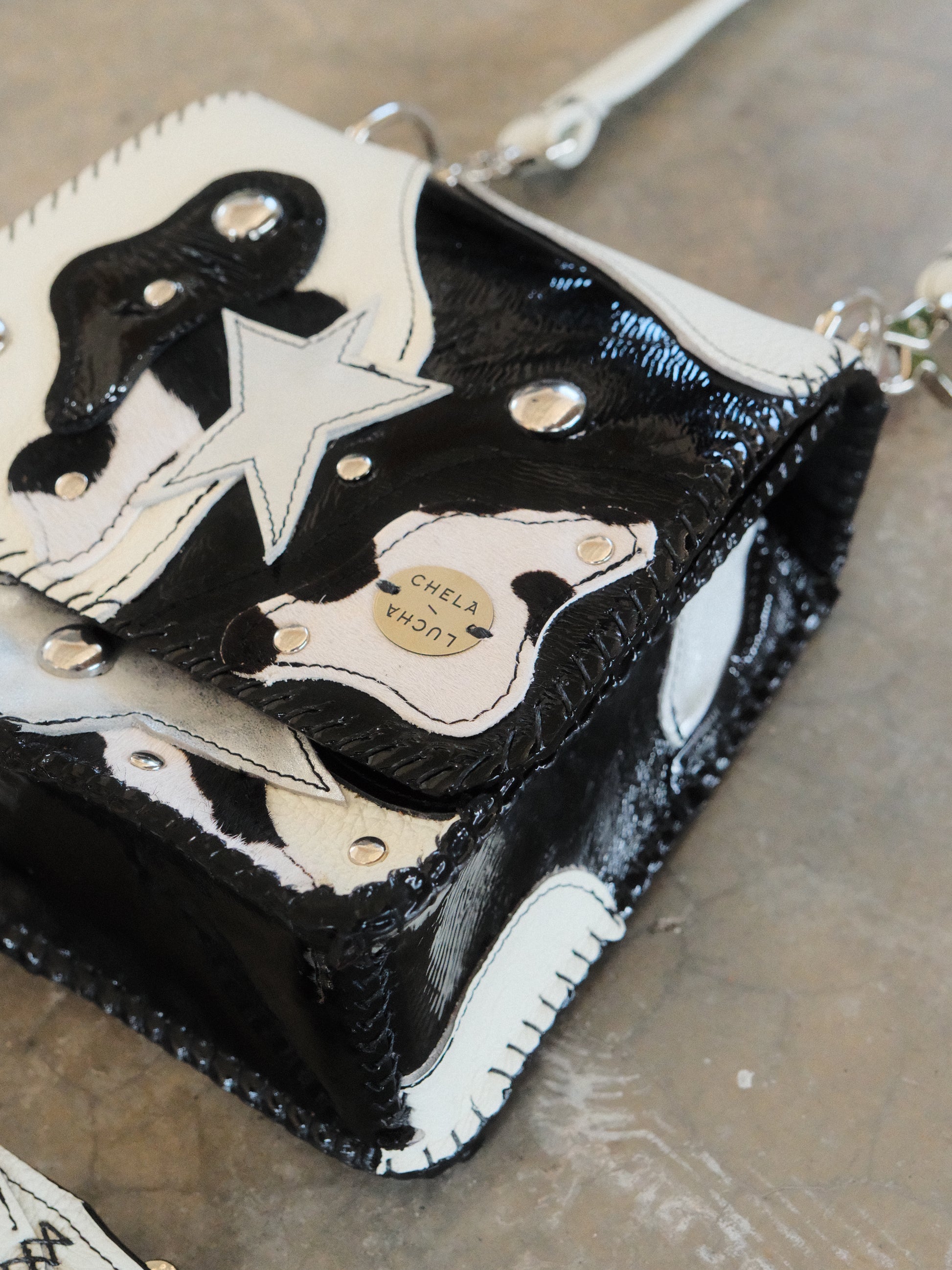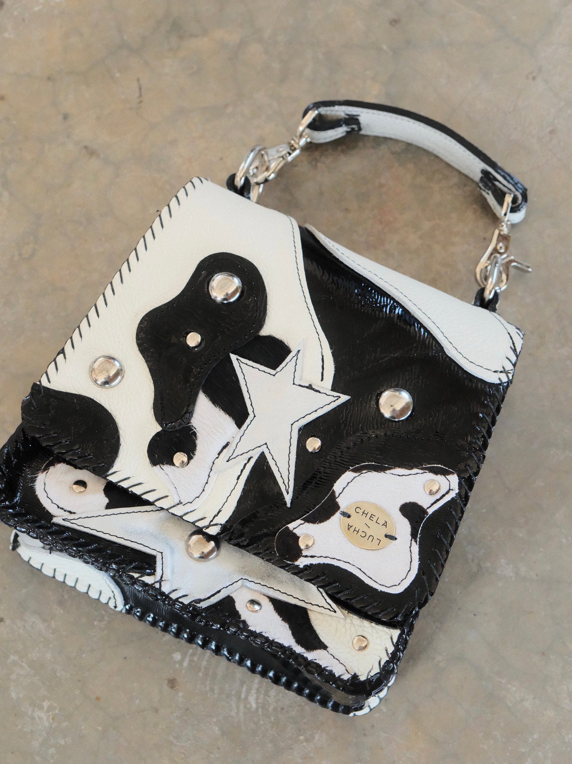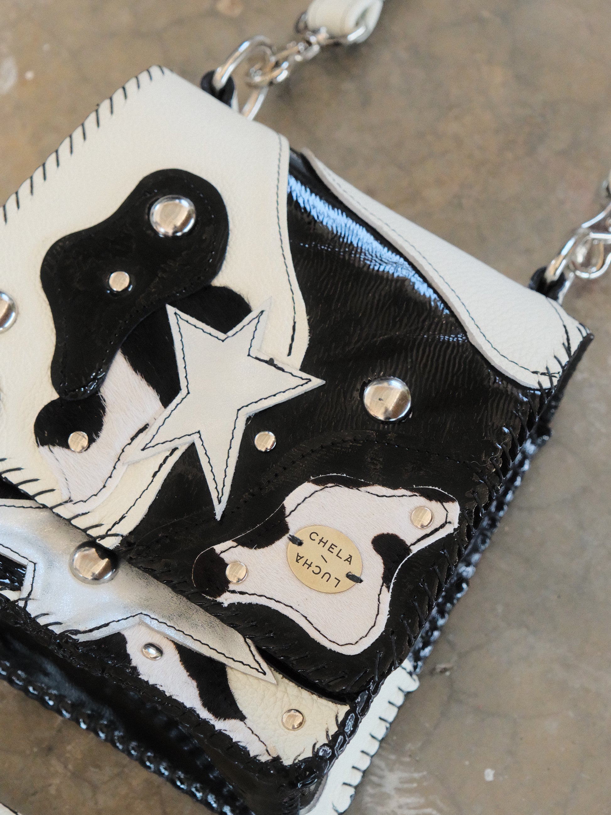 Bolsa CUCA hecha con pedacera de piel en tono negro y blanco. Detalles de remaches y estoperoles en tono plateado.