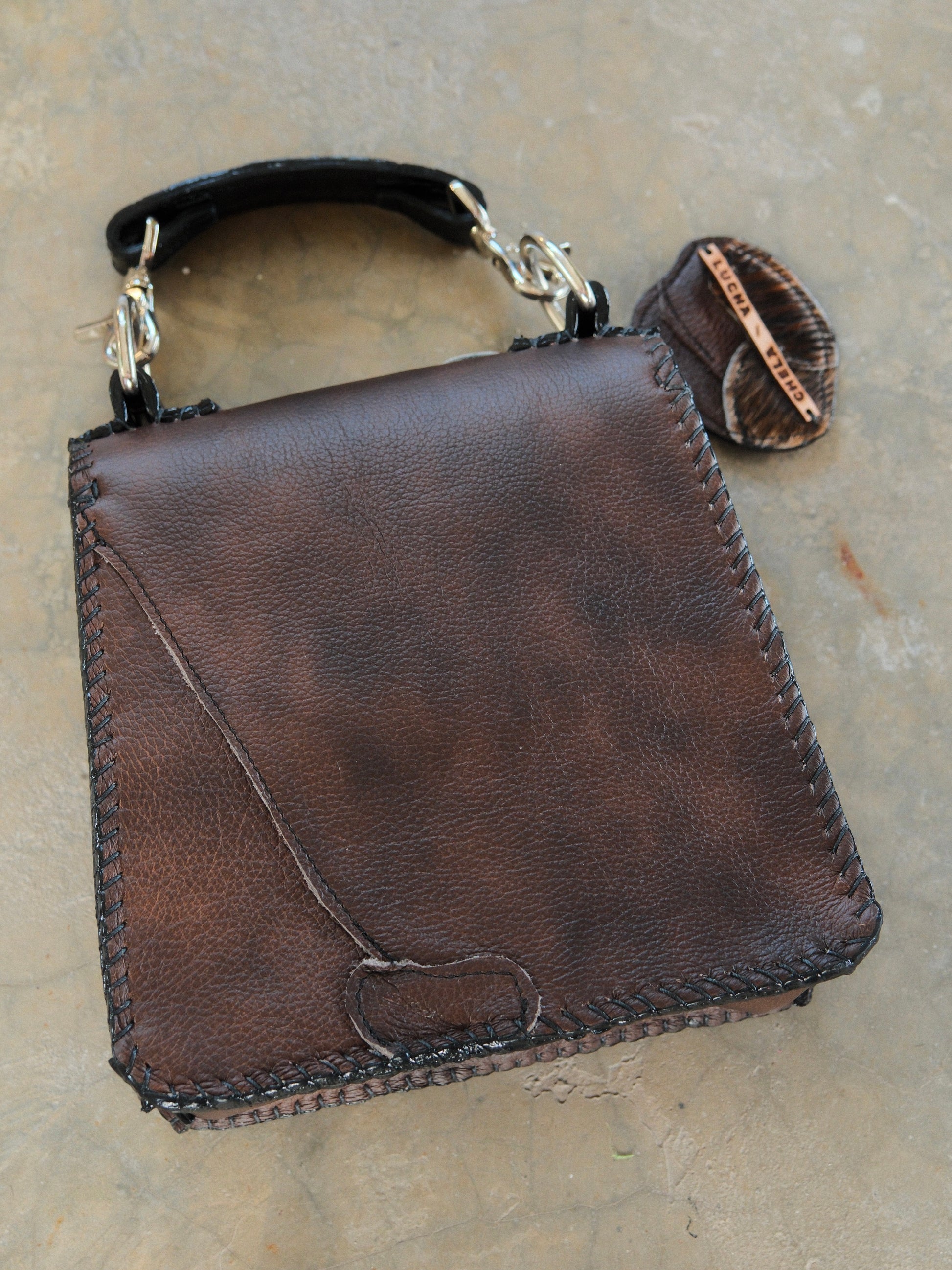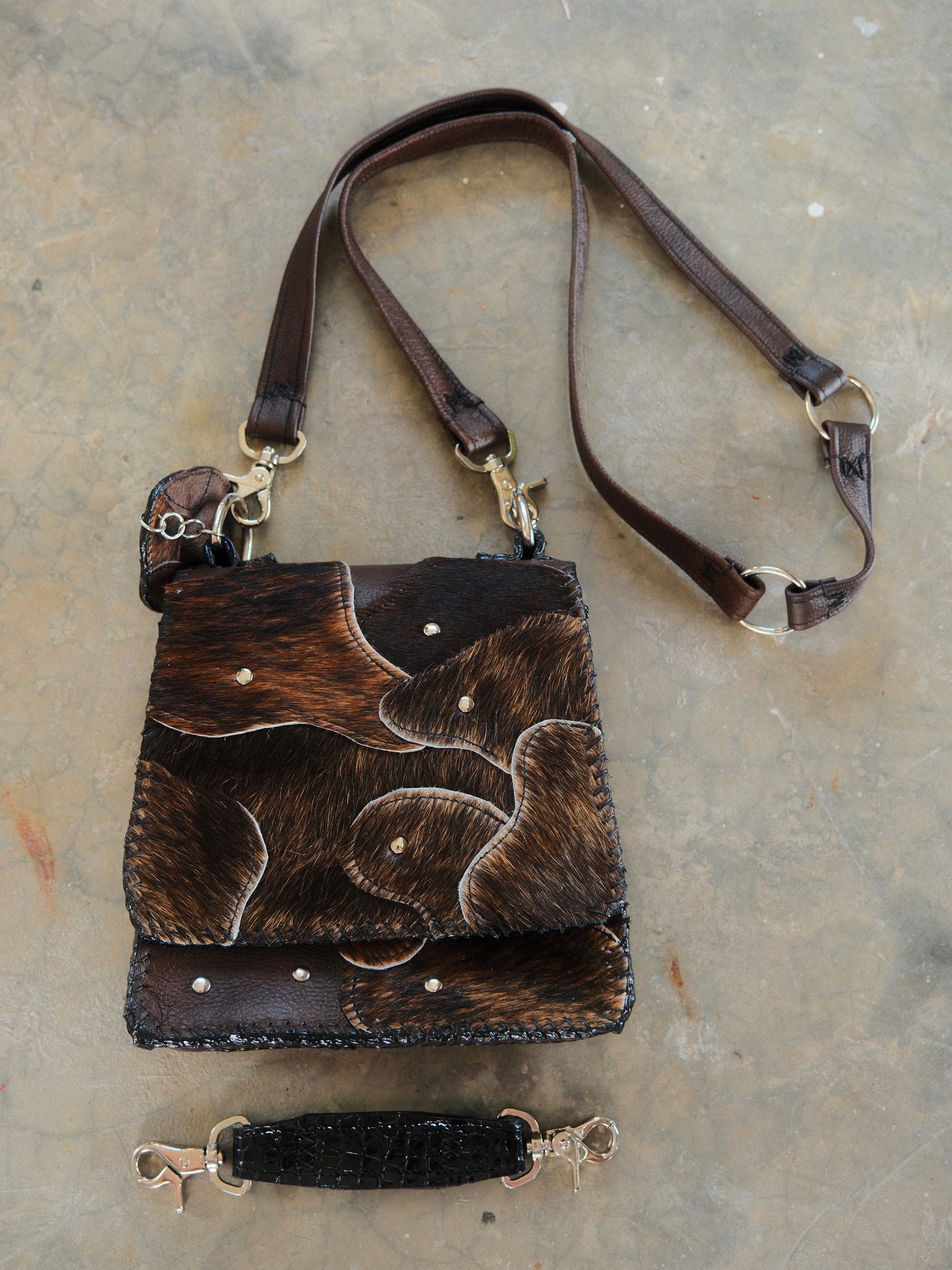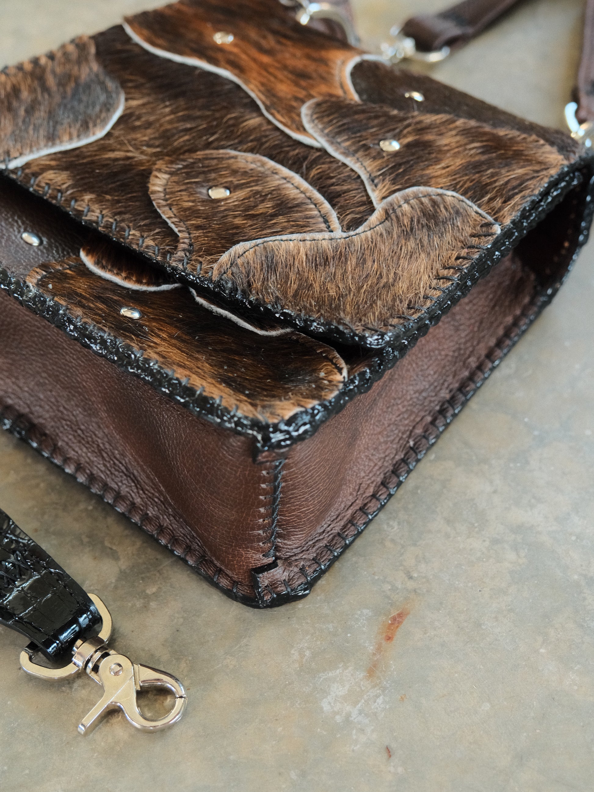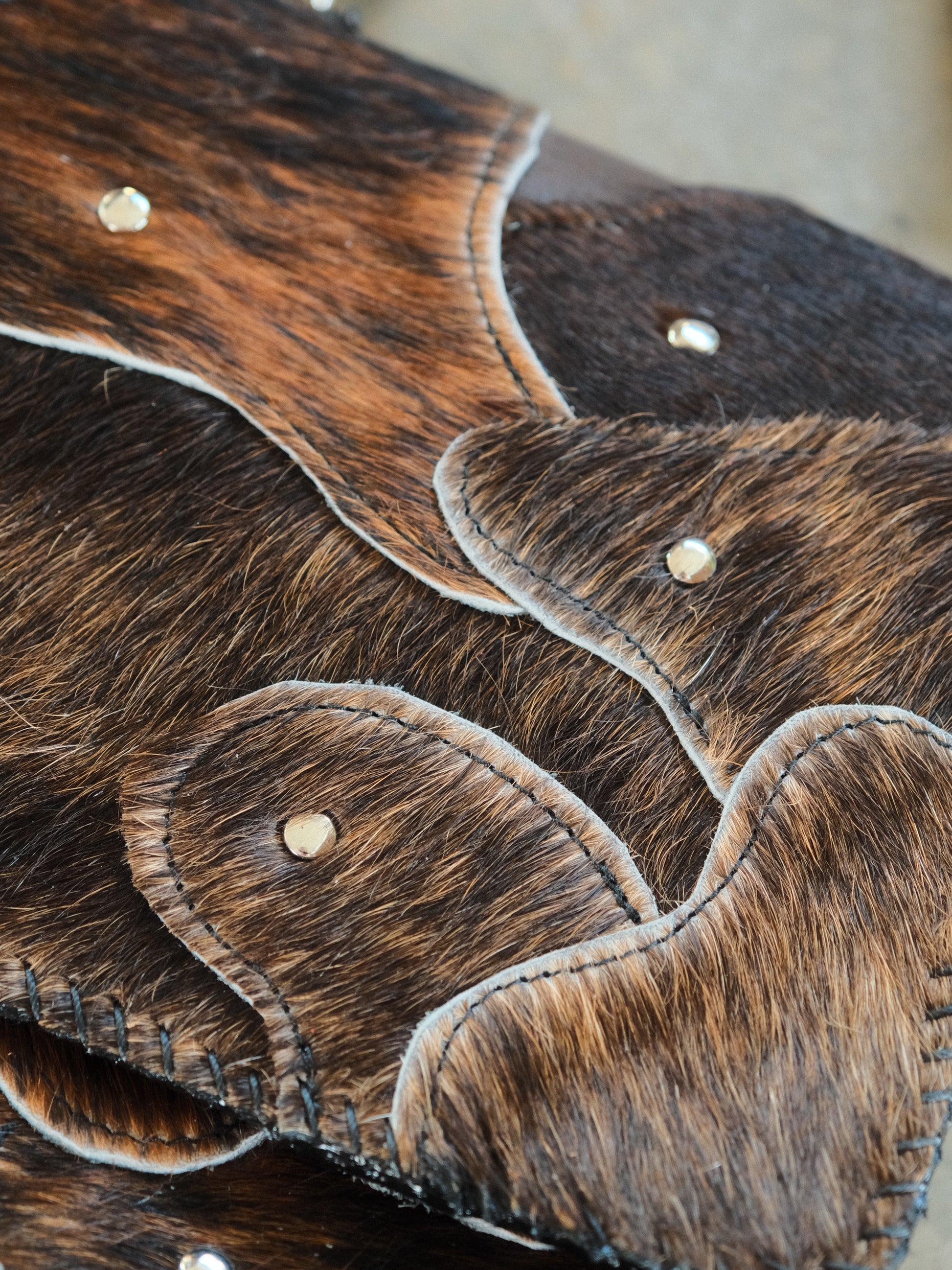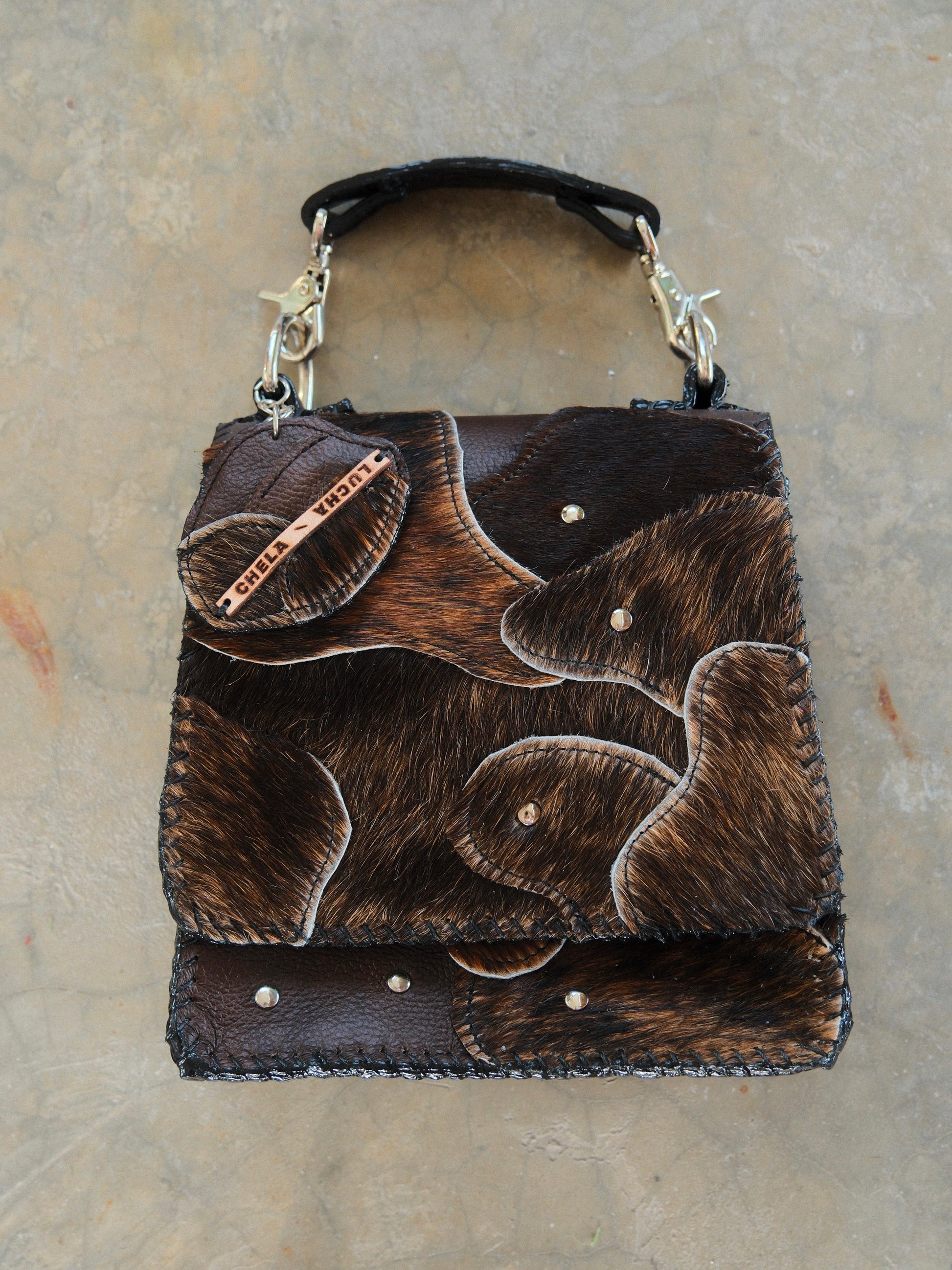 Bolsa CUCA hecha con pedacera de piel de textura de pelo en tono café. Detalles de remaches en tono plateado.