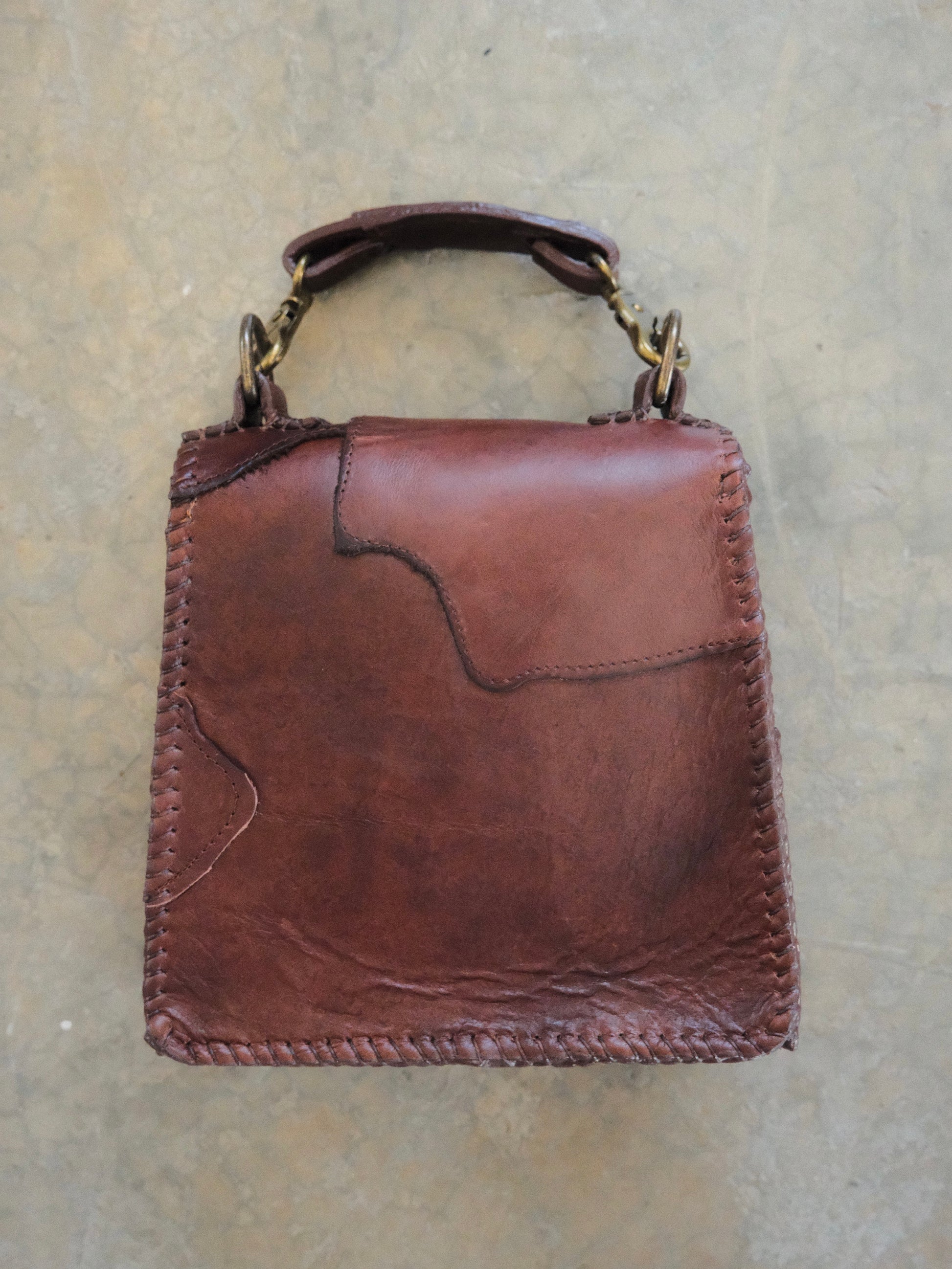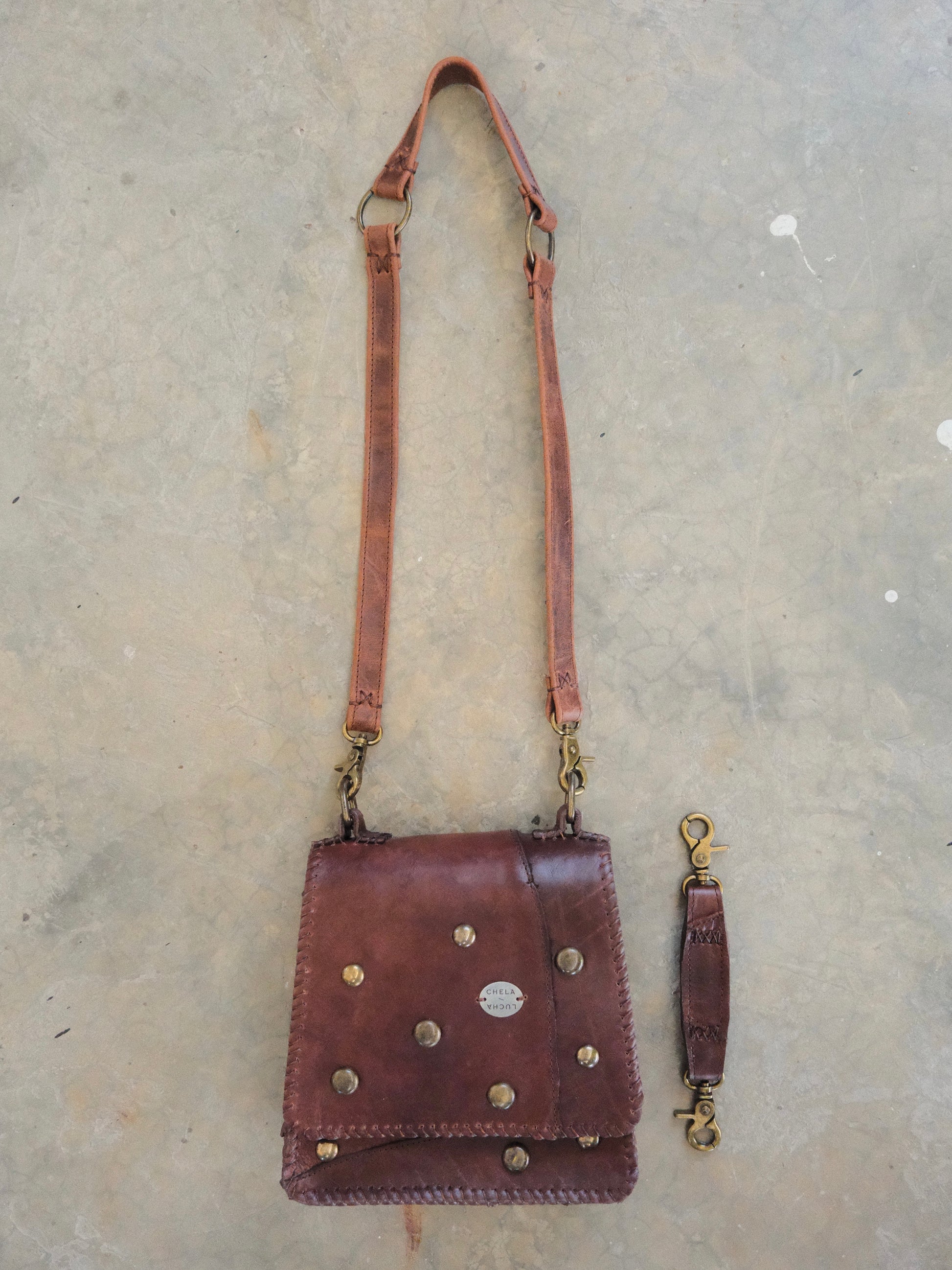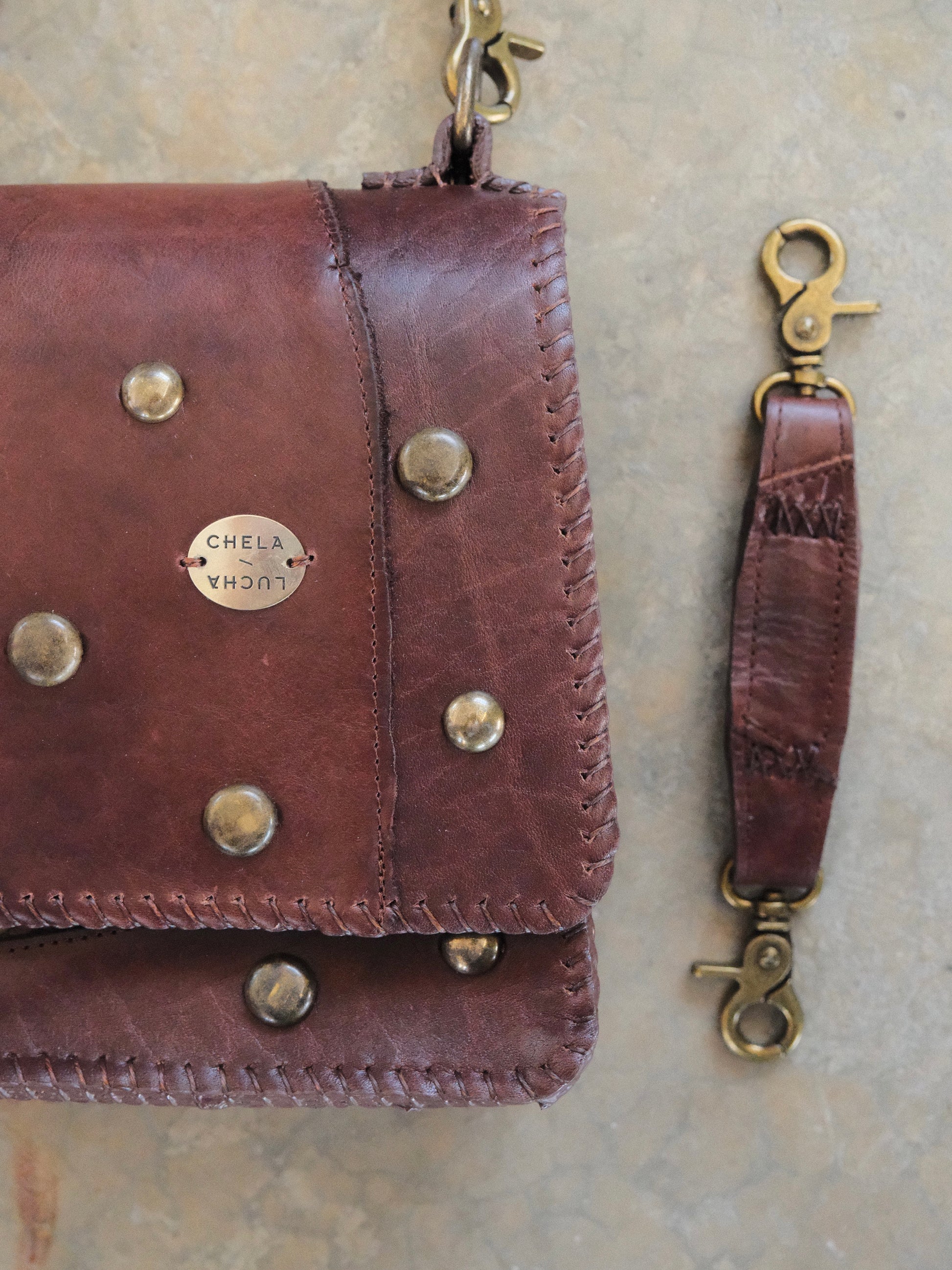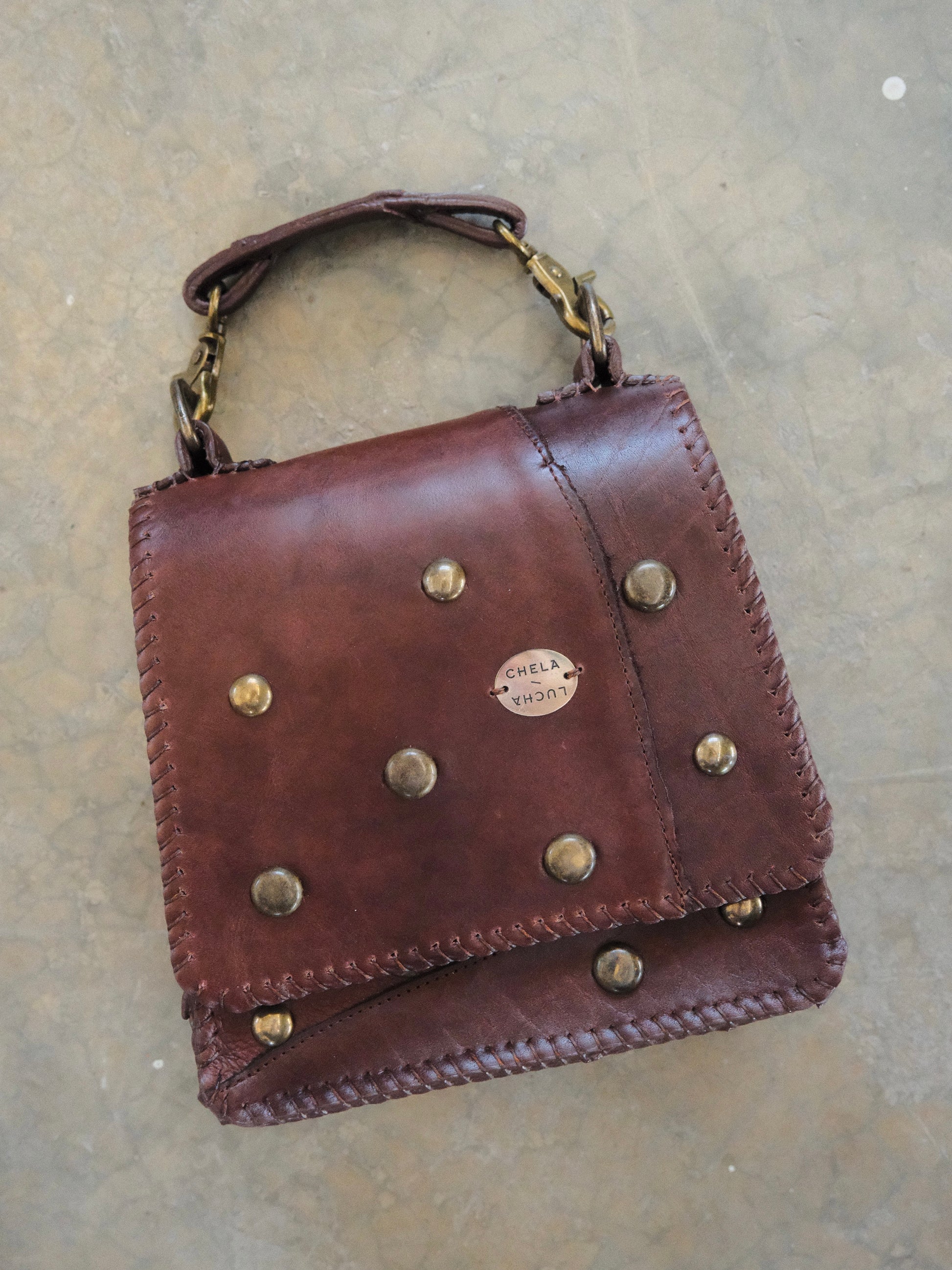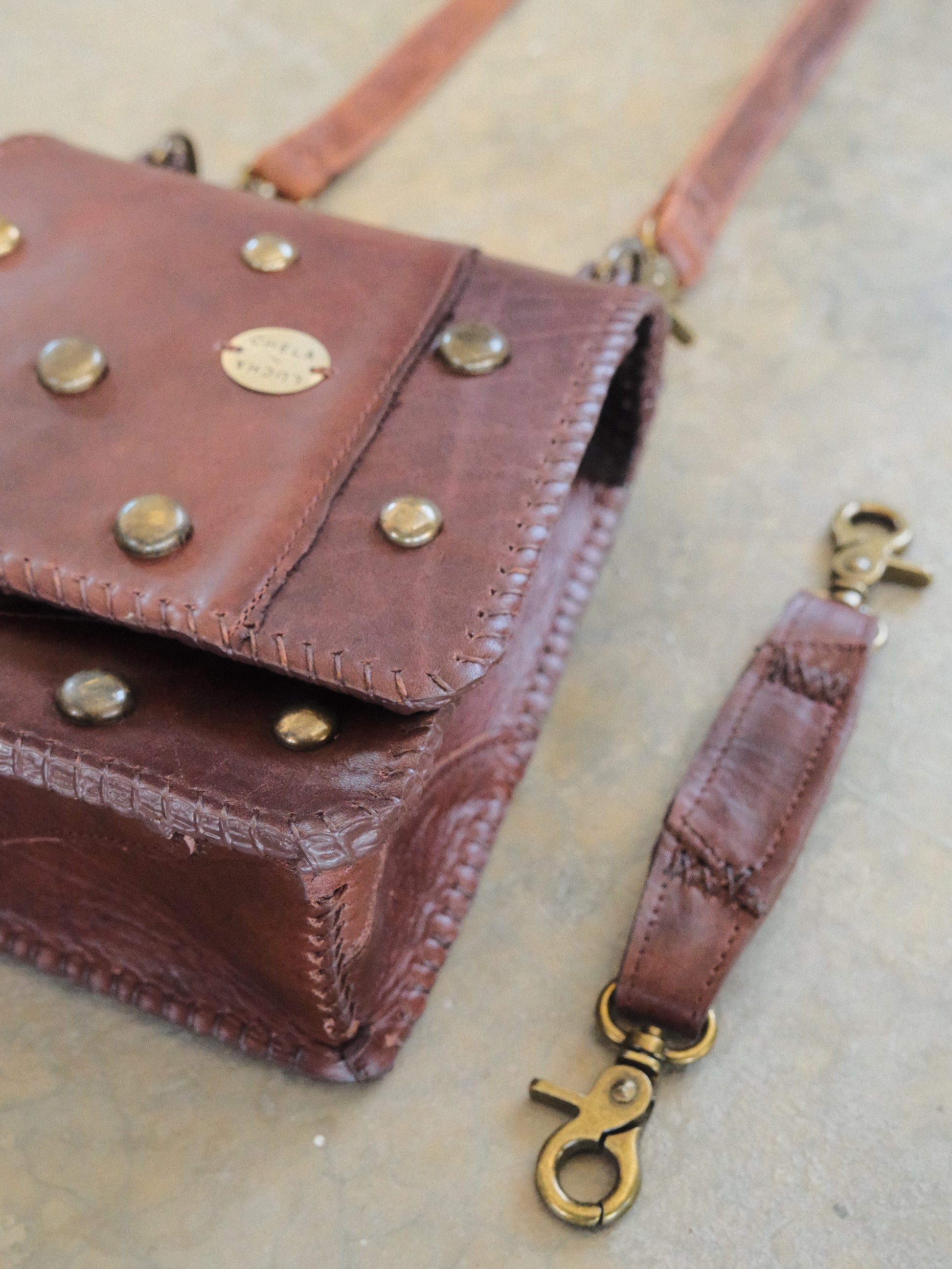Bolsa CUCA hecha con pedacera de piel en tono café . Detalles de estoperoles en tono oro viejo.