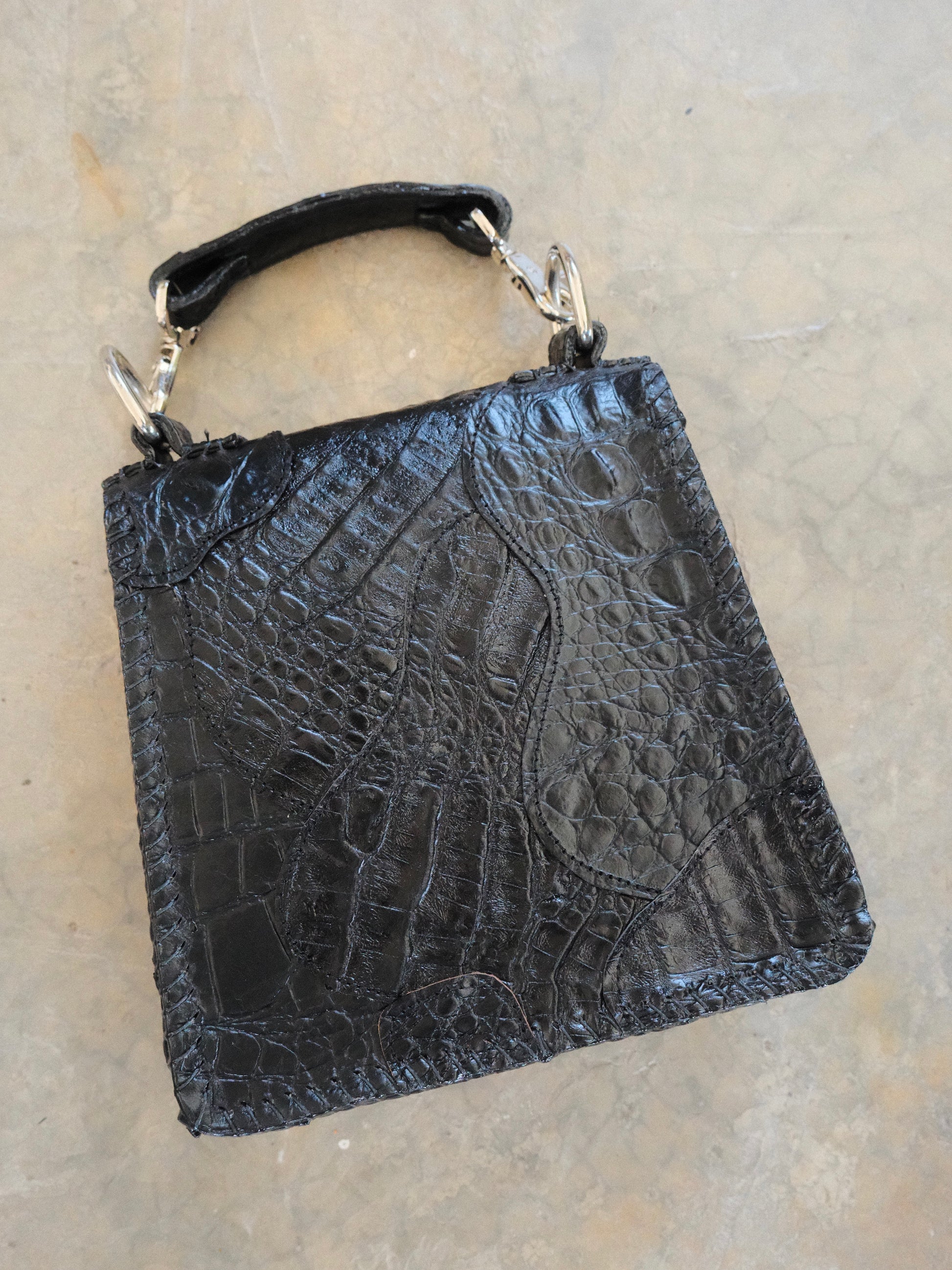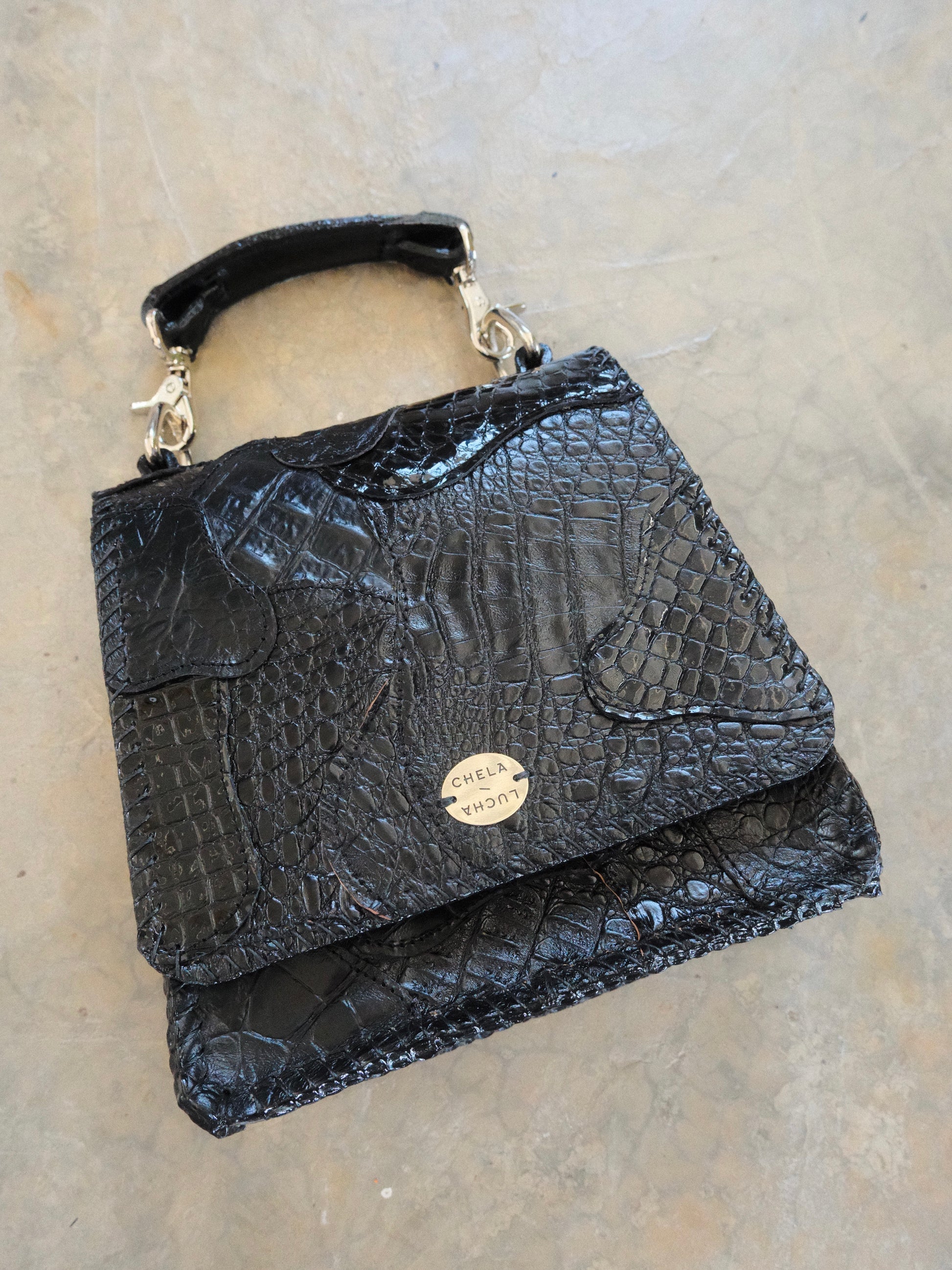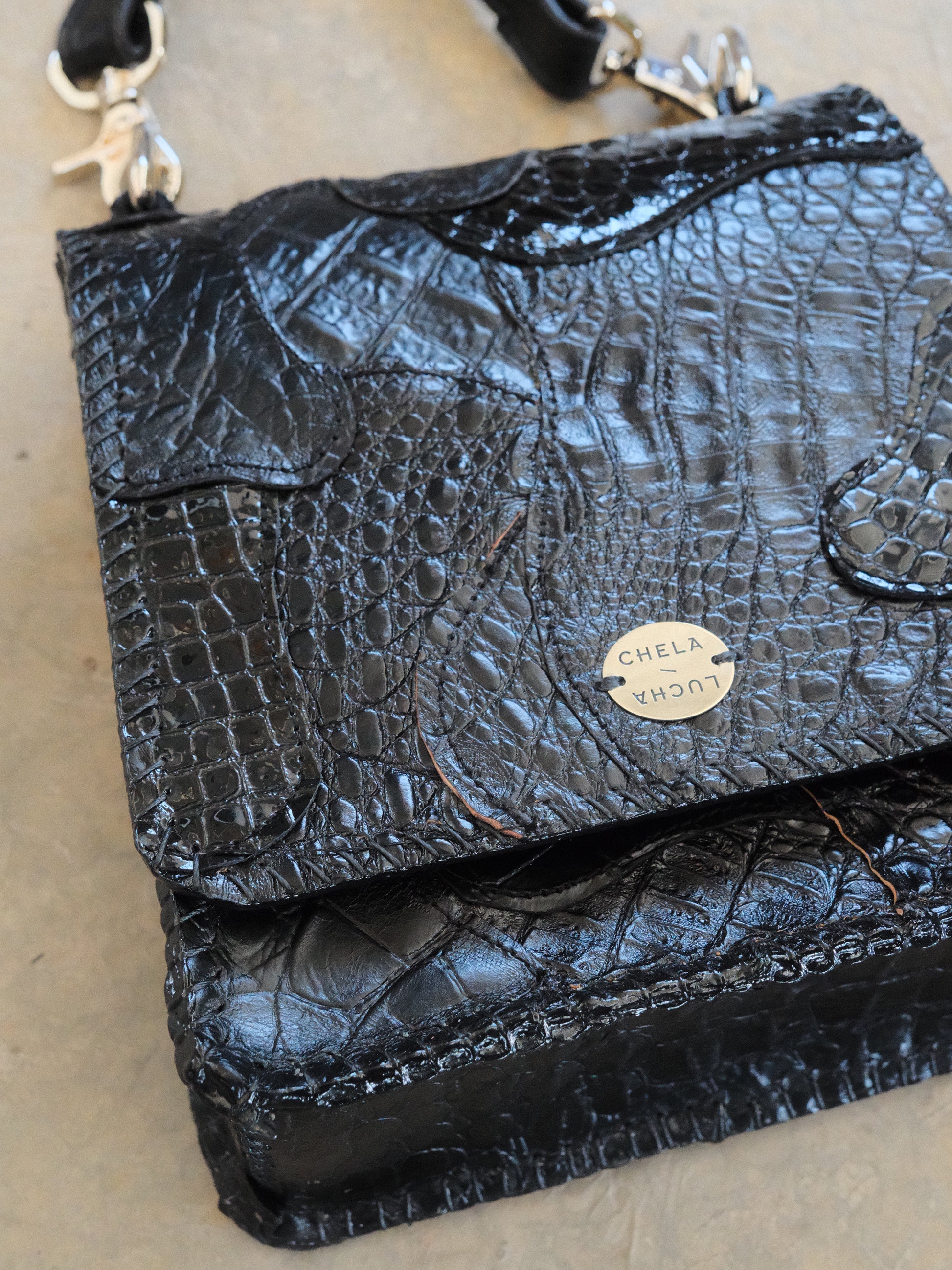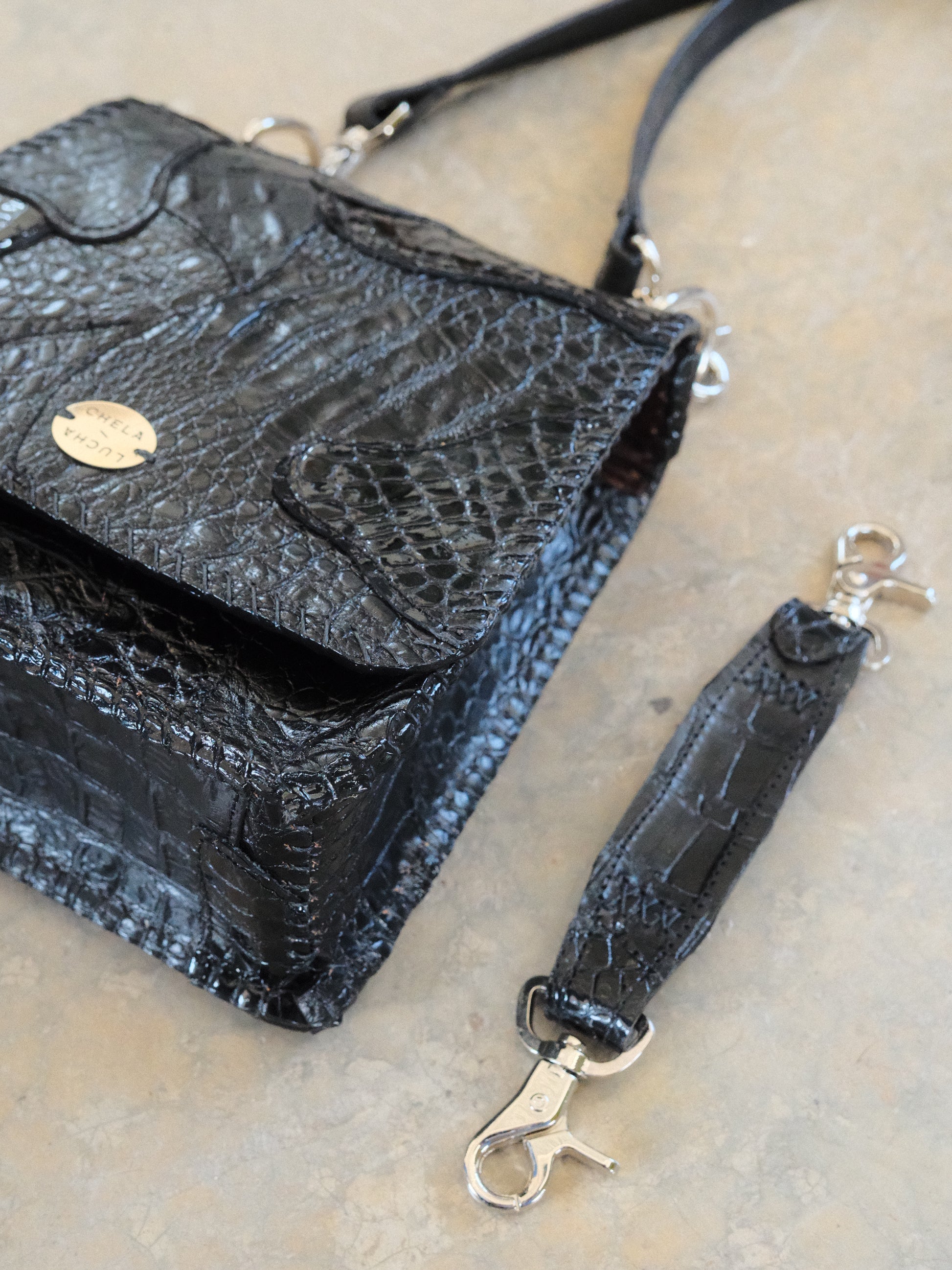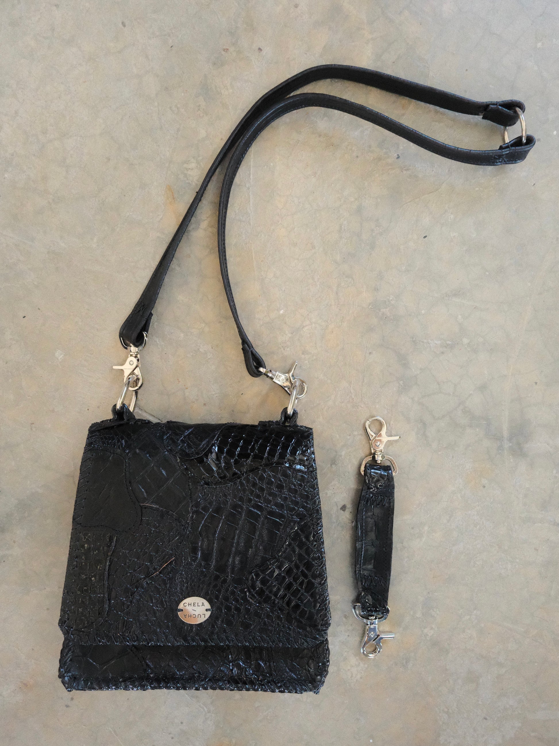 Bolsa CUCA hecha con pedacera de piel en tono negro.
