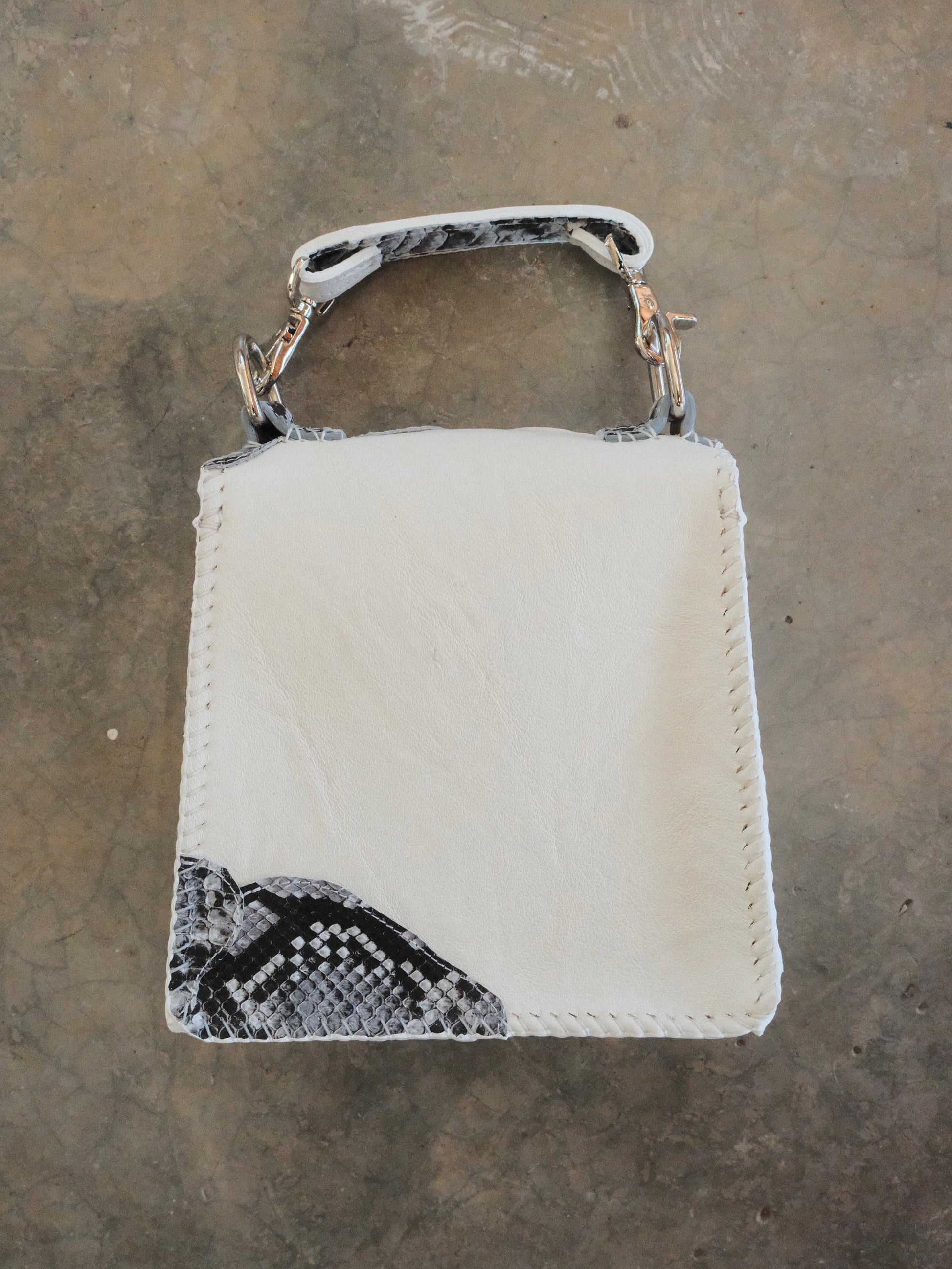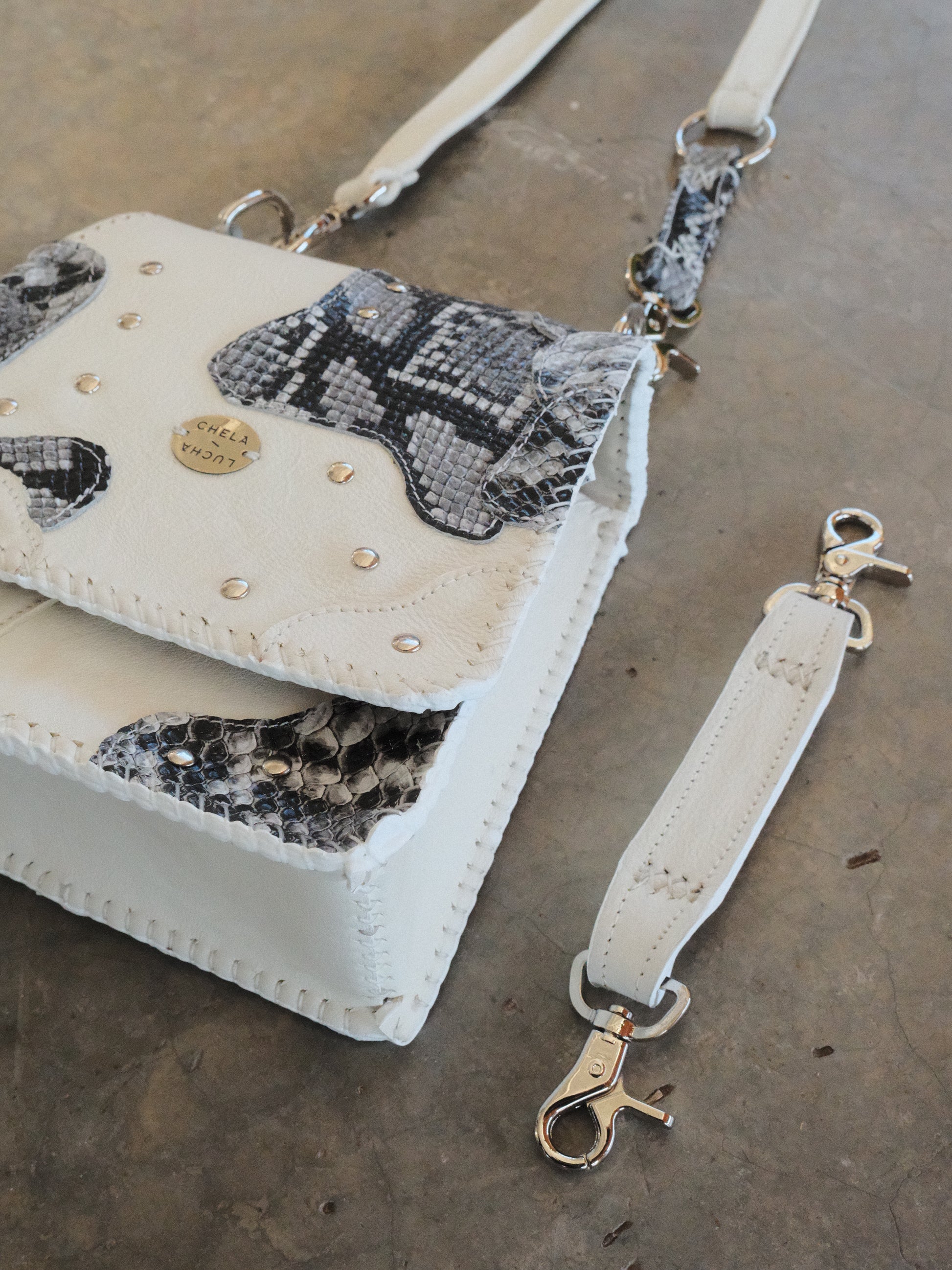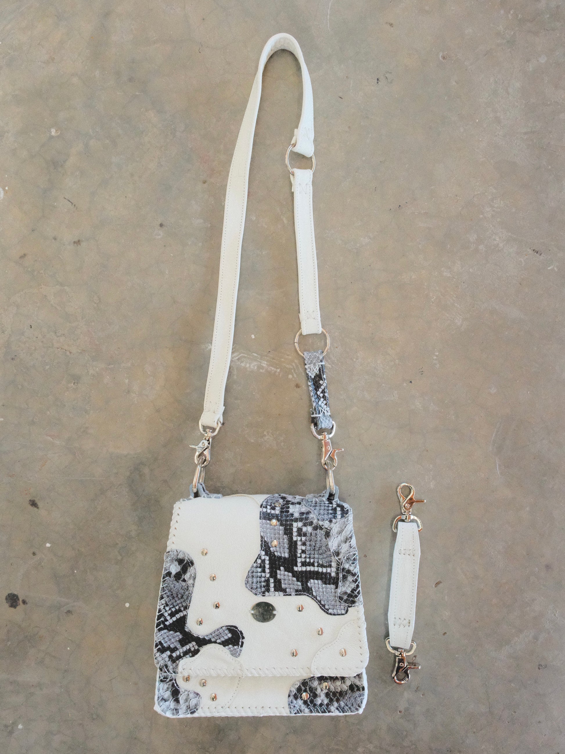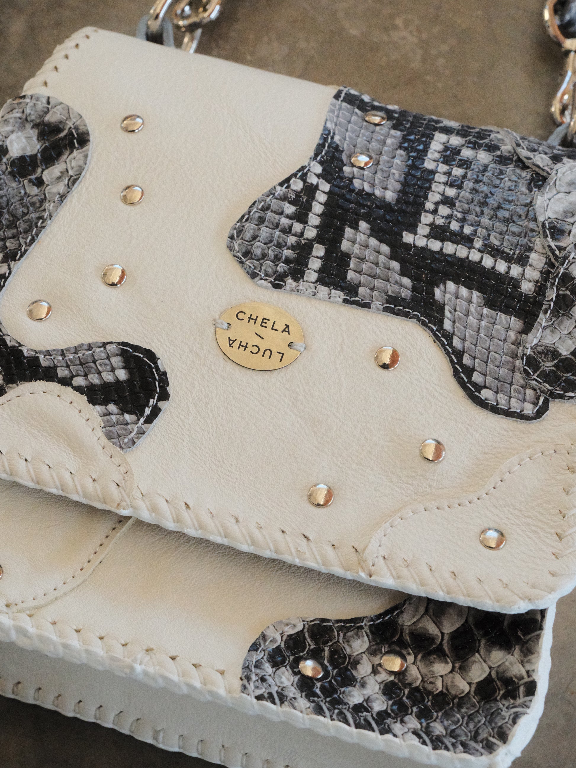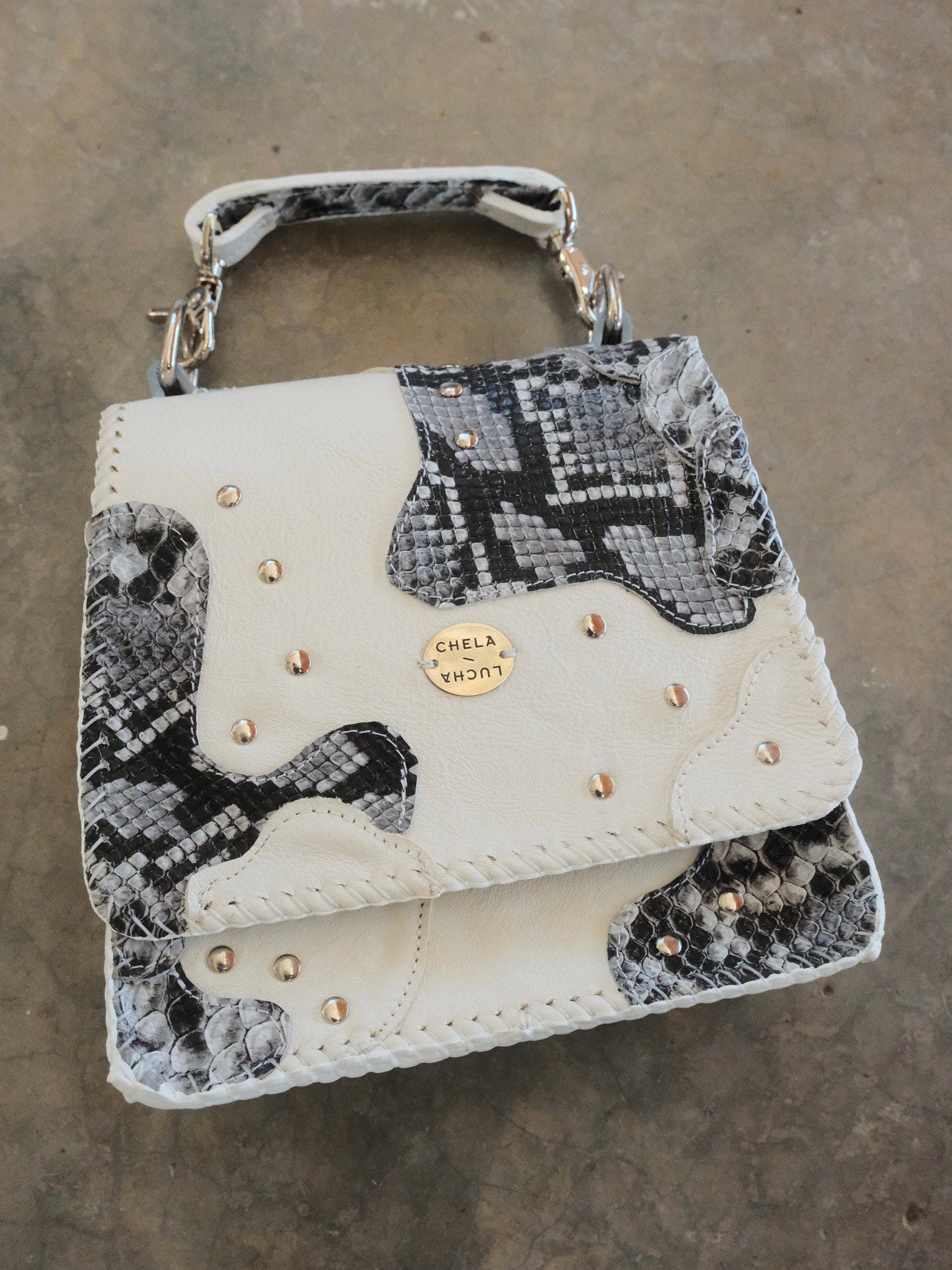 Bolsa CUCA hecha con pedacera de piel en tono blanco e imitación serpiente. Detalles de remaches en tono plateado.