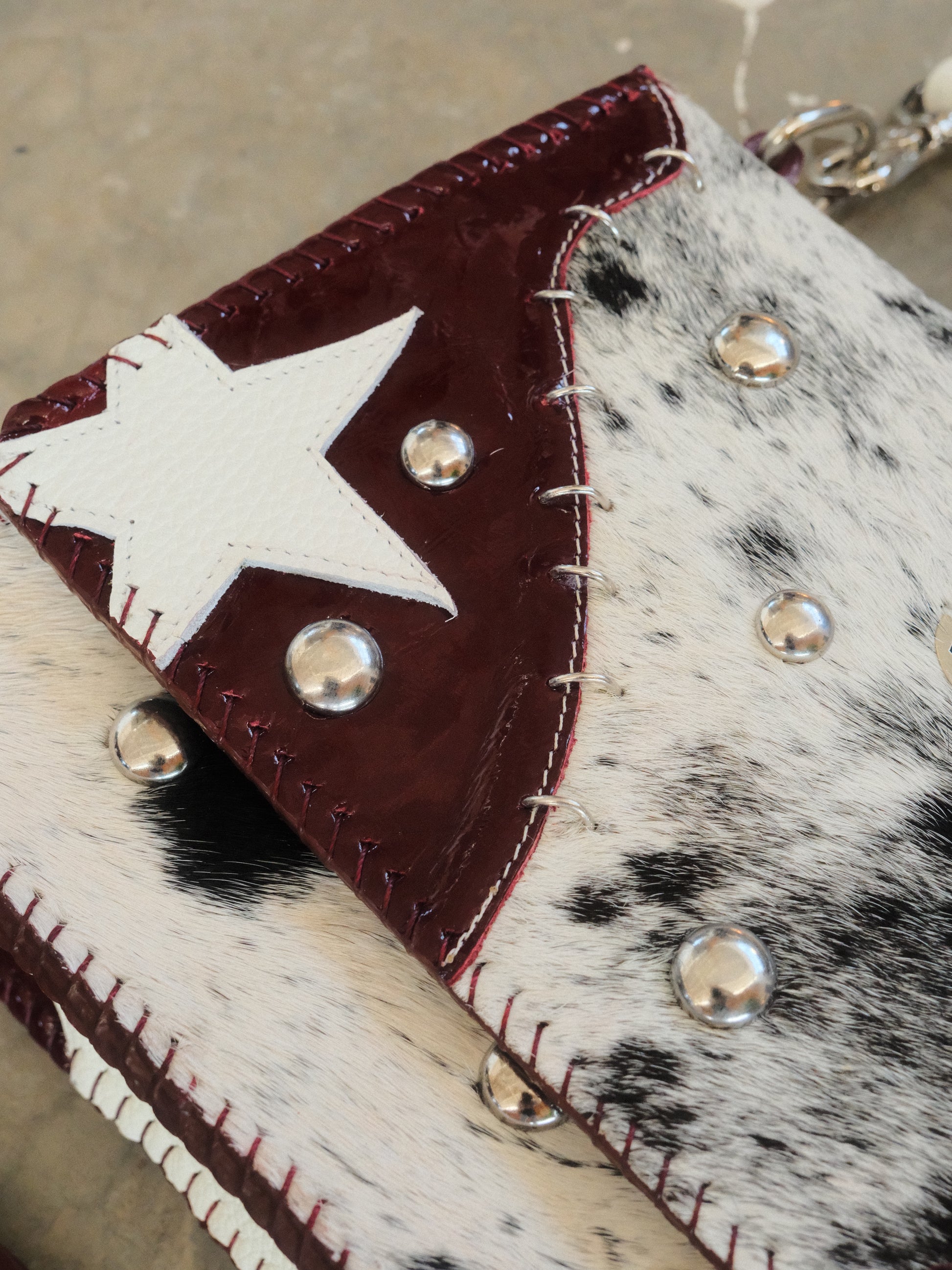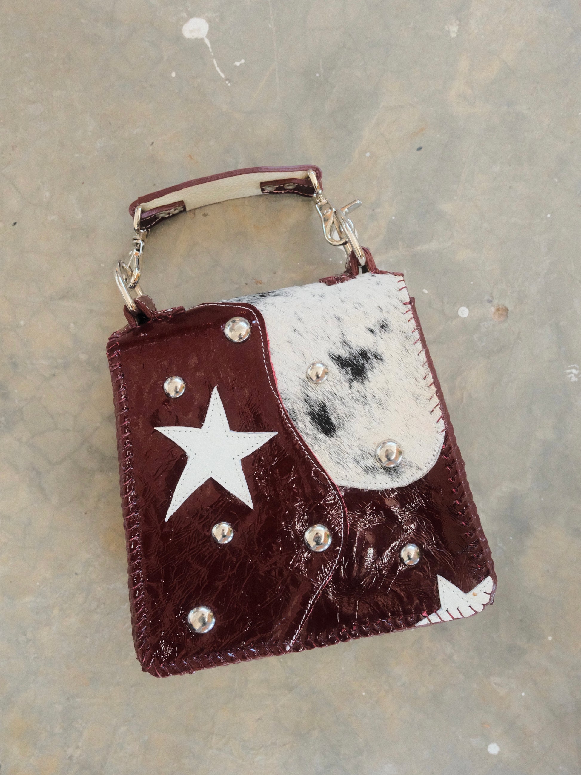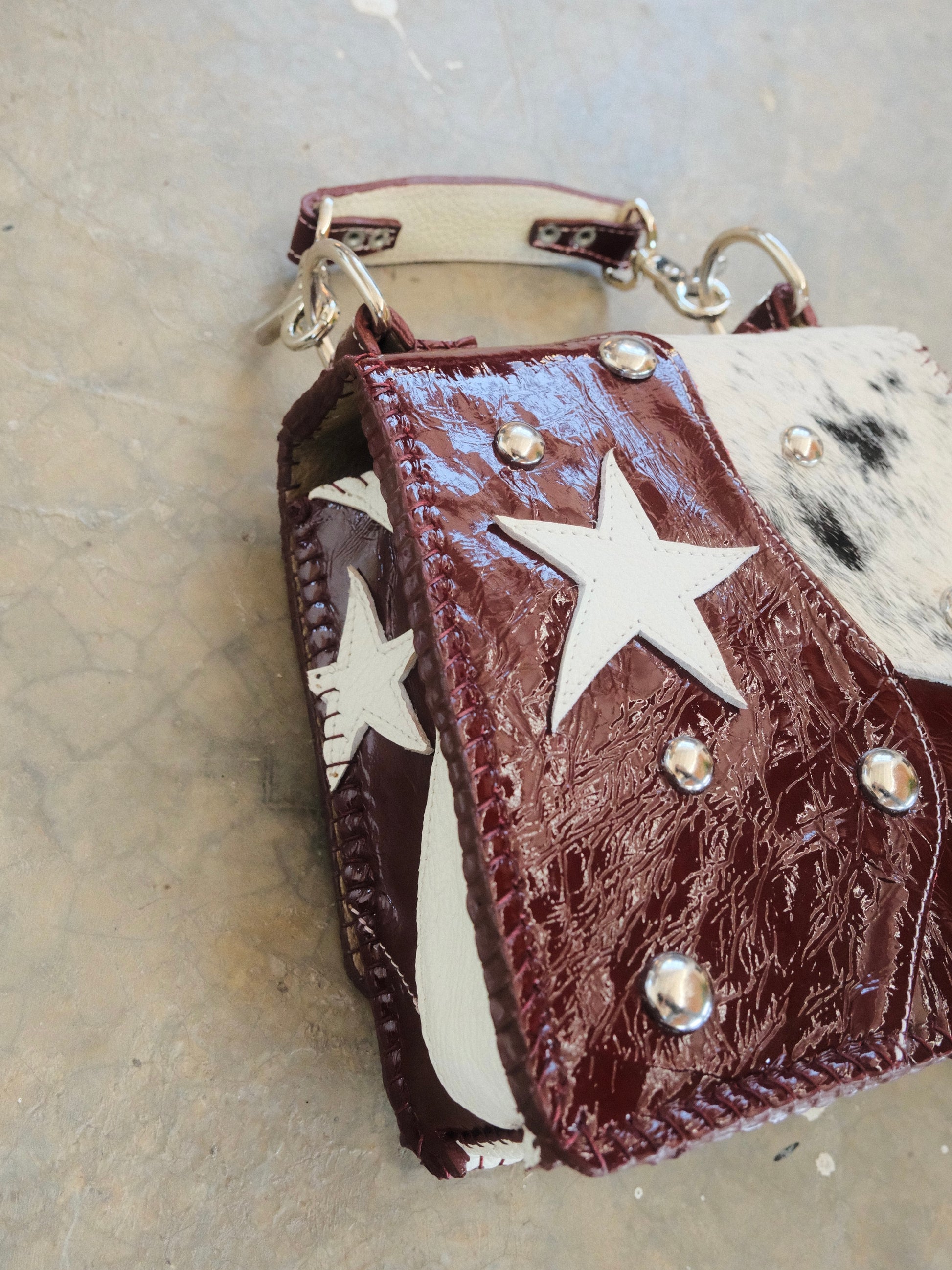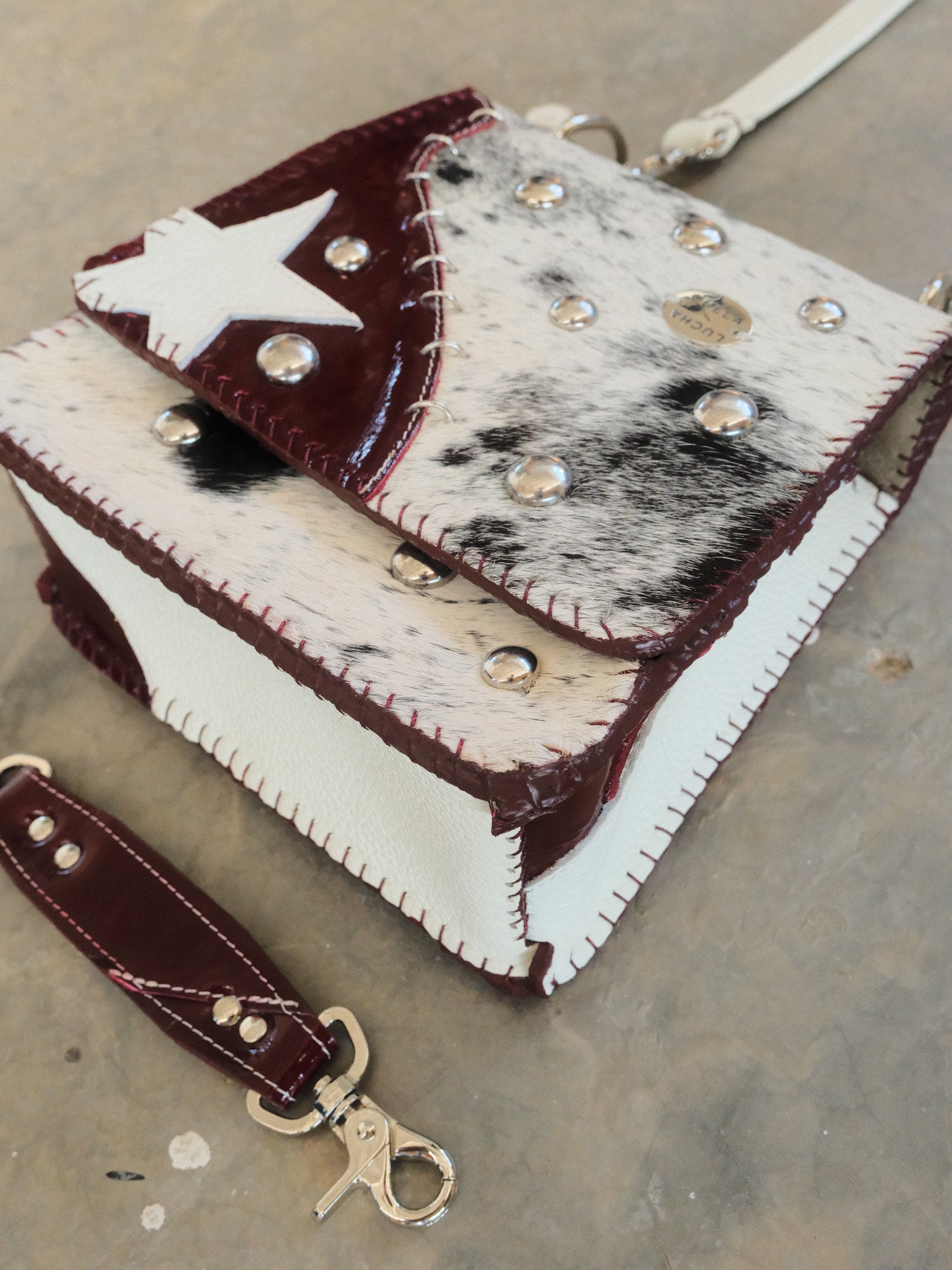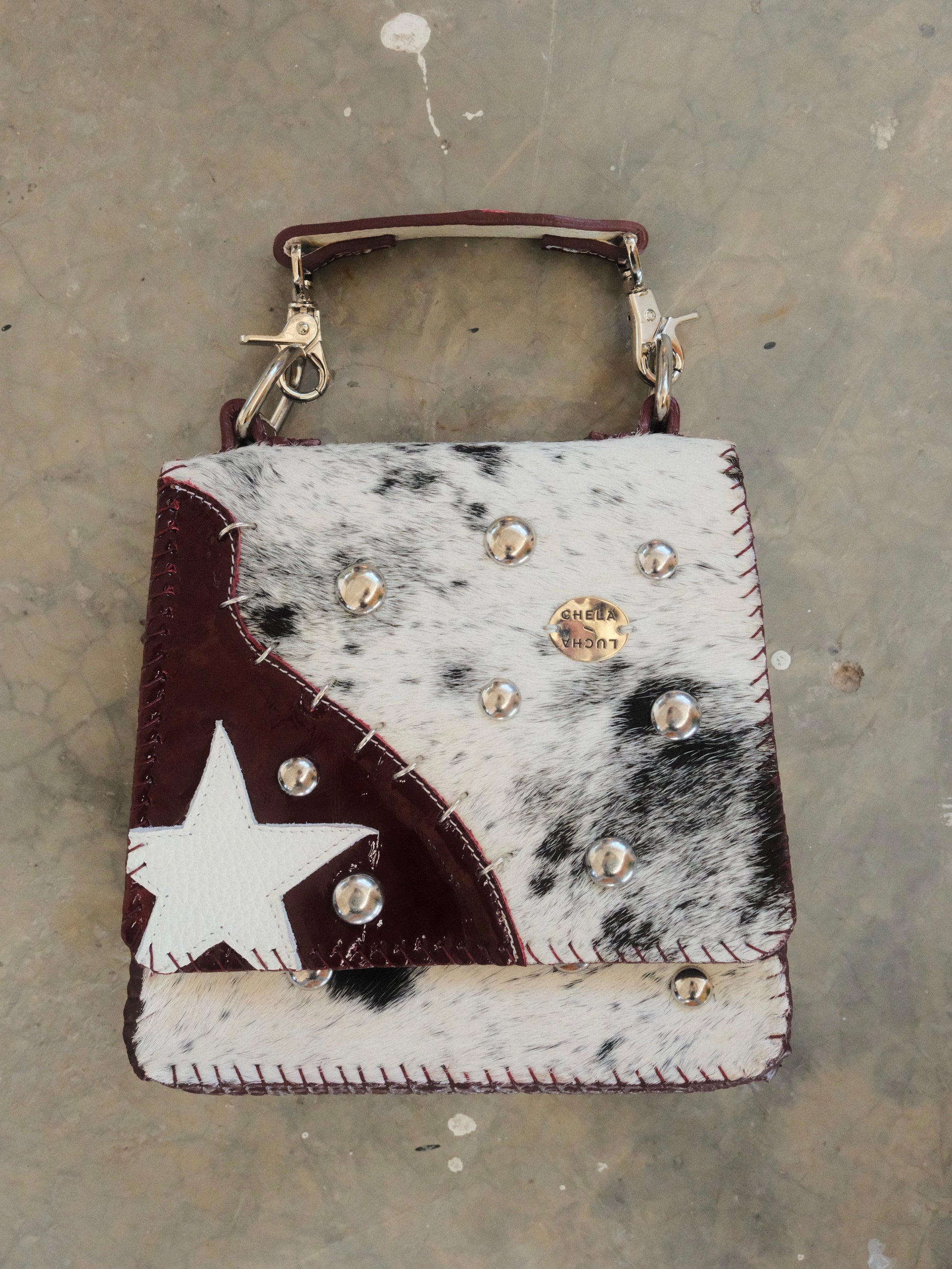 Bolsa CUCA hecha con pedacera de piel en tono tinto y textura de pelito. Detalles de estoperoles y argollas en tono plateado.