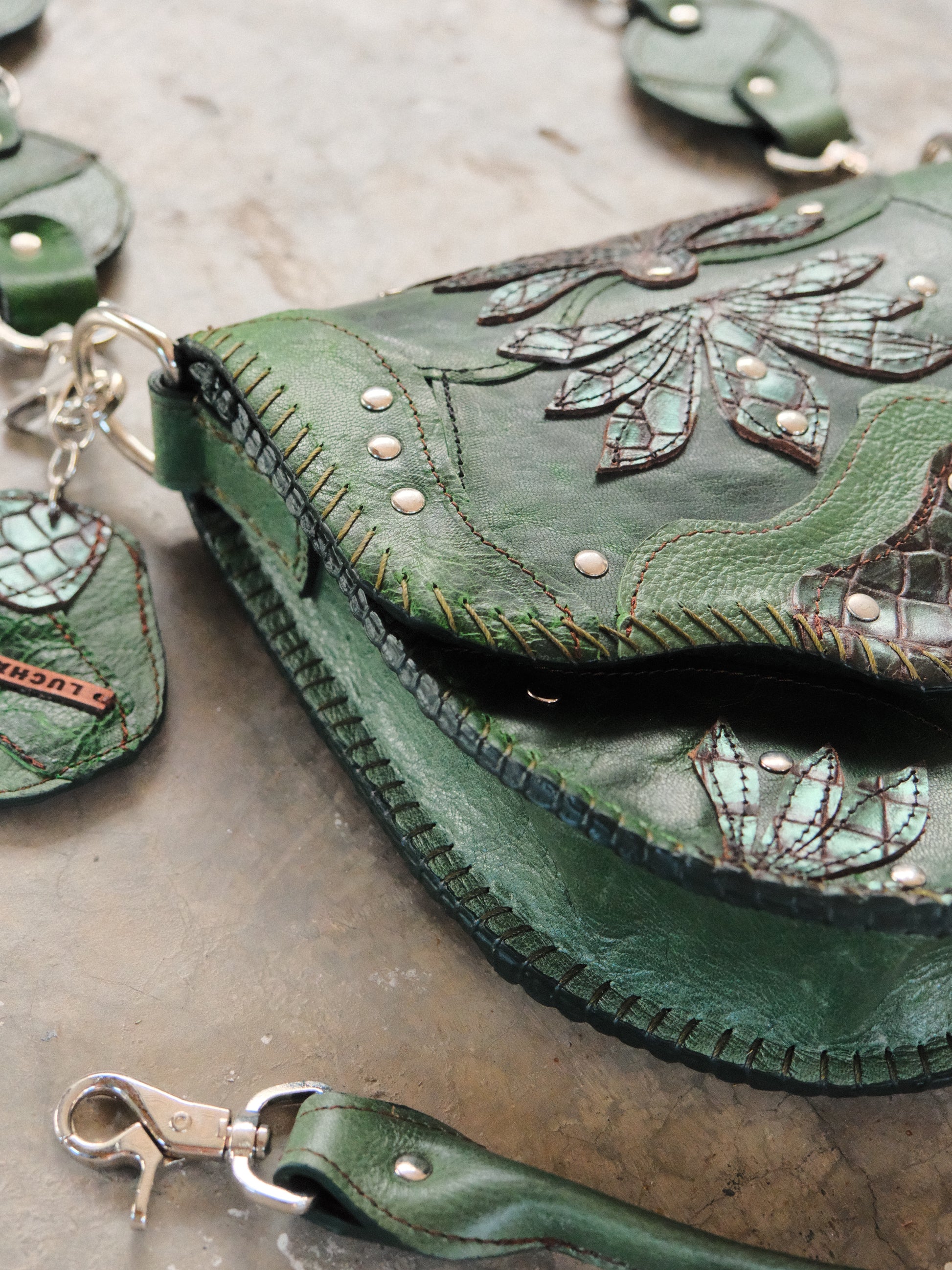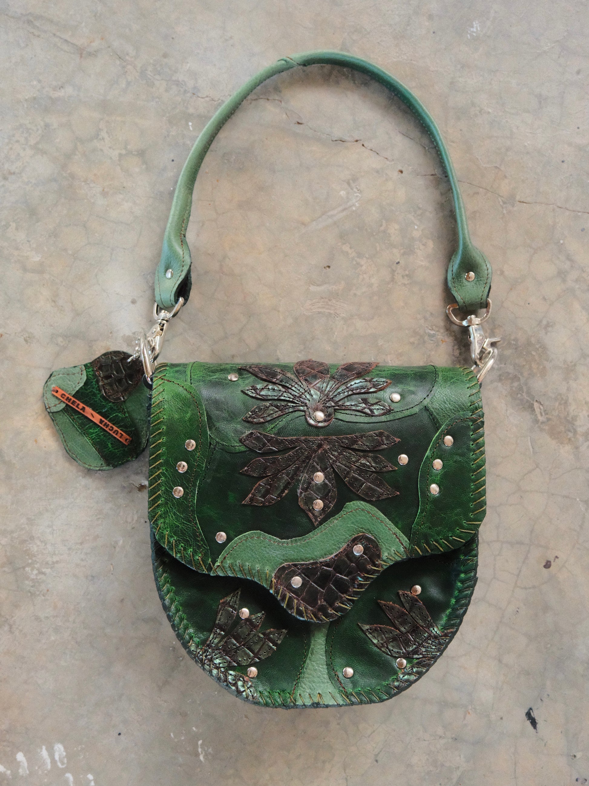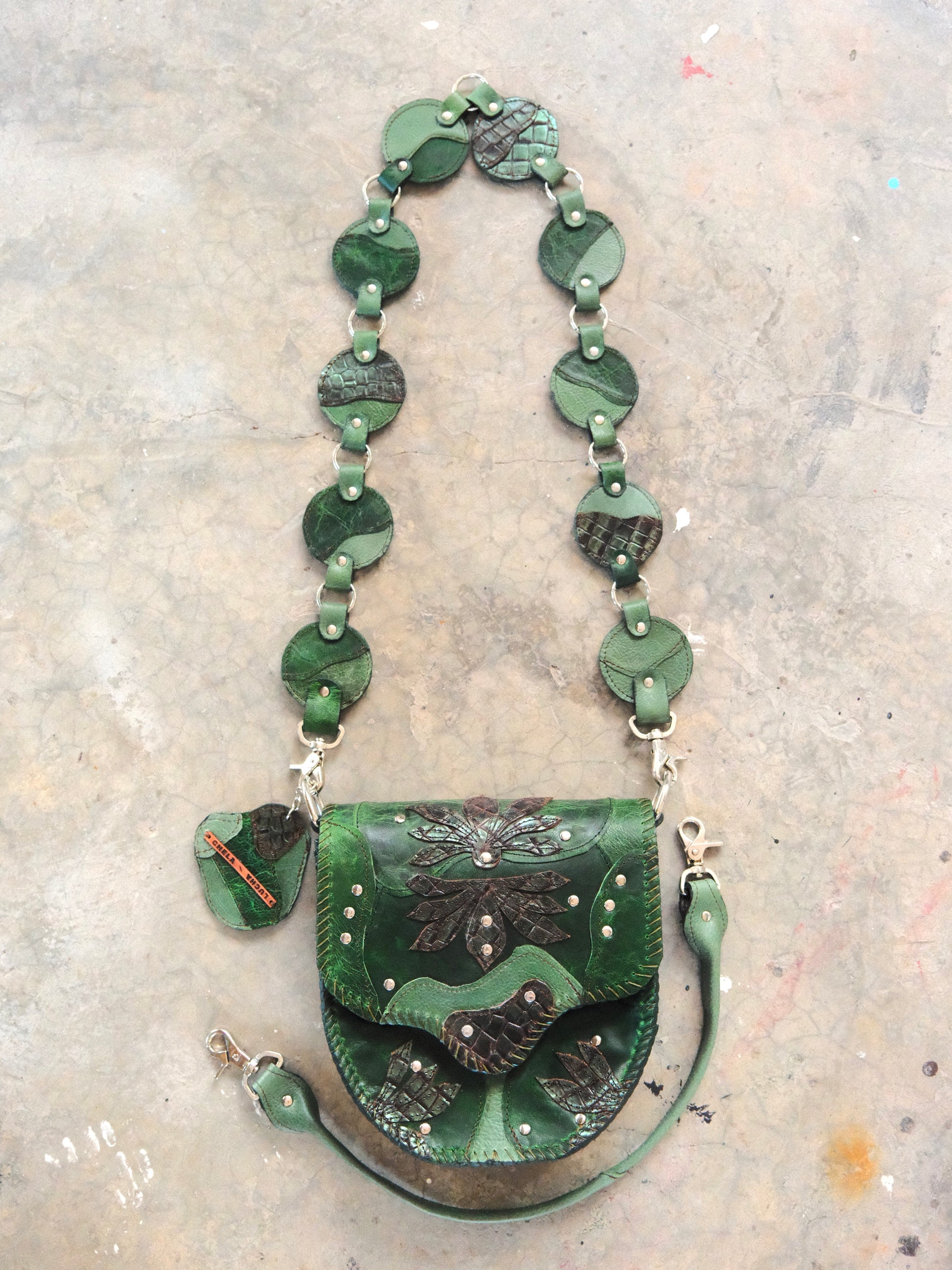 Bolsa LICHA hecha con pedacera de piel en tonos verdes. Detalles de remaches en tono plateado.