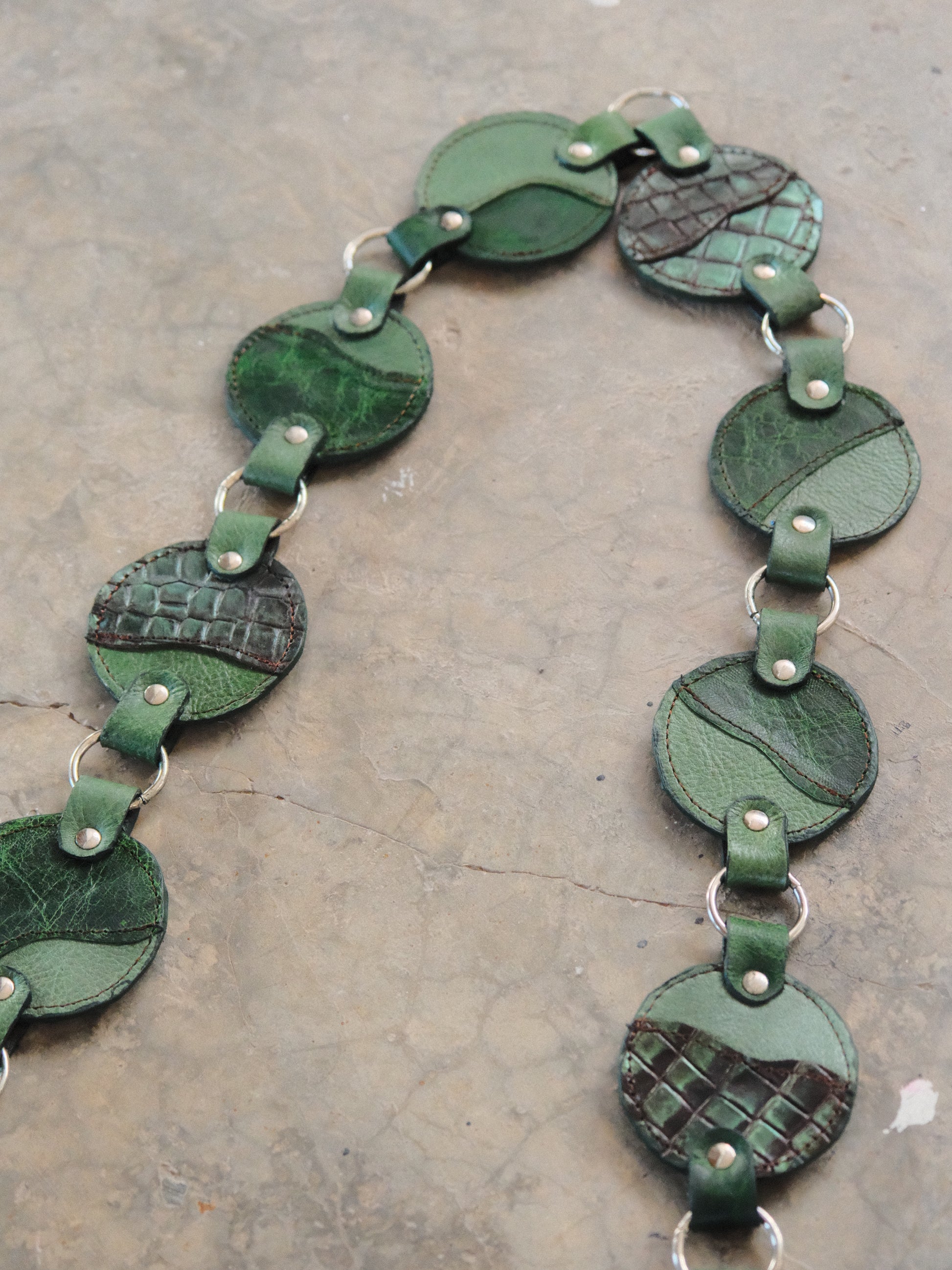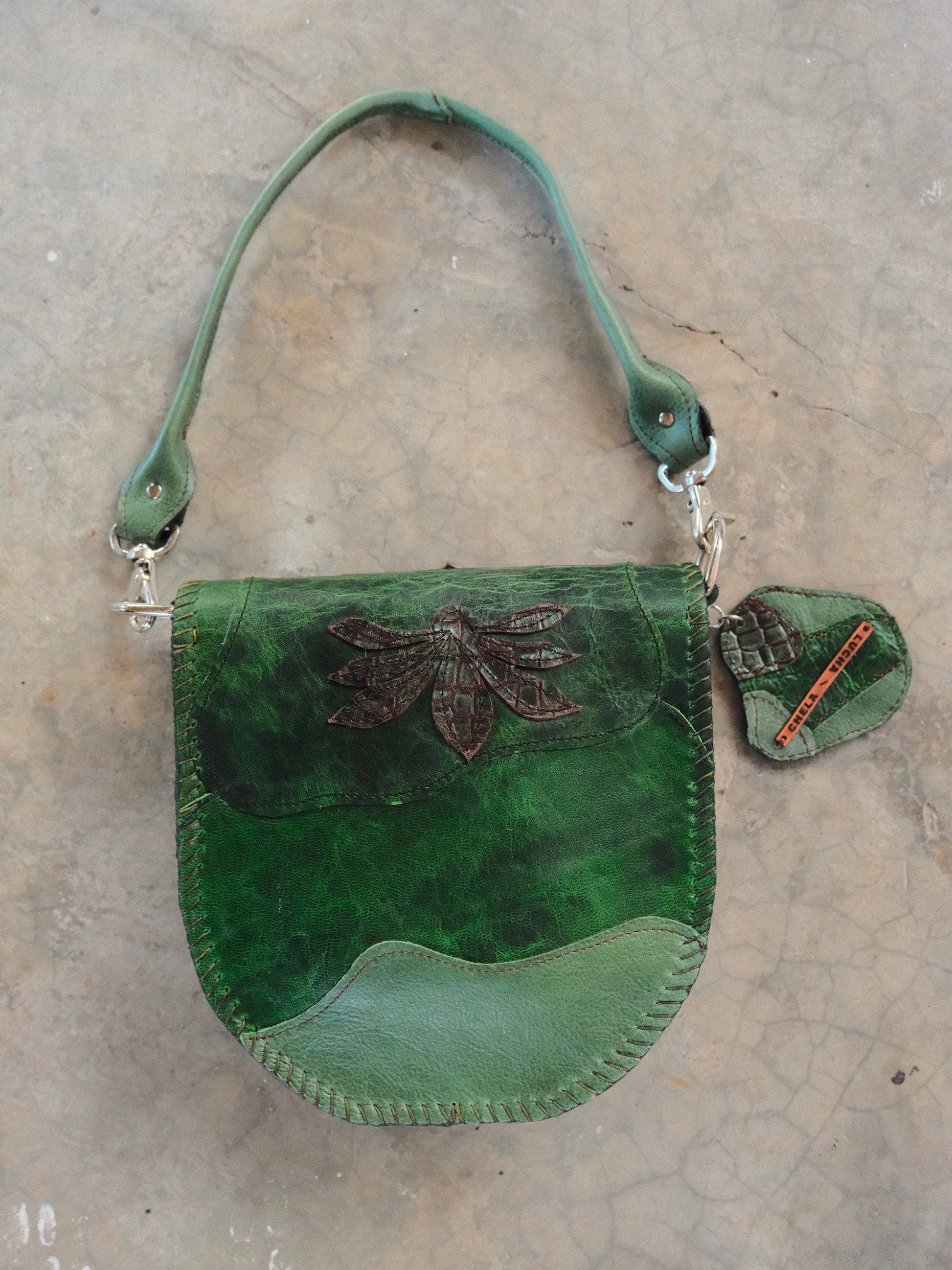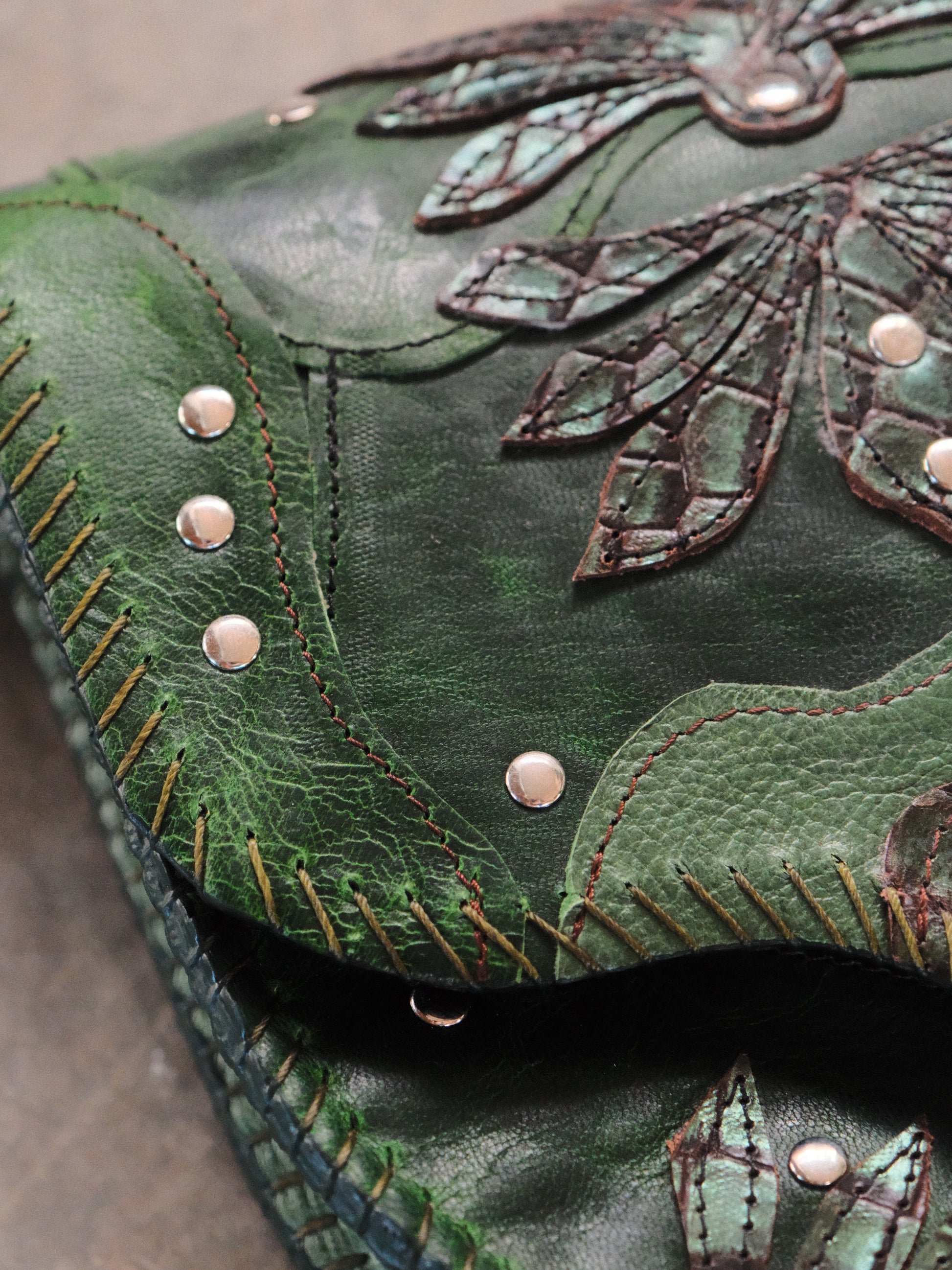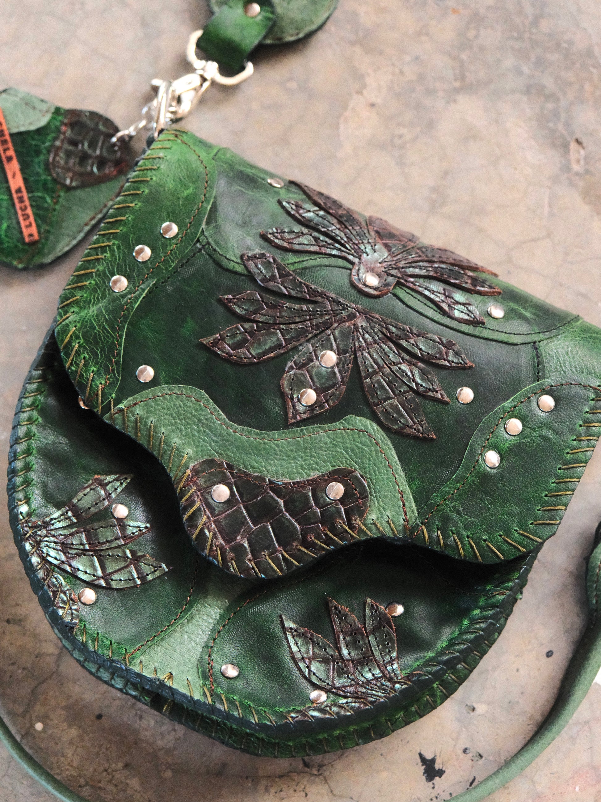 Bolsa LICHA hecha con pedacera de piel en tonos verdes. Detalles de remaches en tono plateado.