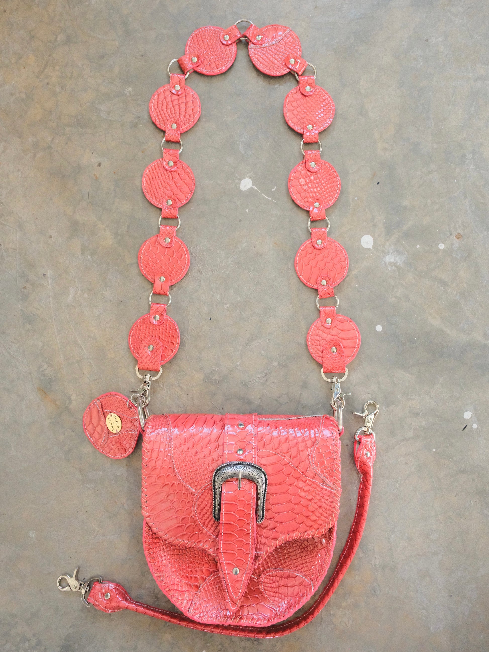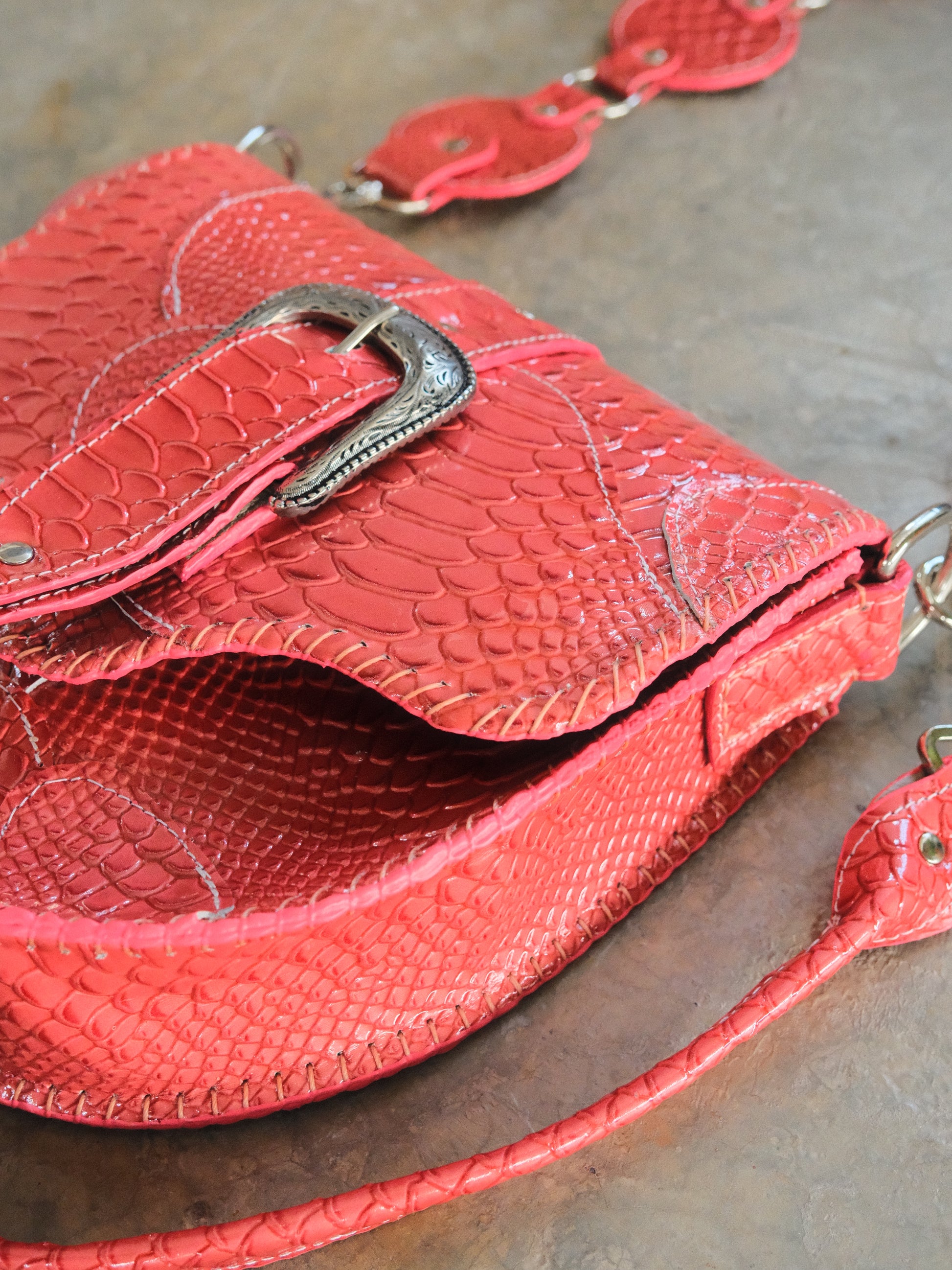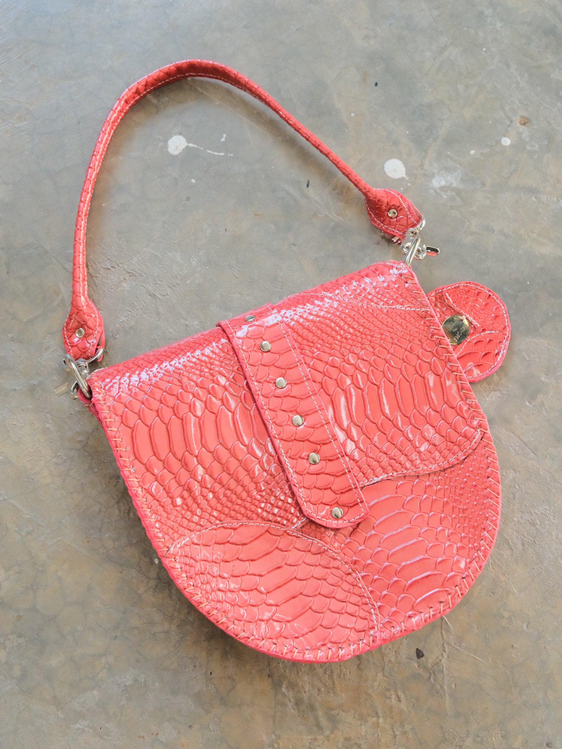 Bolsa LICHA hecha con pedacera de piel en tono coral en textura imitación serpiente. Detalles de remaches en tono plateado.