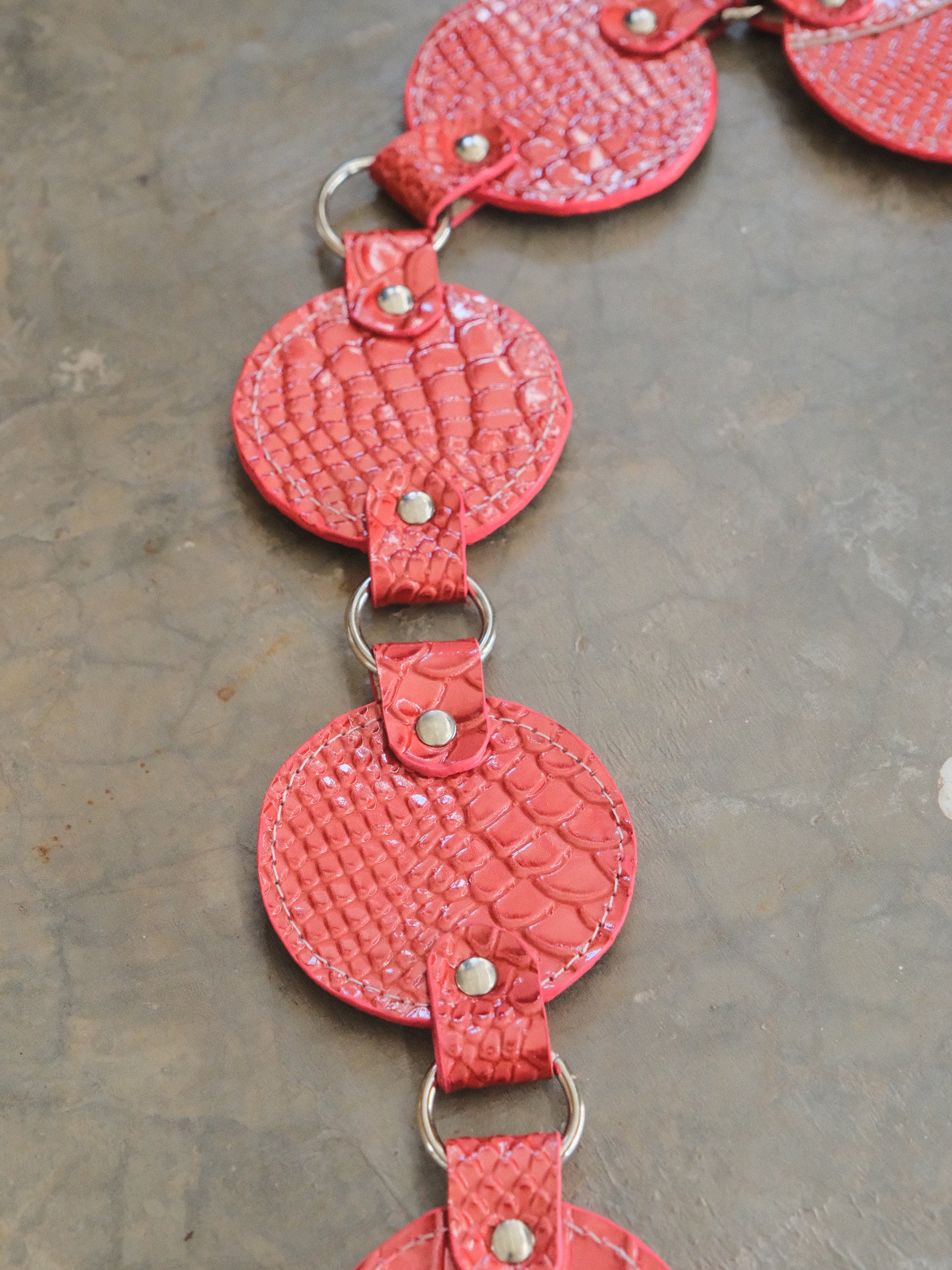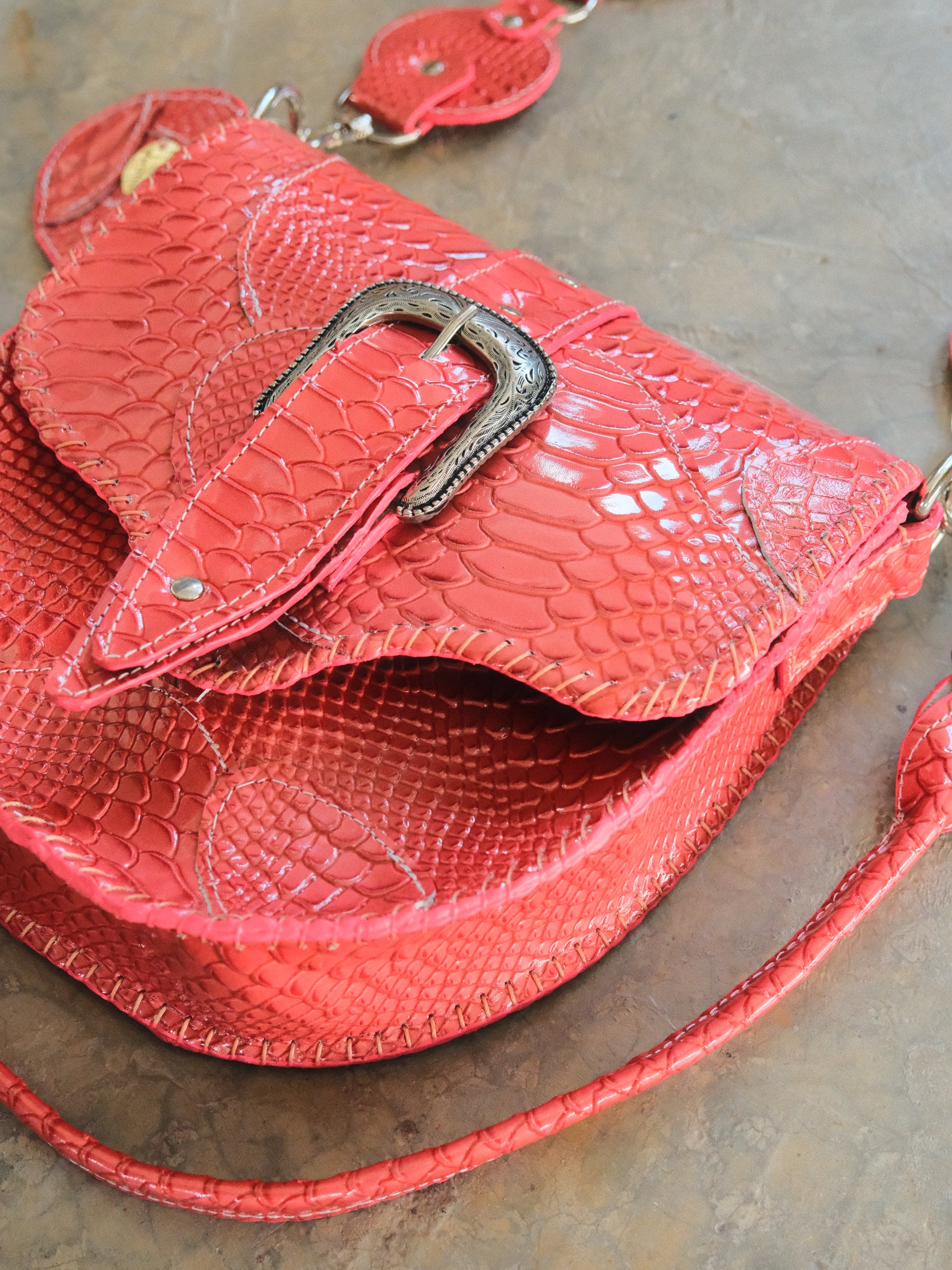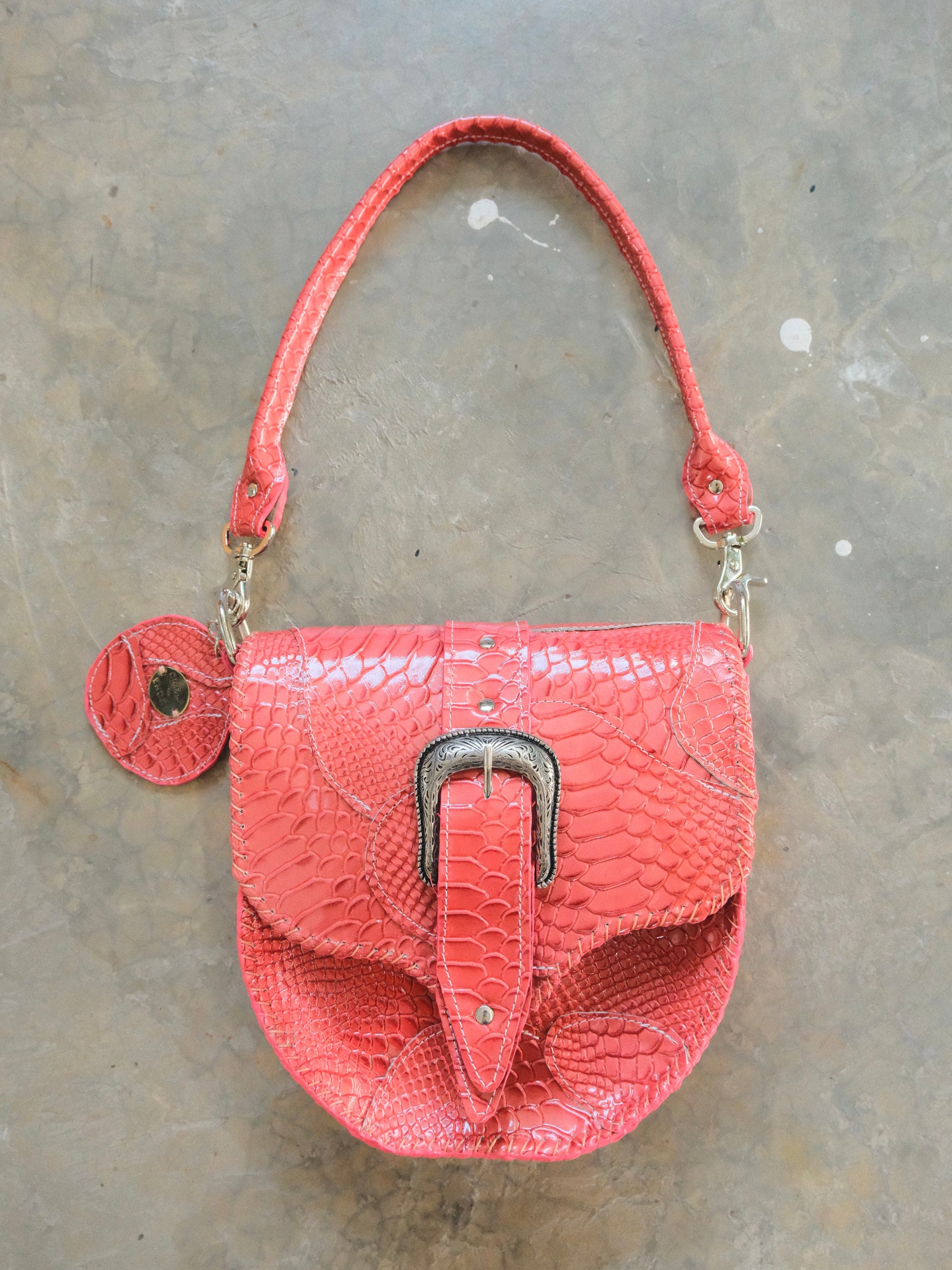 Bolsa LICHA hecha con pedacera de piel en tono coral en textura imitación serpiente. Detalles de remaches en tono plateado.