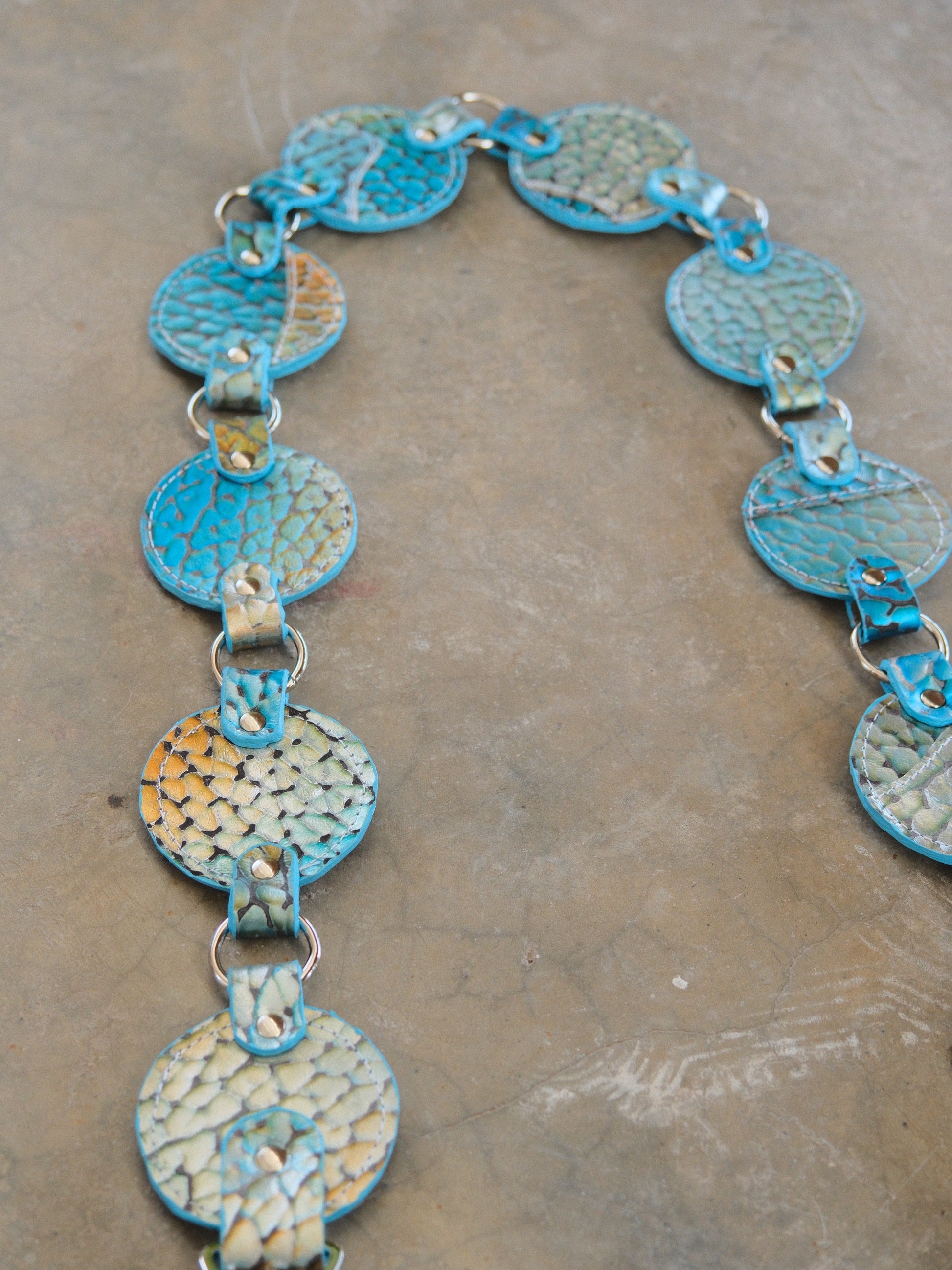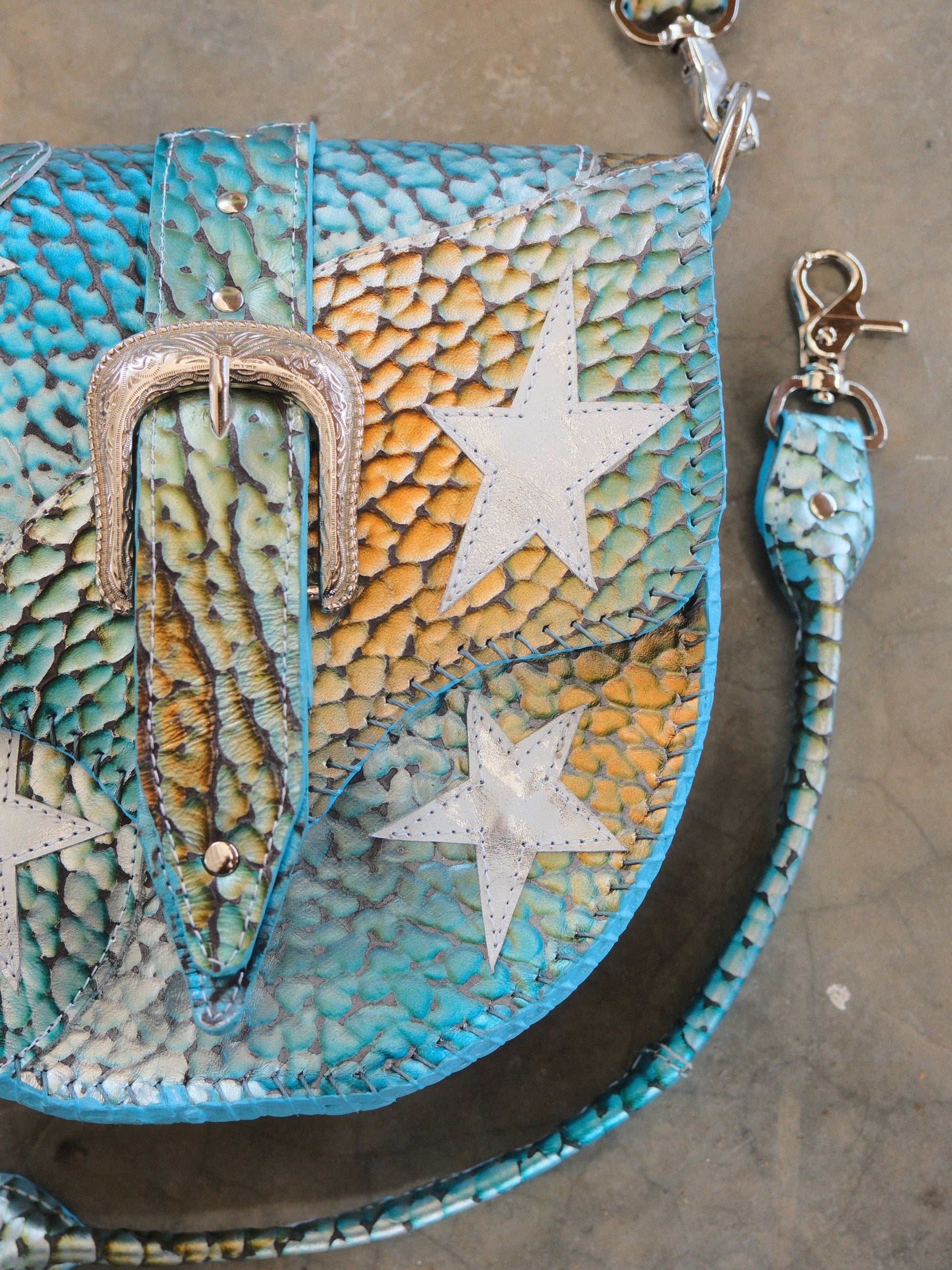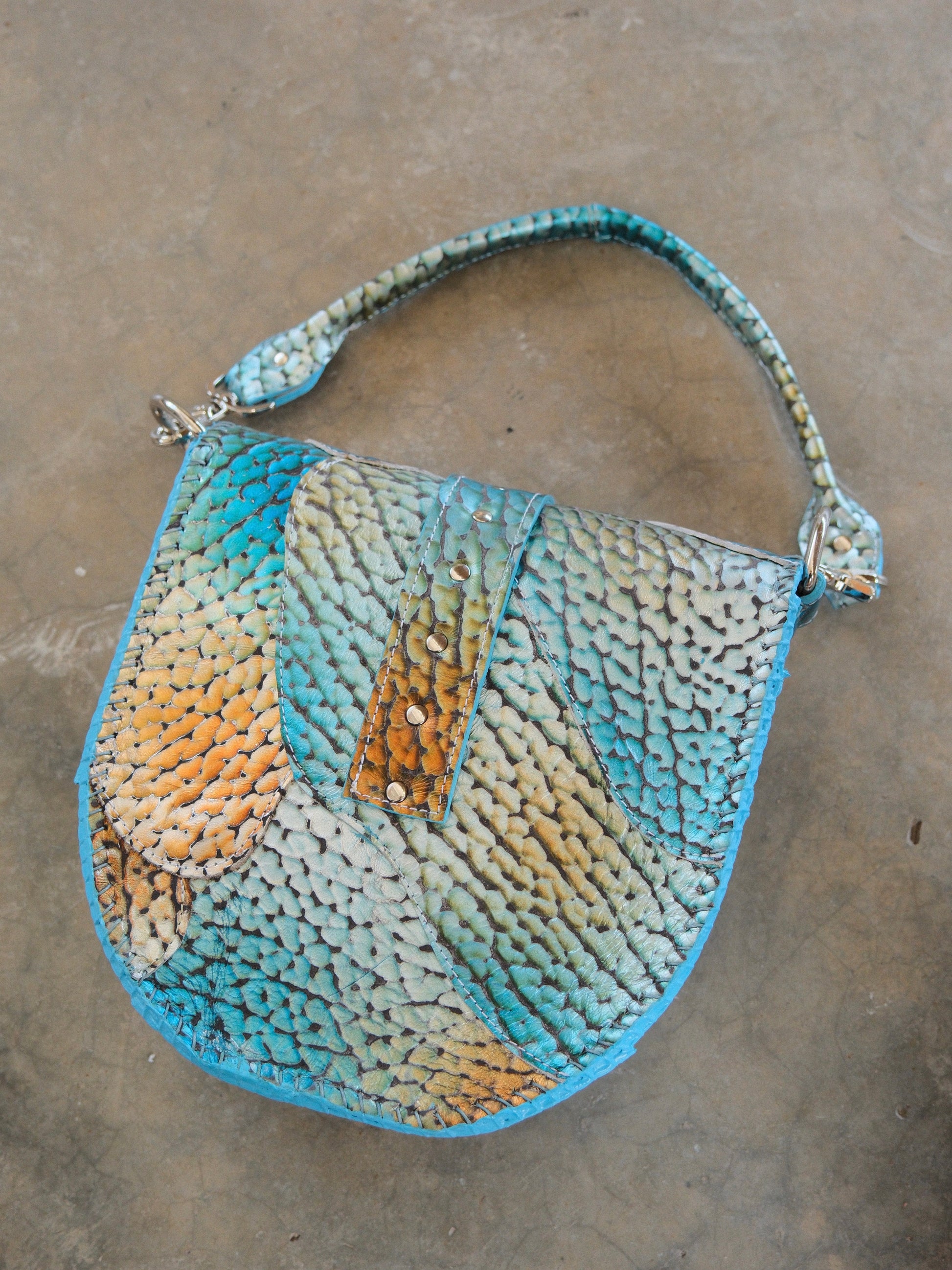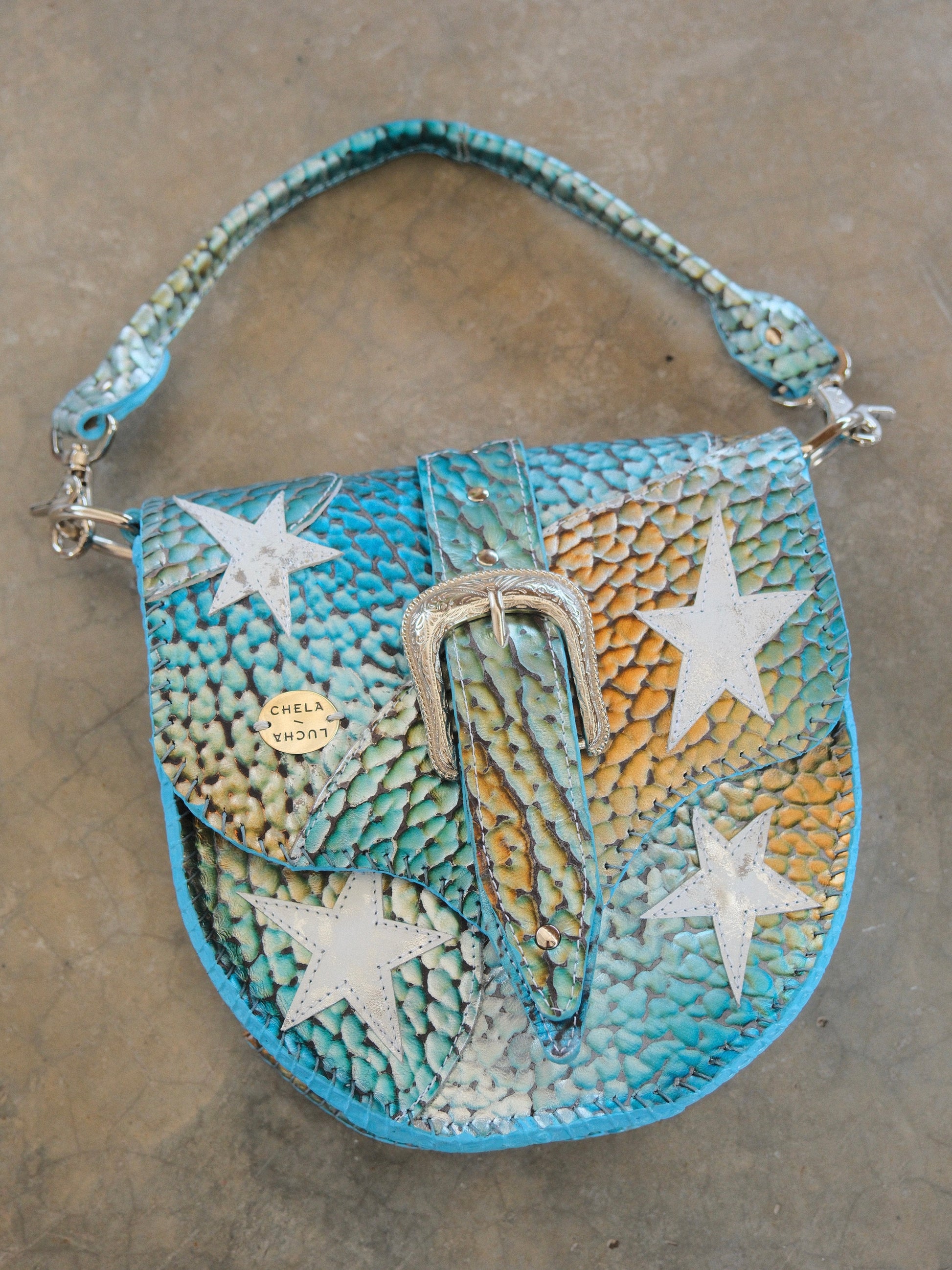 Bolsa LICHA hecha con pedacera de piel en tonos variados y plateado. Detalles de hebilla y remaches en tono plateado.