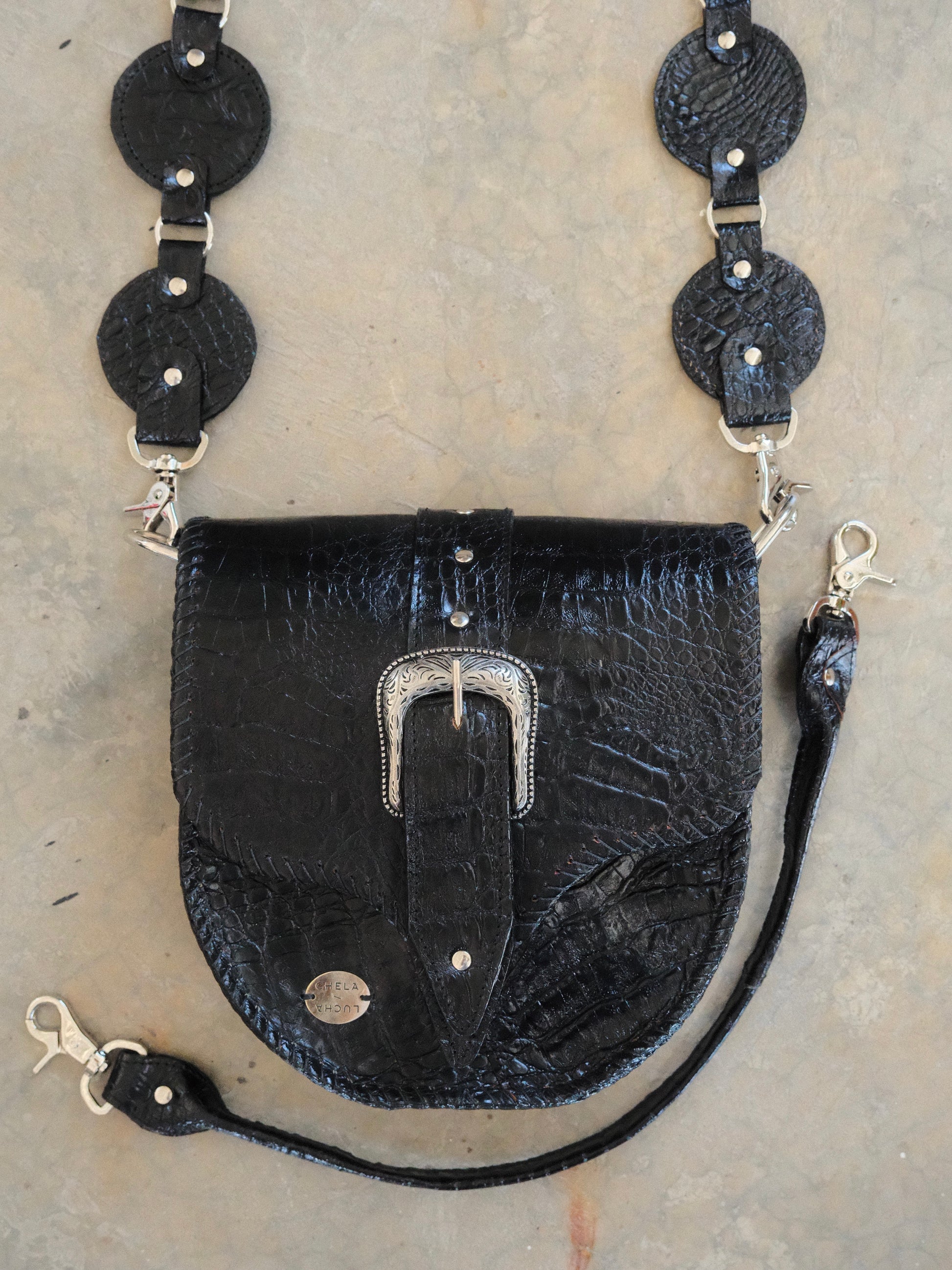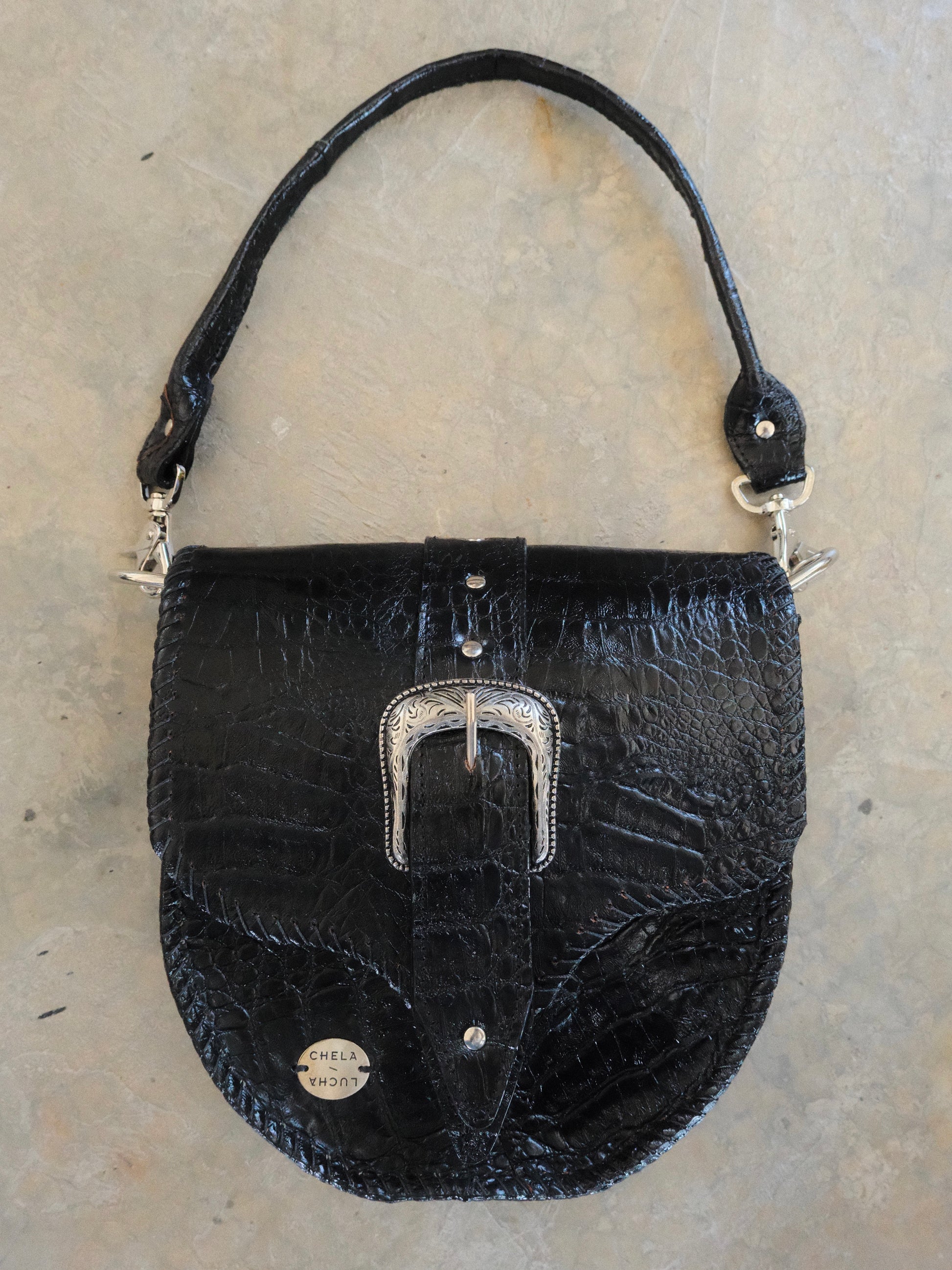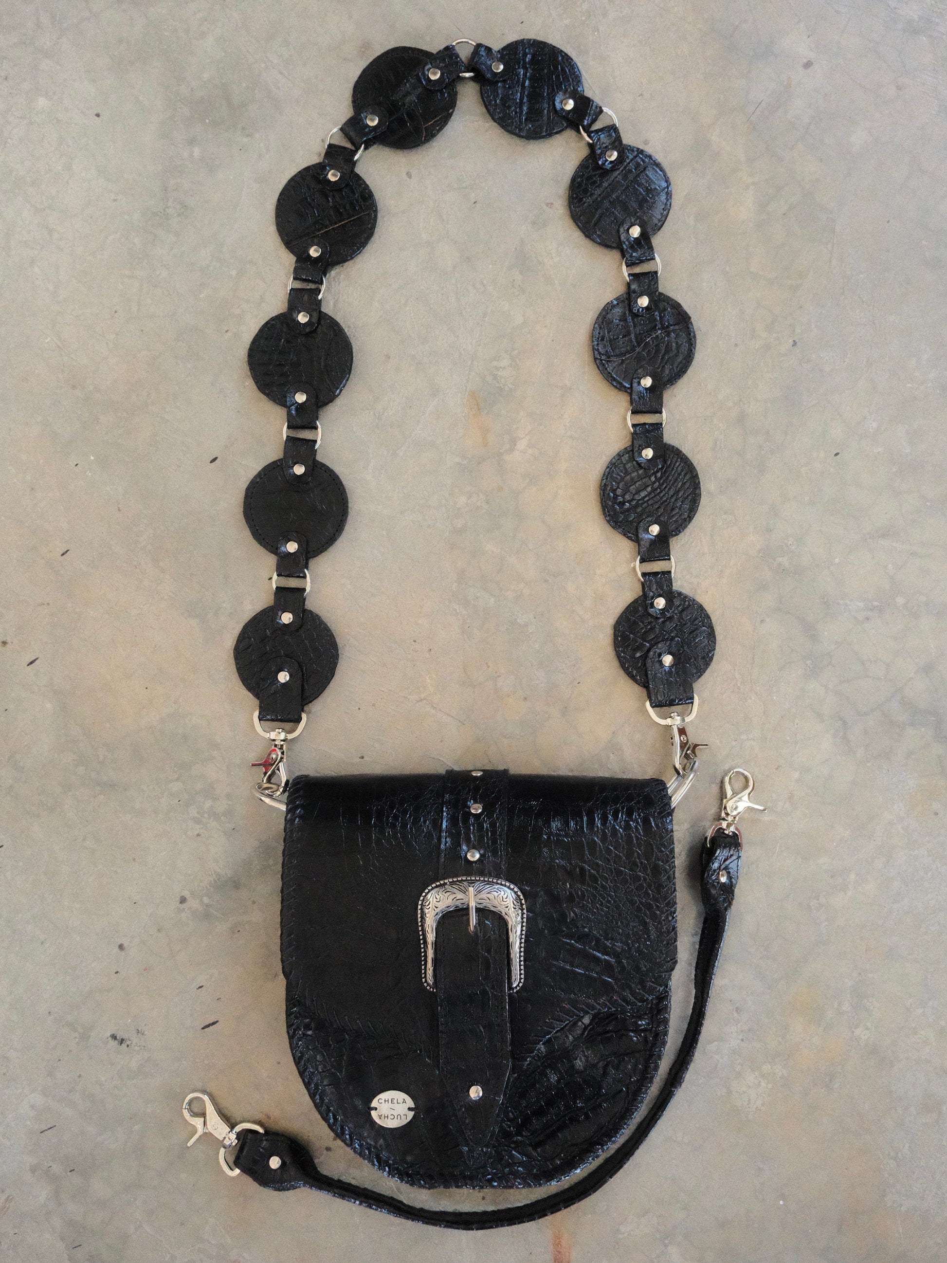Bolsa LICHA hecha con pedacera de piel en tono negro. Detalles de remaches y hebilla en tono plateado.