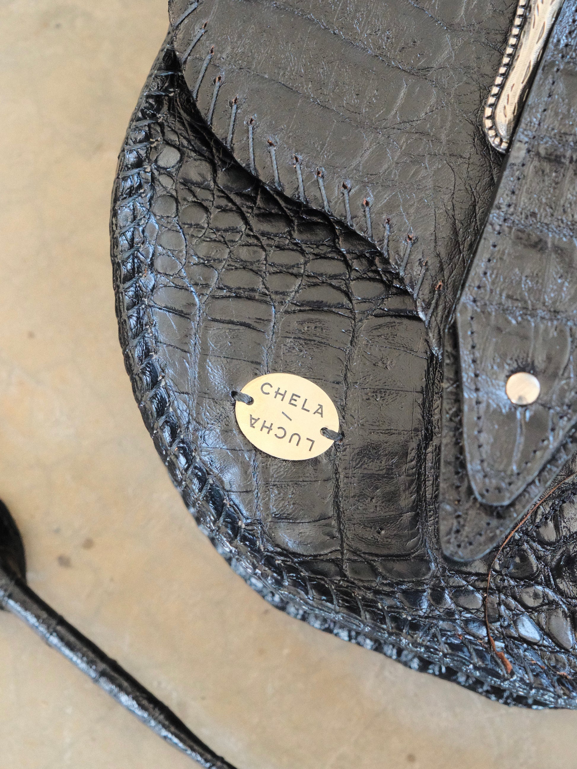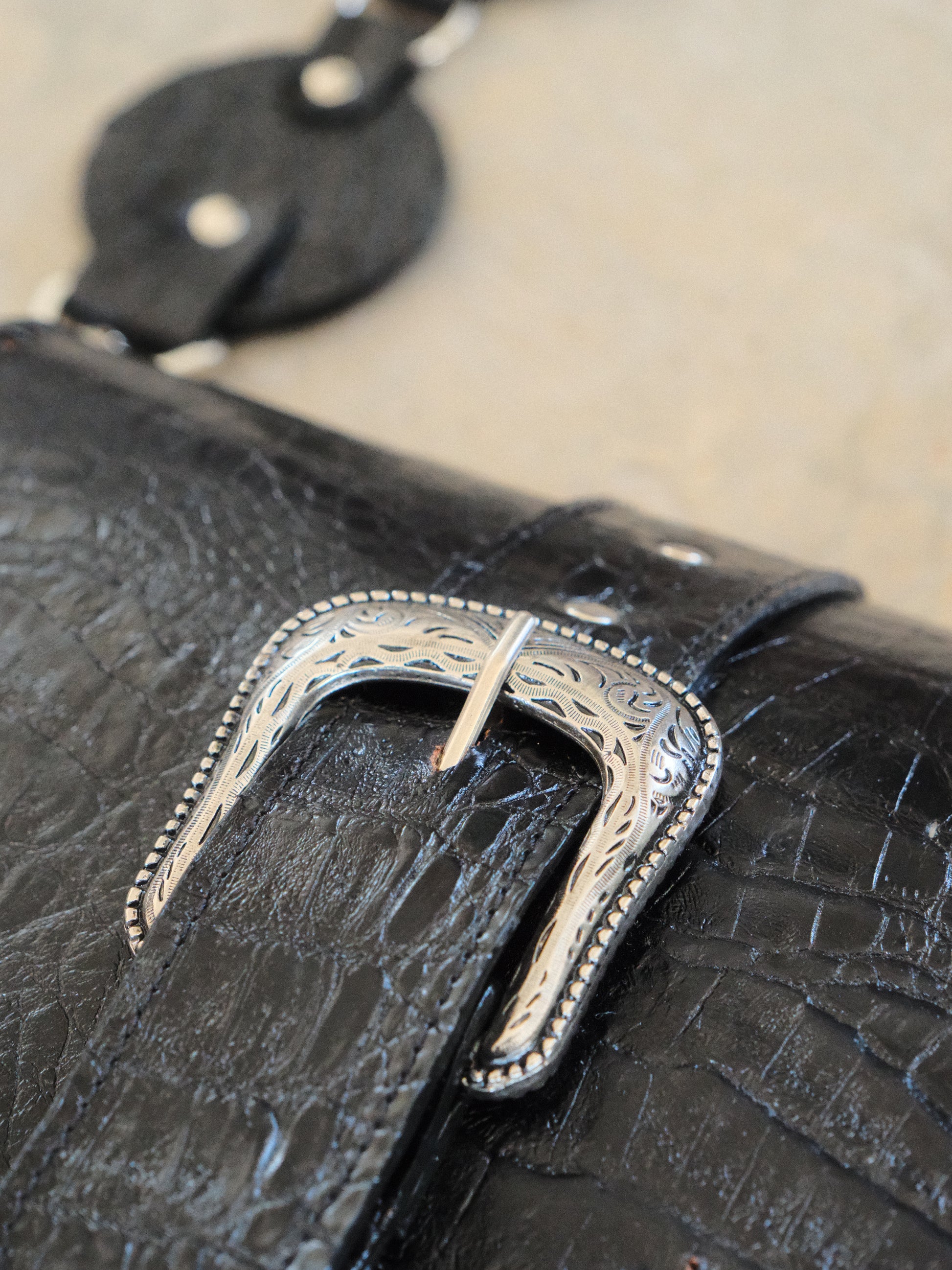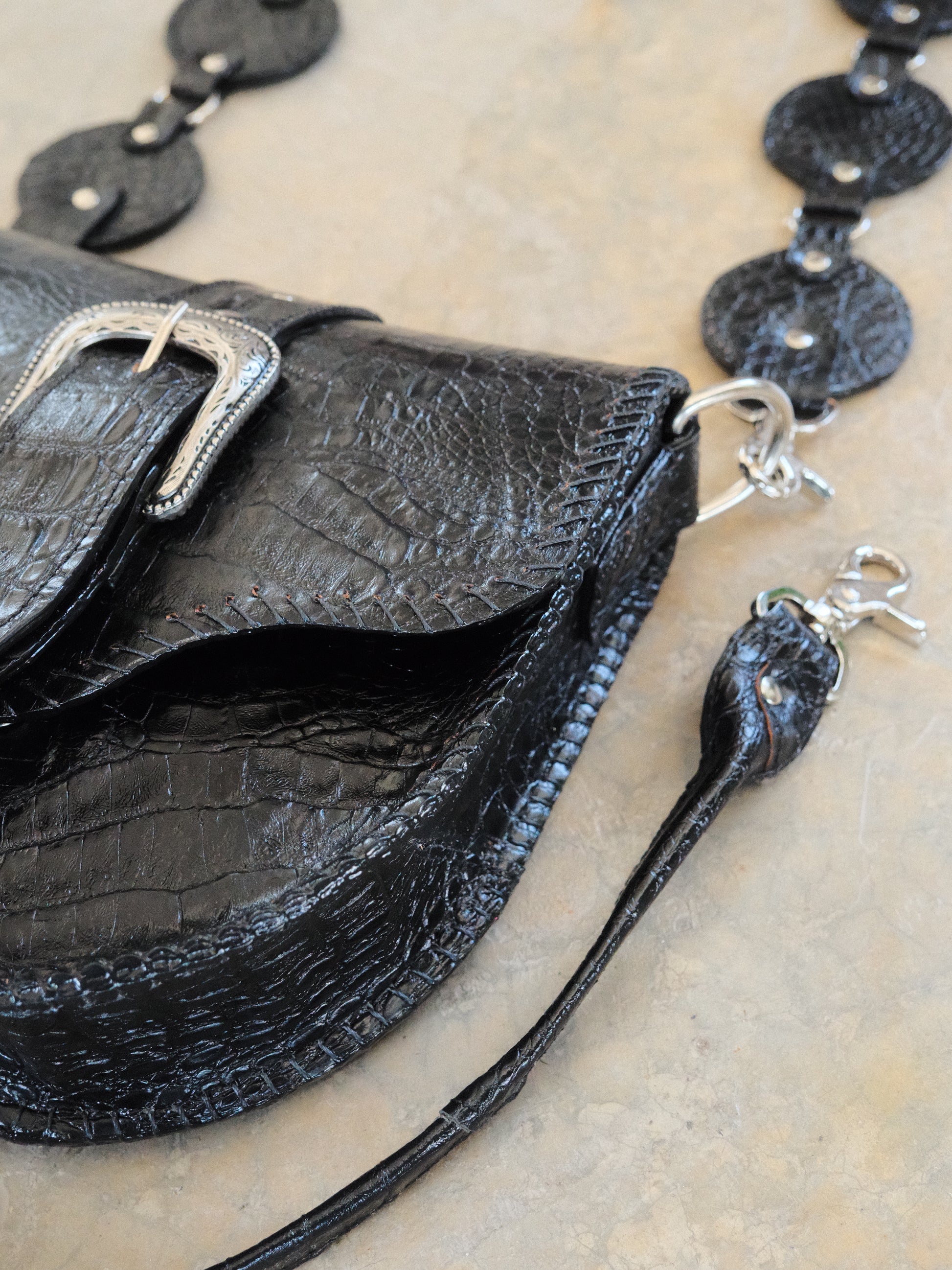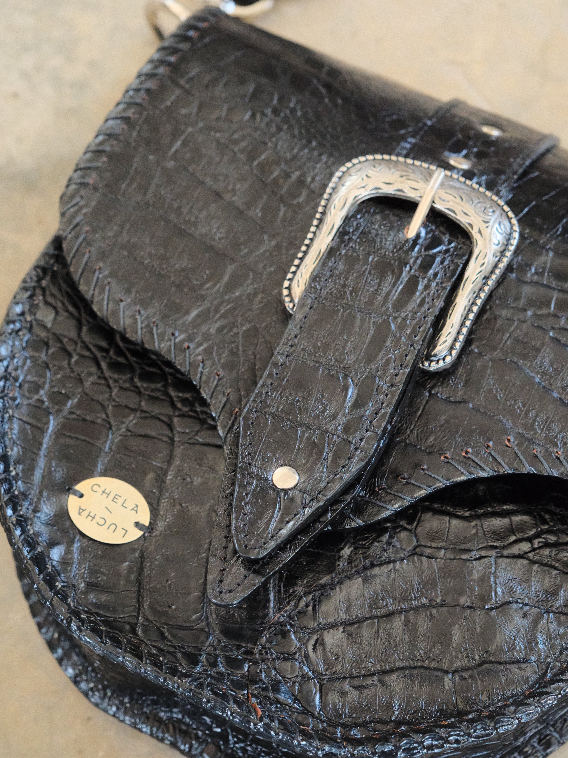 Bolsa LICHA hecha con pedacera de piel en tono negro. Detalles de remaches y hebilla en tono plateado.