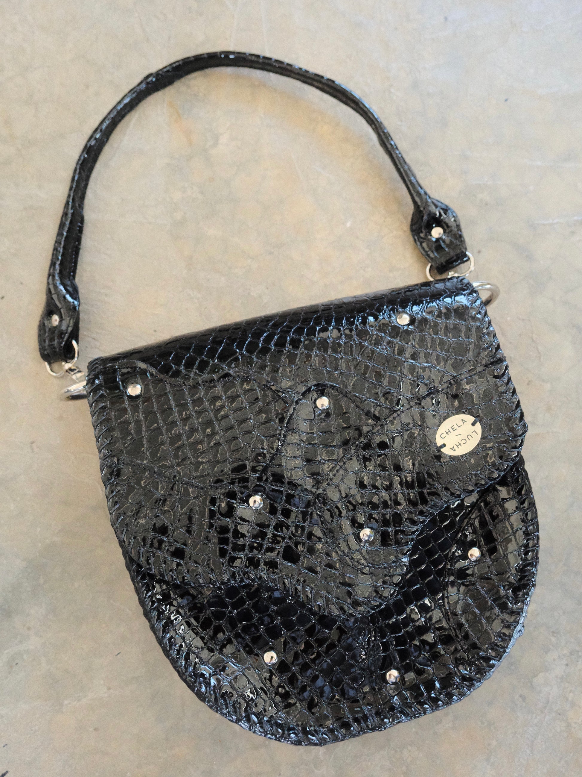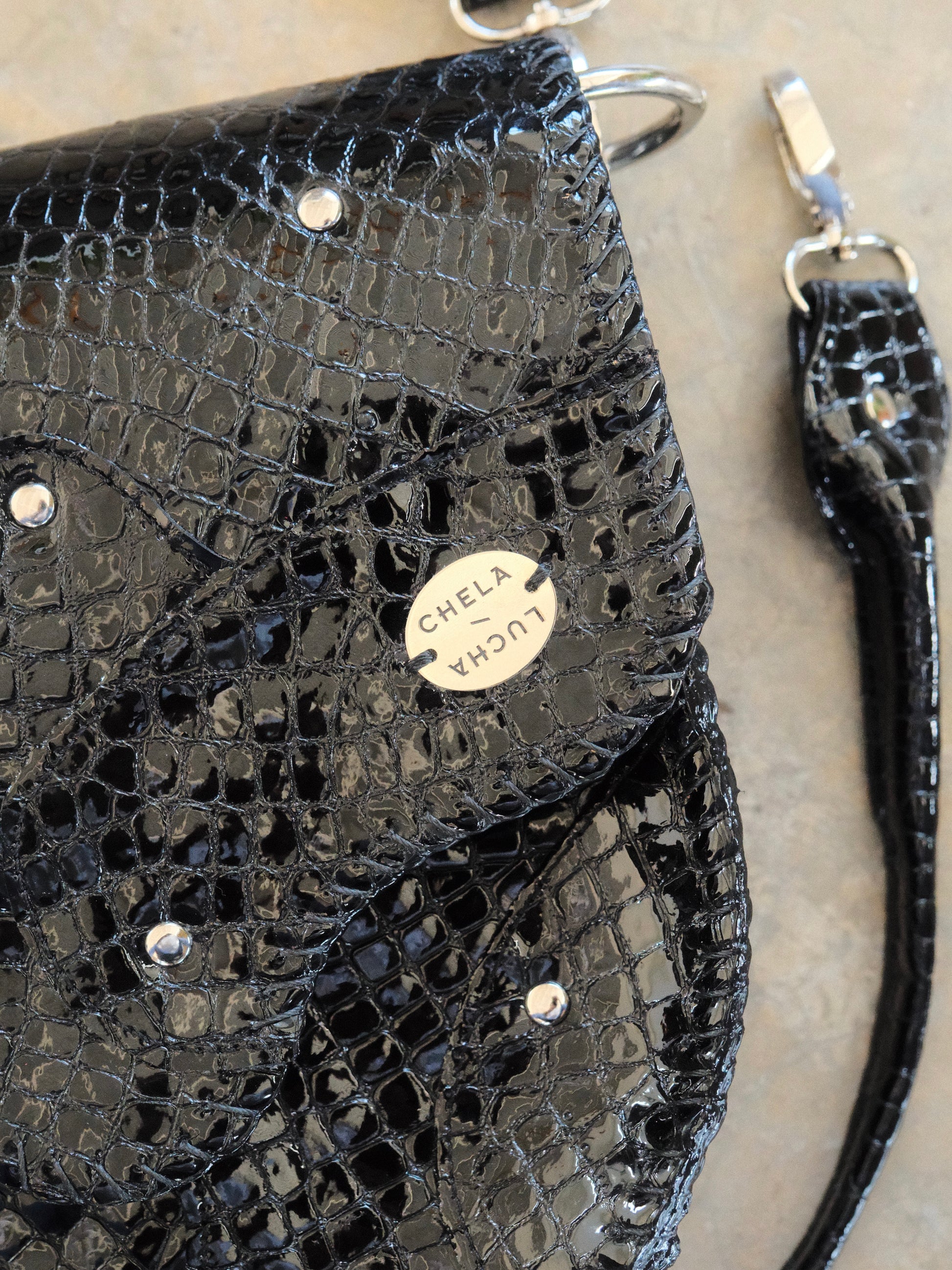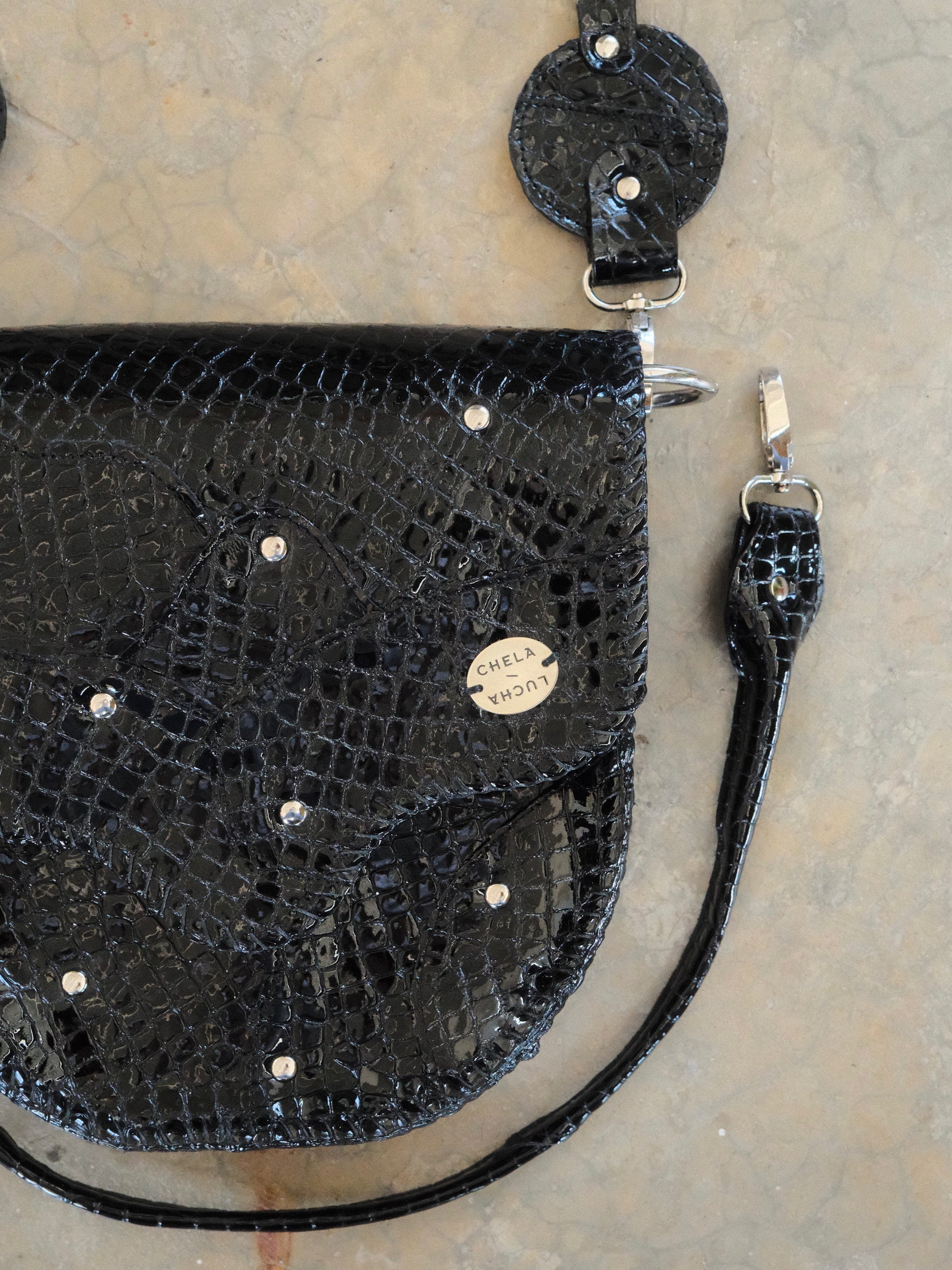 Bolsa LICHA hecha con pedacera de piel en tono negro estilo charol. Detalles de remaches en tono plateado.