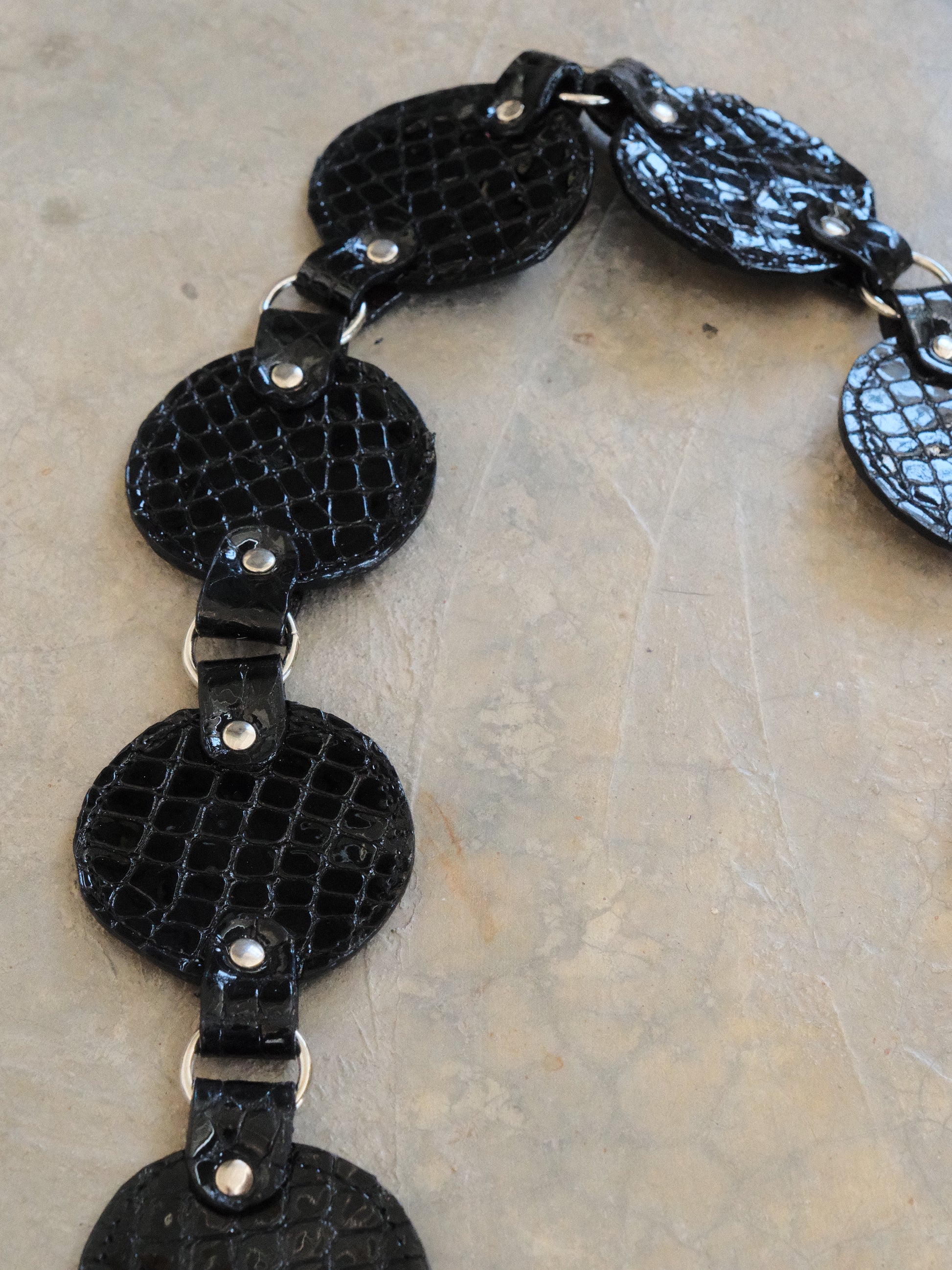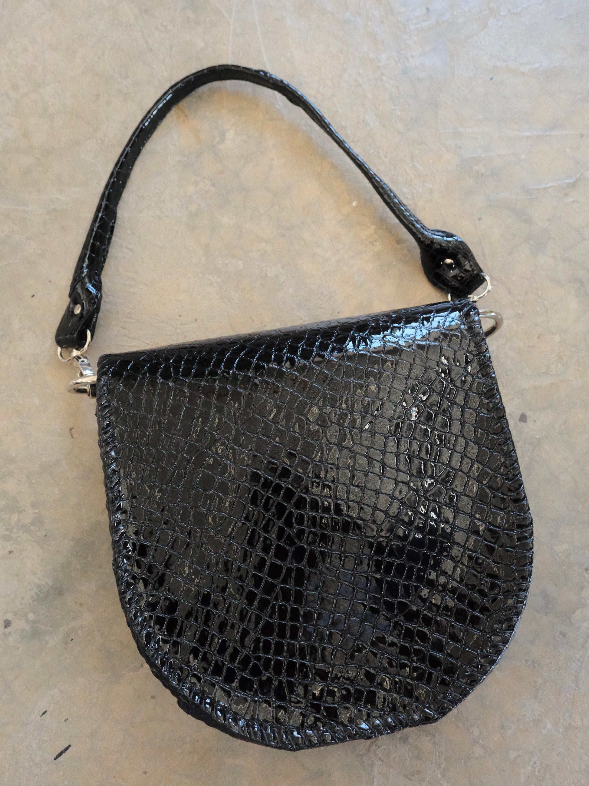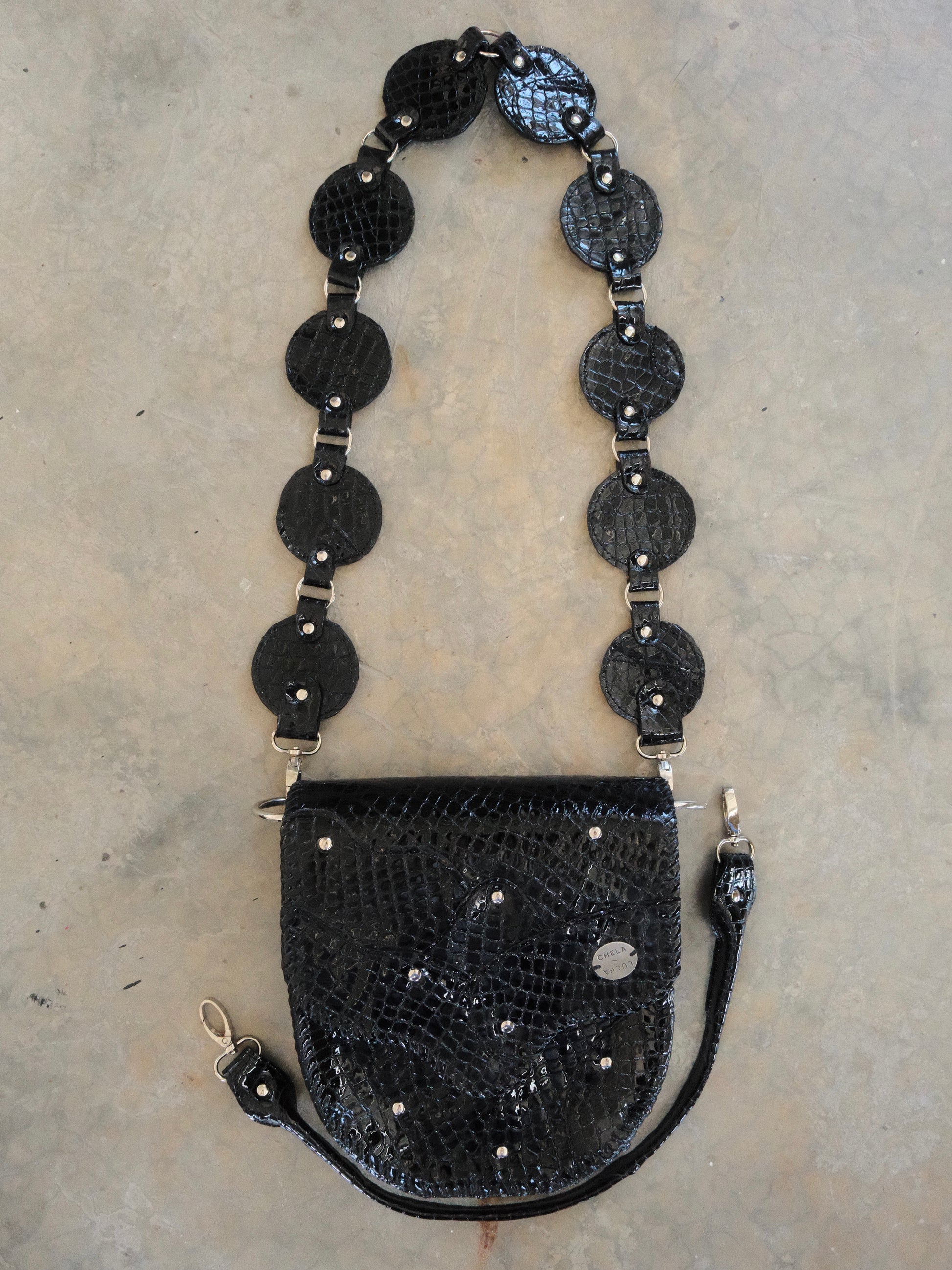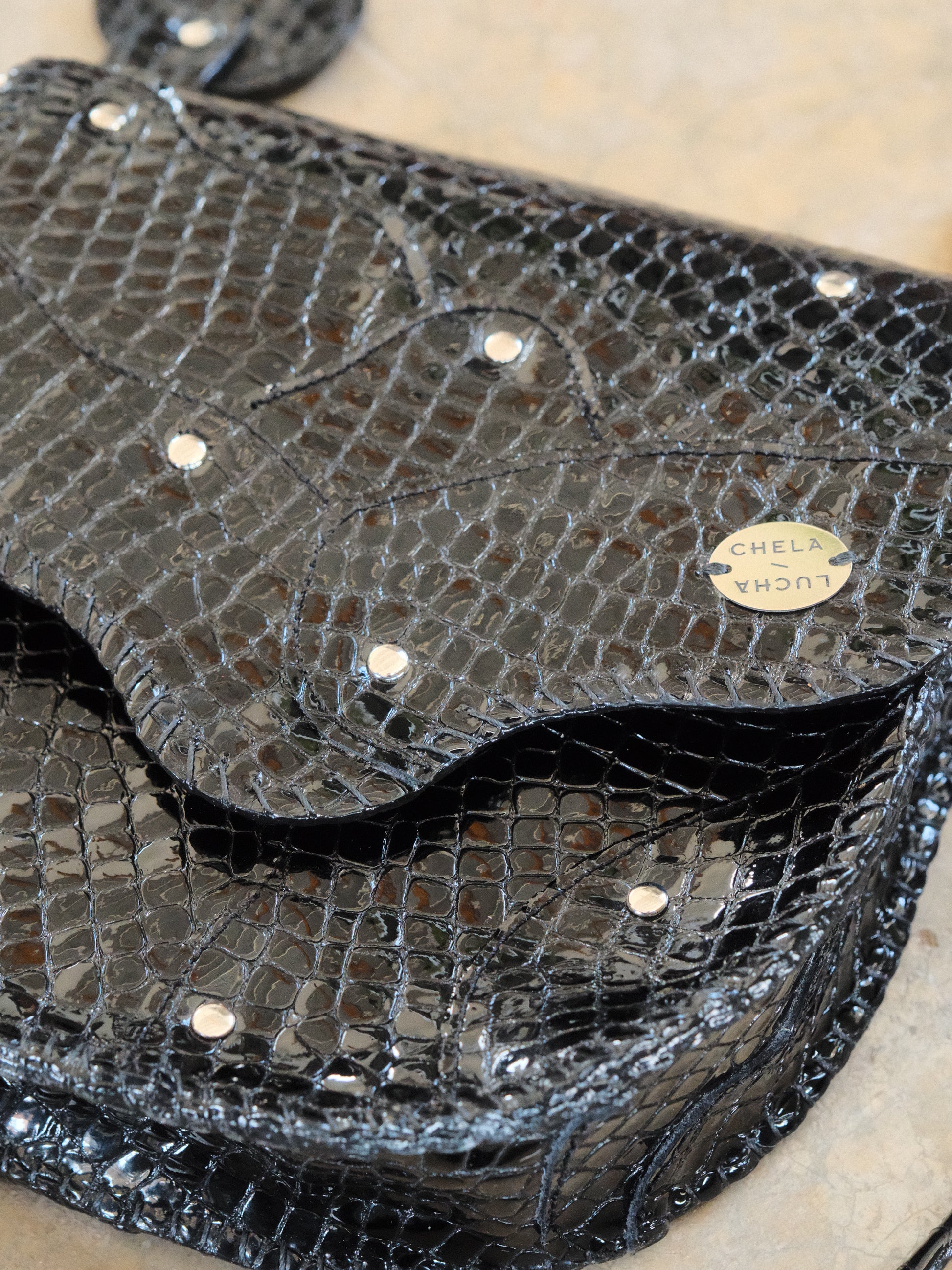 Bolsa LICHA hecha con pedacera de piel en tono negro estilo charol. Detalles de remaches en tono plateado.