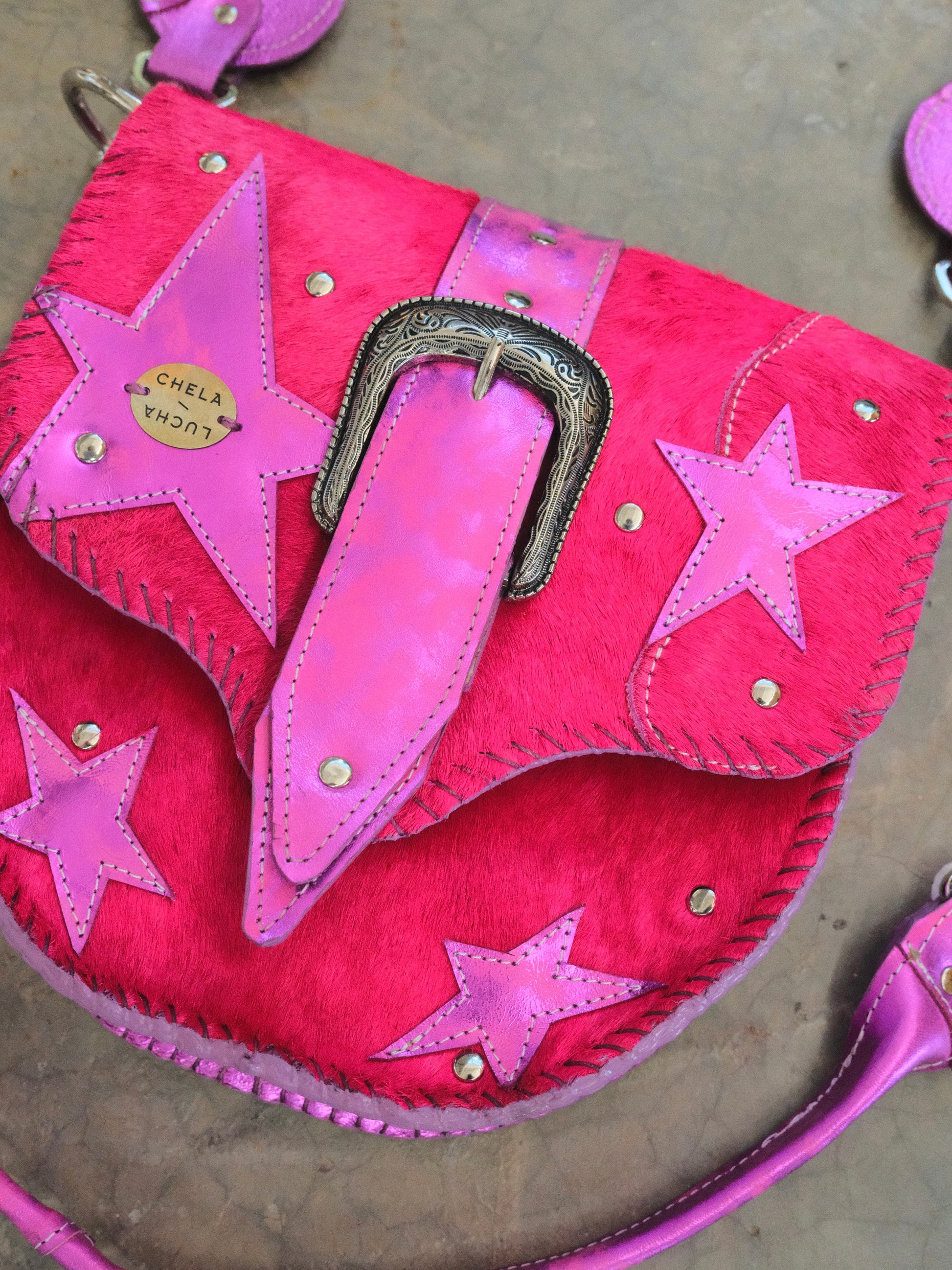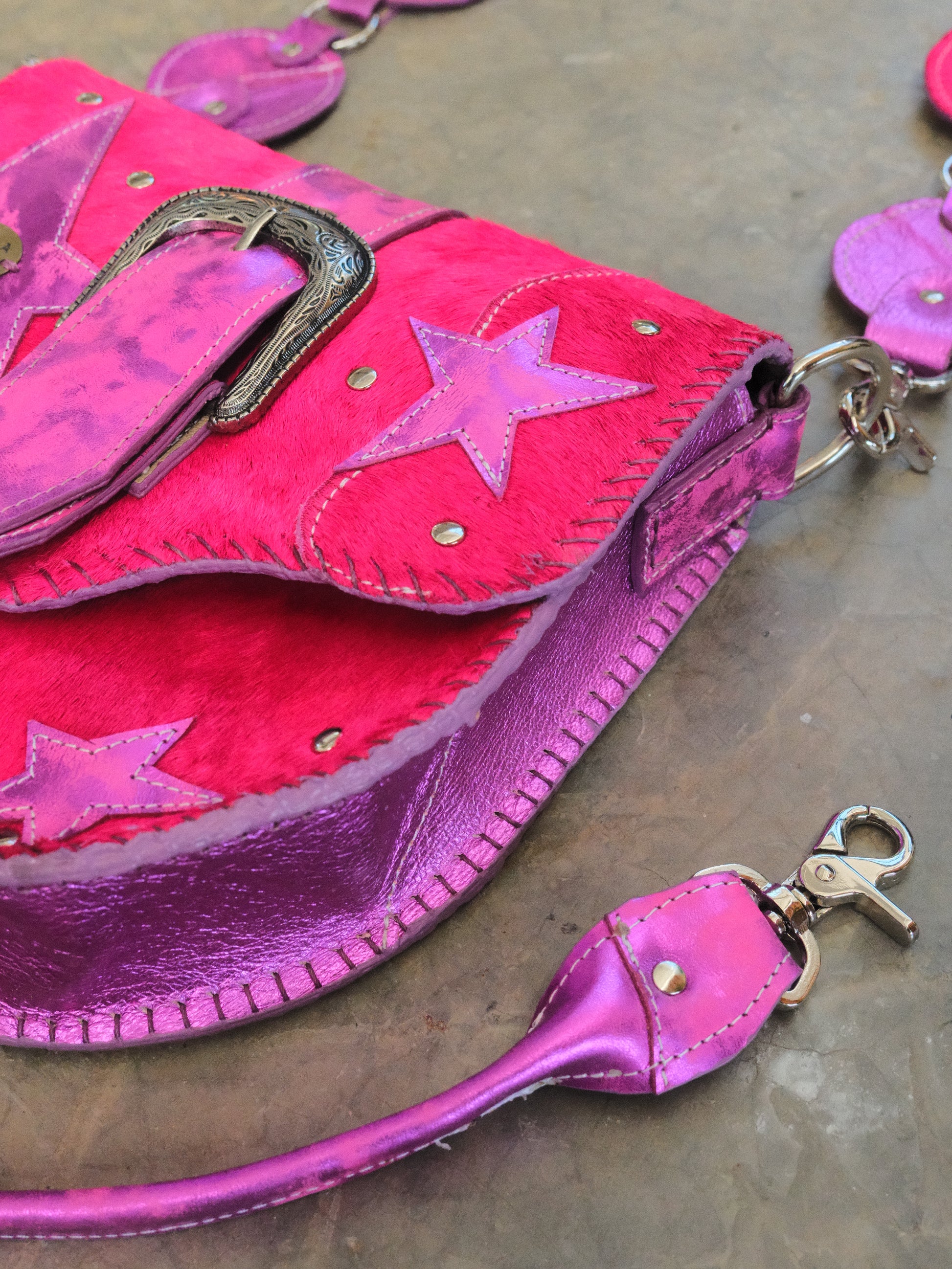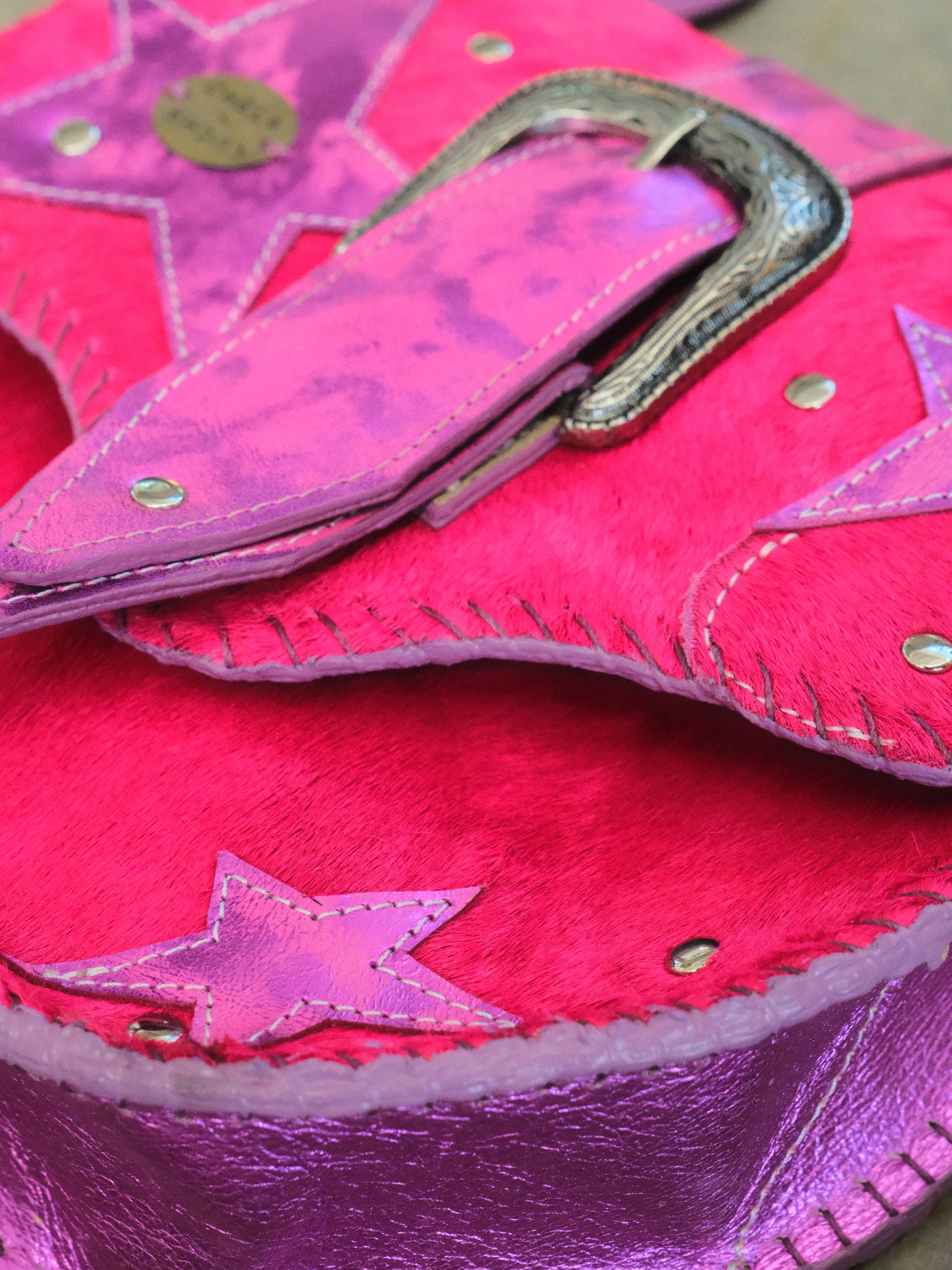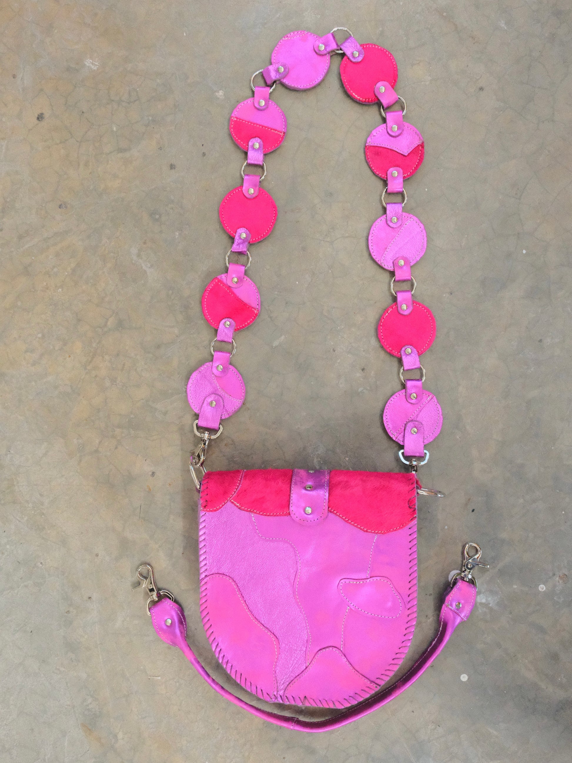 Bolsa LICHA hecha con pedacera de piel en tonos rosas. Detalles de hebilla y remaches en tono plateado.