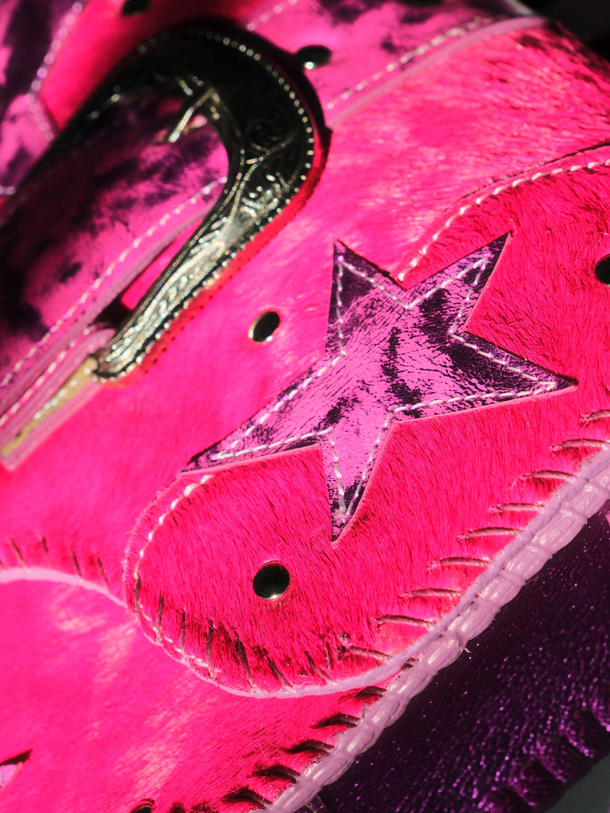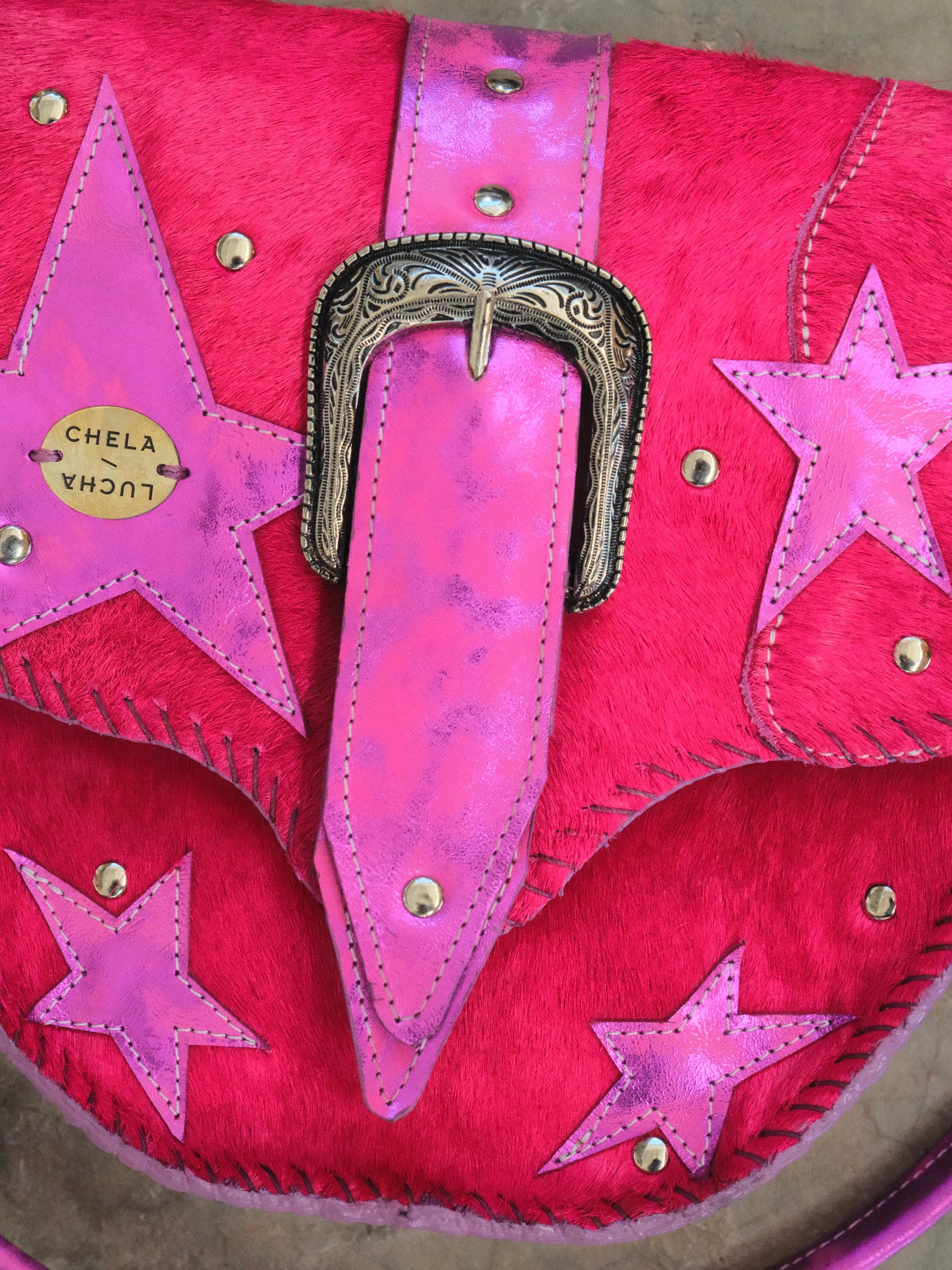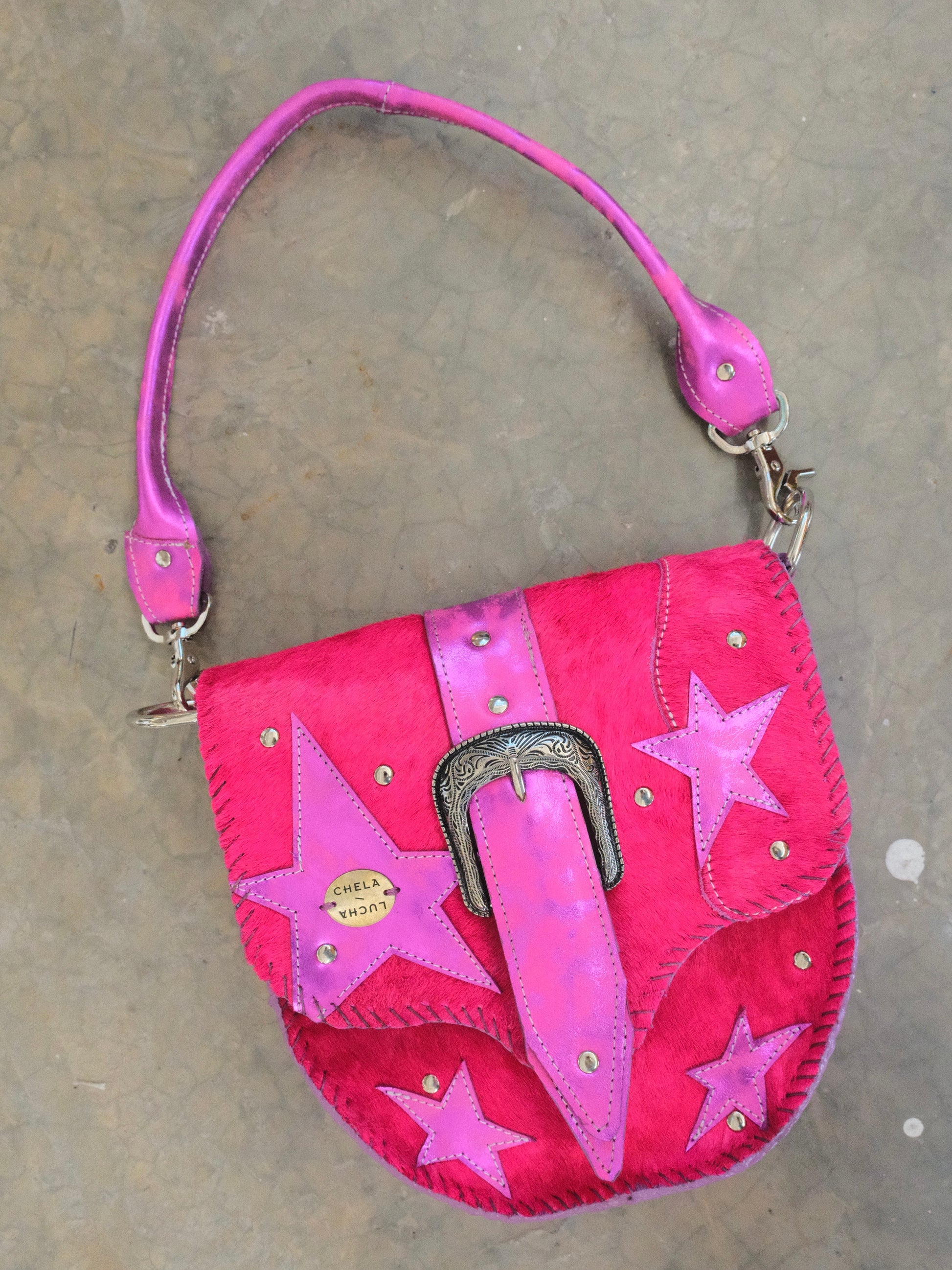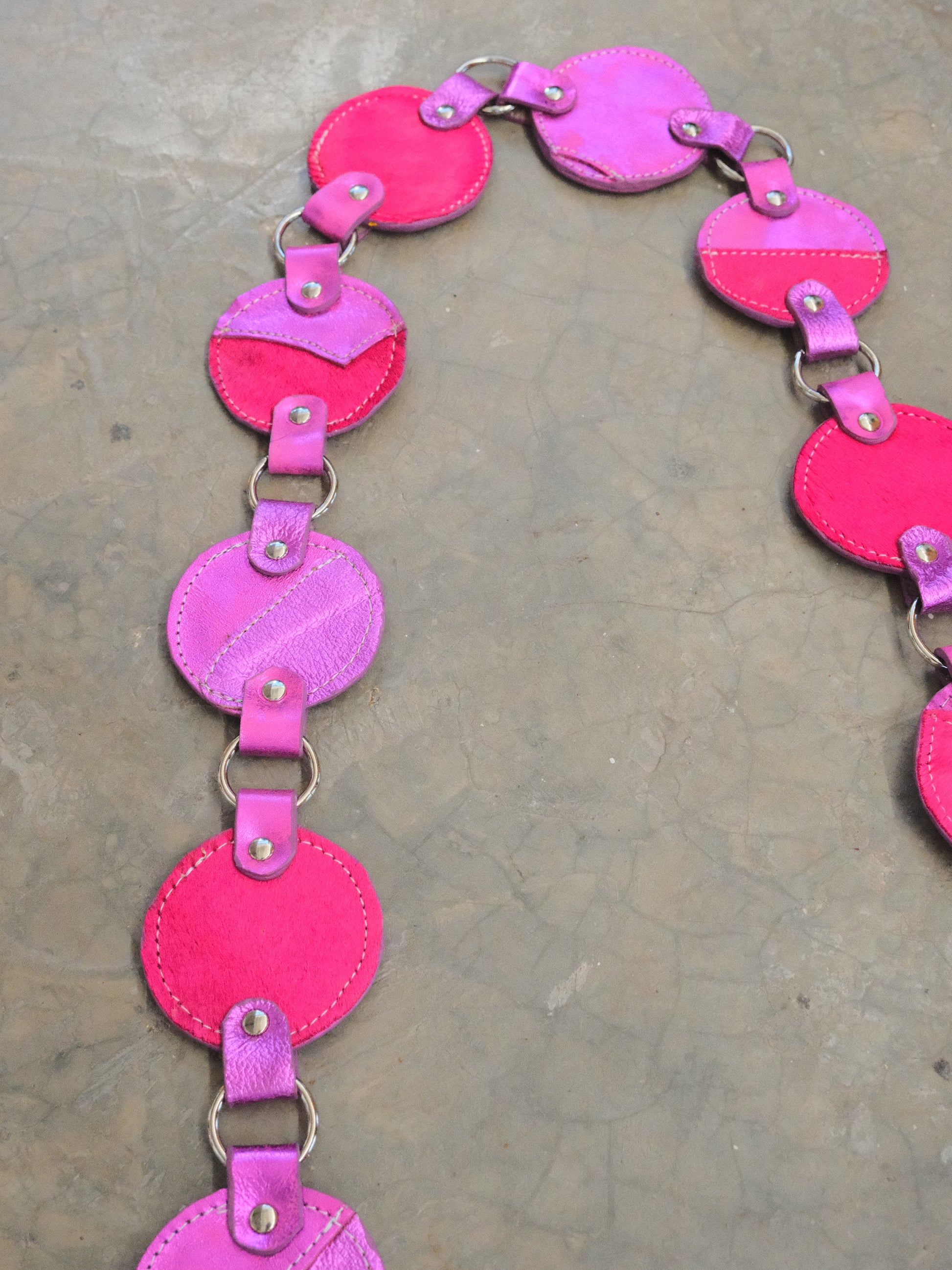 Bolsa LICHA hecha con pedacera de piel en tonos rosas. Detalles de hebilla y remaches en tono plateado.