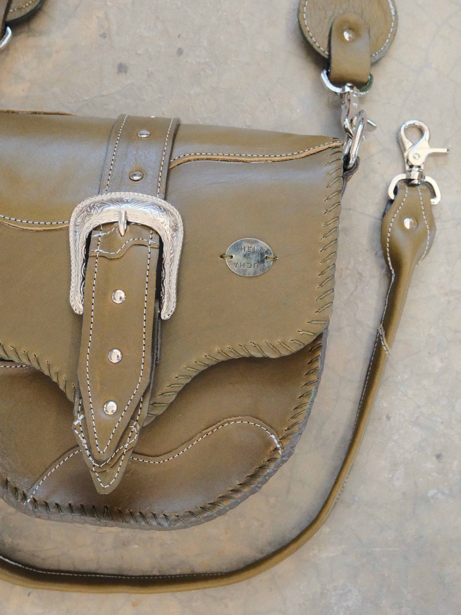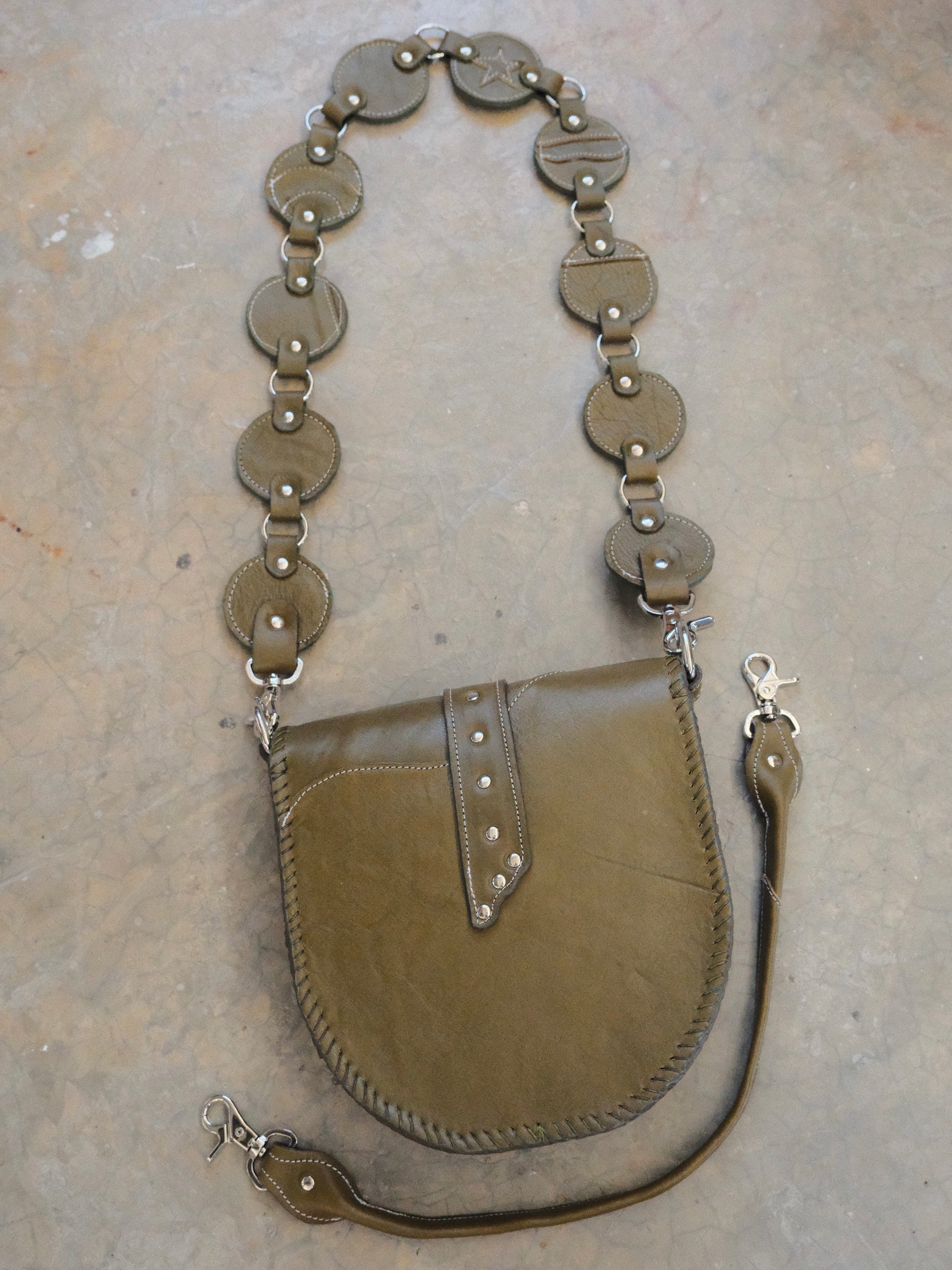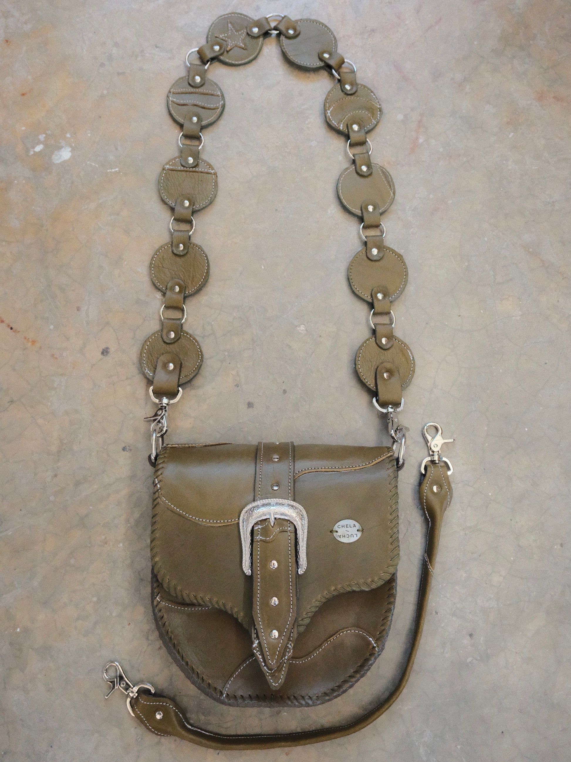 Bolsa LICHA hecha con pedacera de piel en tono verde olivo. Detalles de remaches y hebilla en tono plateado.