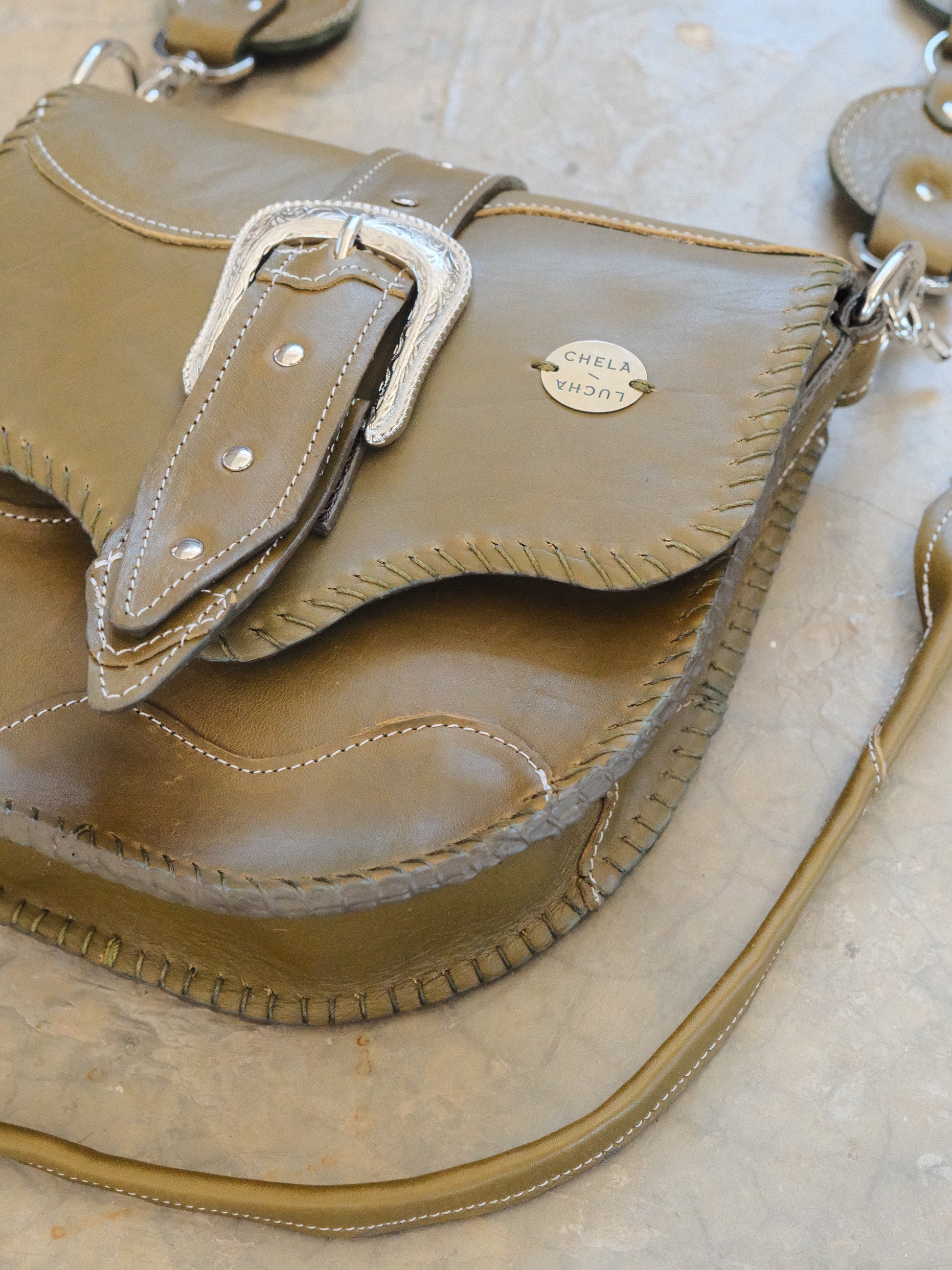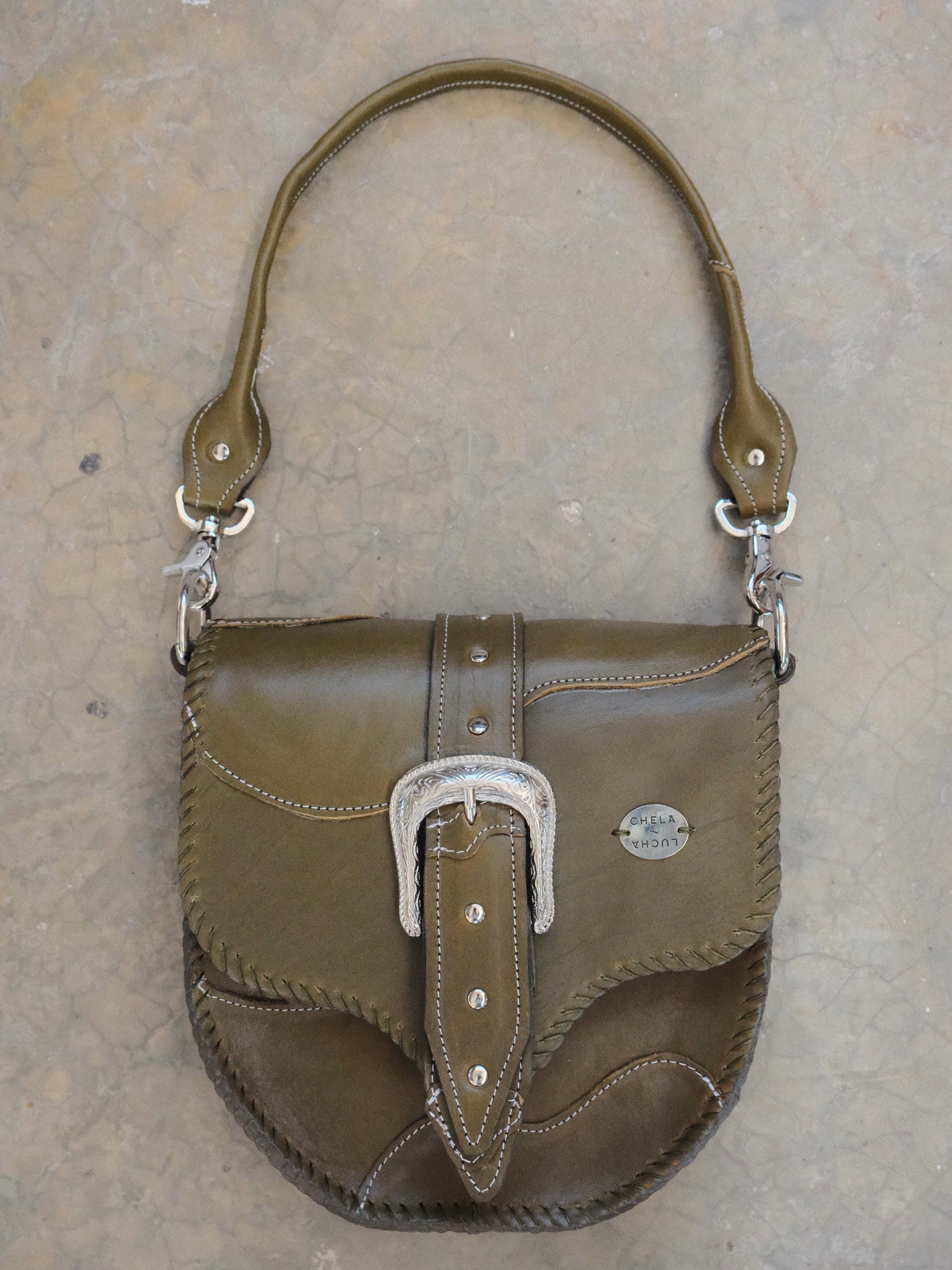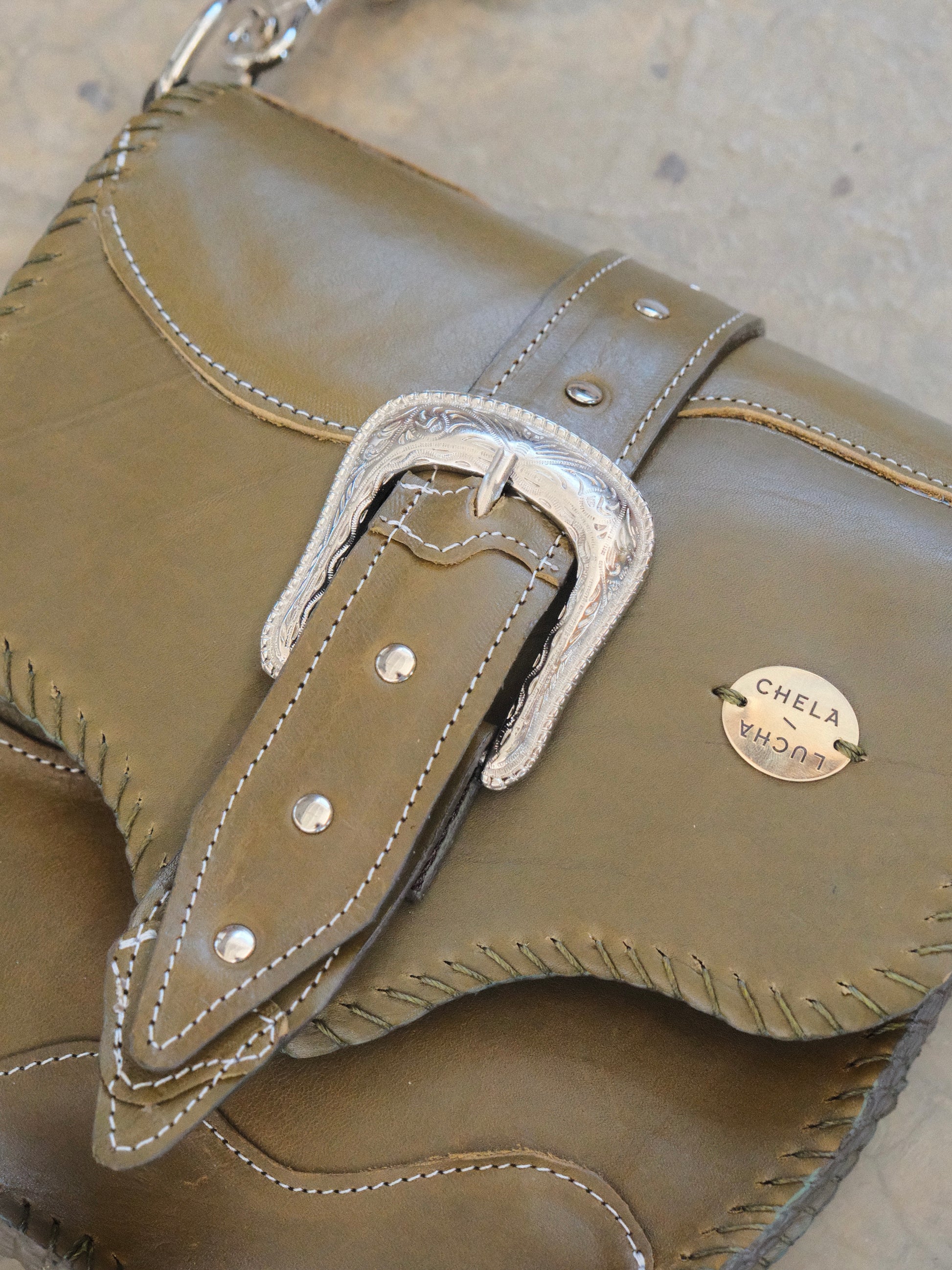 Bolsa LICHA hecha con pedacera de piel en tono verde olivo. Detalles de remaches y hebilla en tono plateado.
