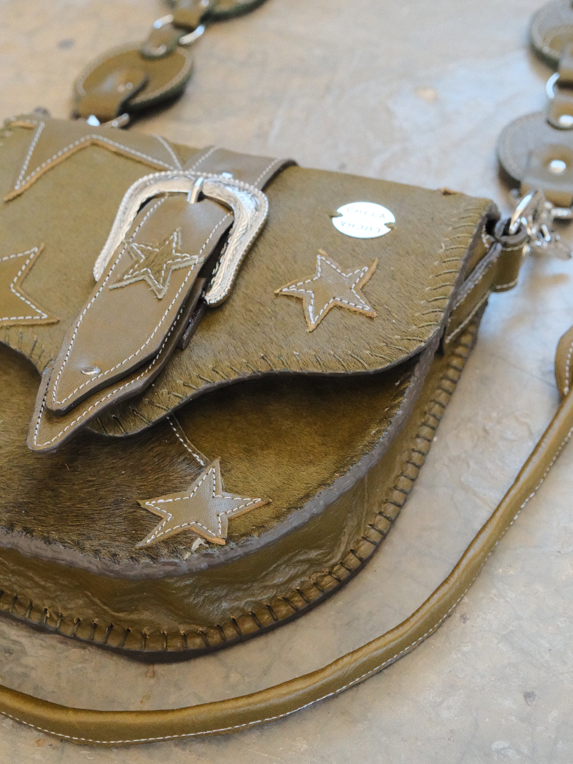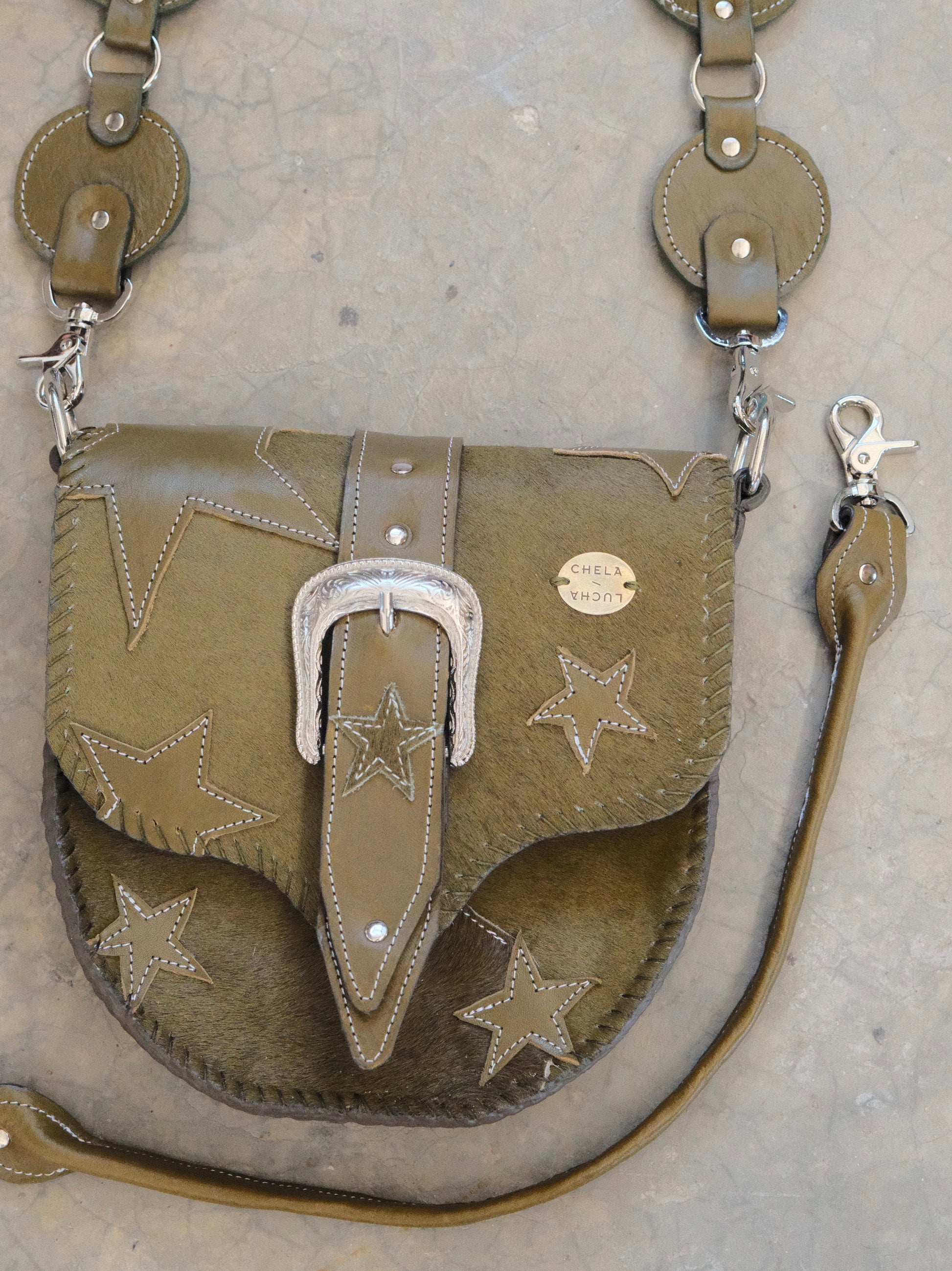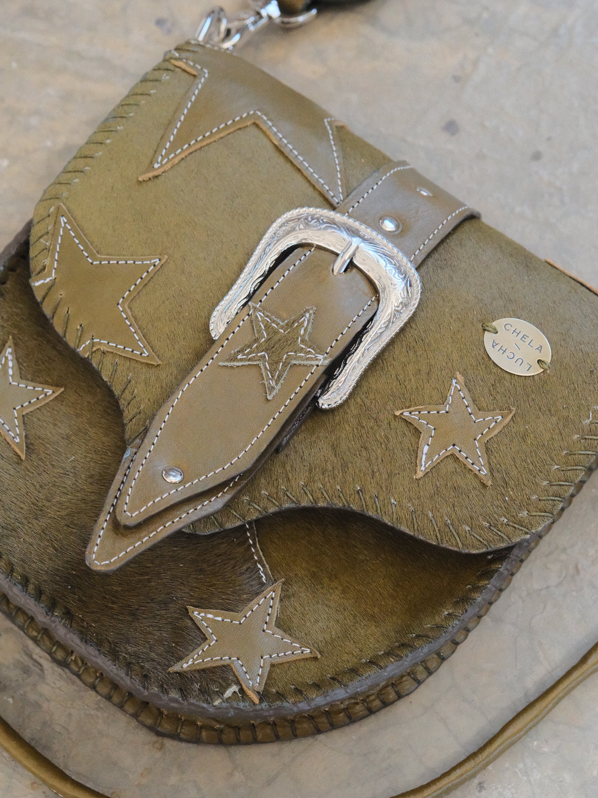 Bolsa LICHA hecha con pedacera de piel de textura de pelito en tono verde olivo. Detalles de remaches y hebilla en tono plateado.