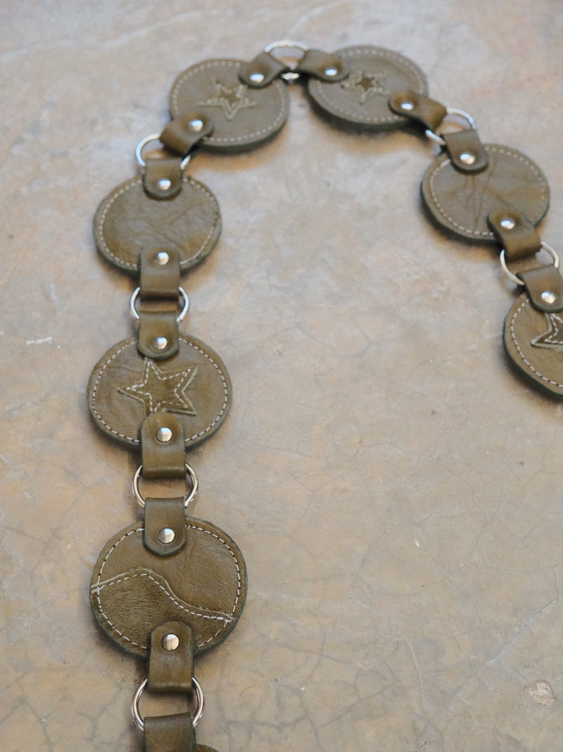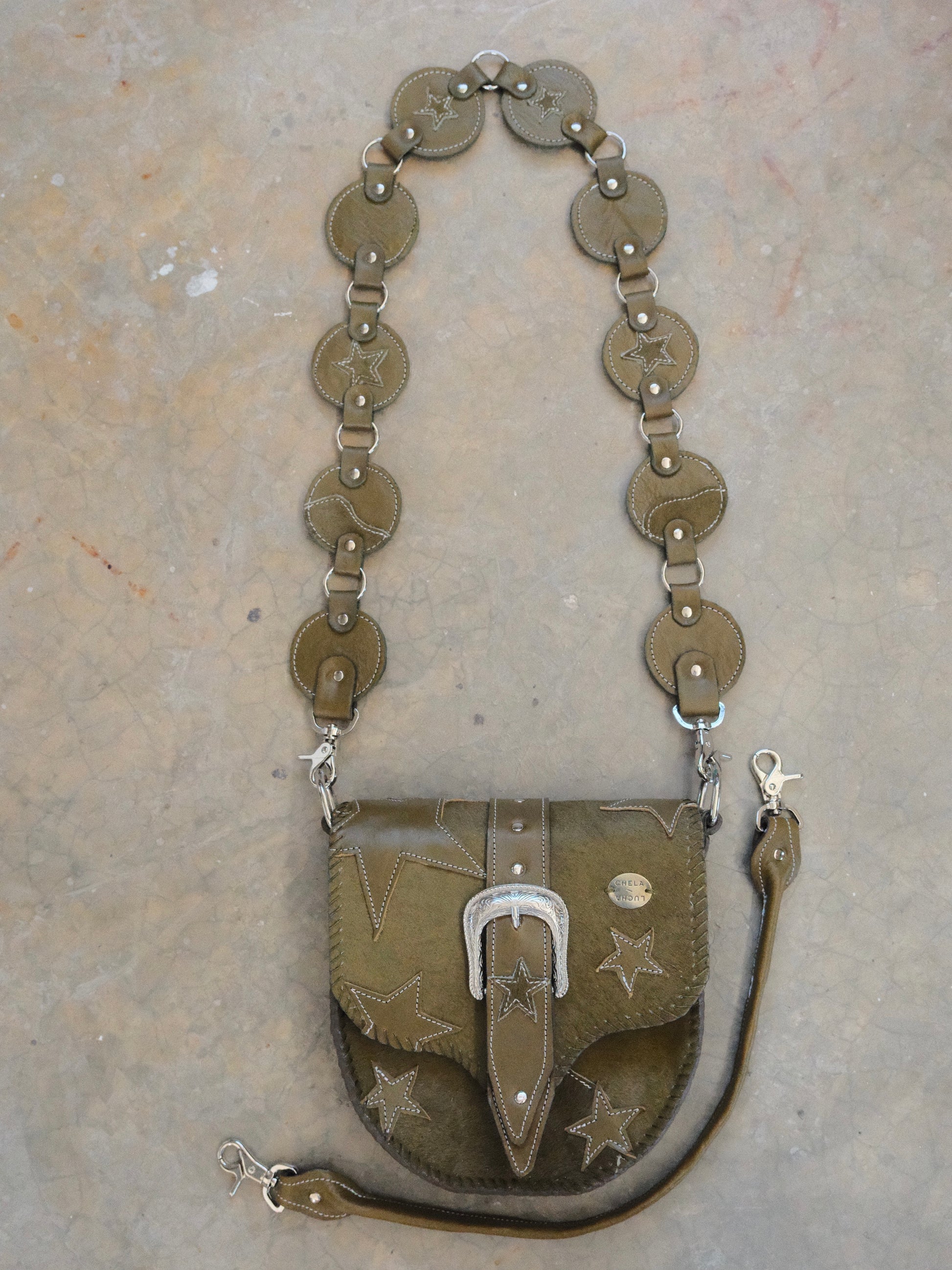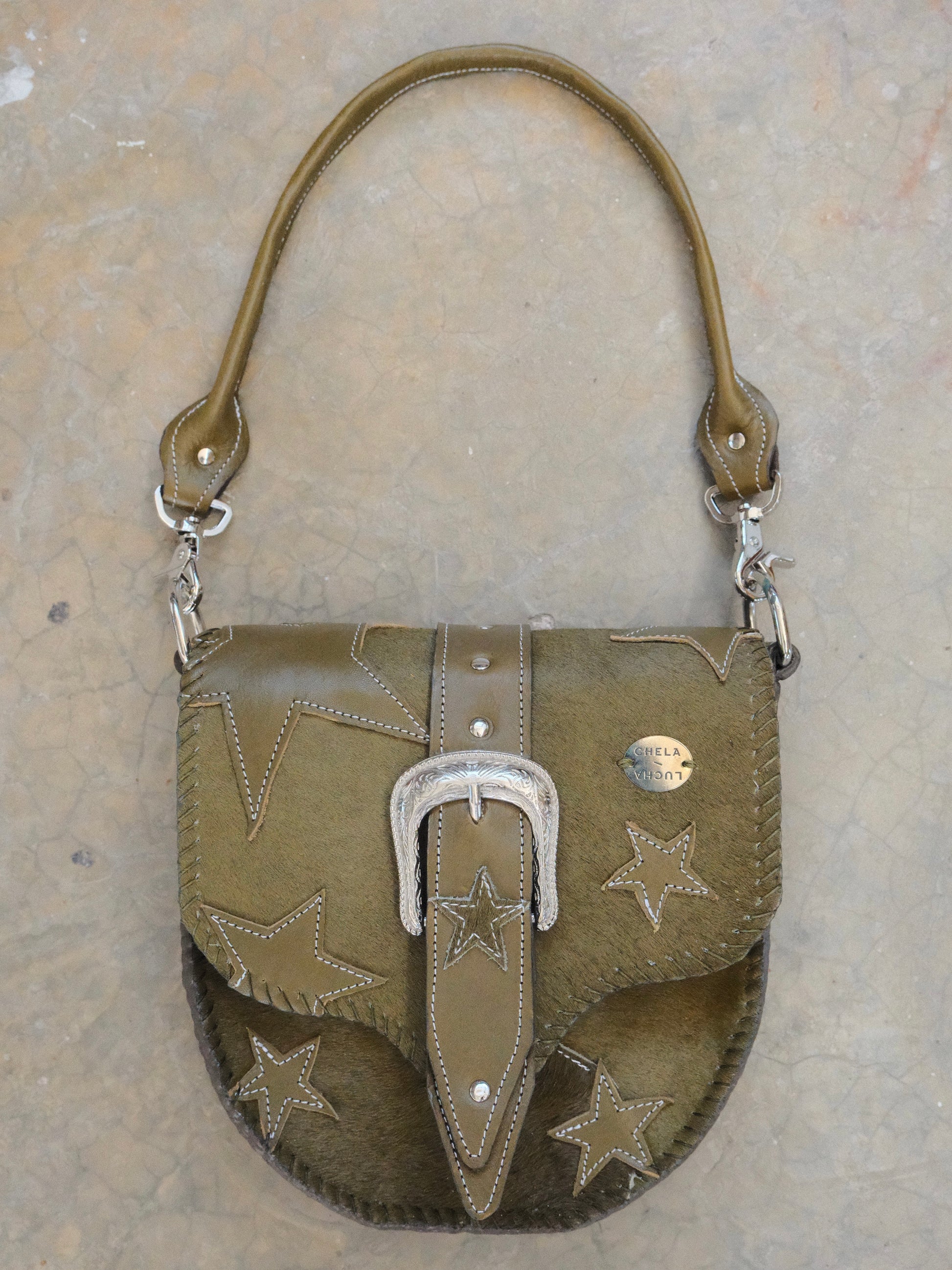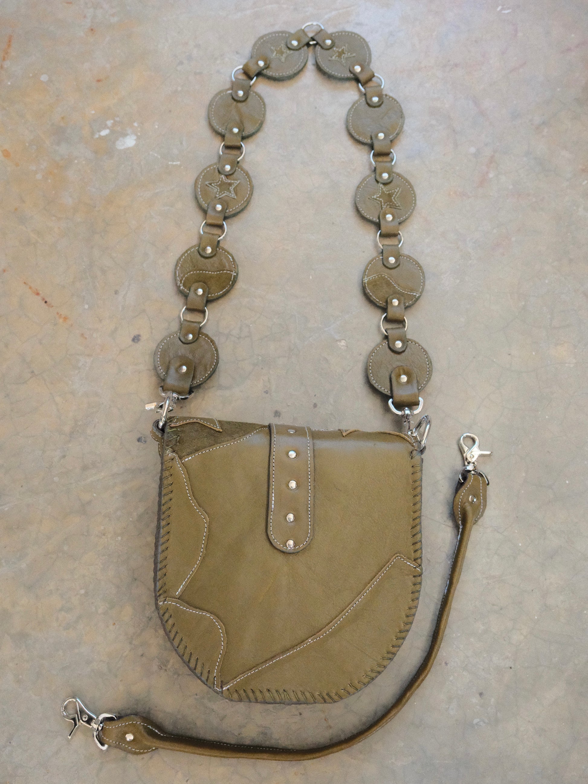 Bolsa LICHA hecha con pedacera de piel de textura de pelito en tono verde olivo. Detalles de remaches y hebilla en tono plateado.