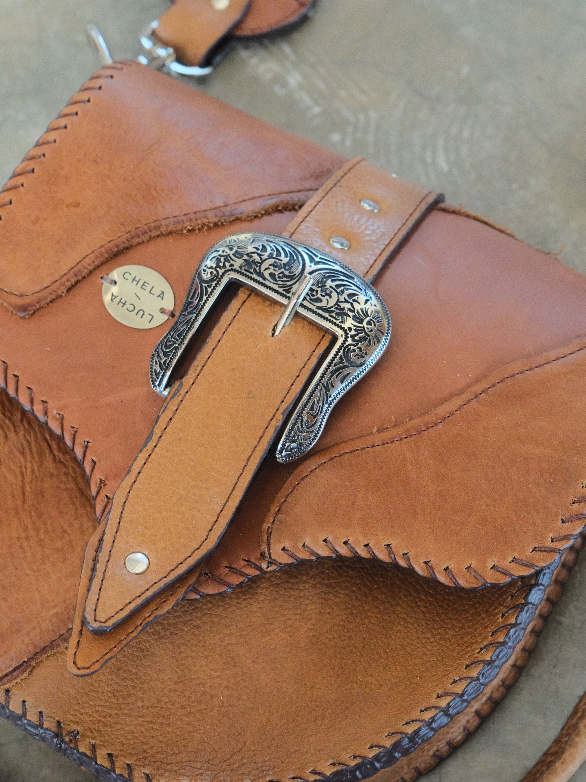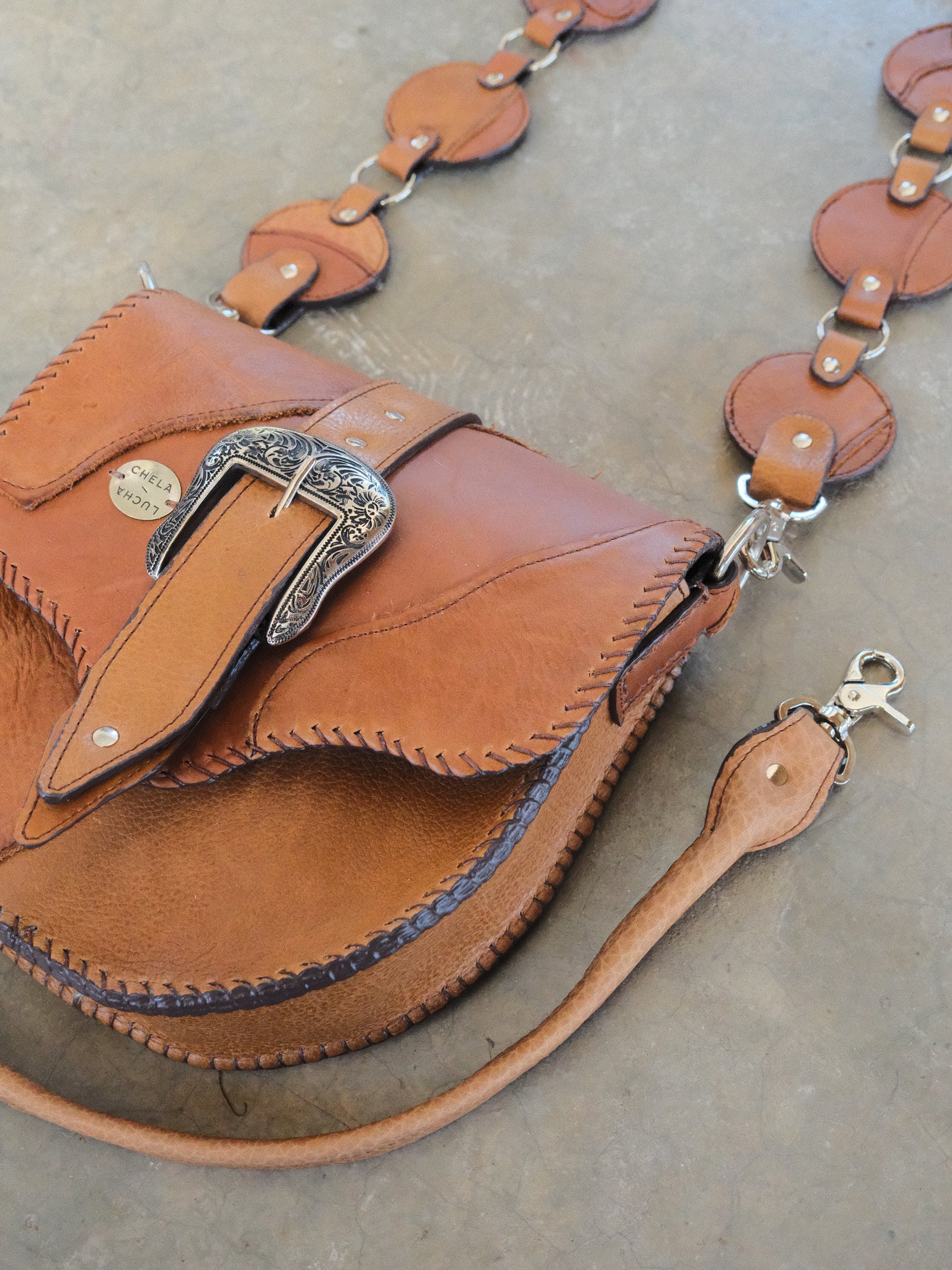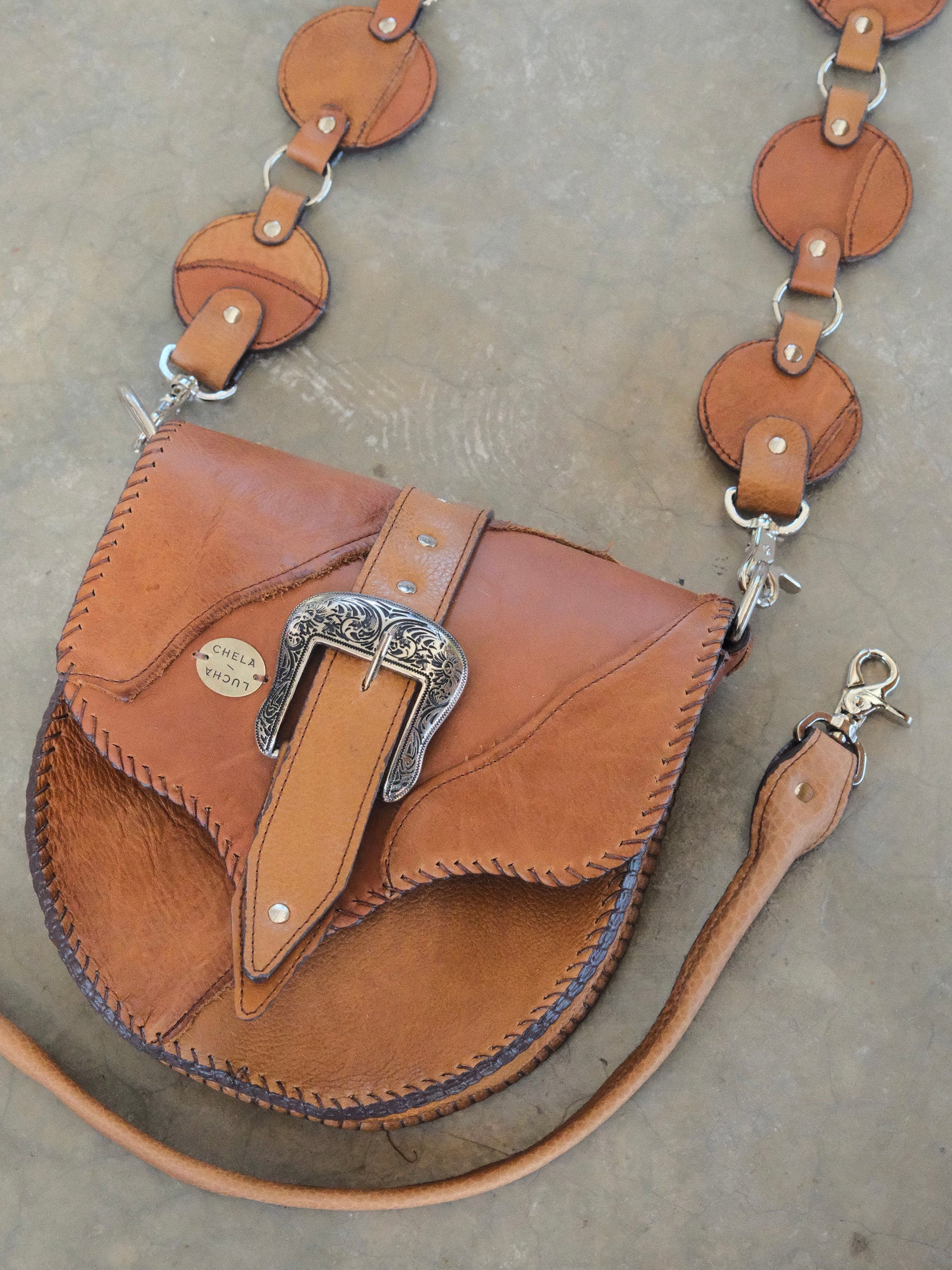 Bolsa LICHA hecha con pedacera de piel en tono café. Detalles de hebilla y remaches en tono plateado.