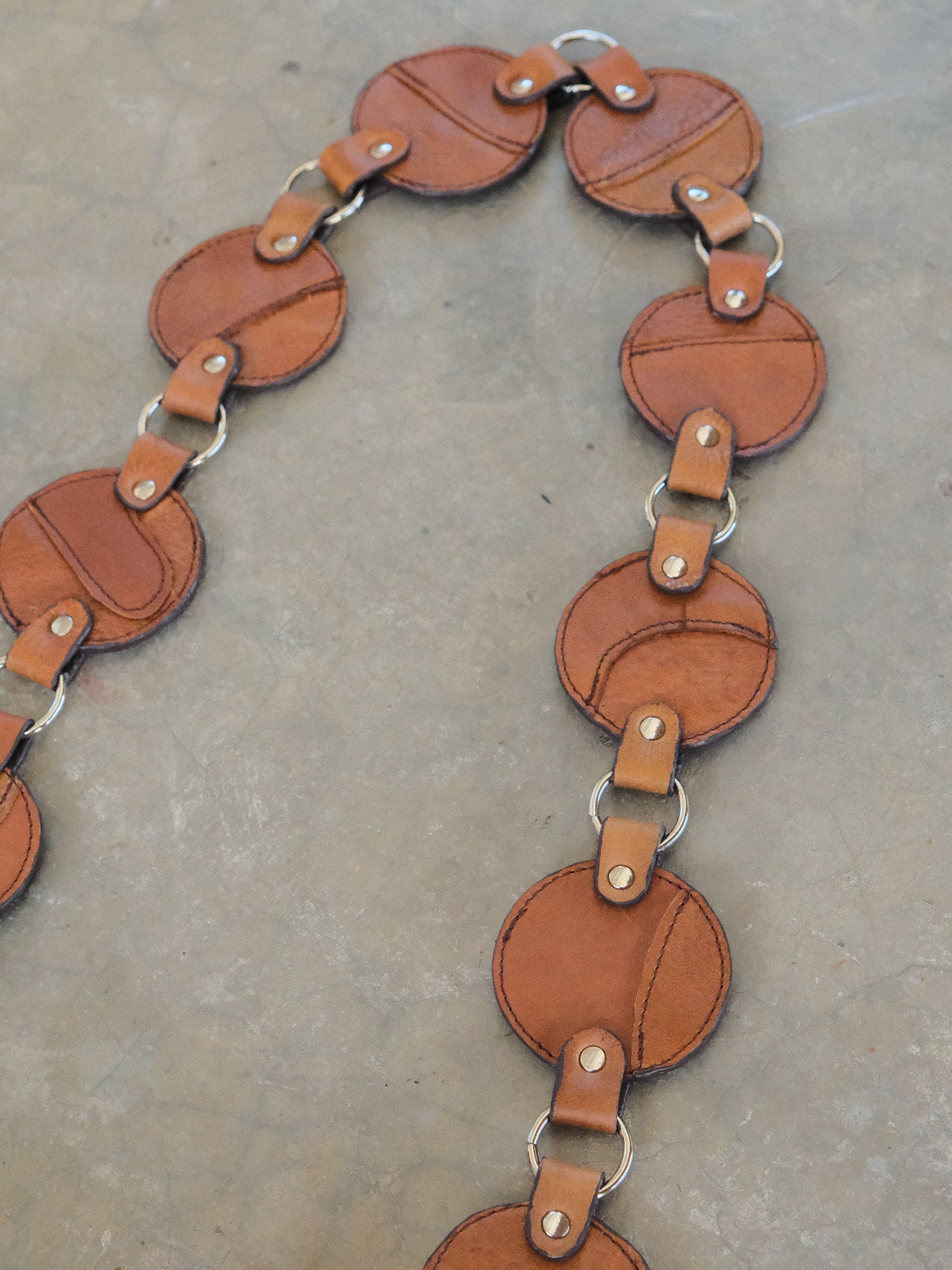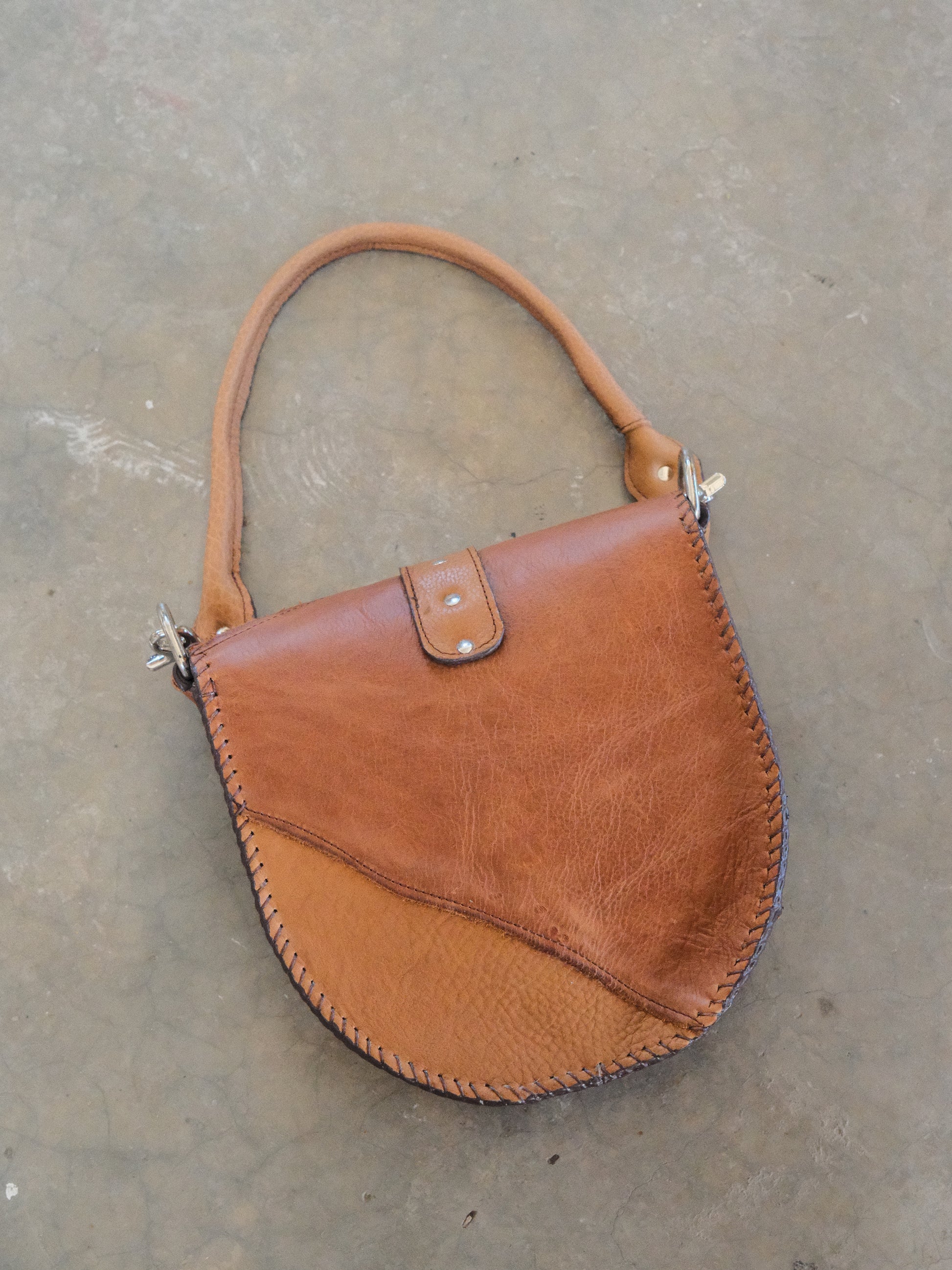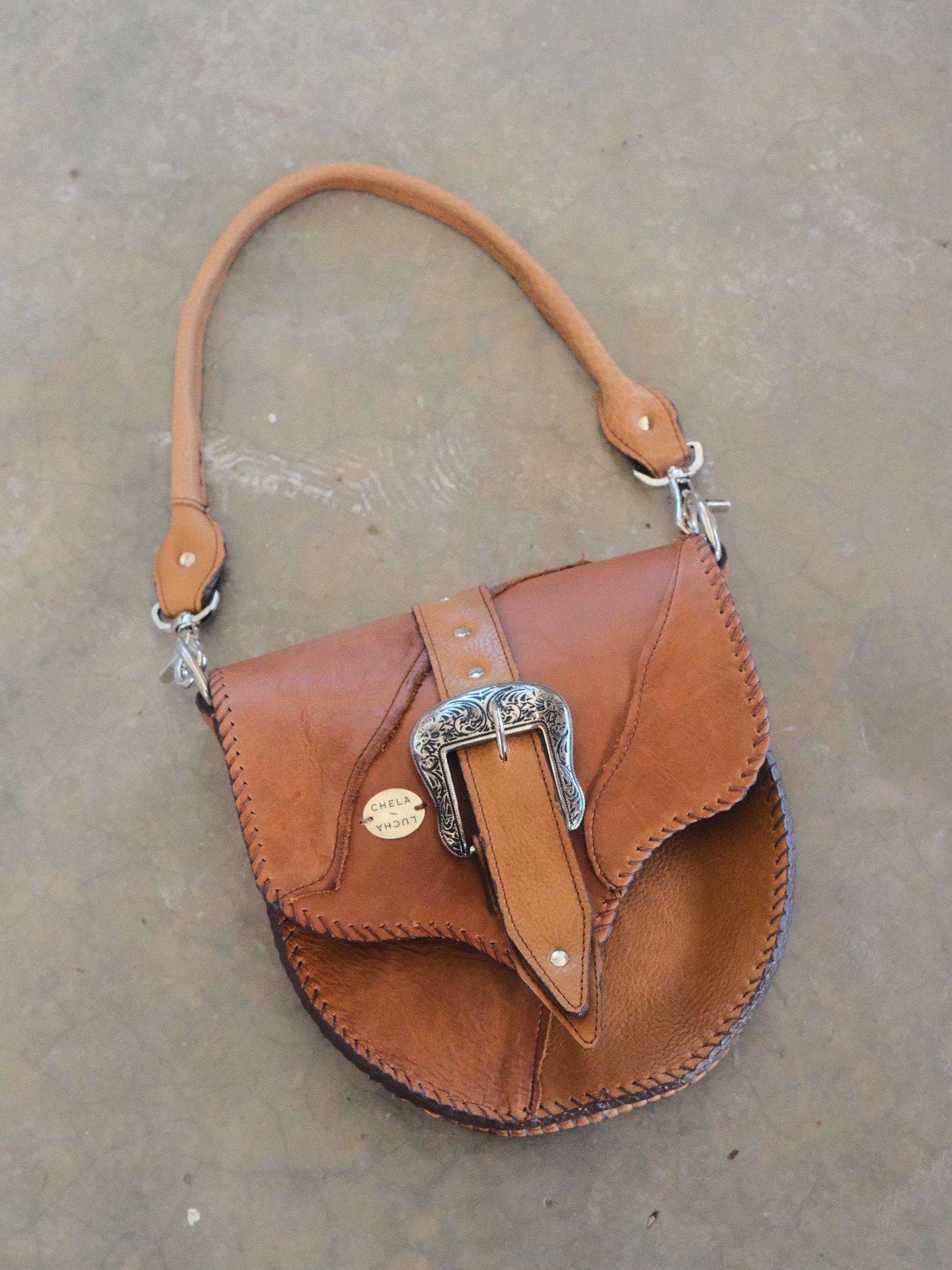 Bolsa LICHA hecha con pedacera de piel en tono café. Detalles de hebilla y remaches en tono plateado.