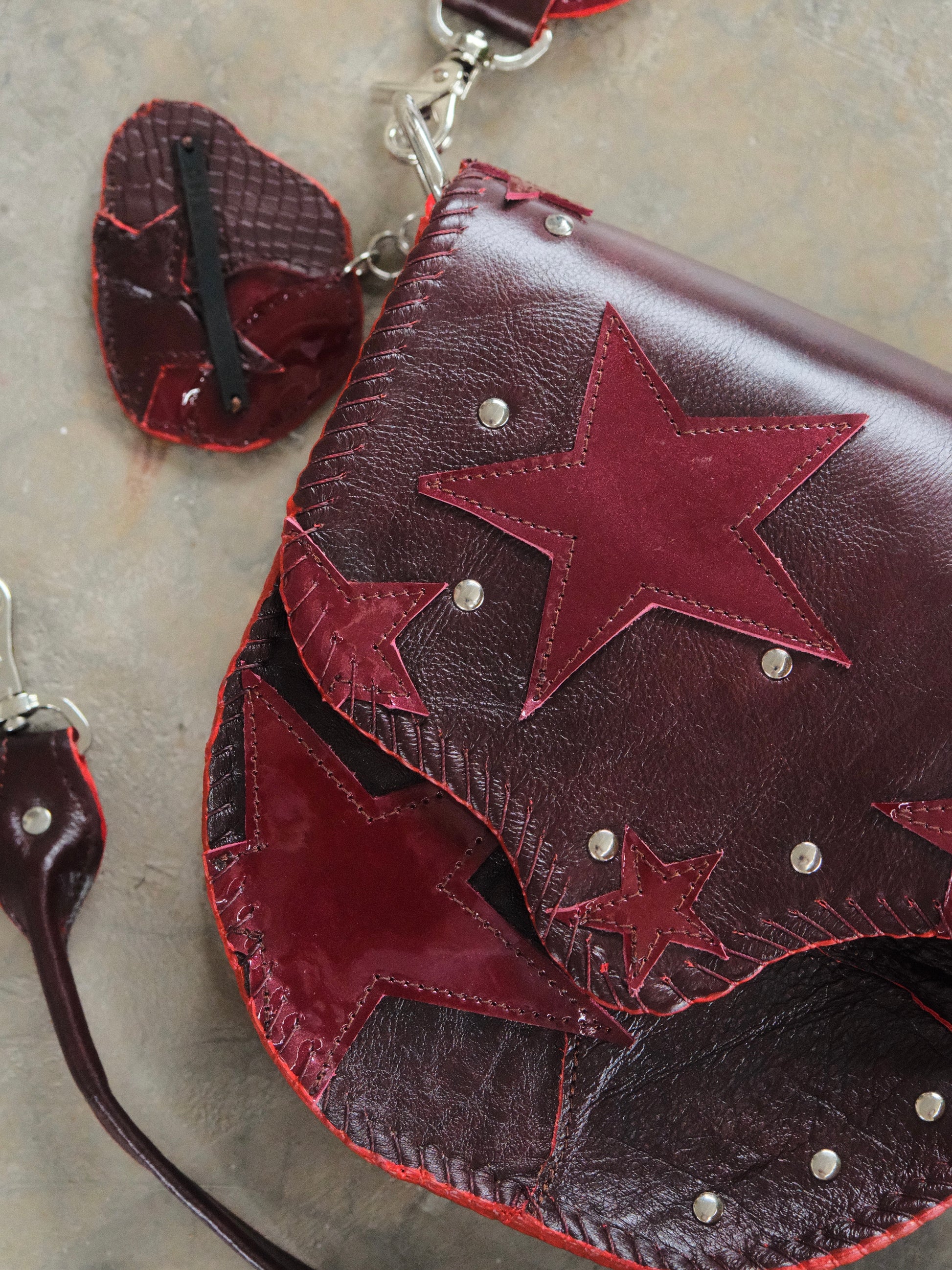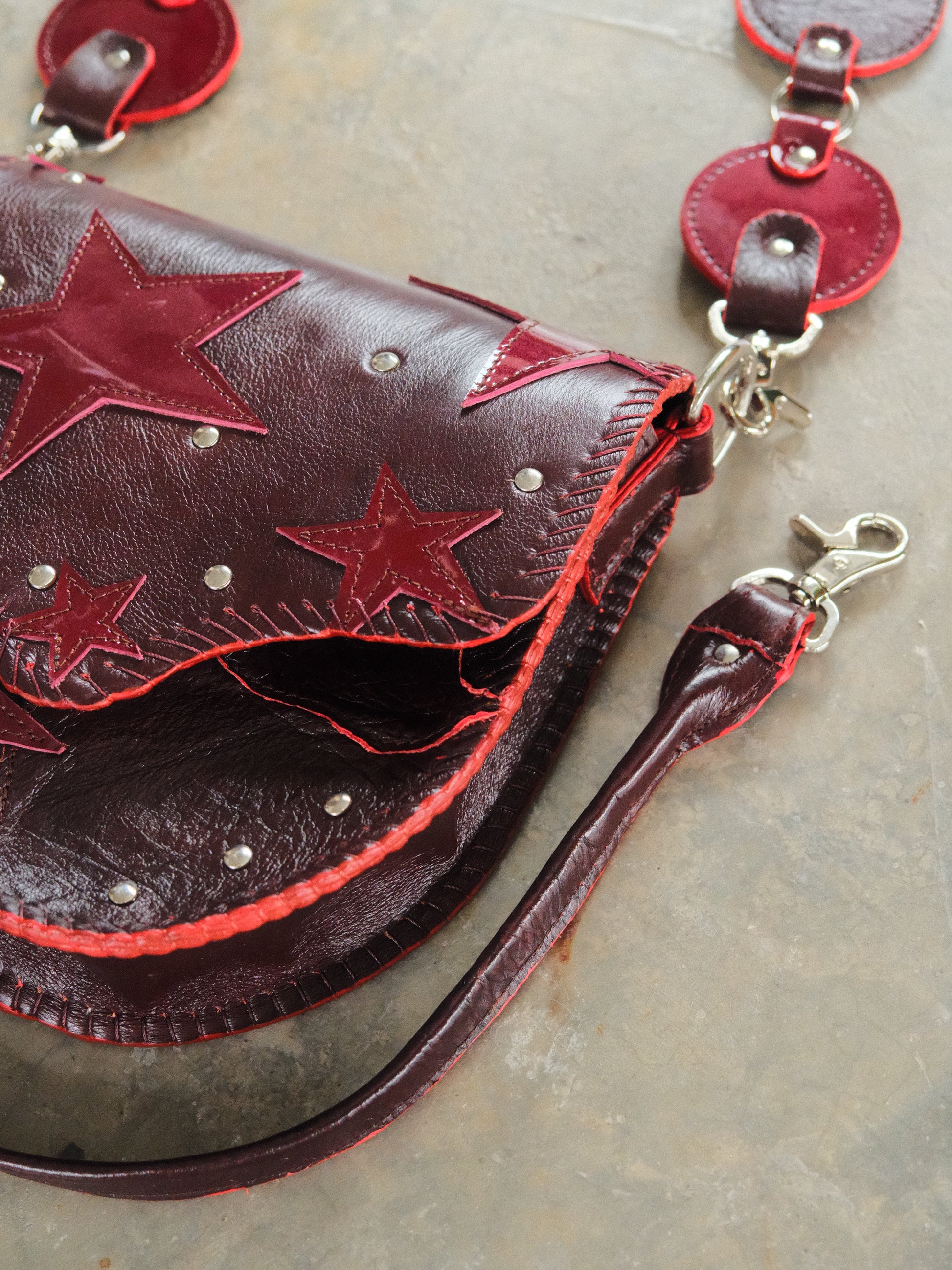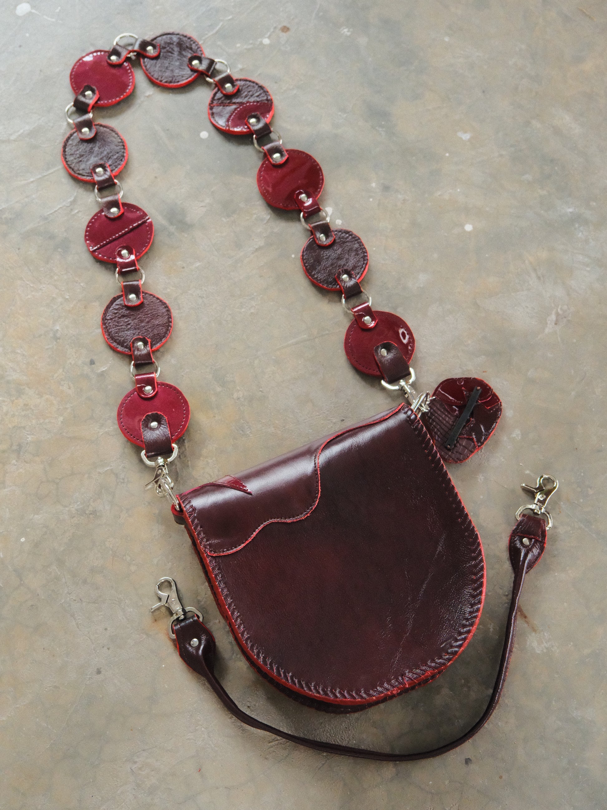 Bolsa LICHA hecha con pedacera de piel en tonos tinto. Detalles de remaches en tono plateado.