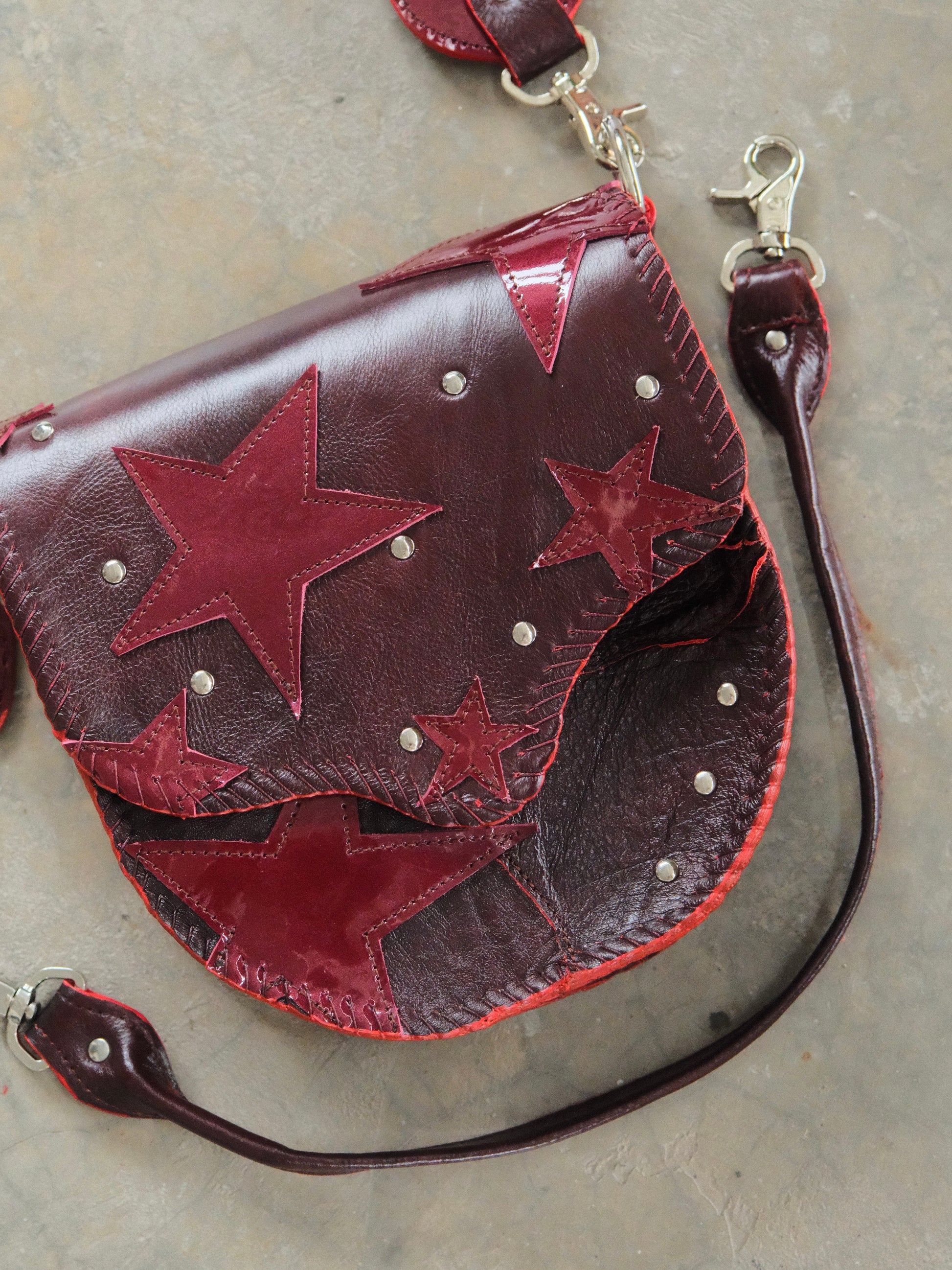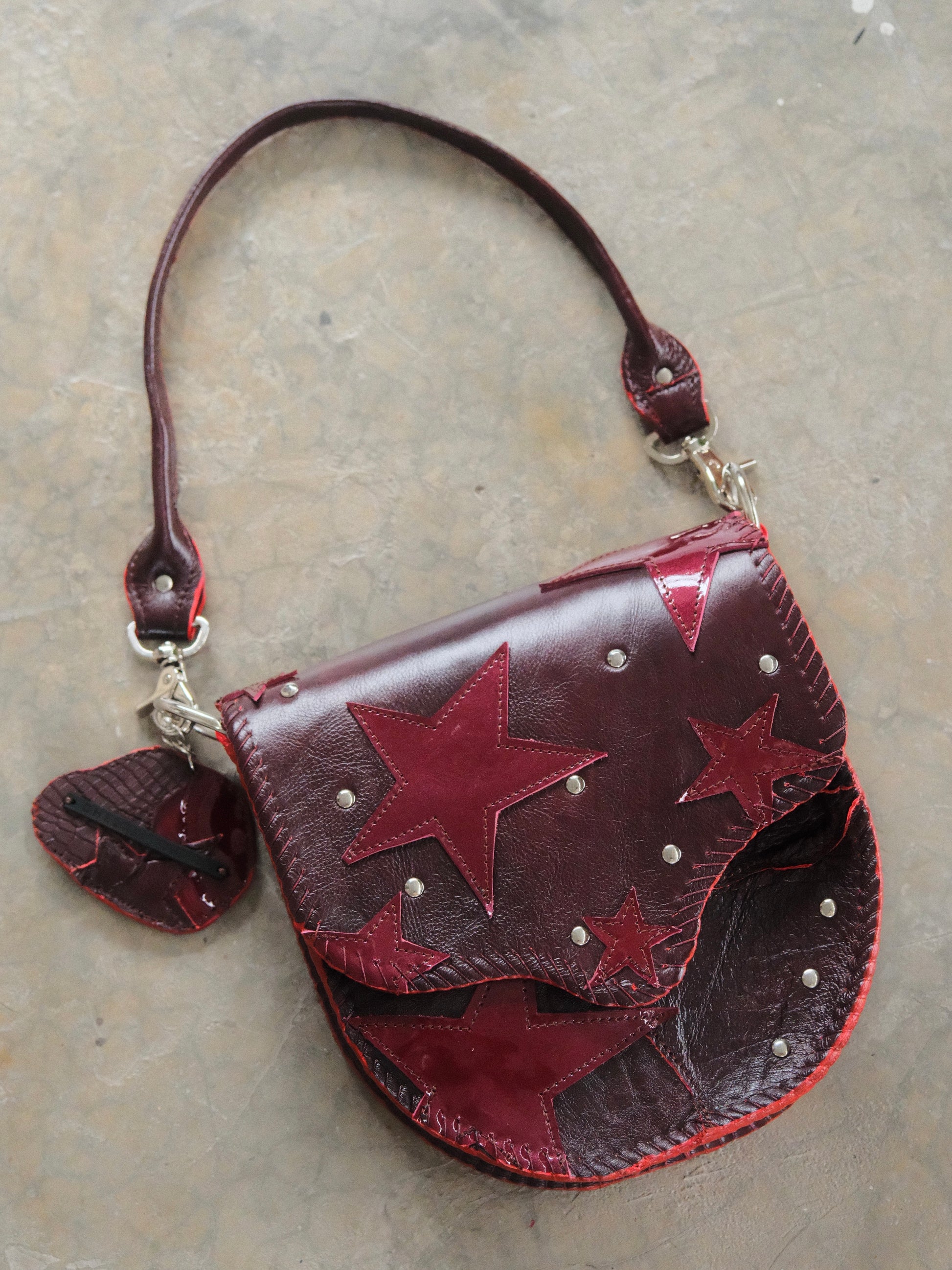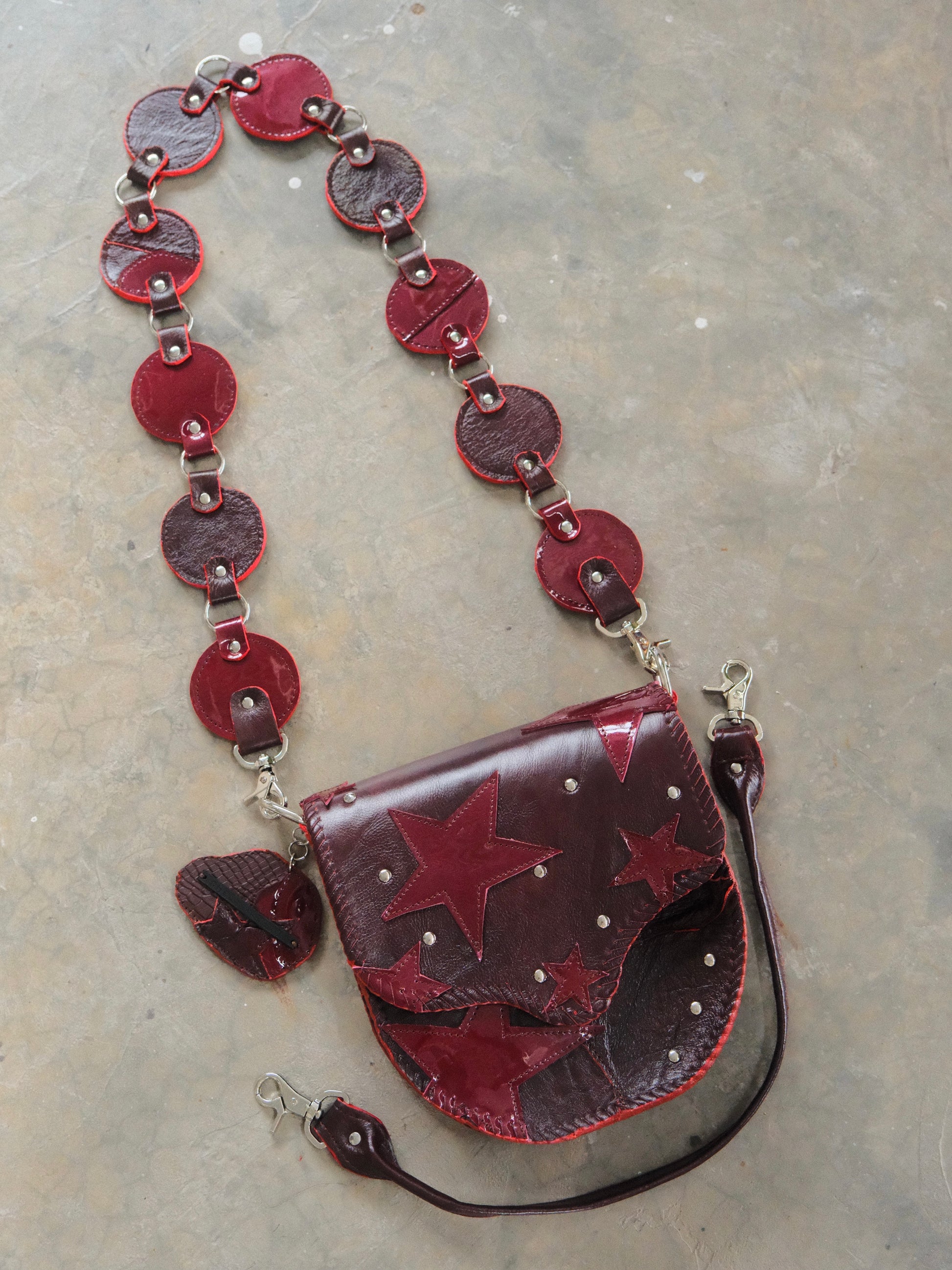 Bolsa LICHA hecha con pedacera de piel en tonos tinto. Detalles de remaches en tono plateado.