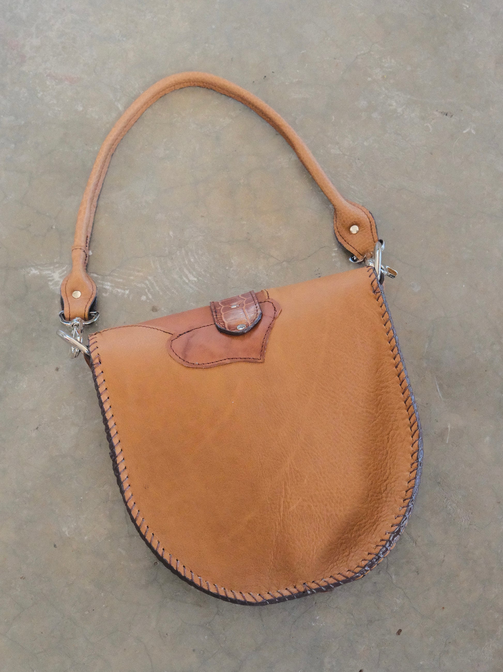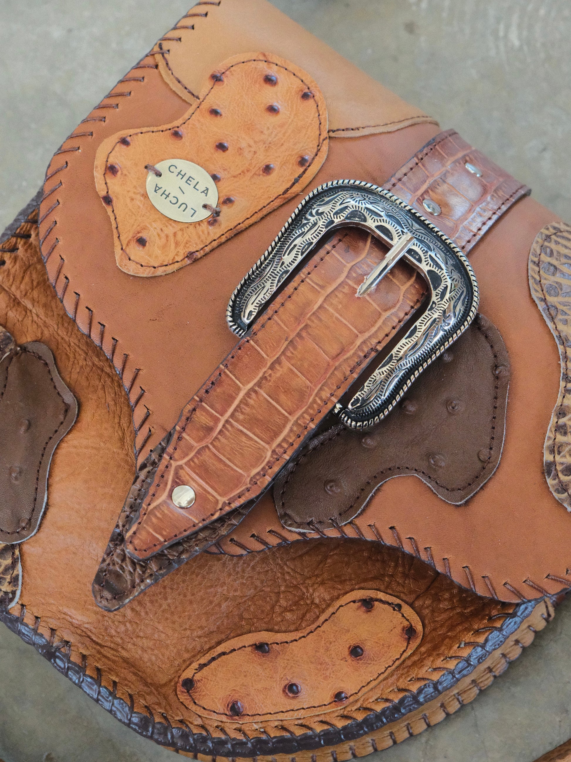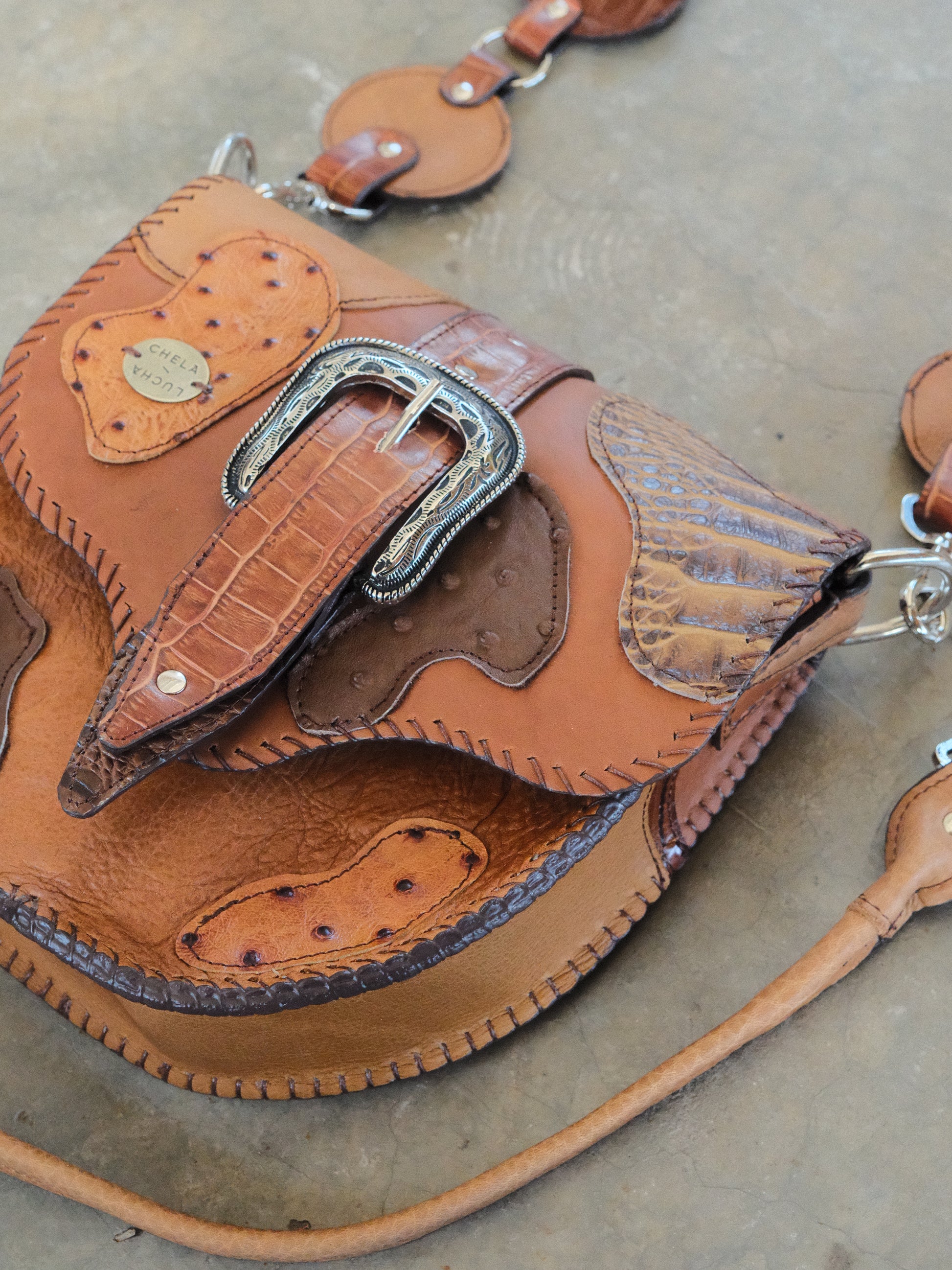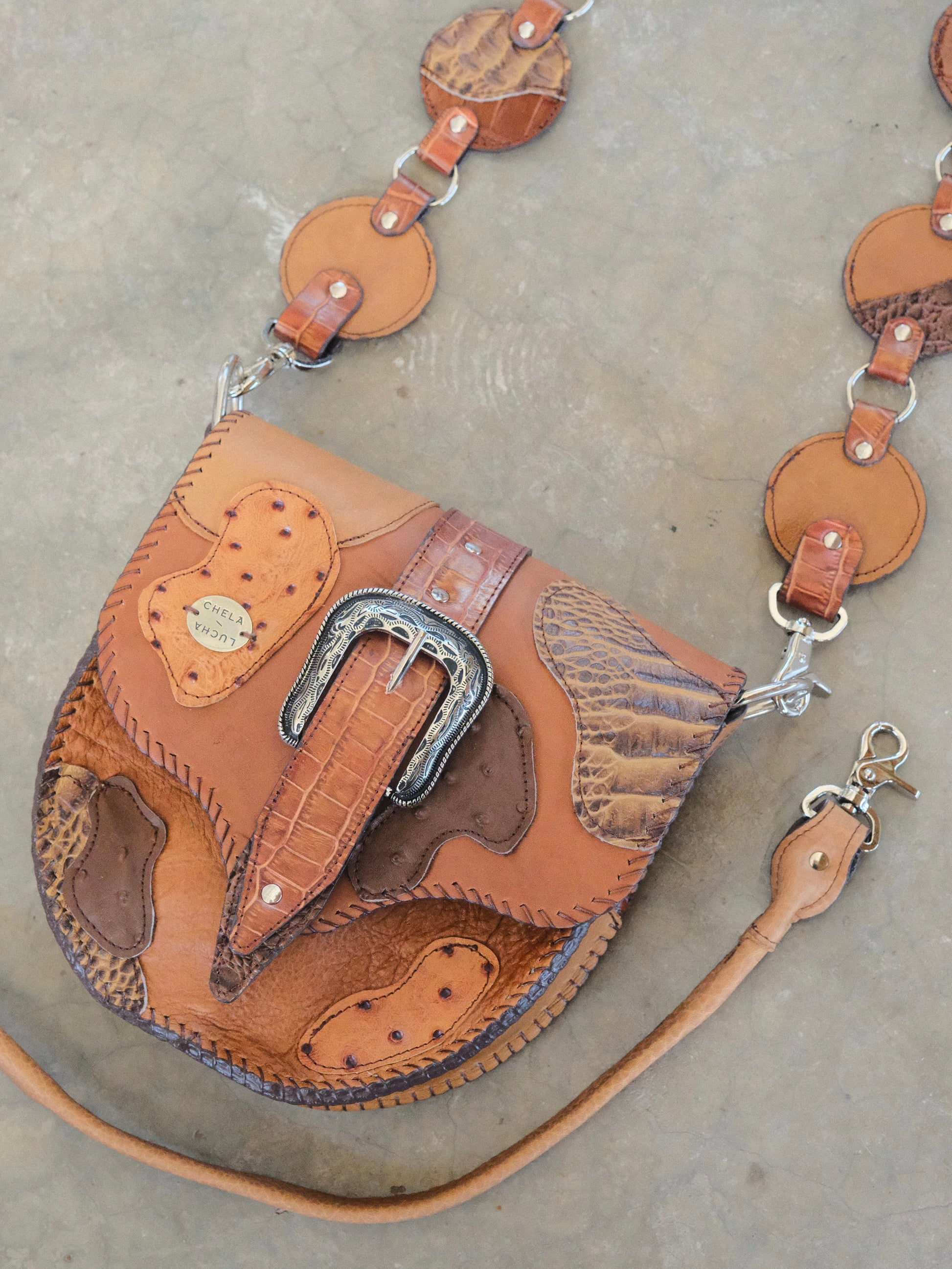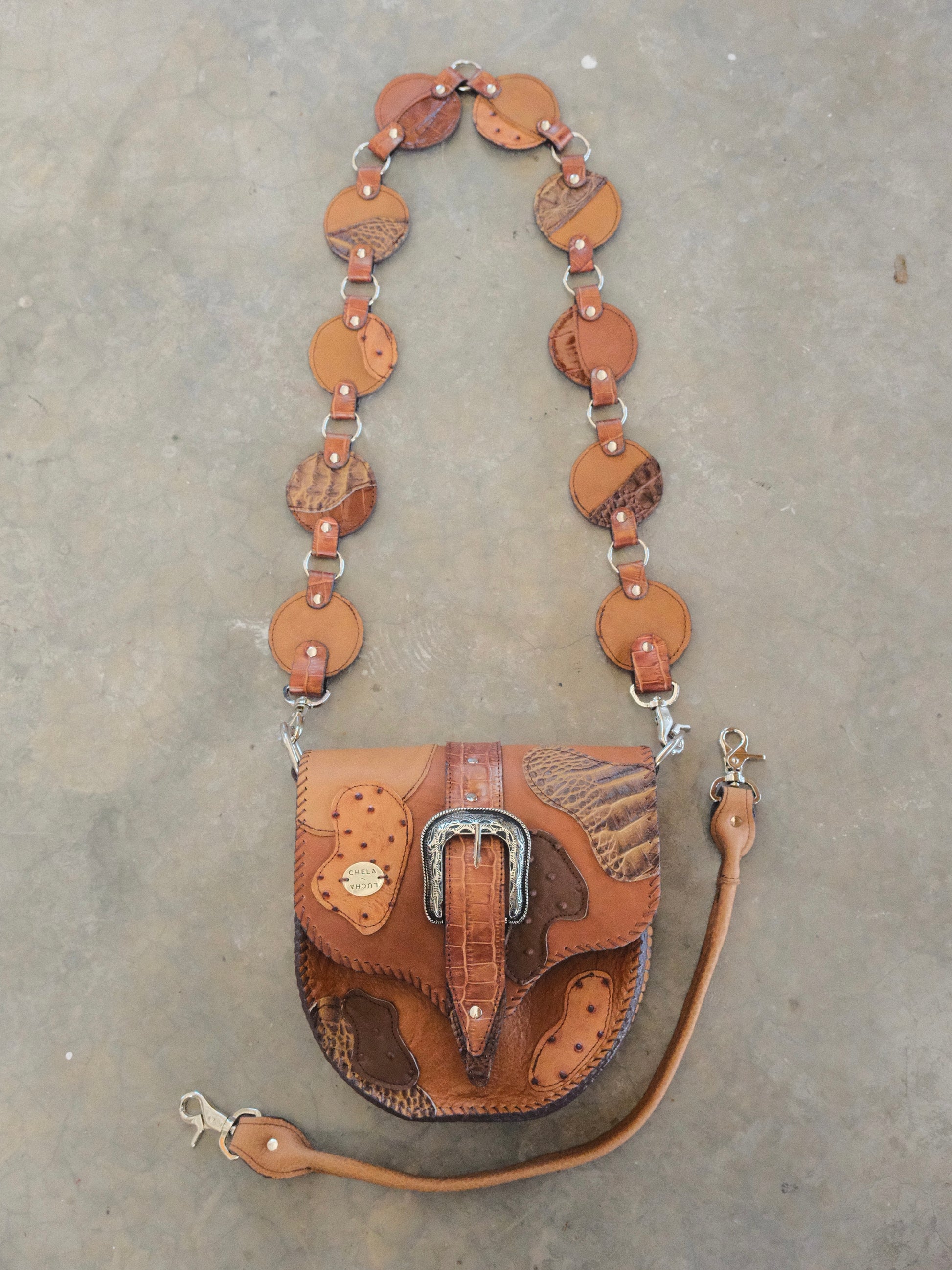Bolsa LICHA hecha con pedacera de piel en tonos café con texturas imitación cocodrilo, serpiente, etc. Detalles de hebilla y remaches en tono plateado.