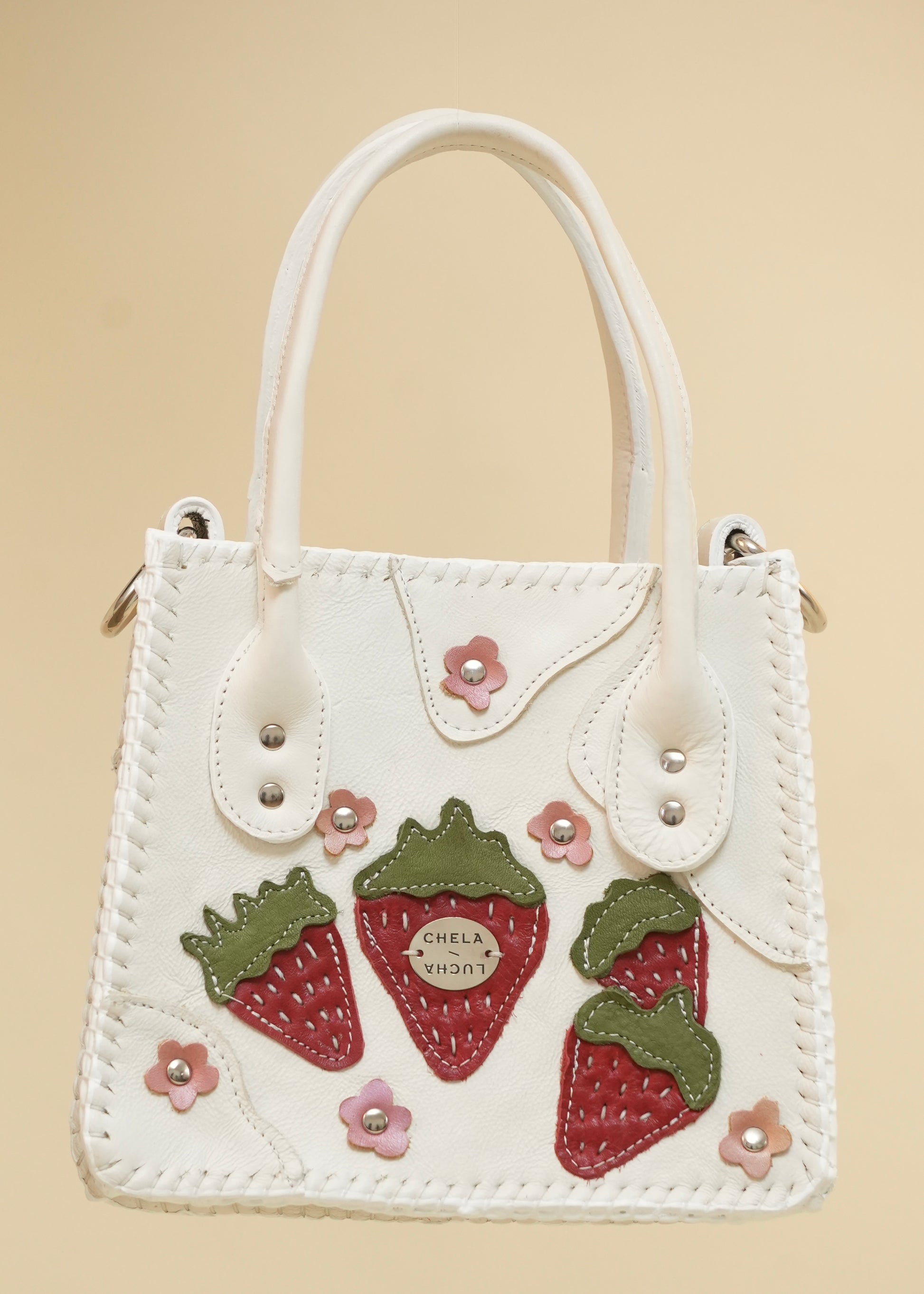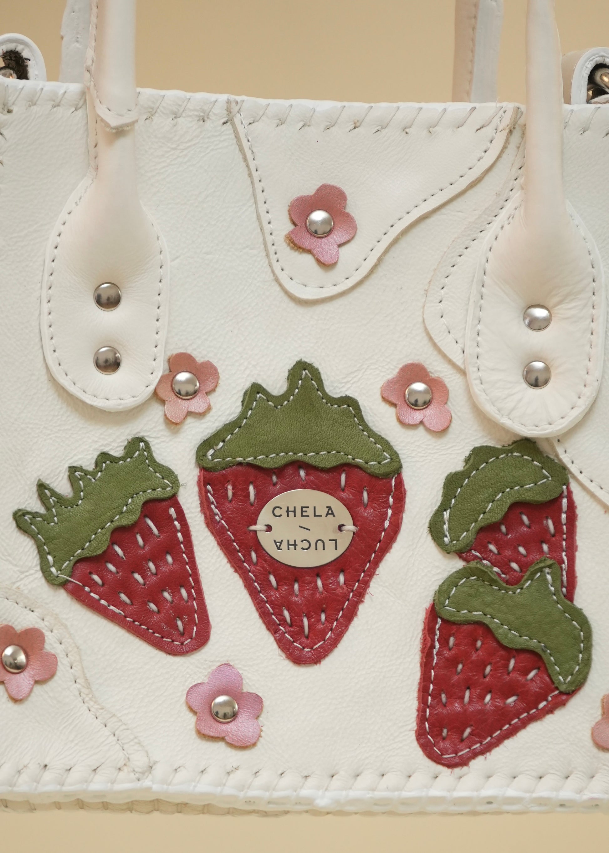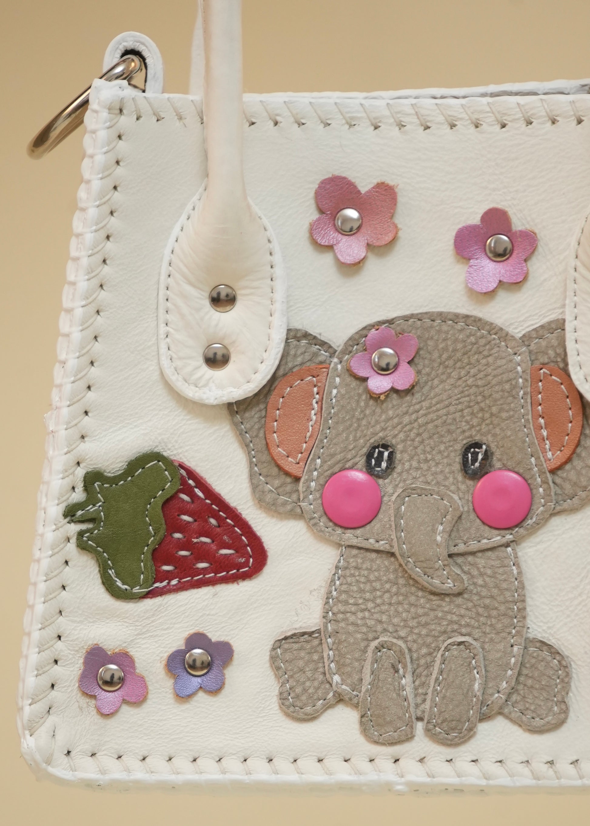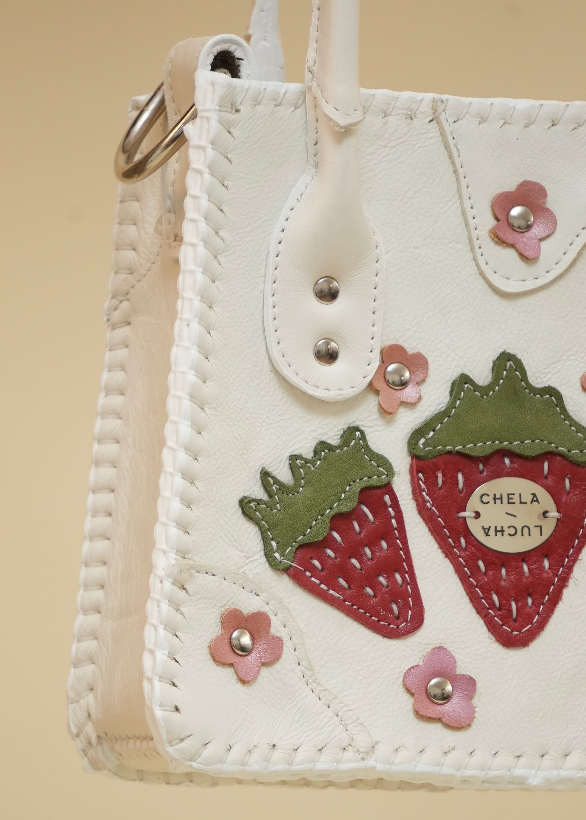Hecha con pedacera de piel en tonos variados, detalles de remaches plateados y puntadas a mano.