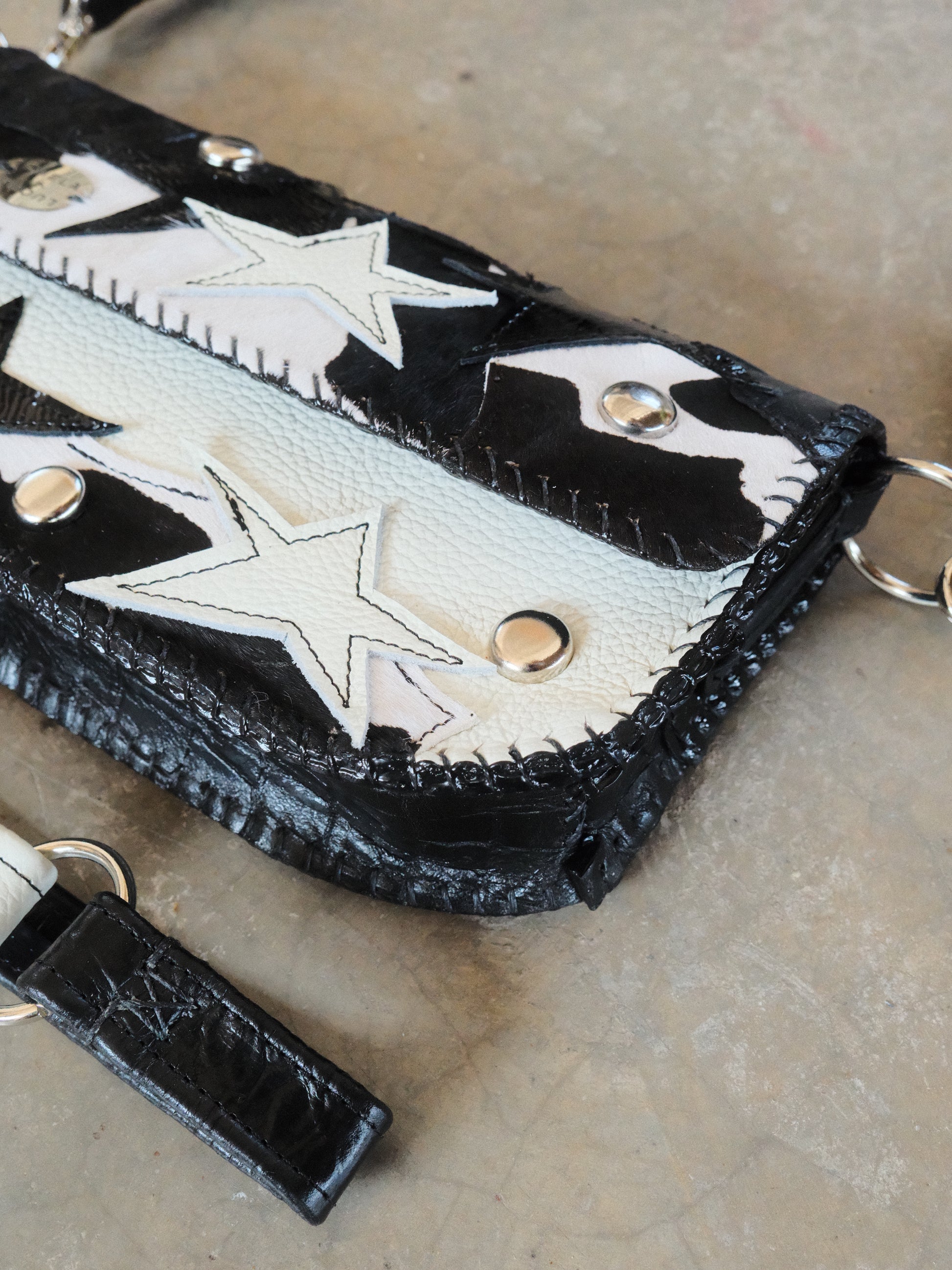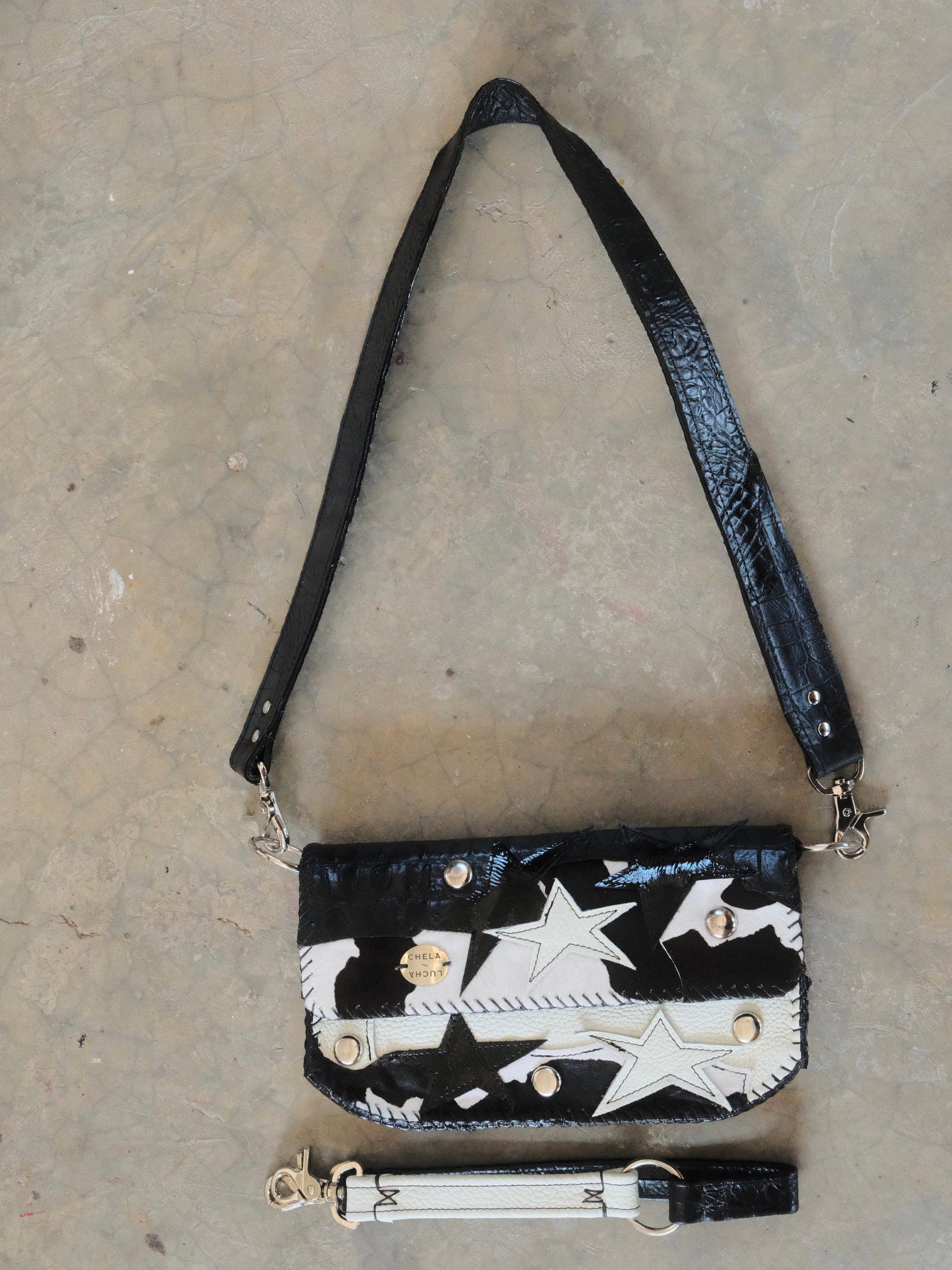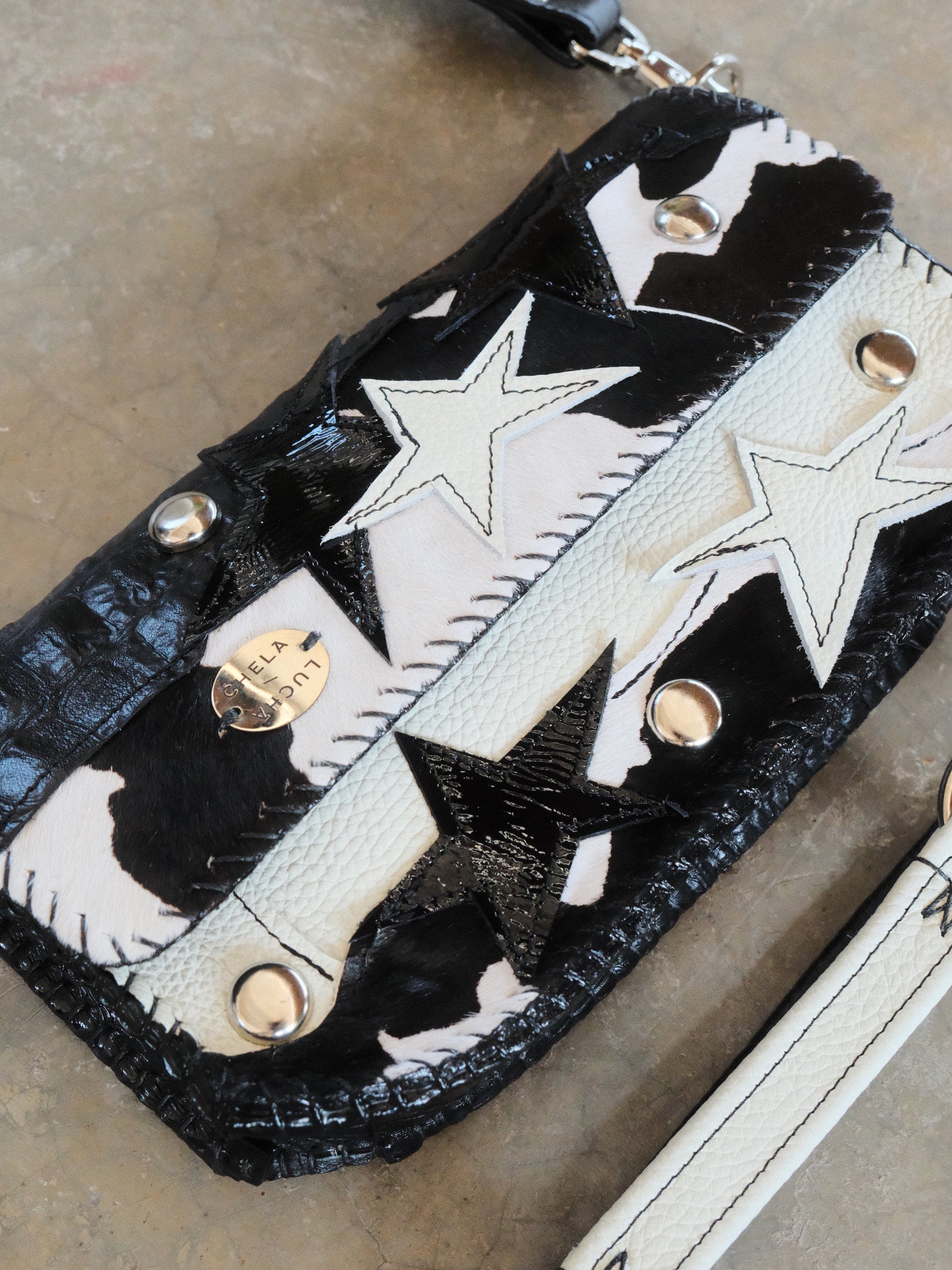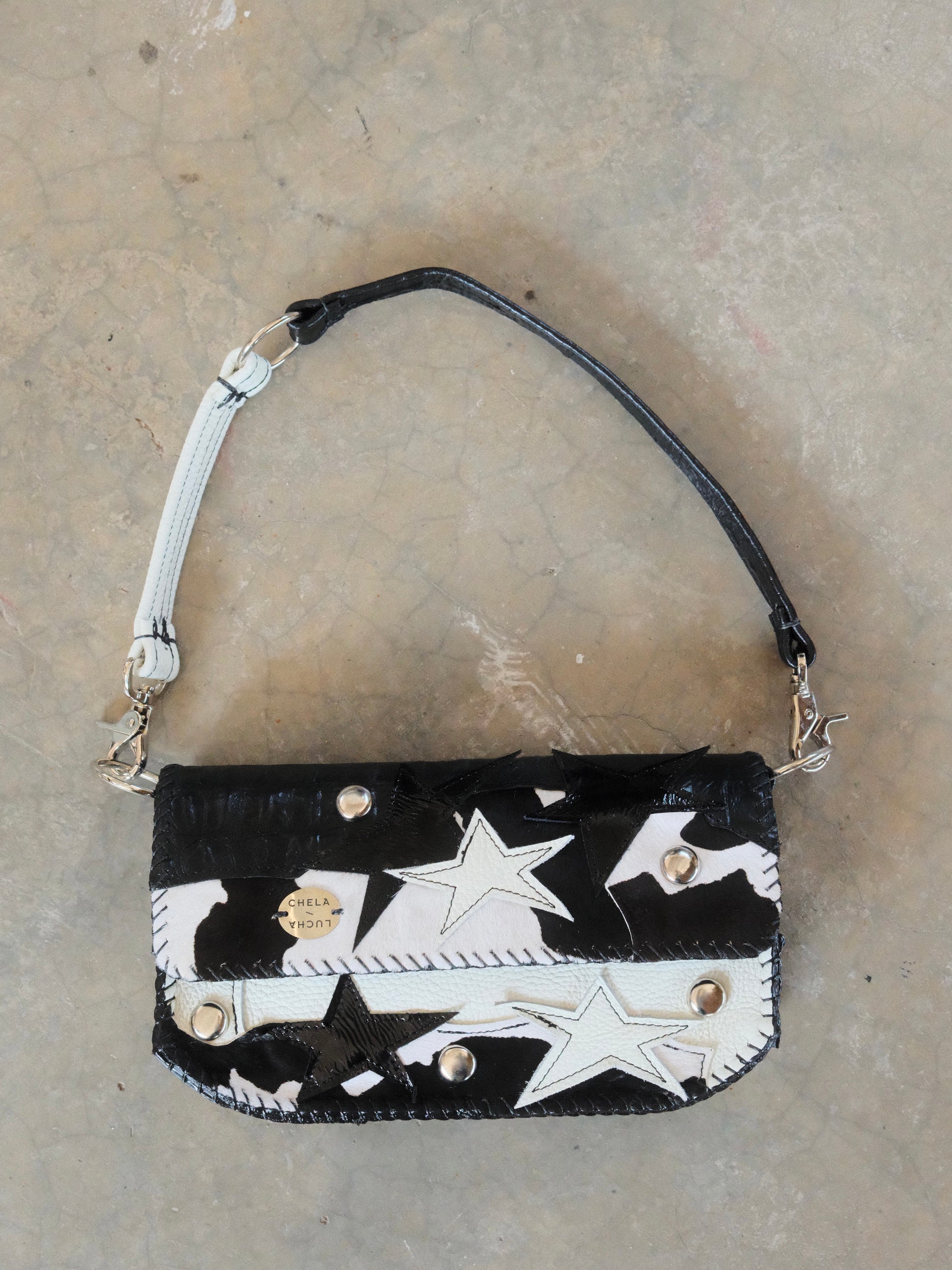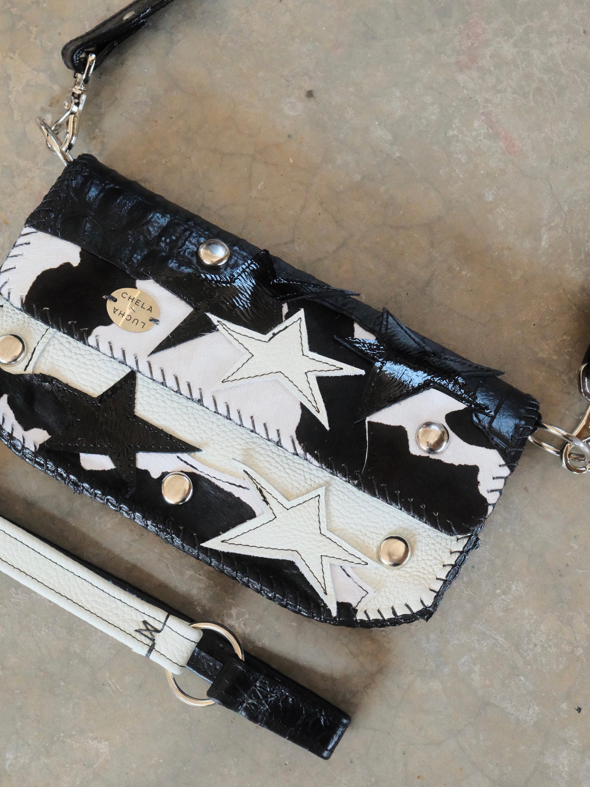 Bolsa LUPE hecha con pedacera de piel en tono negro y blanco. Detalles de estoperoles en tono plateado.