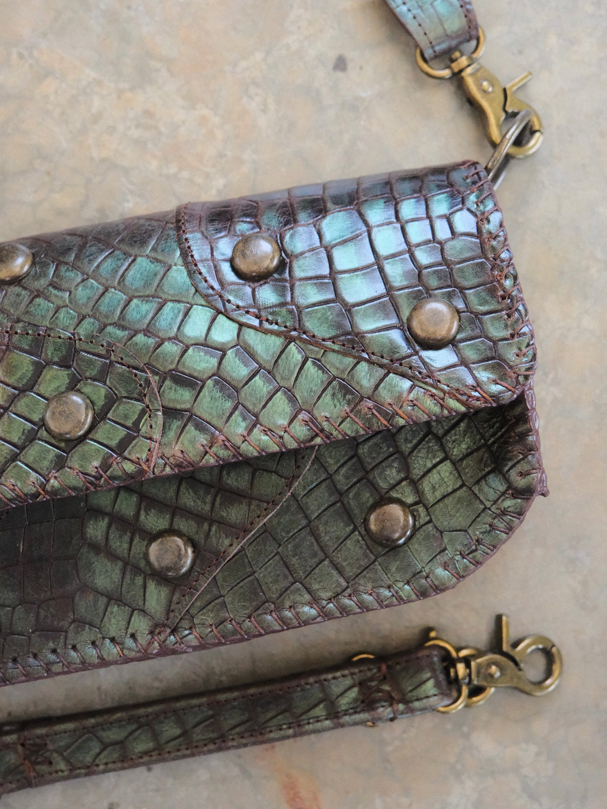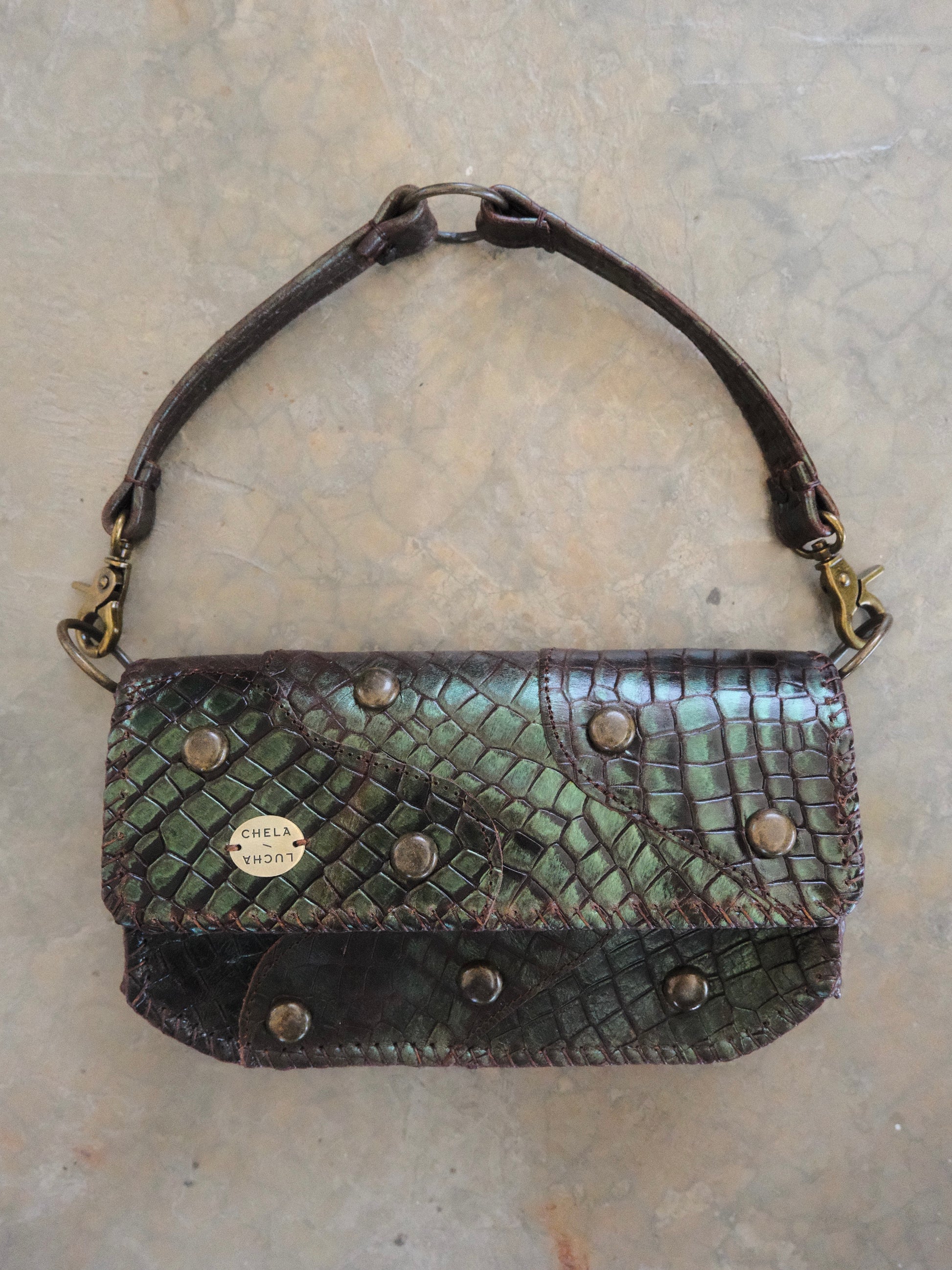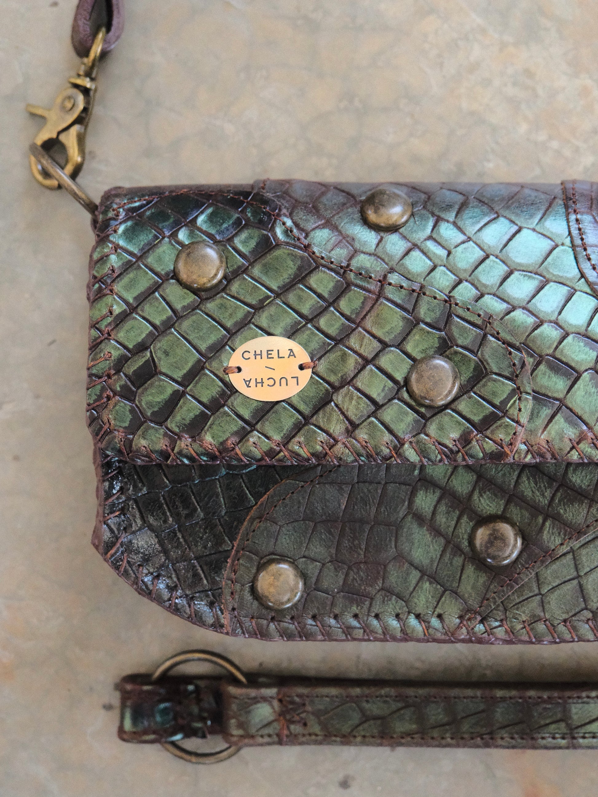 Bolsa LUPE hecha con pedacera de piel en tono verde tornasol. Detalles de estoperoles en tono oro viejo.