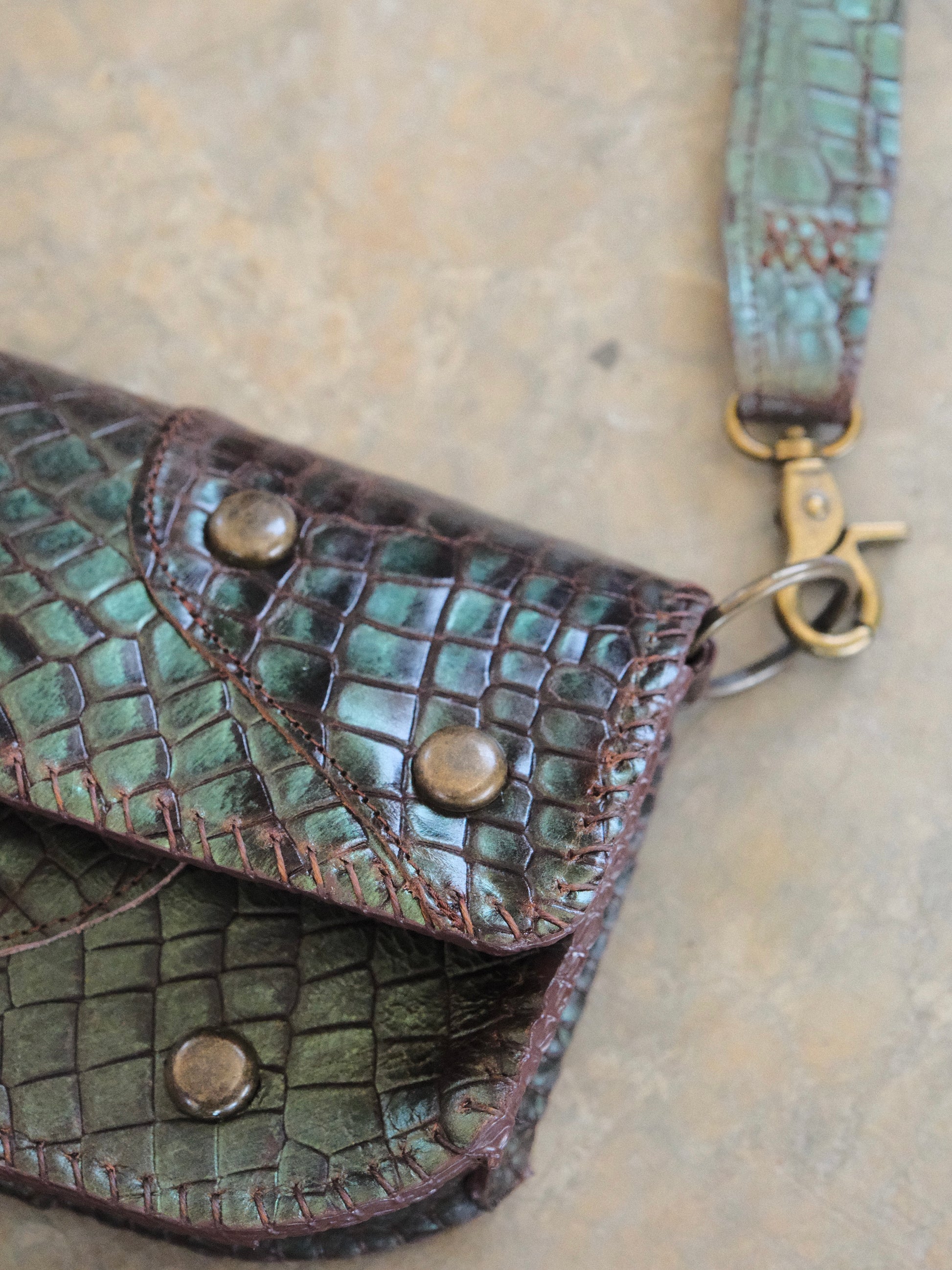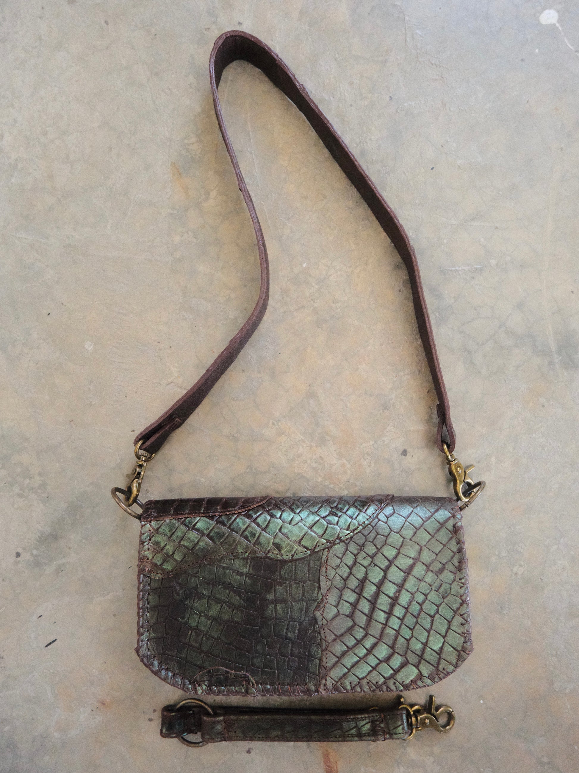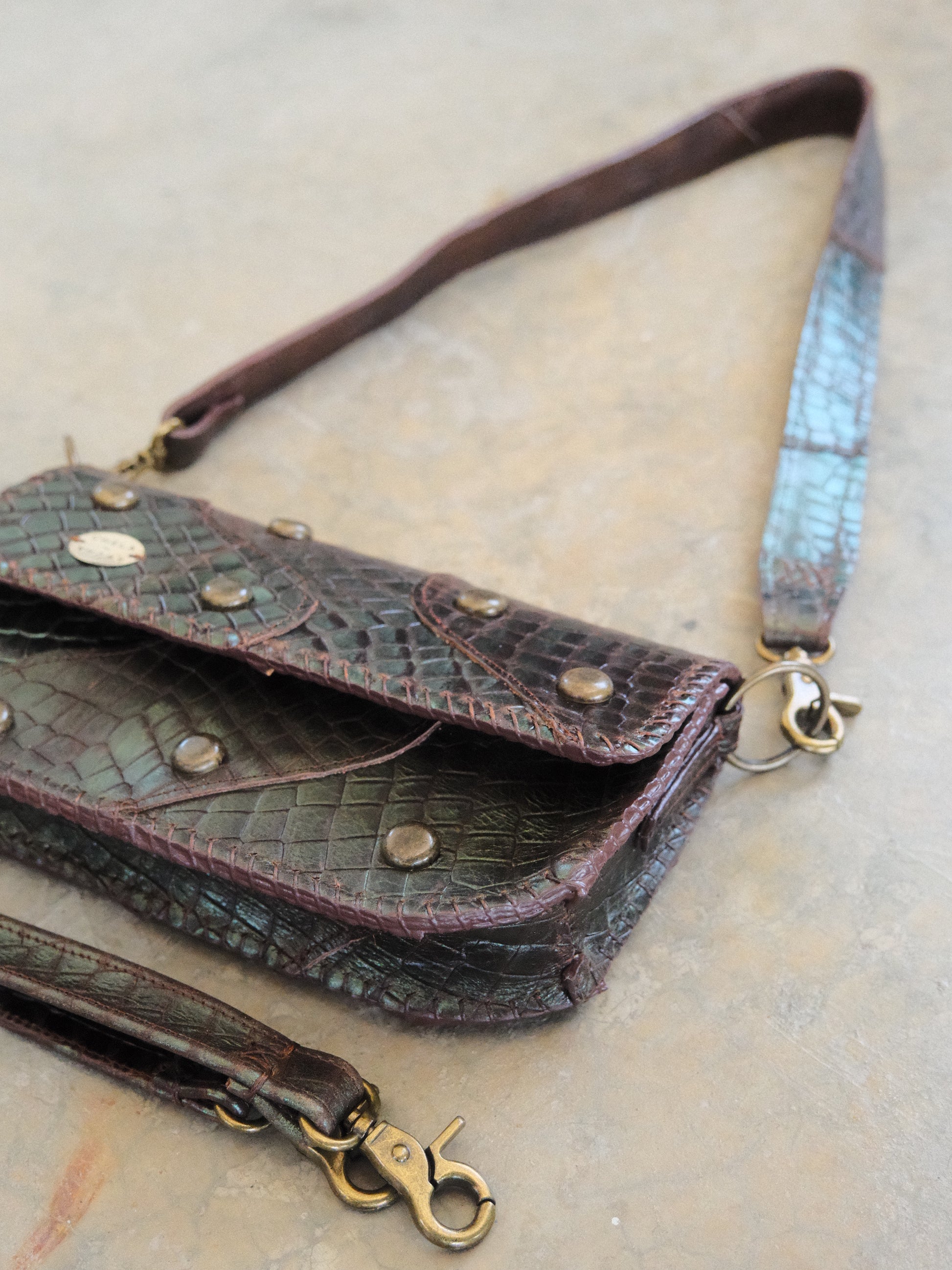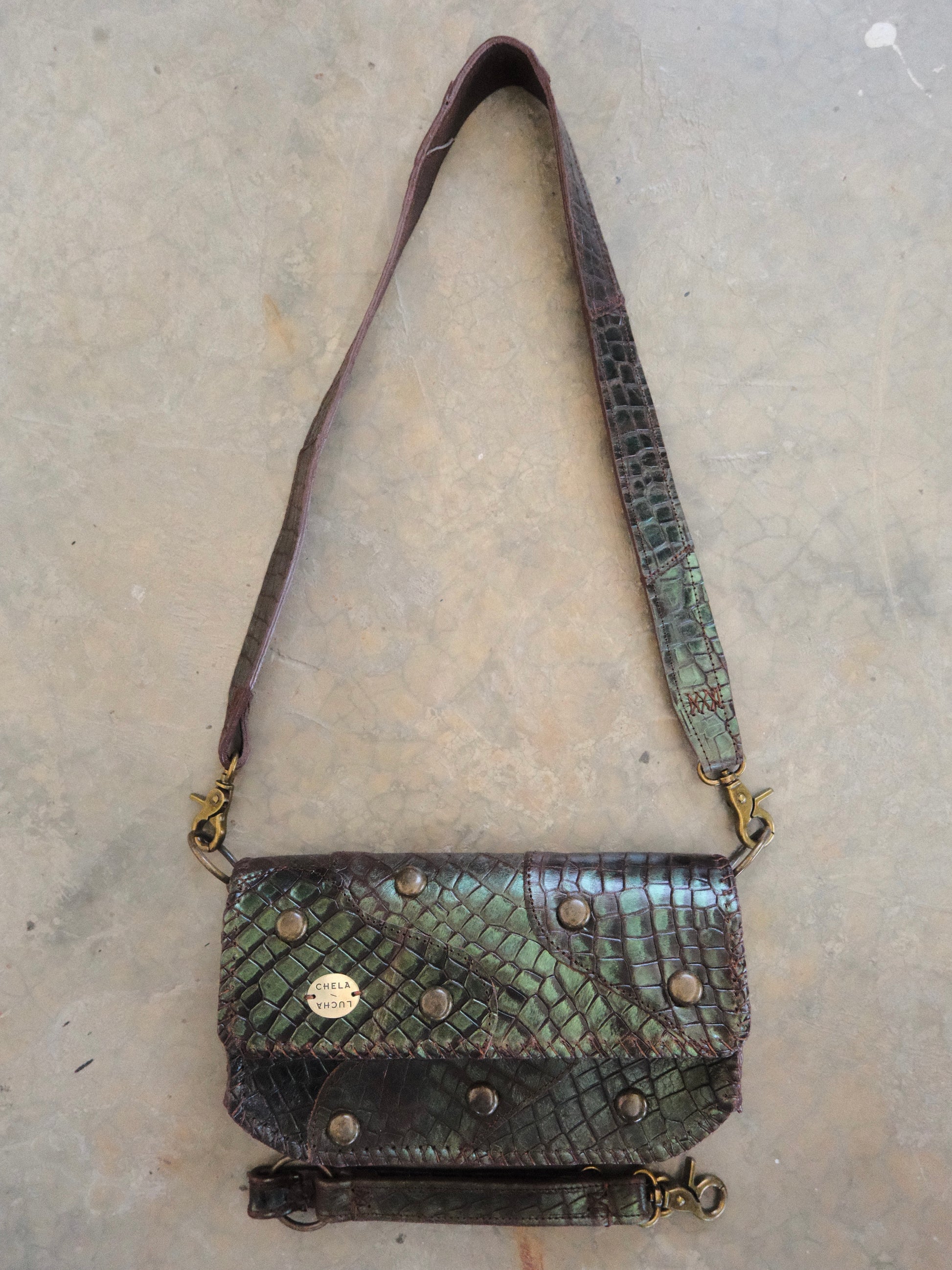 Bolsa LUPE hecha con pedacera de piel en tono verde tornasol. Detalles de estoperoles en tono oro viejo.