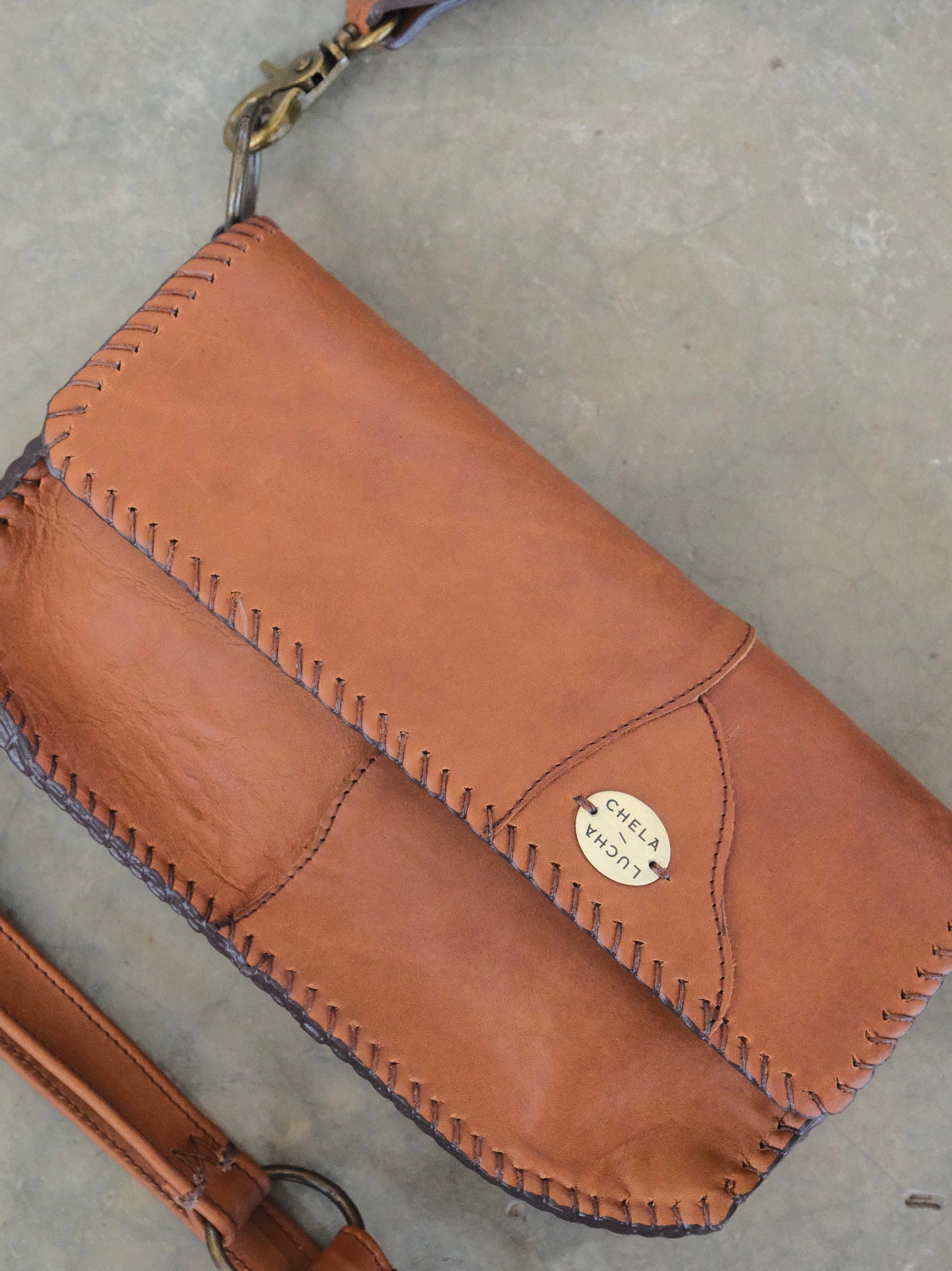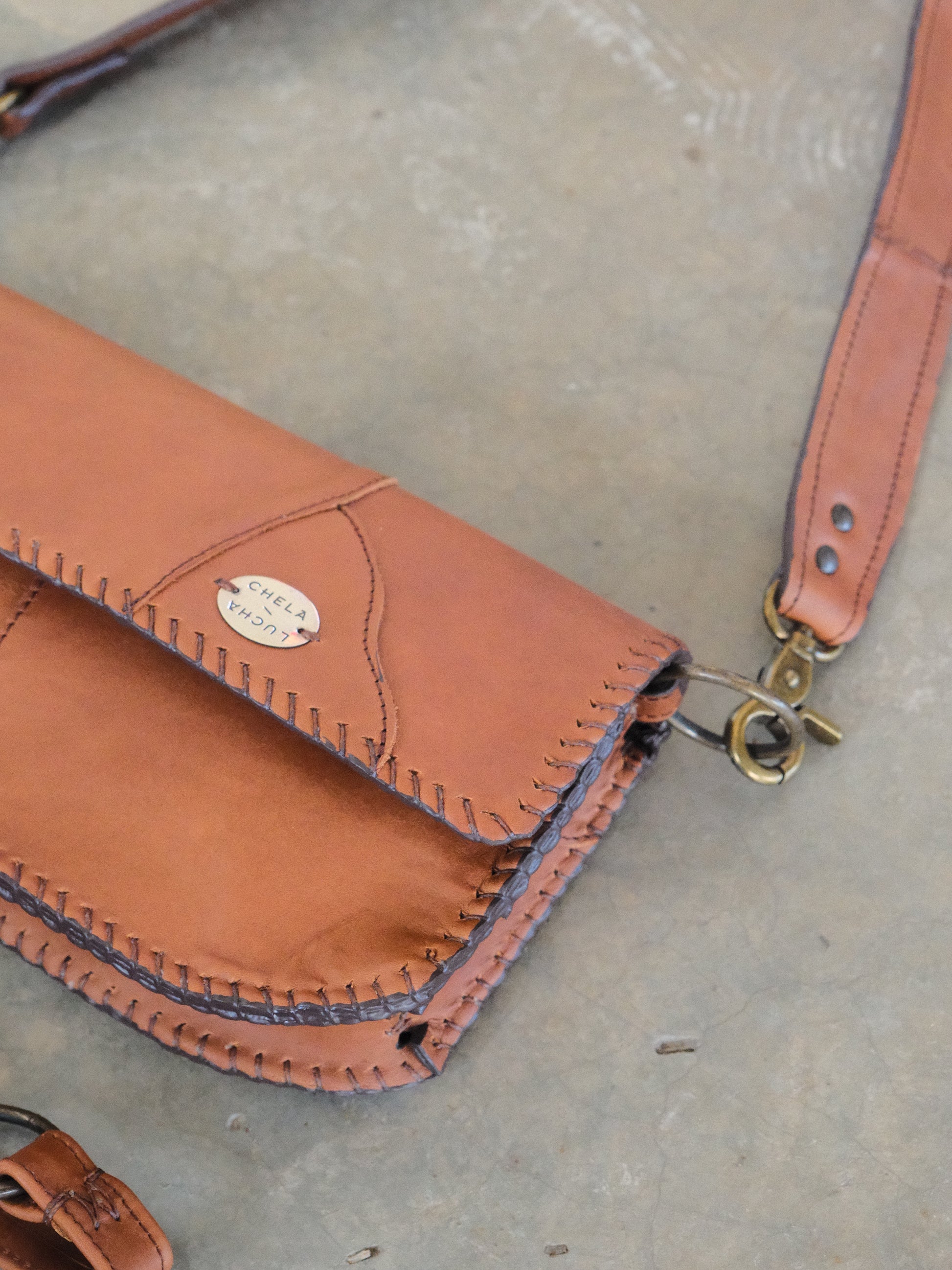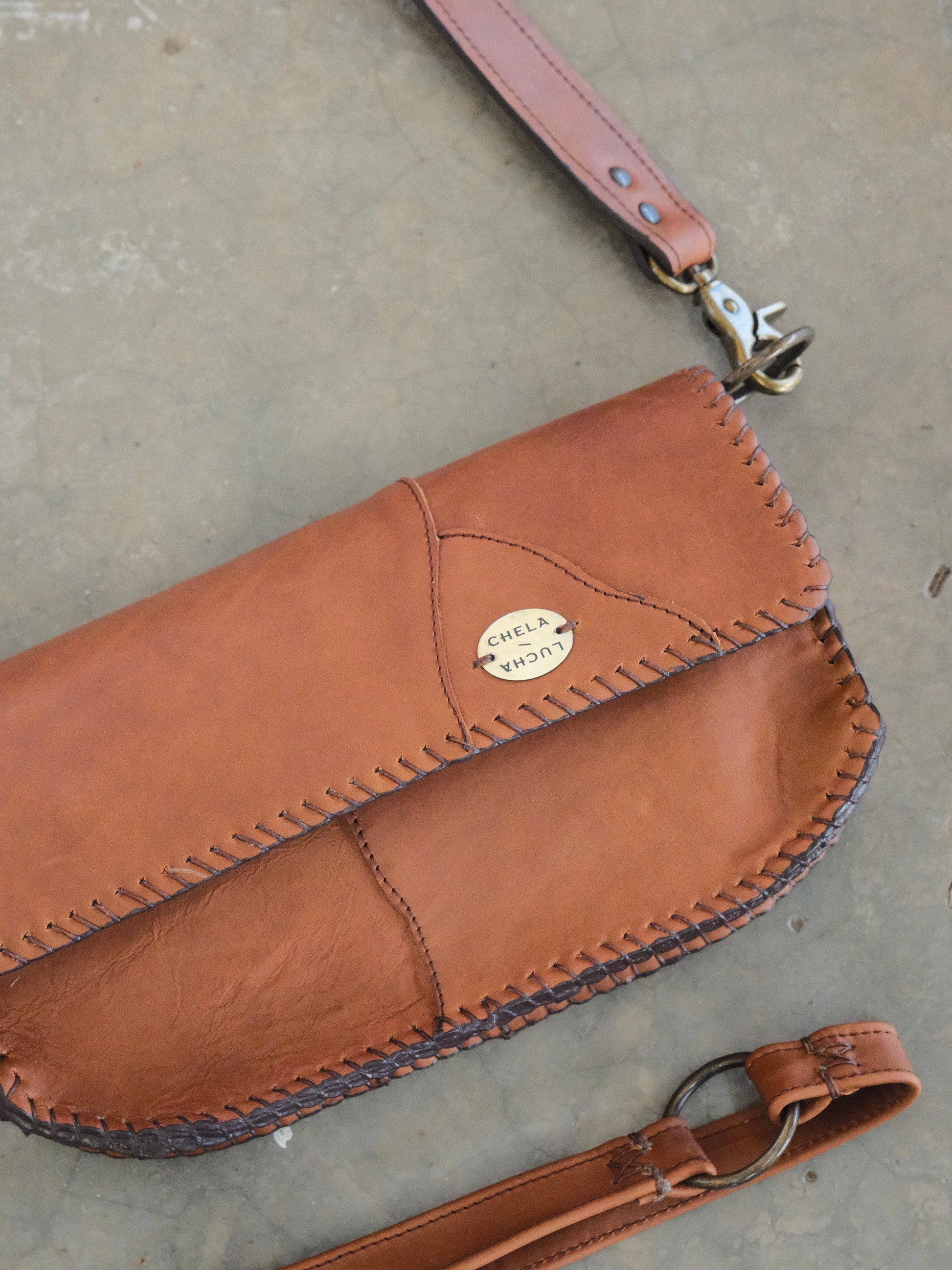 Bolsa LUPE hecha con pedacera de piel en tono café.
