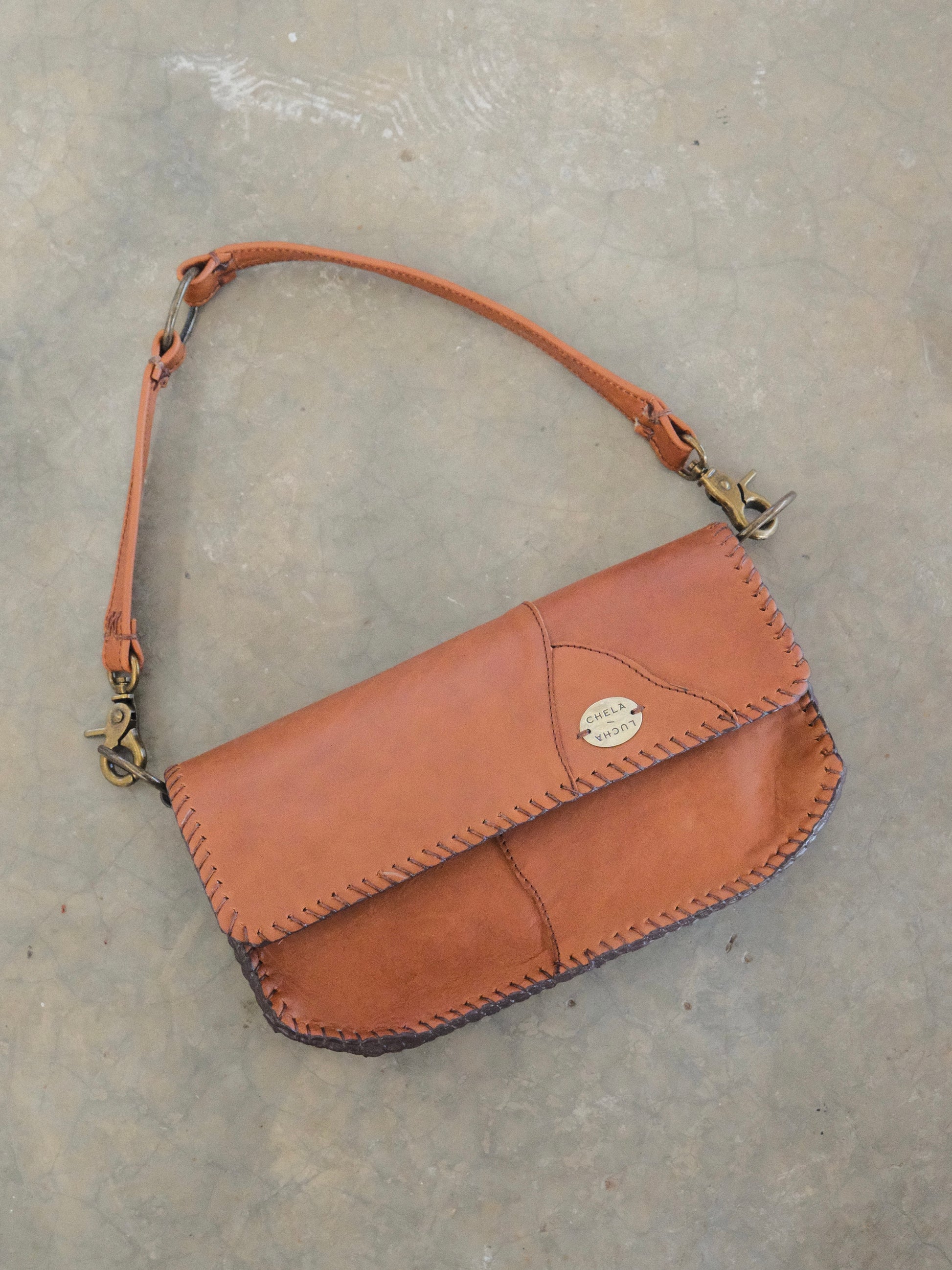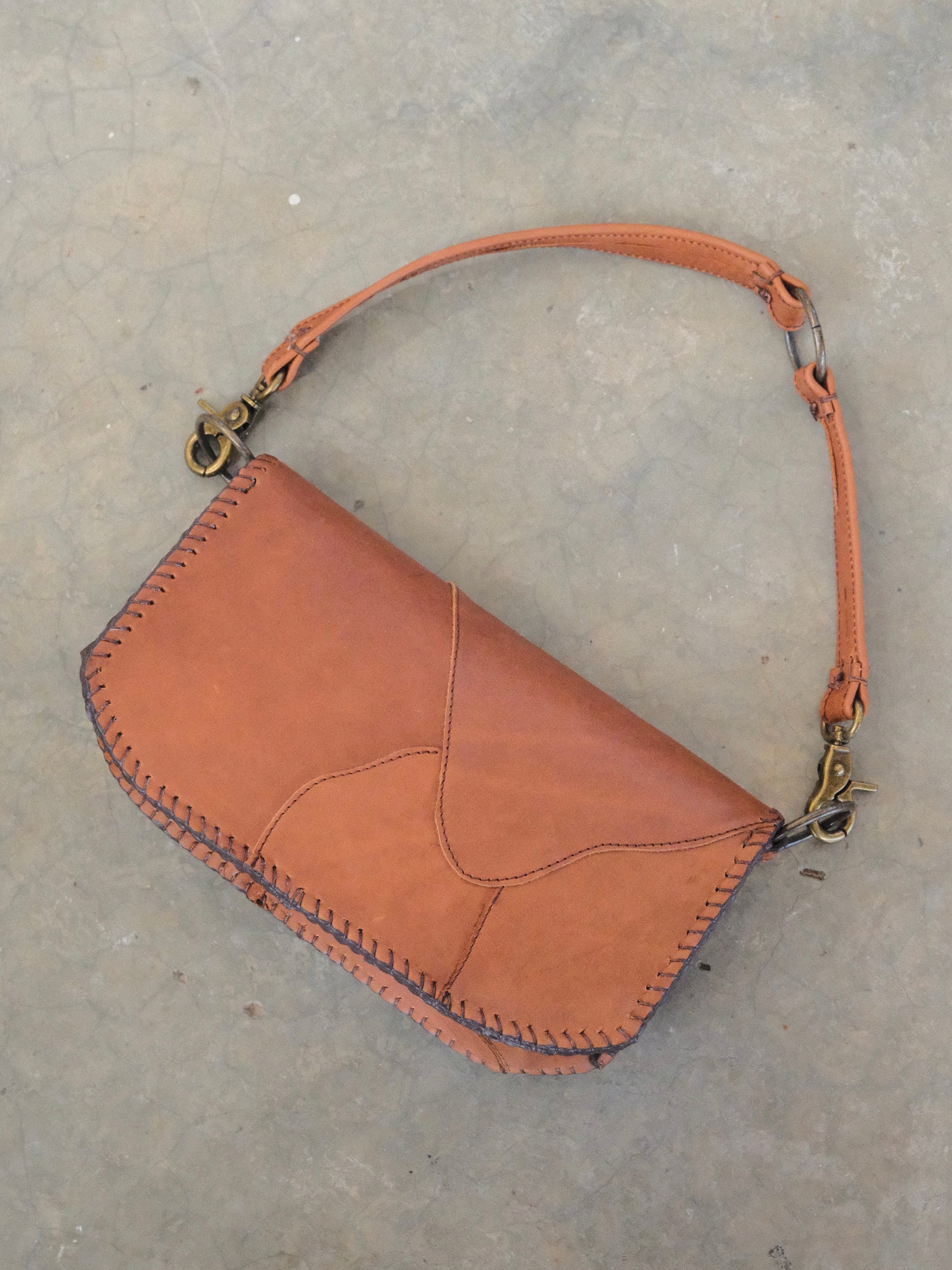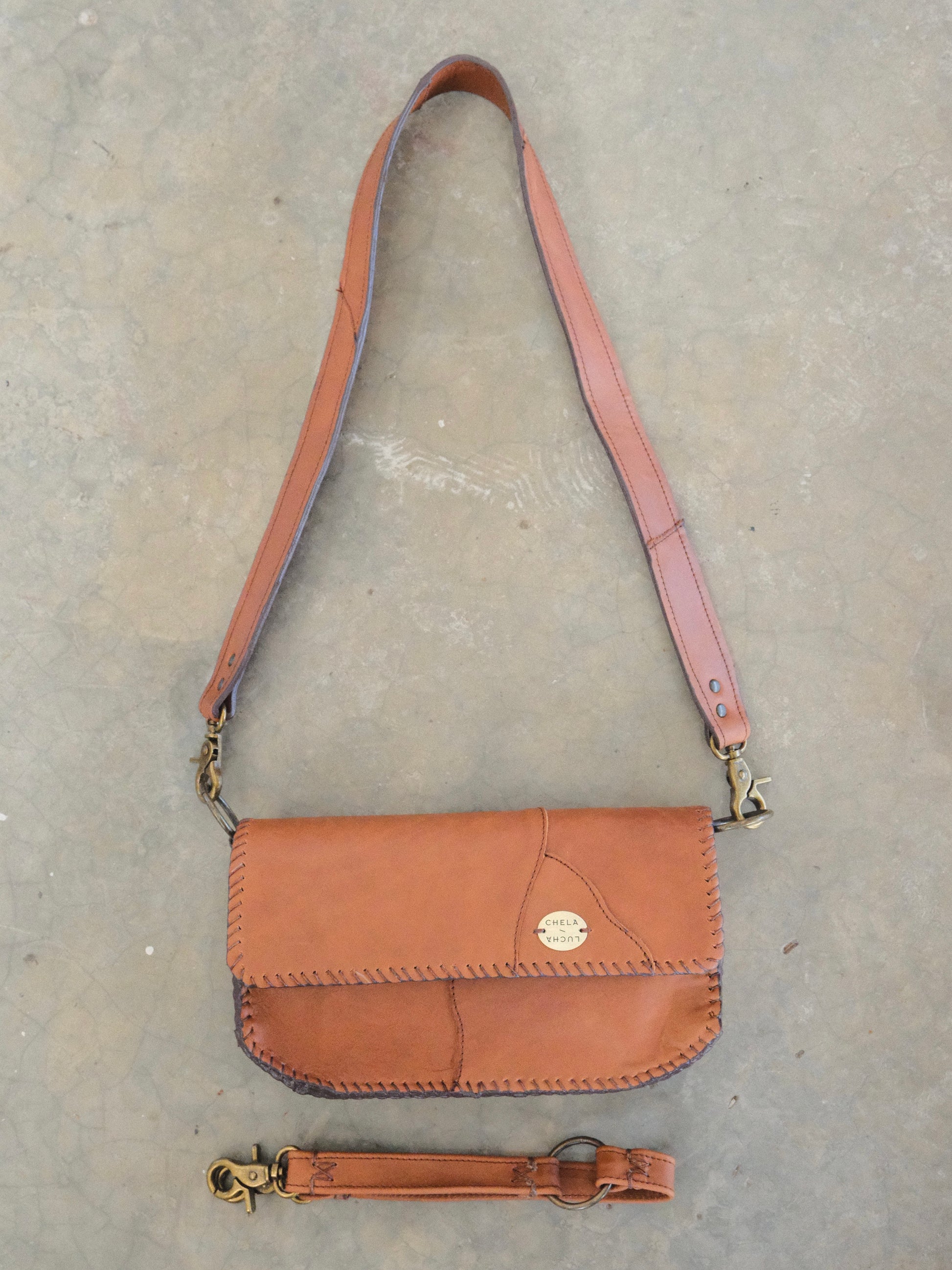 Bolsa LUPE hecha con pedacera de piel en tono café.