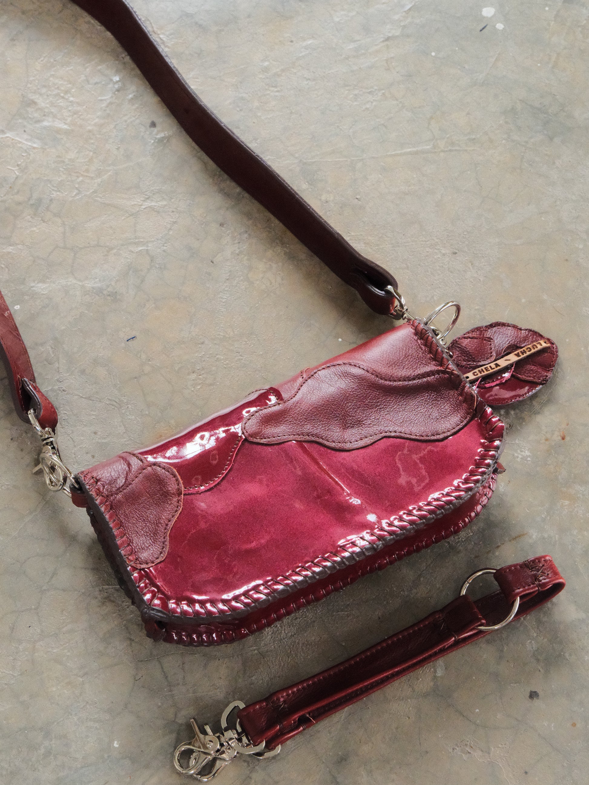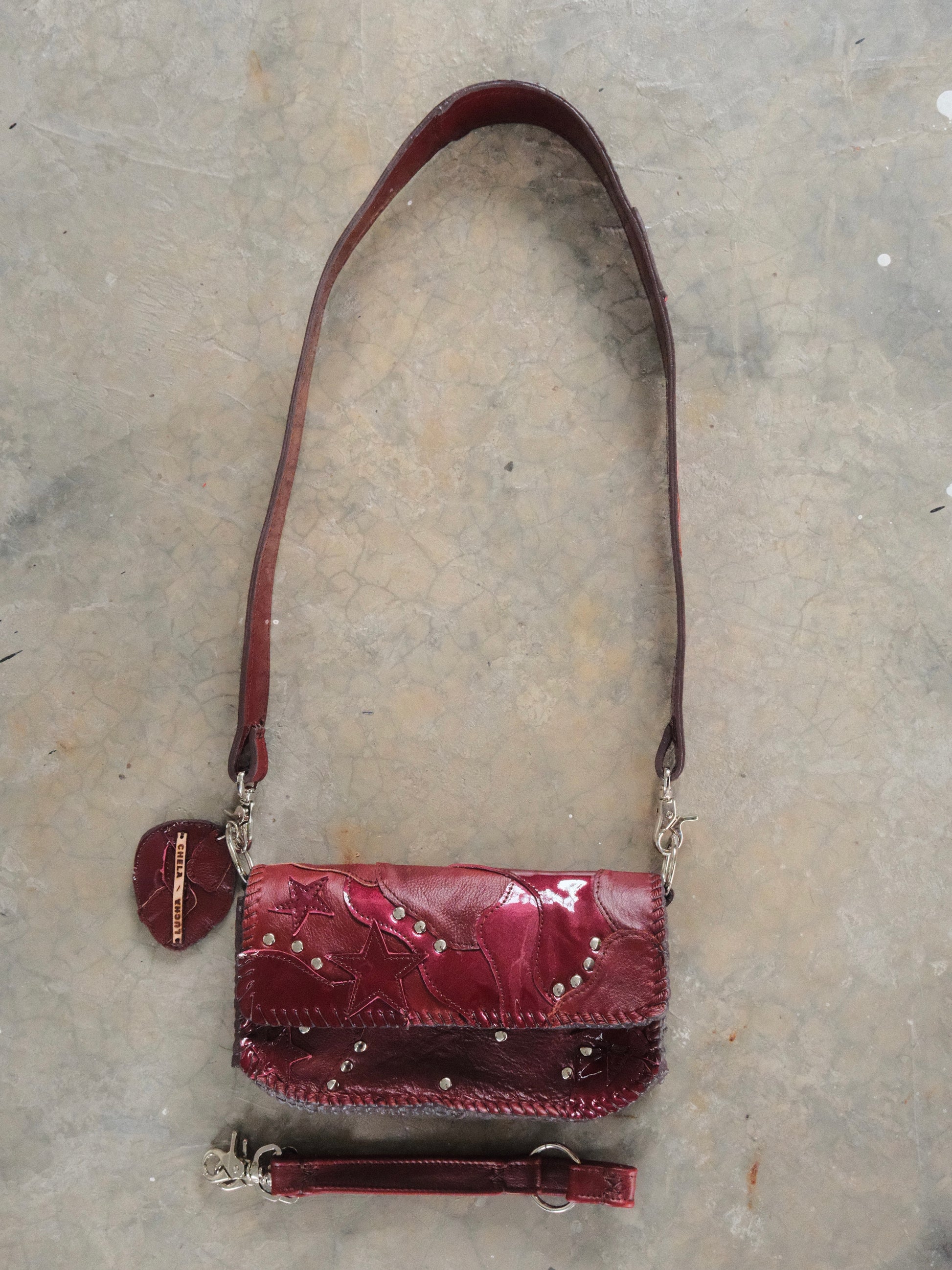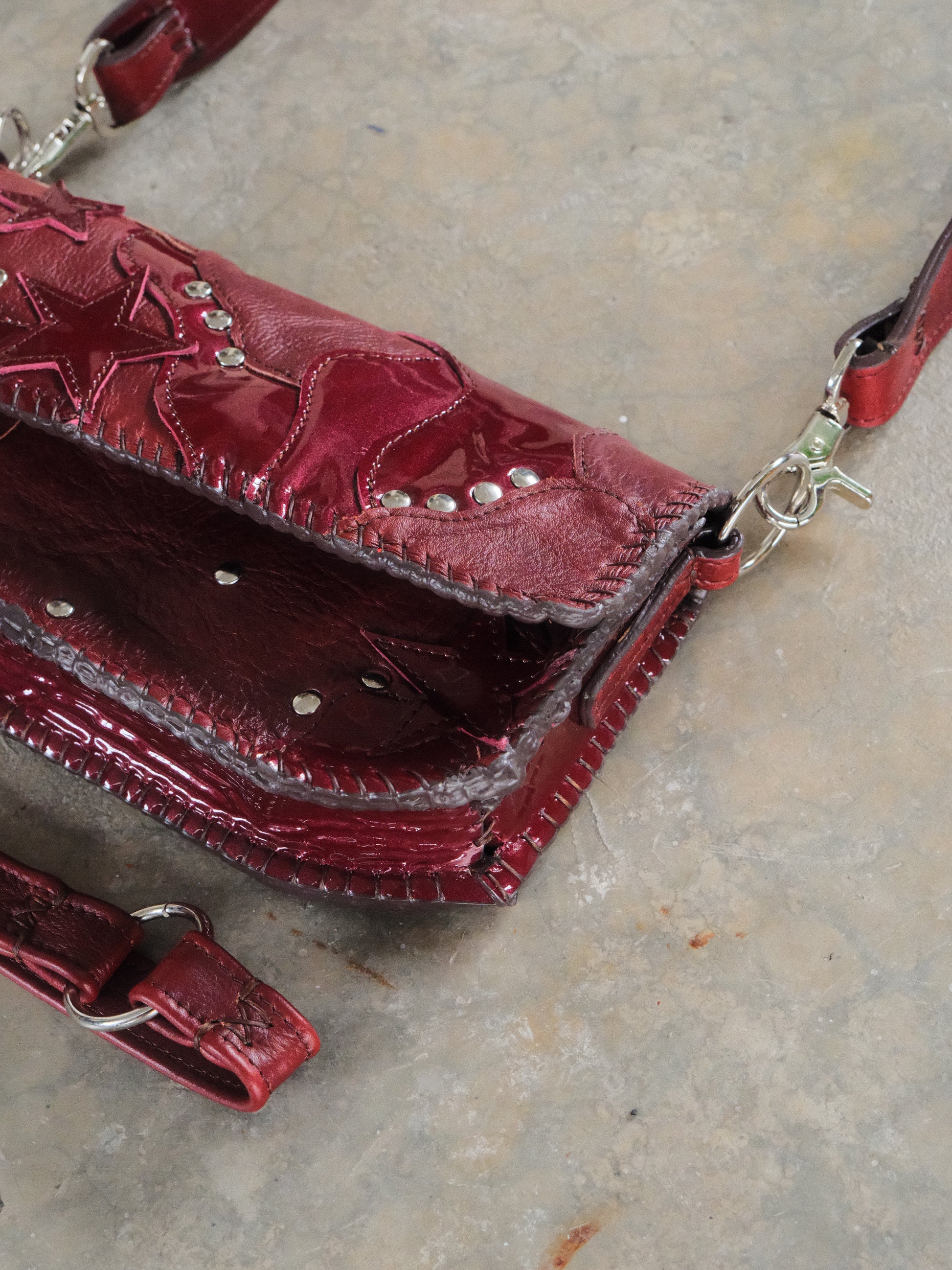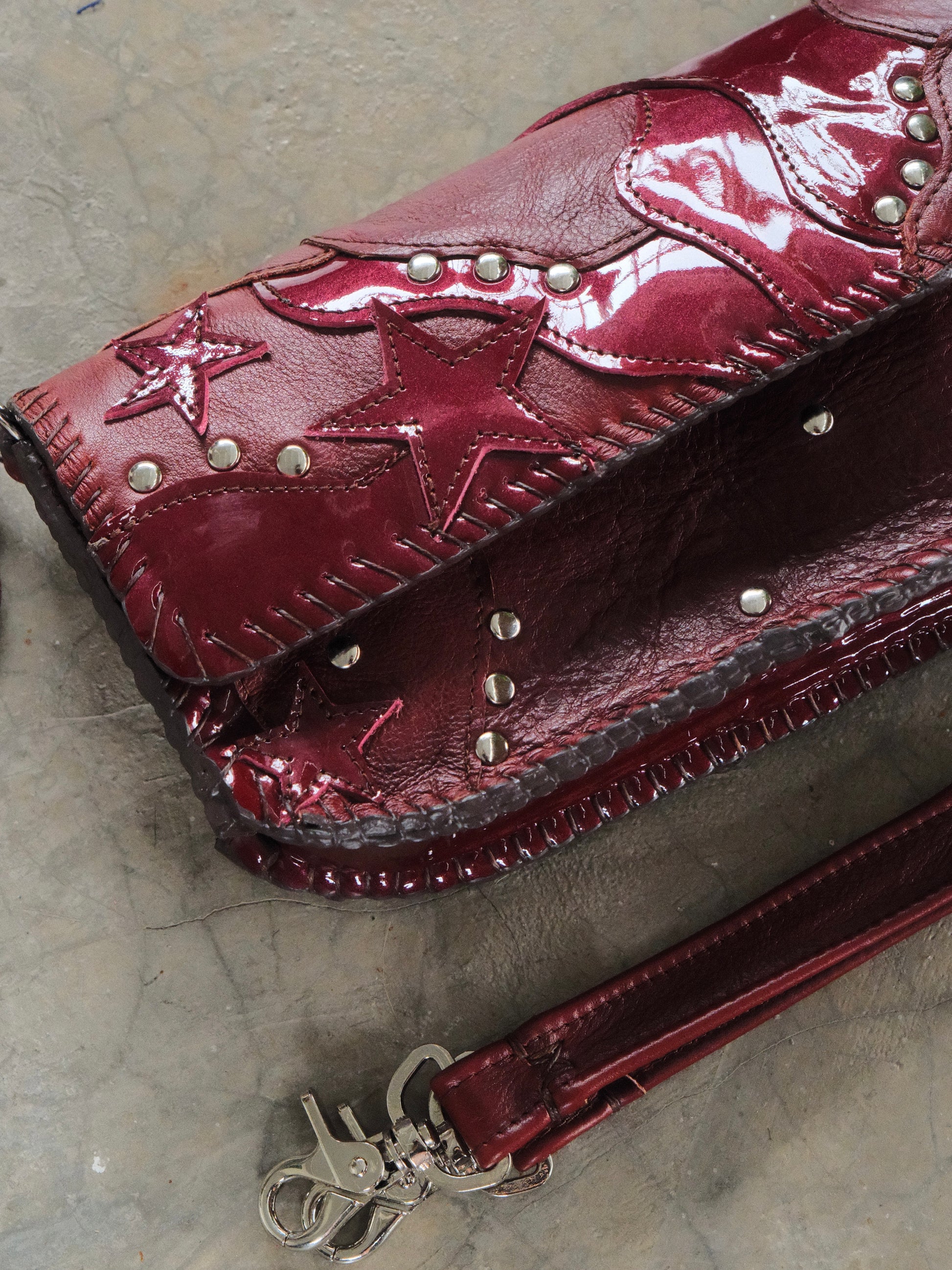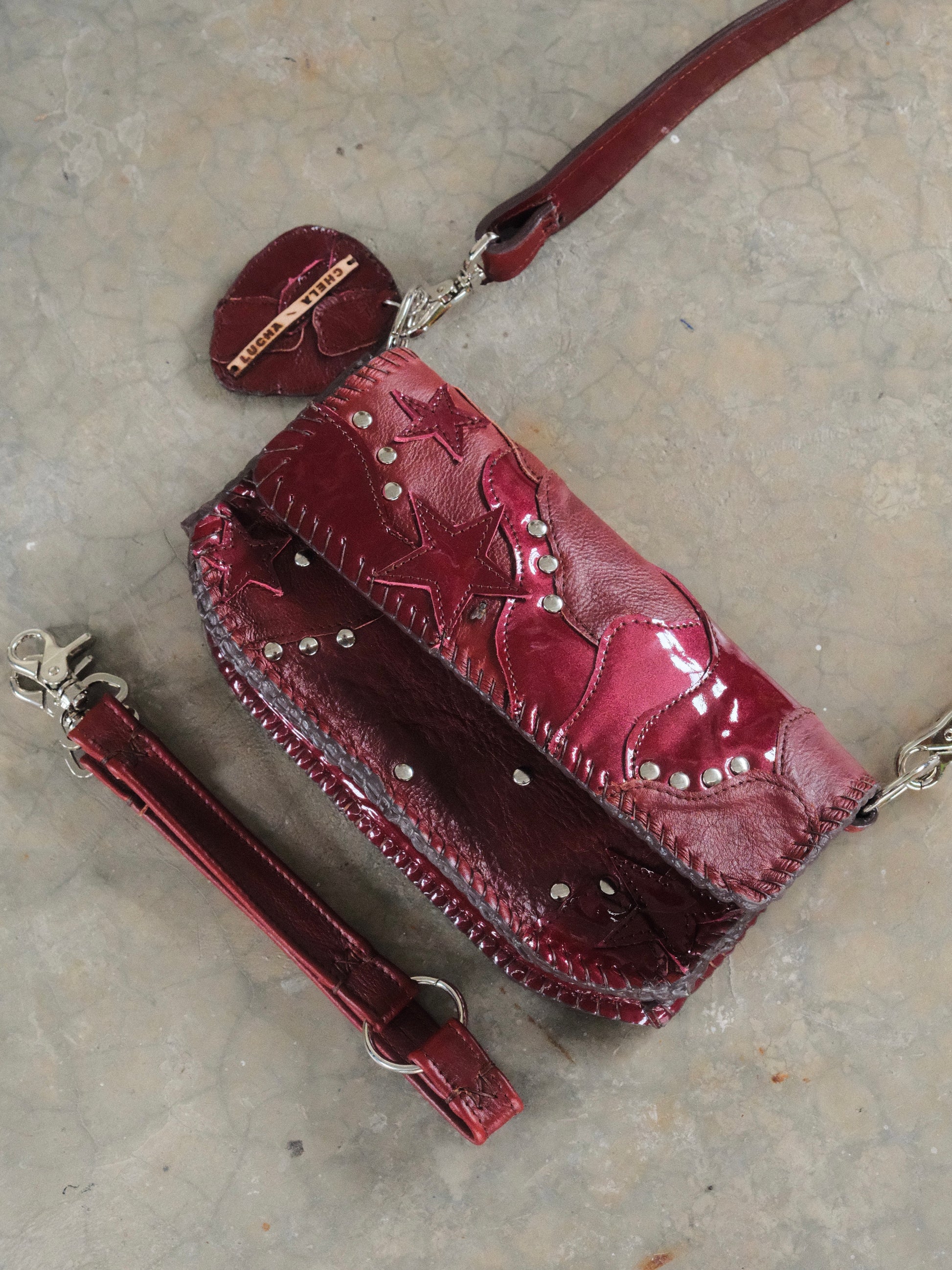 Bolsa LUPE hecha con pedacera de piel en tonos rojos y tinto. Detalles de remaches en tono plateado.
