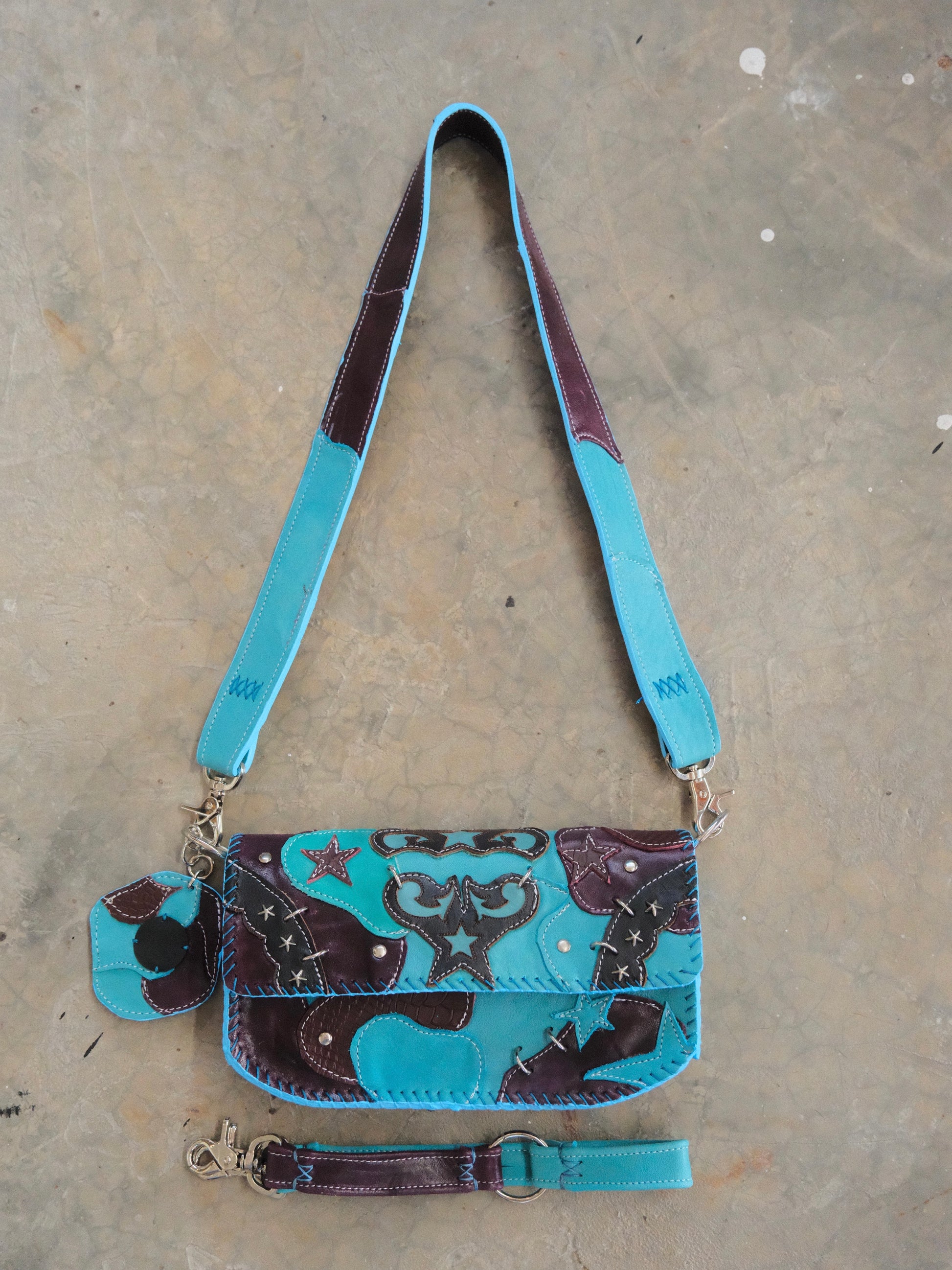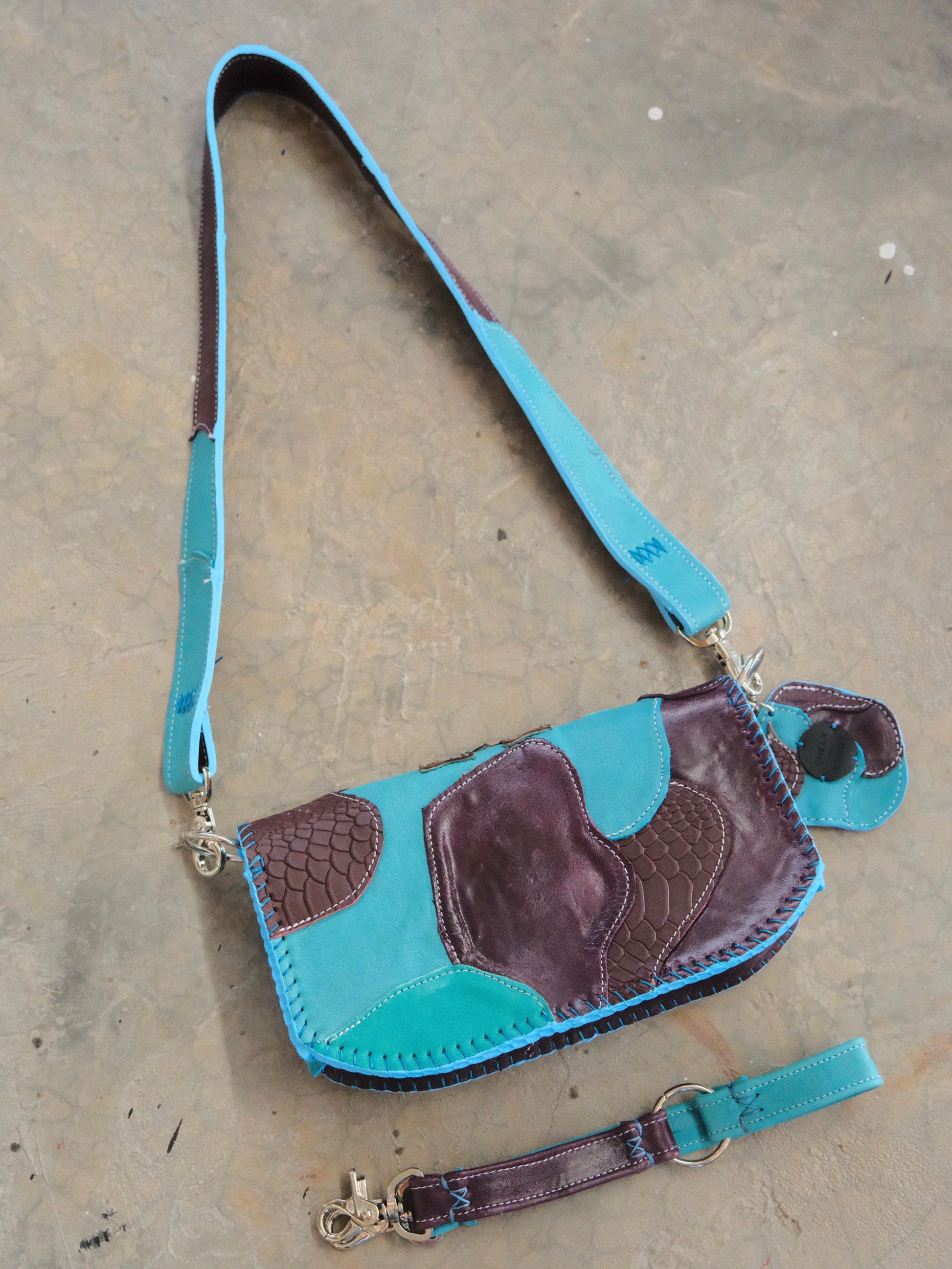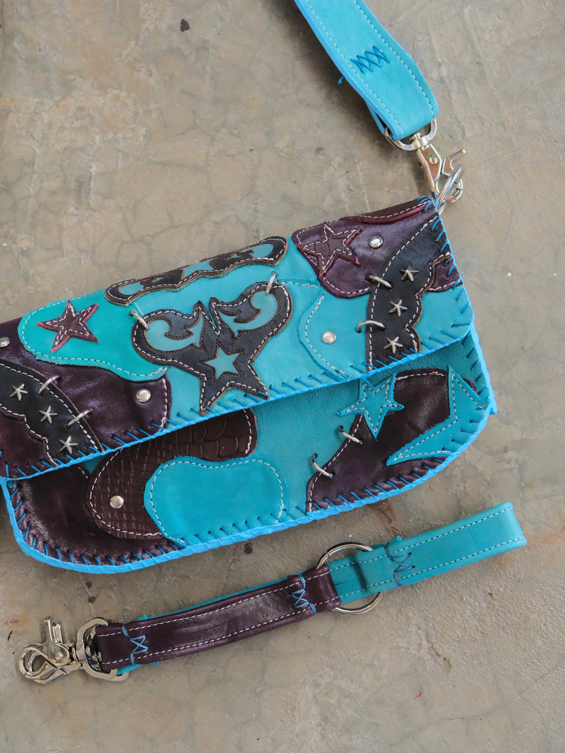 Bolsa LUPE hecha con pedacera de piel en tonos azules y morado. Detalles de remaches en tono plateado.