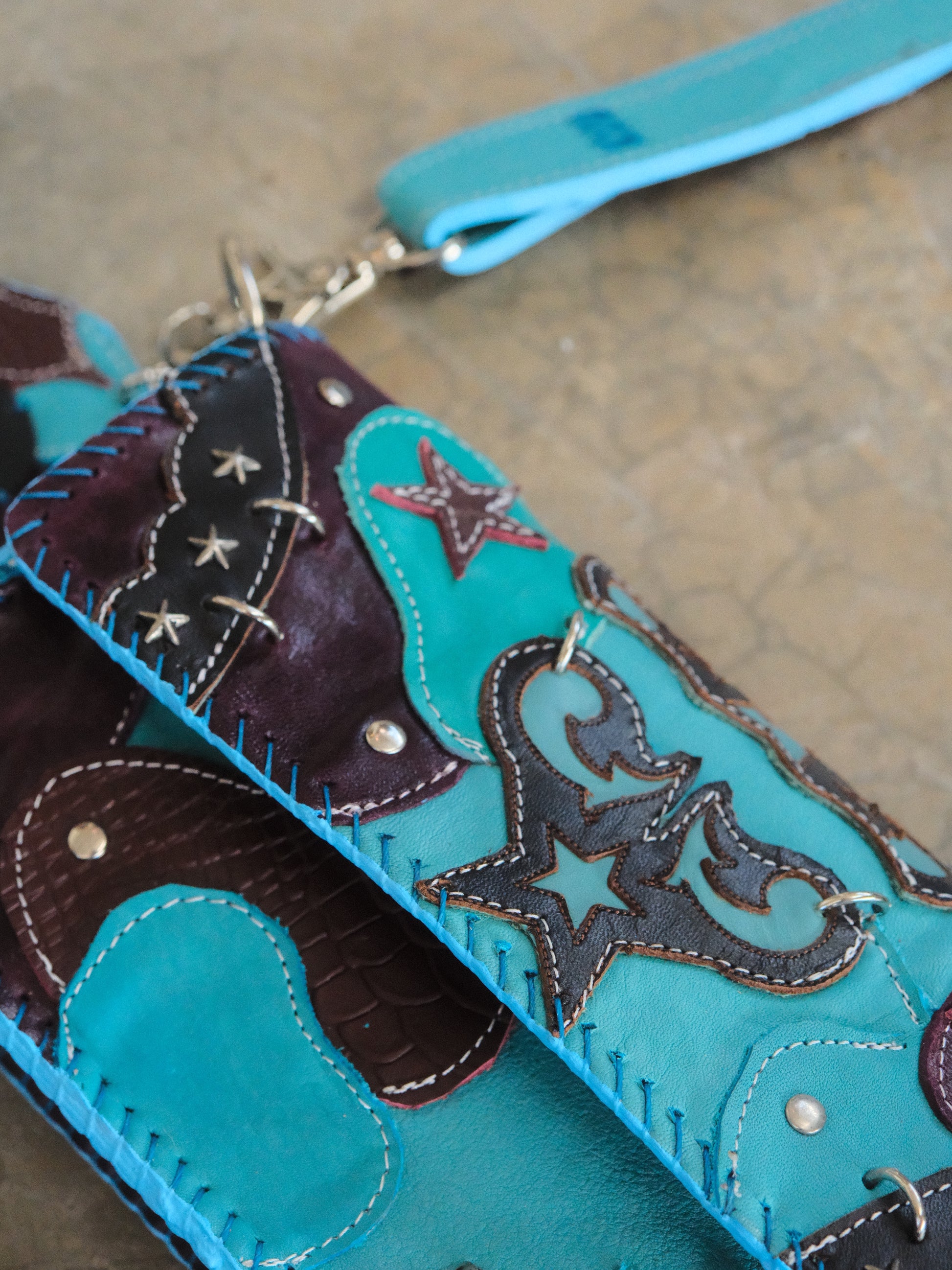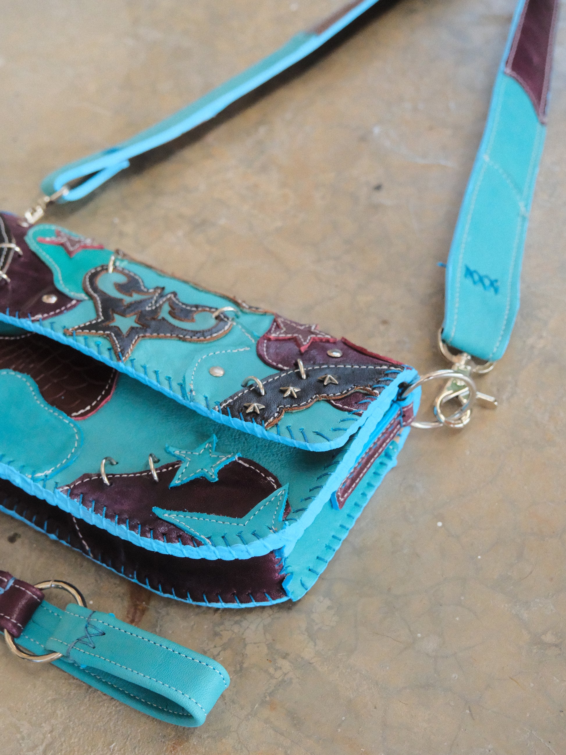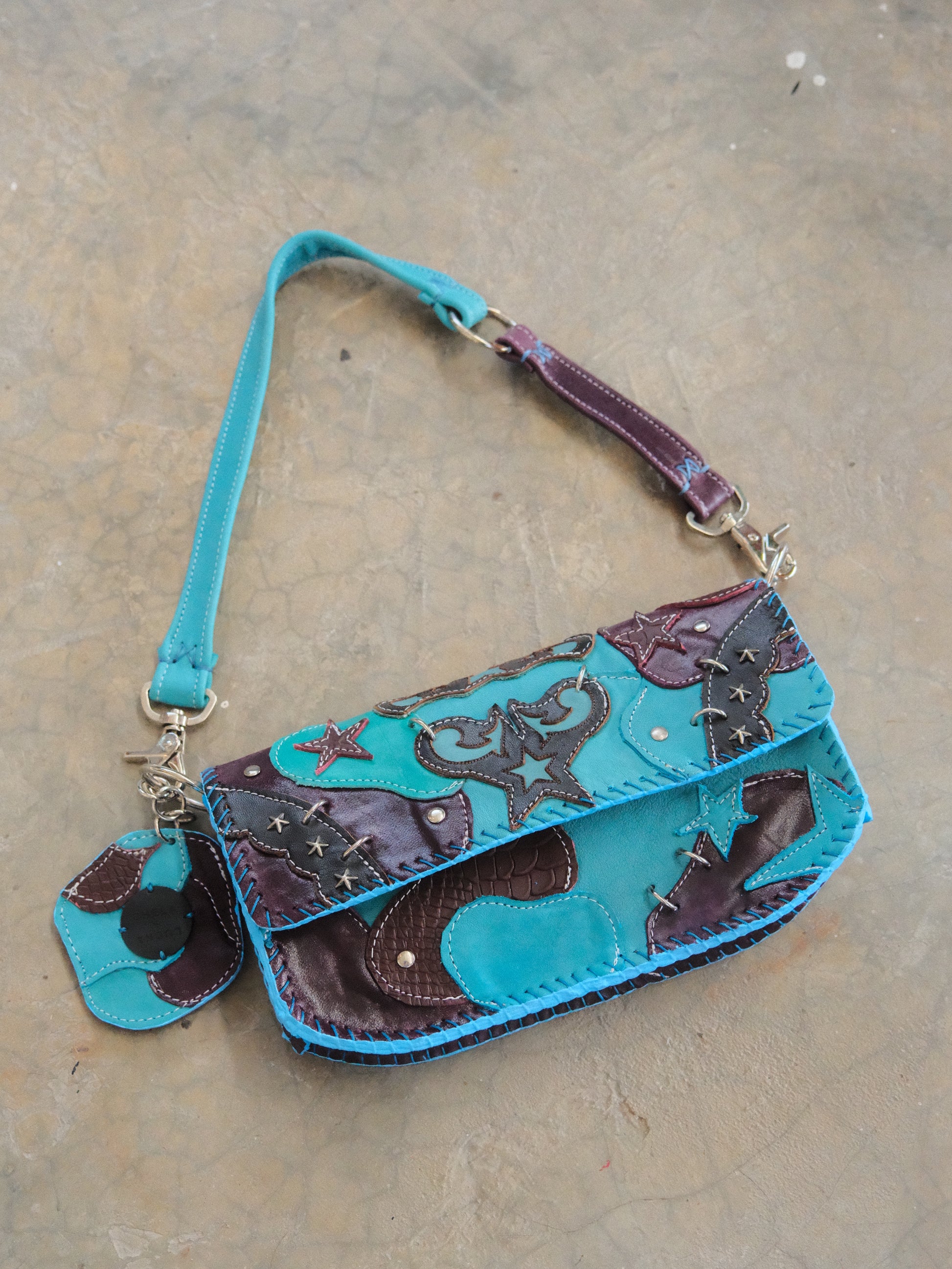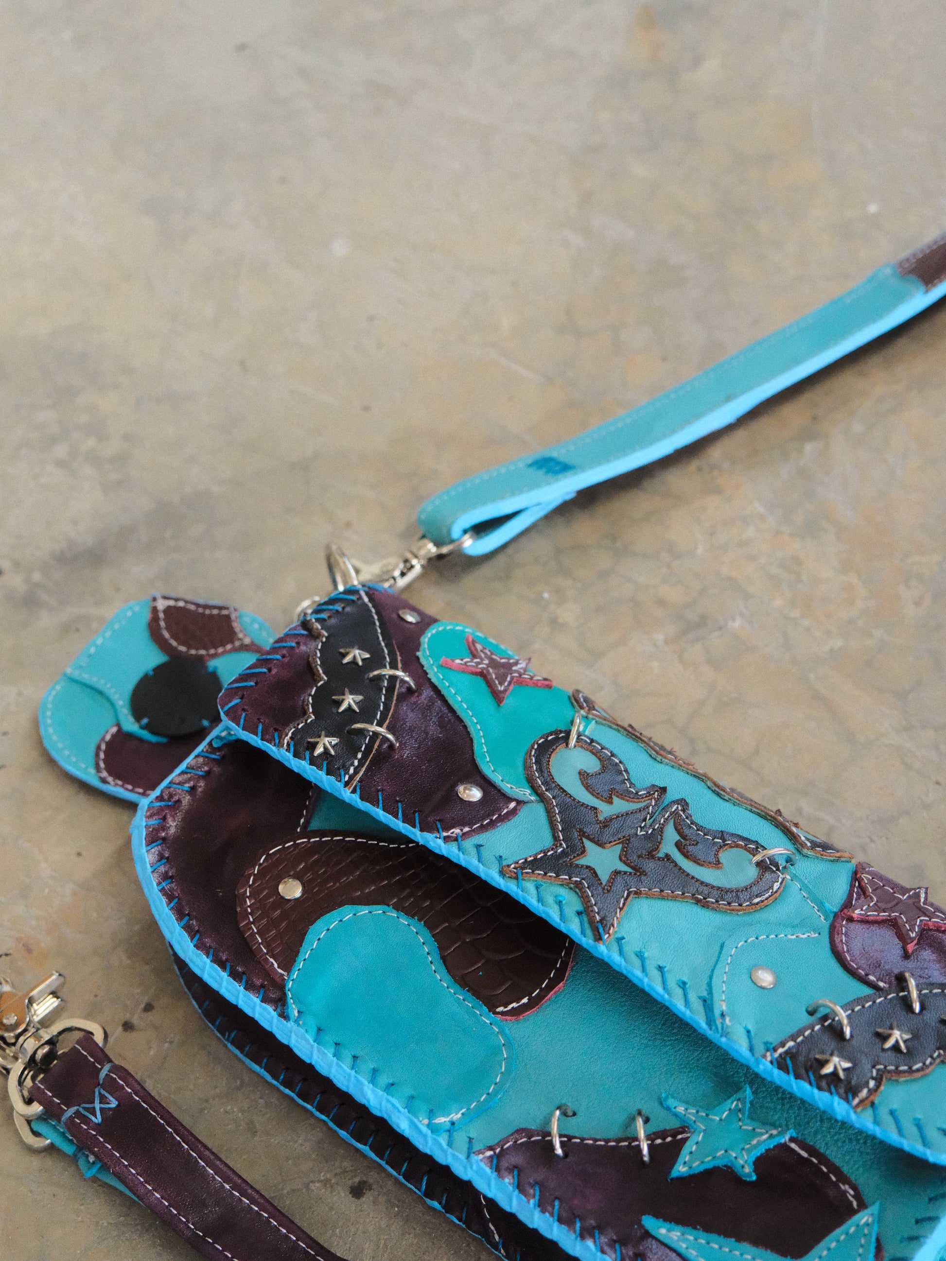 Bolsa LUPE hecha con pedacera de piel en tonos azules y morado. Detalles de remaches en tono plateado.