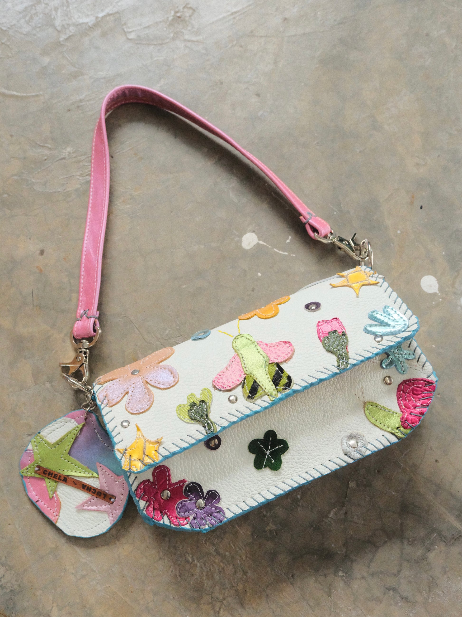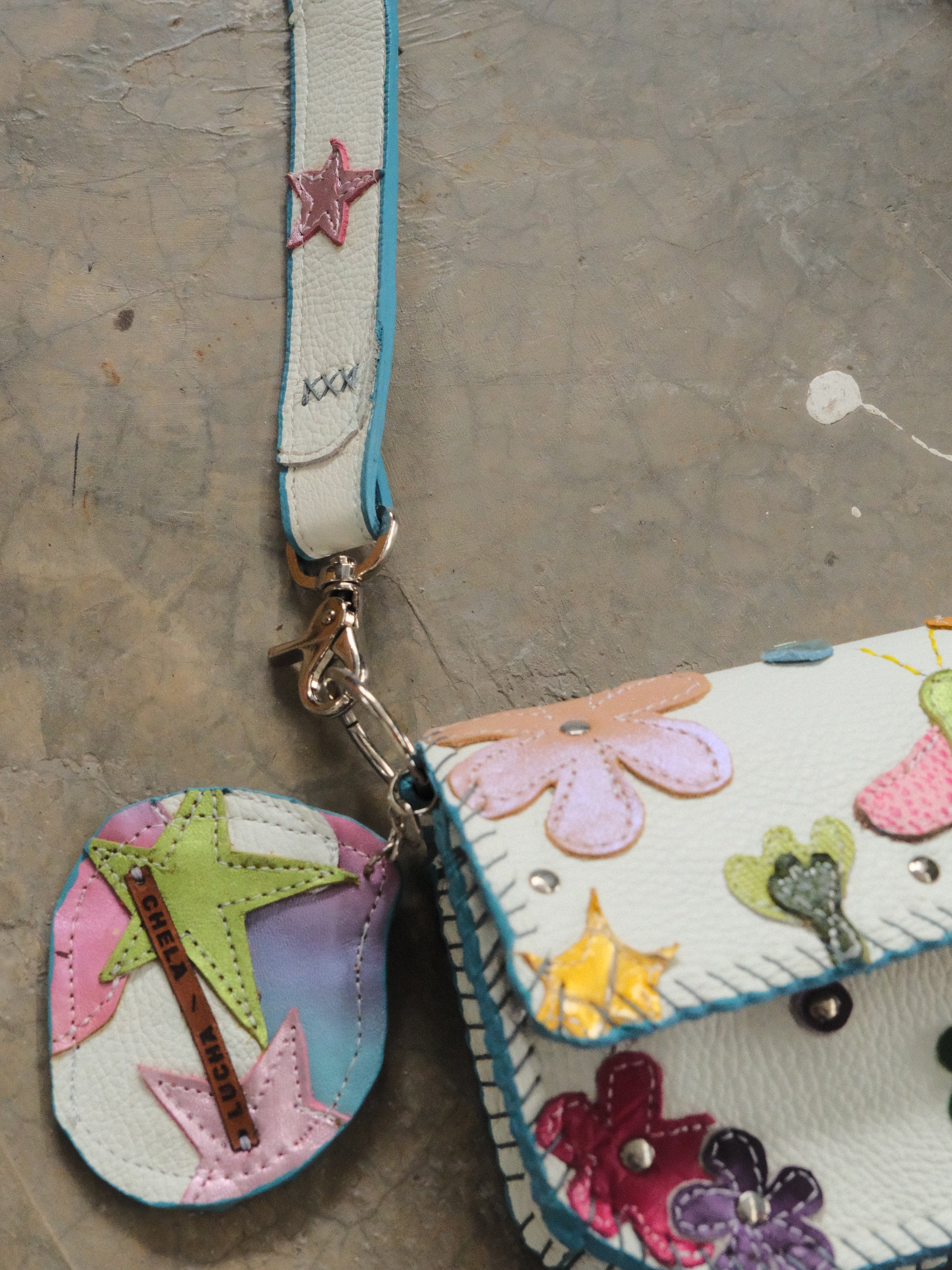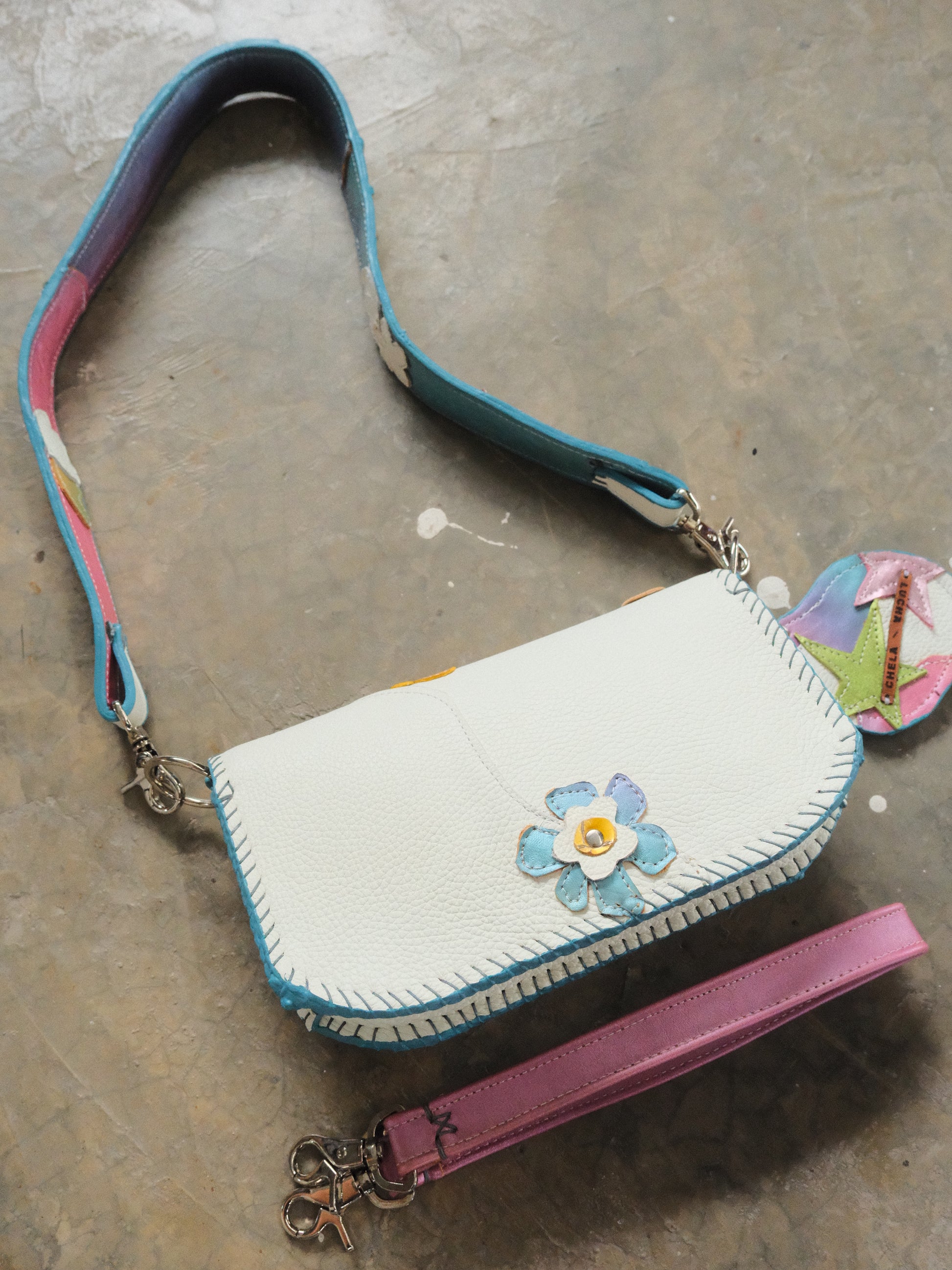 Bolsa LUPE hecha con pedacera de piel en tonos variados.